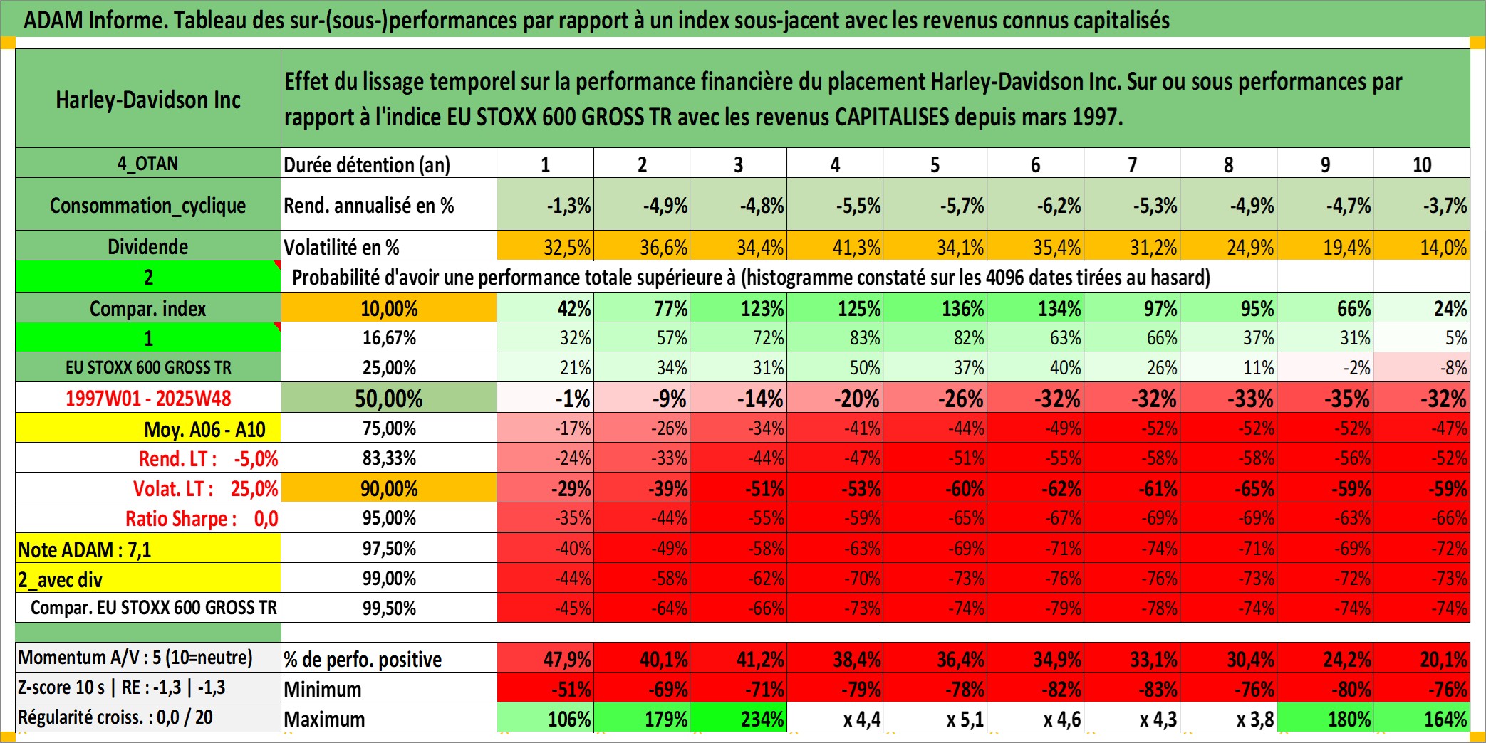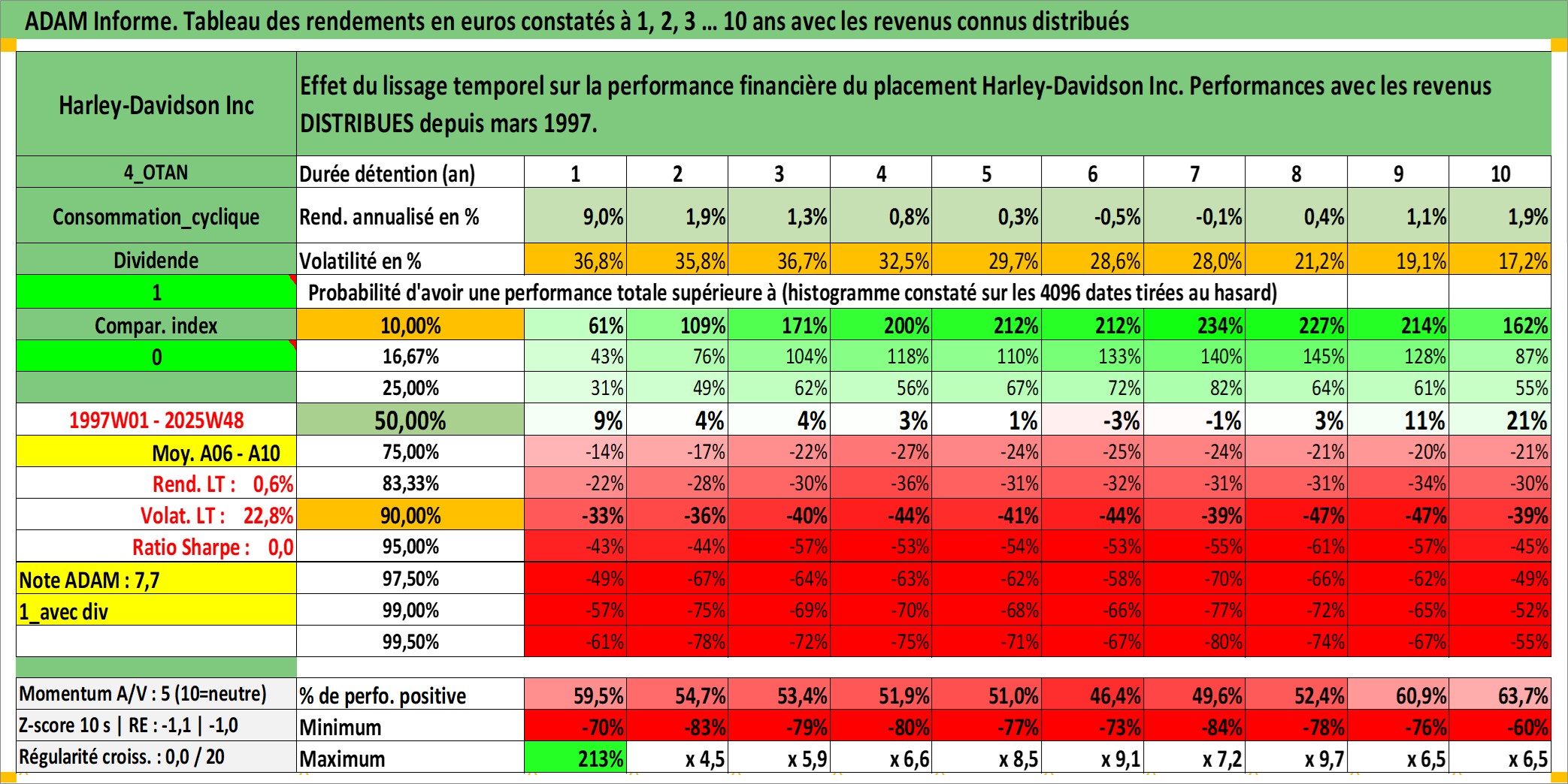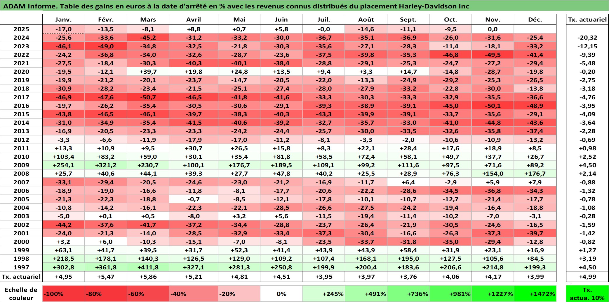 Site dédié aux investisseursPage dédiée sur site financeAnalyse des valorisations hebdomadaires de l'action Harley-Davidson Inc. Cet actif est cote en USD. Les valorisations sont en contrevaleur EURO et couvrent les semaines 1997W01 a 2025W48. Les revenus de cet actif financier sont pris en compte depuis la semaine 1997W11. La note globale ESG de cet actif est estimee a 13.0 (apres rebasage entre 0 et 20).