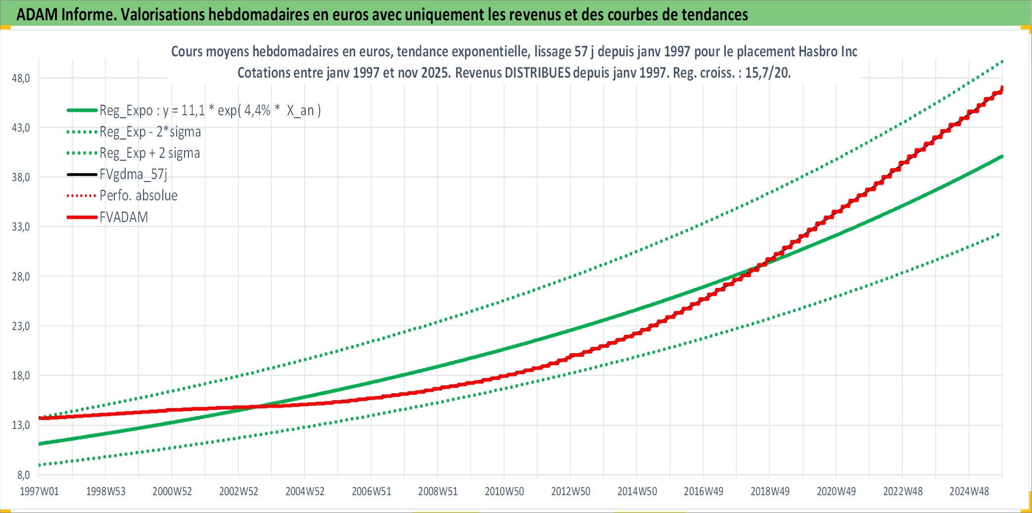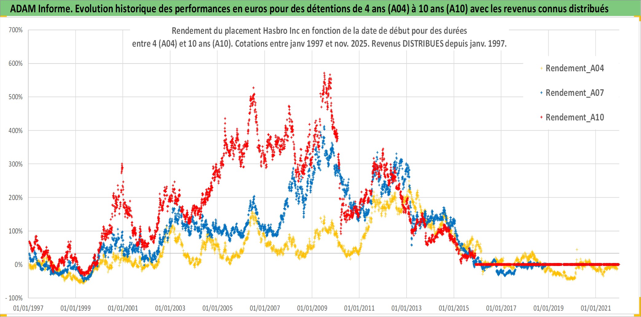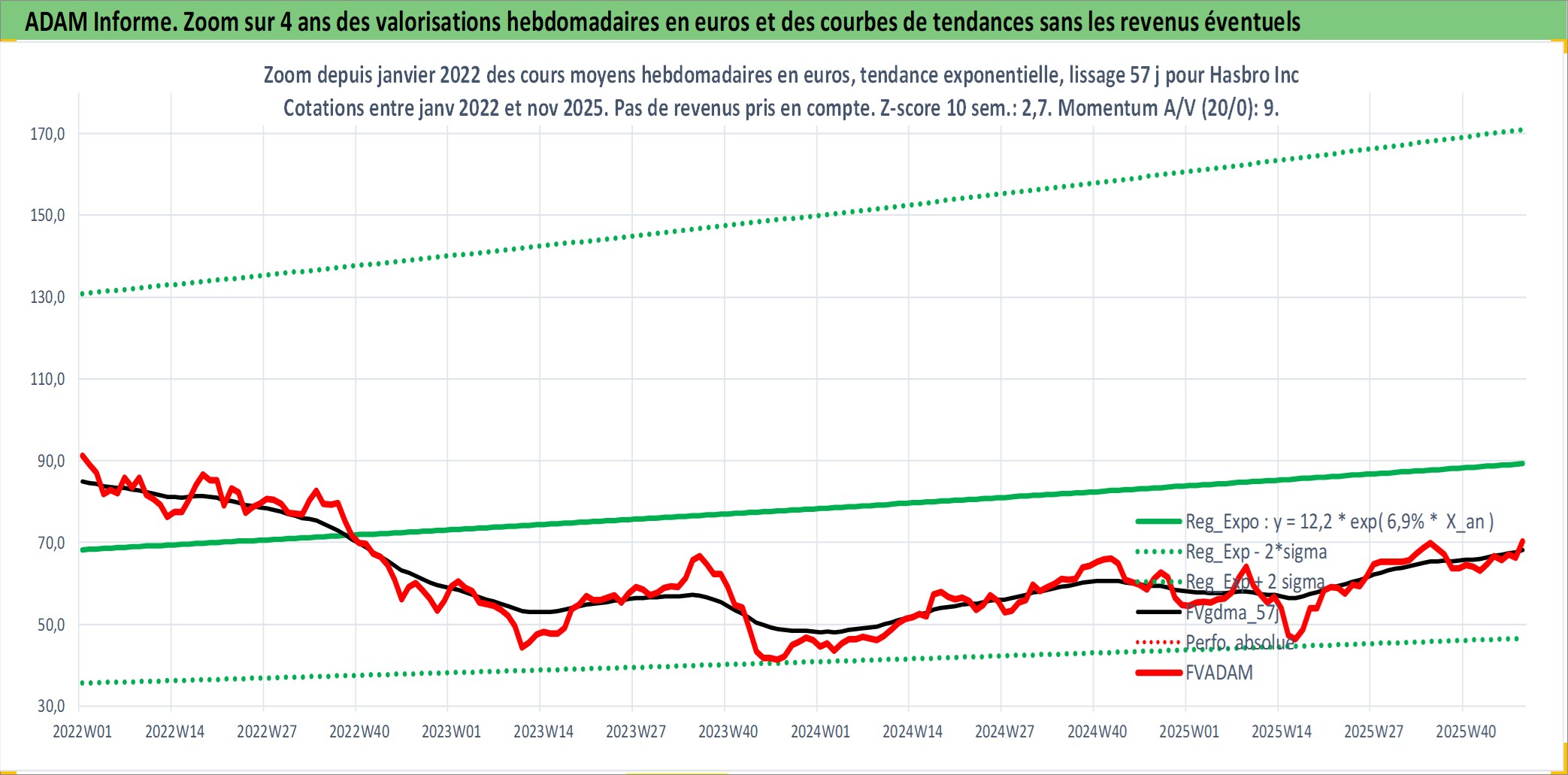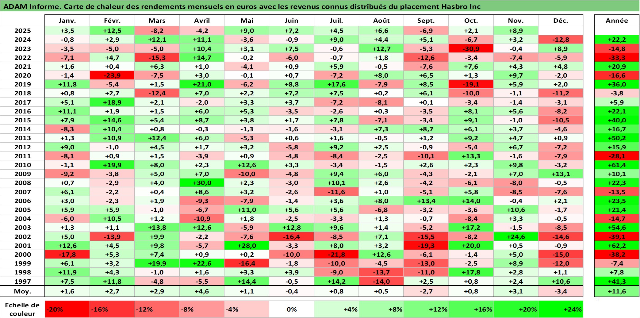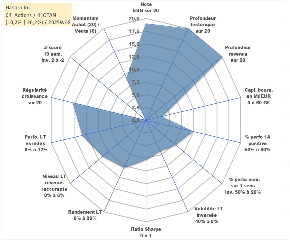 Site dédié aux investisseursPage dédiée sur site financeAnalyse des valorisations hebdomadaires de l'action Hasbro Inc. Cet actif est cote en USD. Les valorisations sont en contrevaleur EURO et couvrent les semaines 1997W01 a 2025W48. Les revenus de cet actif financier sont pris en compte depuis la semaine 1997W05. La note globale ESG de cet actif est estimee a 19.0 (apres rebasage entre 0 et 20).