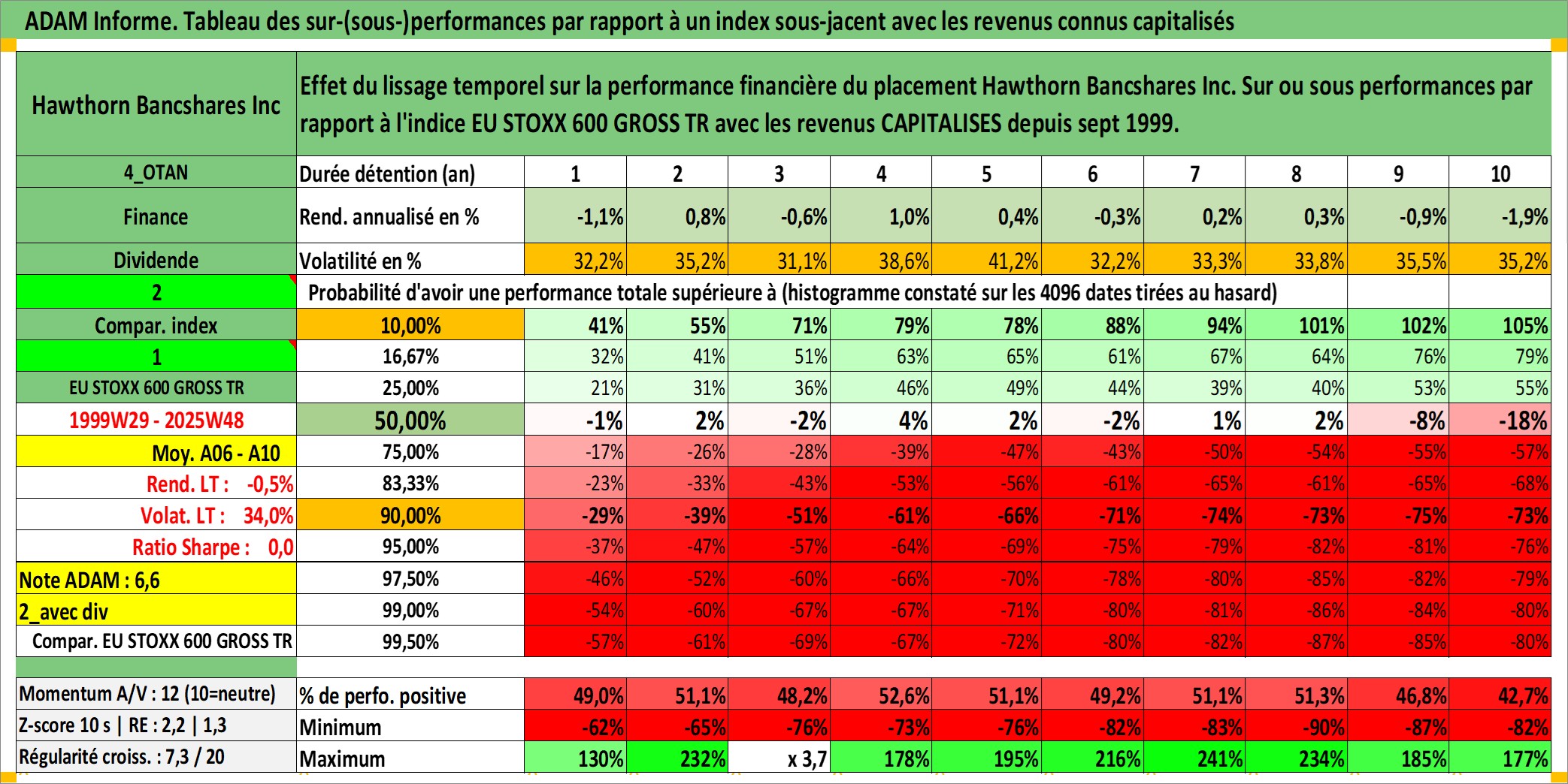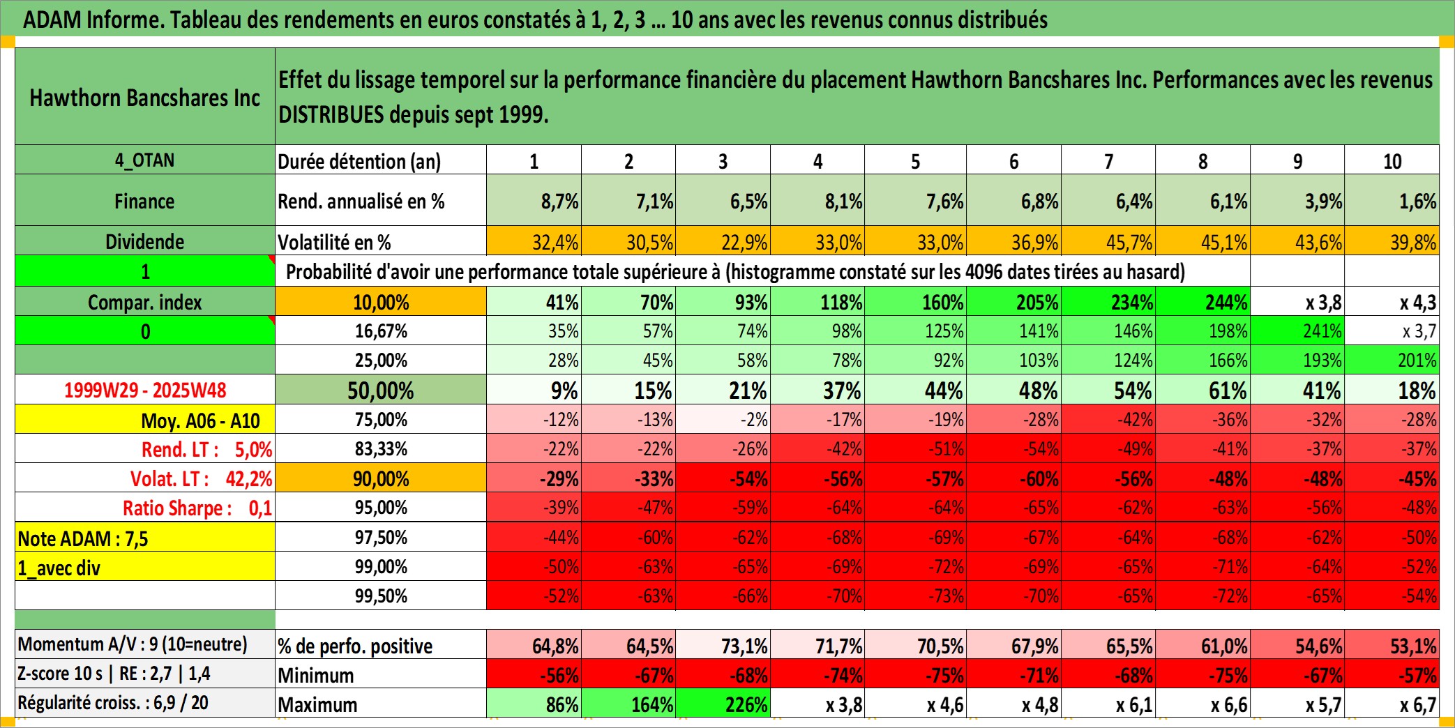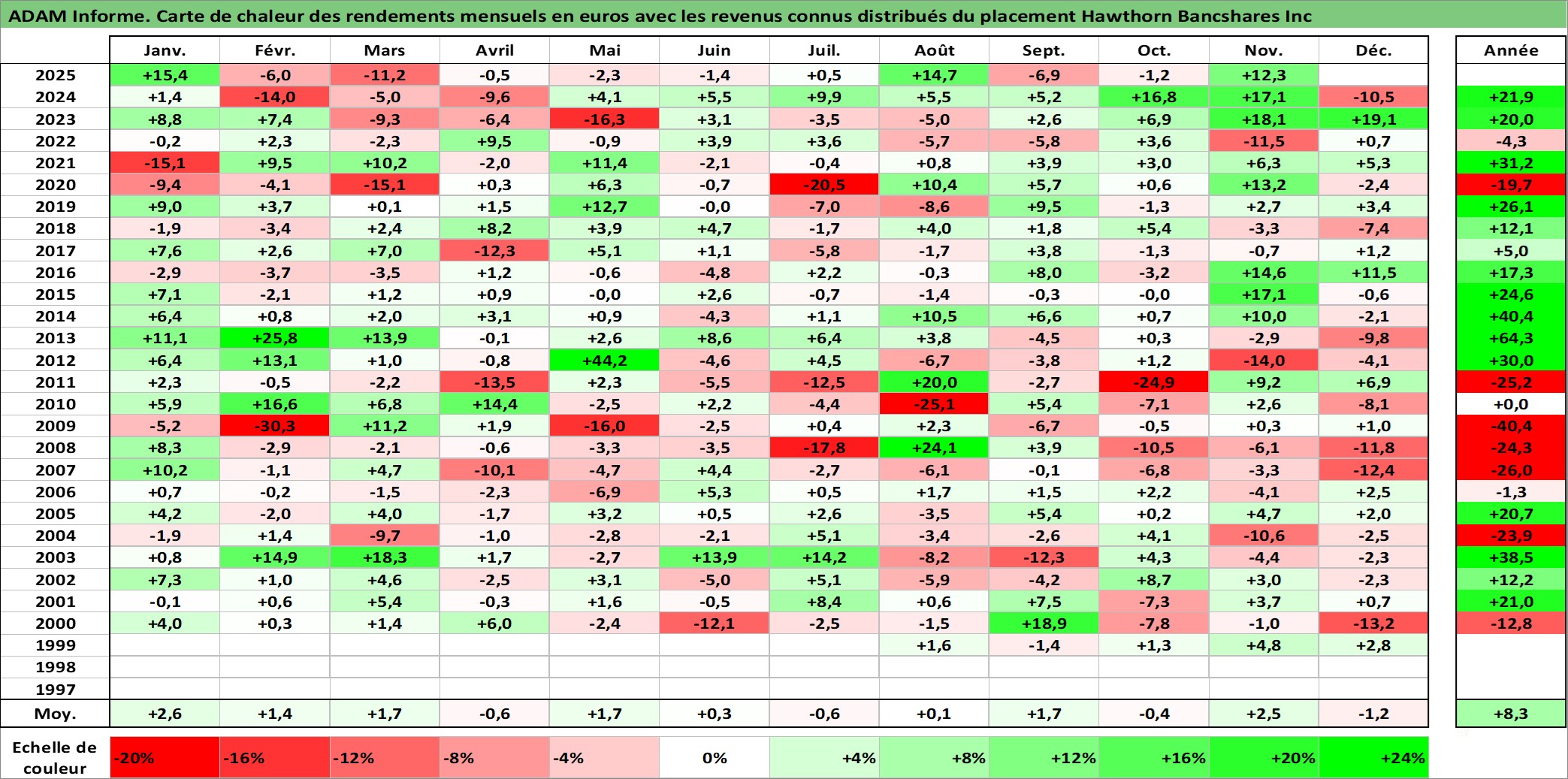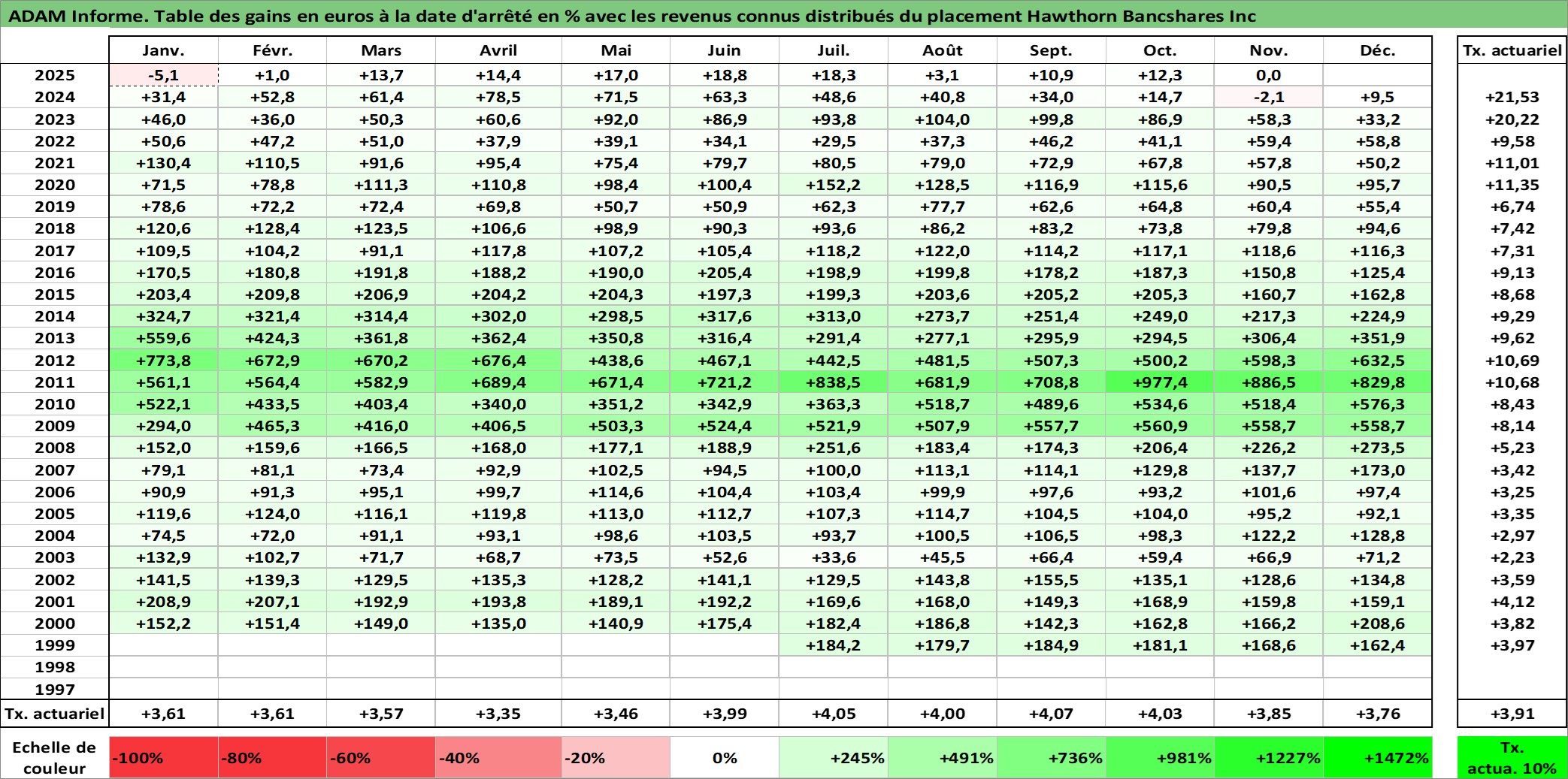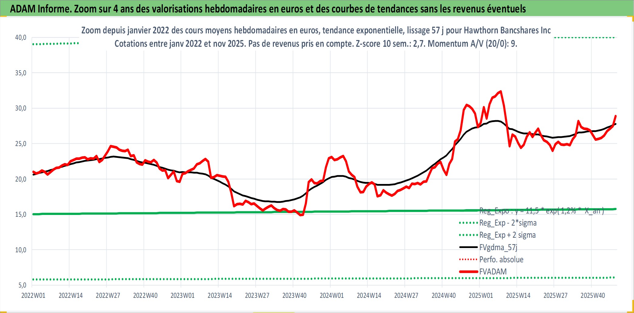 Site dédié aux investisseursPage dédiée sur site financeAnalyse des valorisations hebdomadaires de l'action Hawthorn Bancshares Inc. Cet actif est cote en USD. Les valorisations sont en contrevaleur EURO et couvrent les semaines 1999W29 a 2025W48. Les revenus de cet actif financier sont pris en compte depuis la semaine 1999W37. La note ESG de cet actif n'est pas connue.