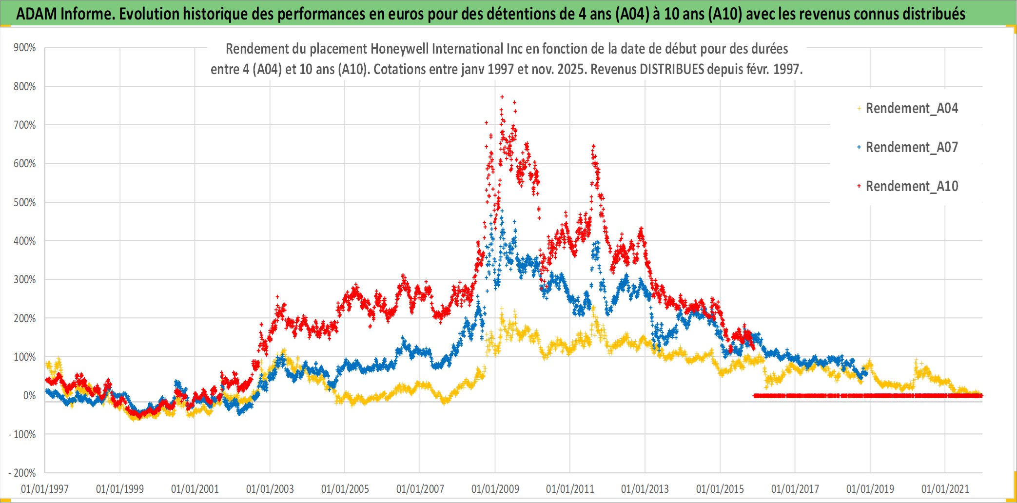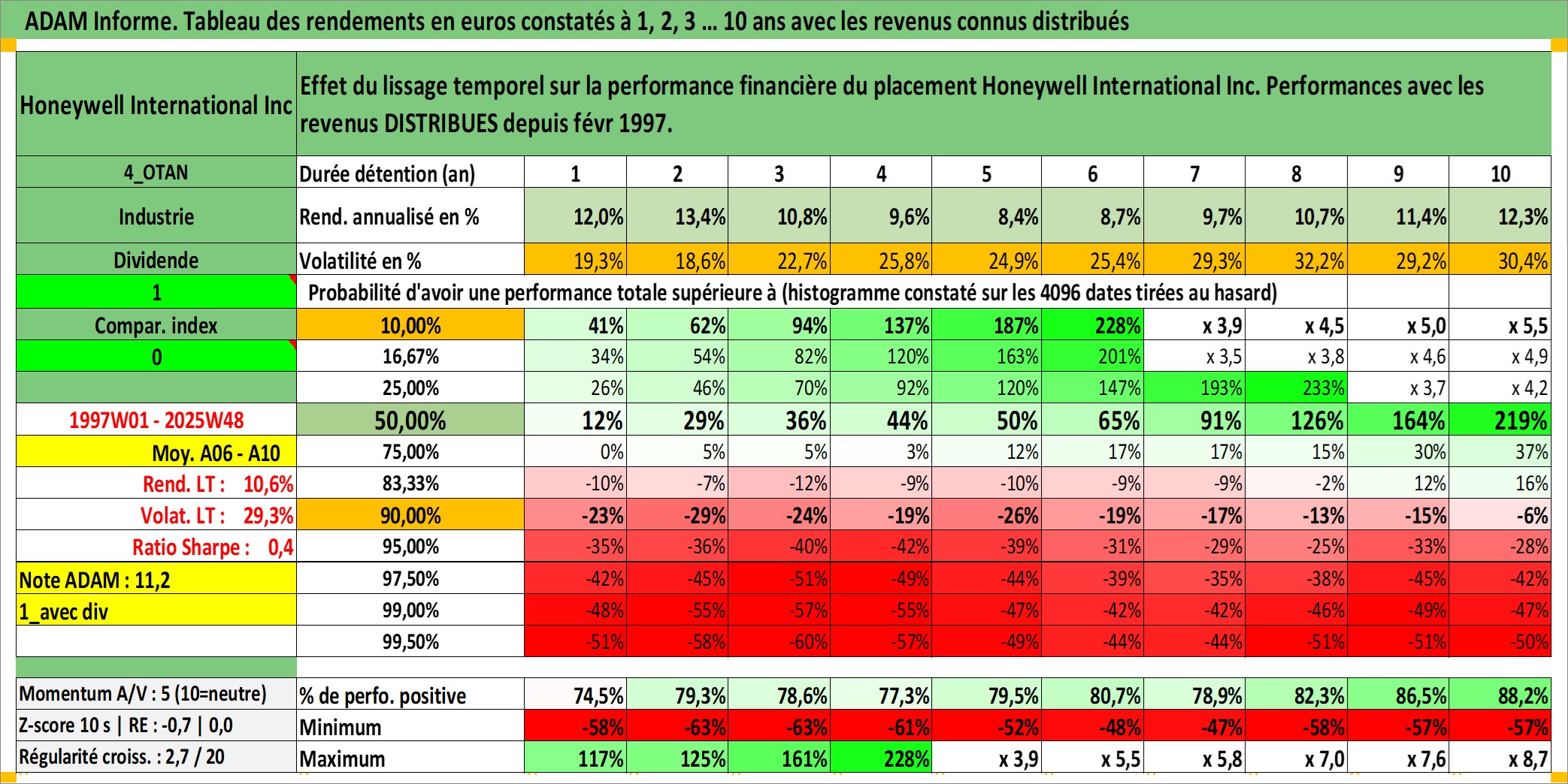 Site dédié aux investisseursPage dédiée sur site financeAnalyse des valorisations hebdomadaires de l'action Honeywell International Inc. Cet actif est cote en USD. Les valorisations sont en contrevaleur EURO et couvrent les semaines 1997W01 a 2025W48. Les revenus de cet actif financier sont pris en compte depuis la semaine 1997W08. La note globale ESG de cet actif est estimee a 6.0 (apres rebasage entre 0 et 20).