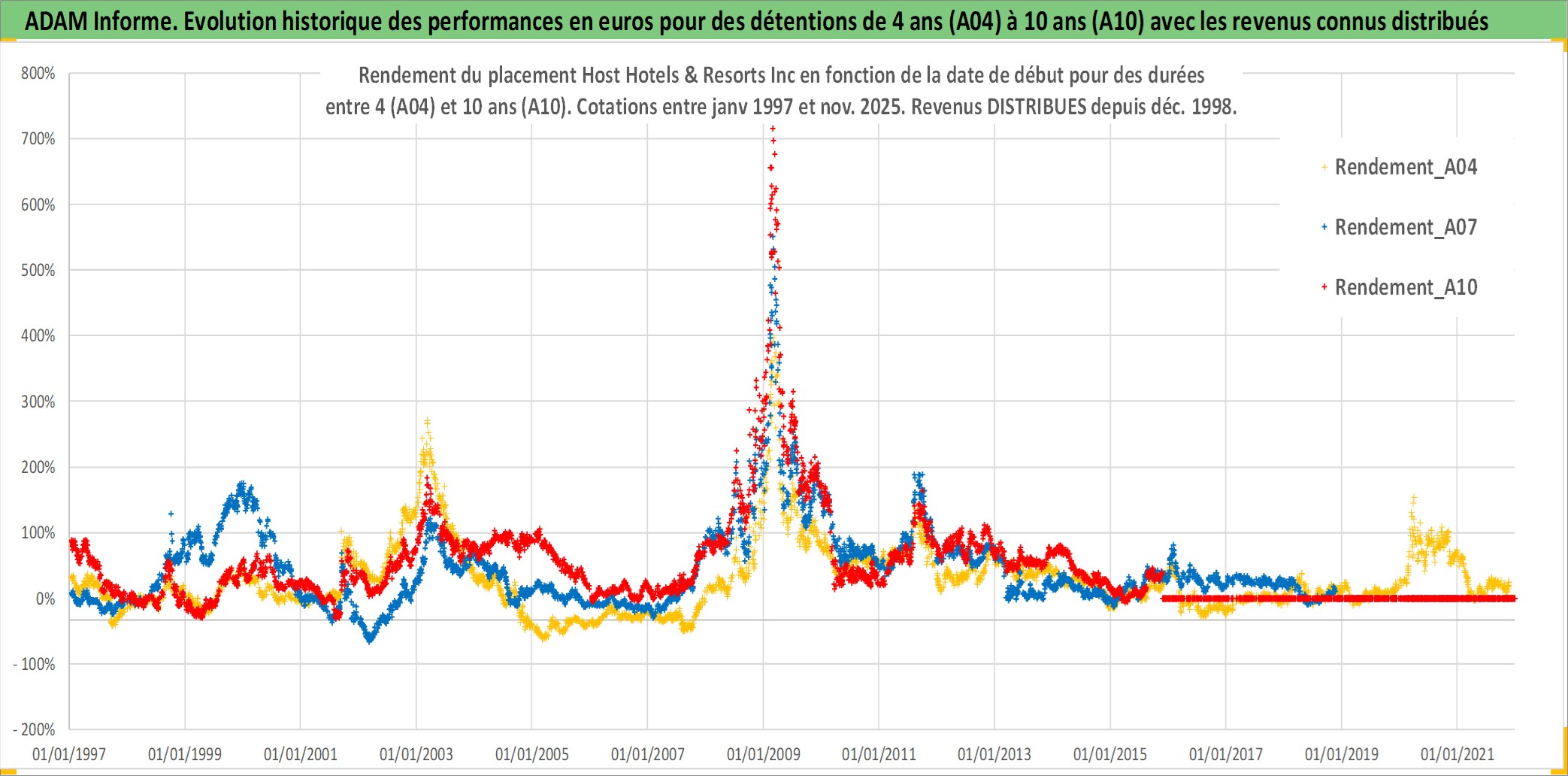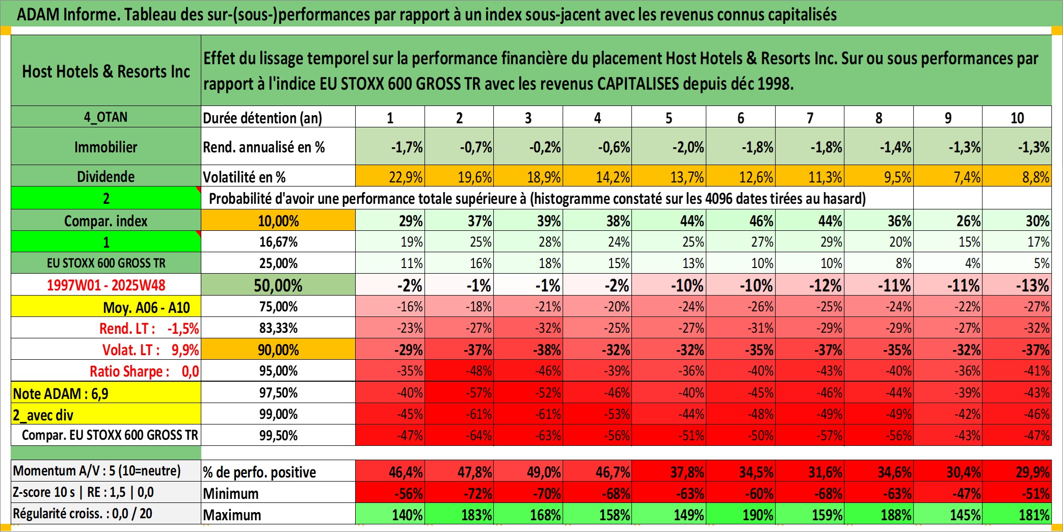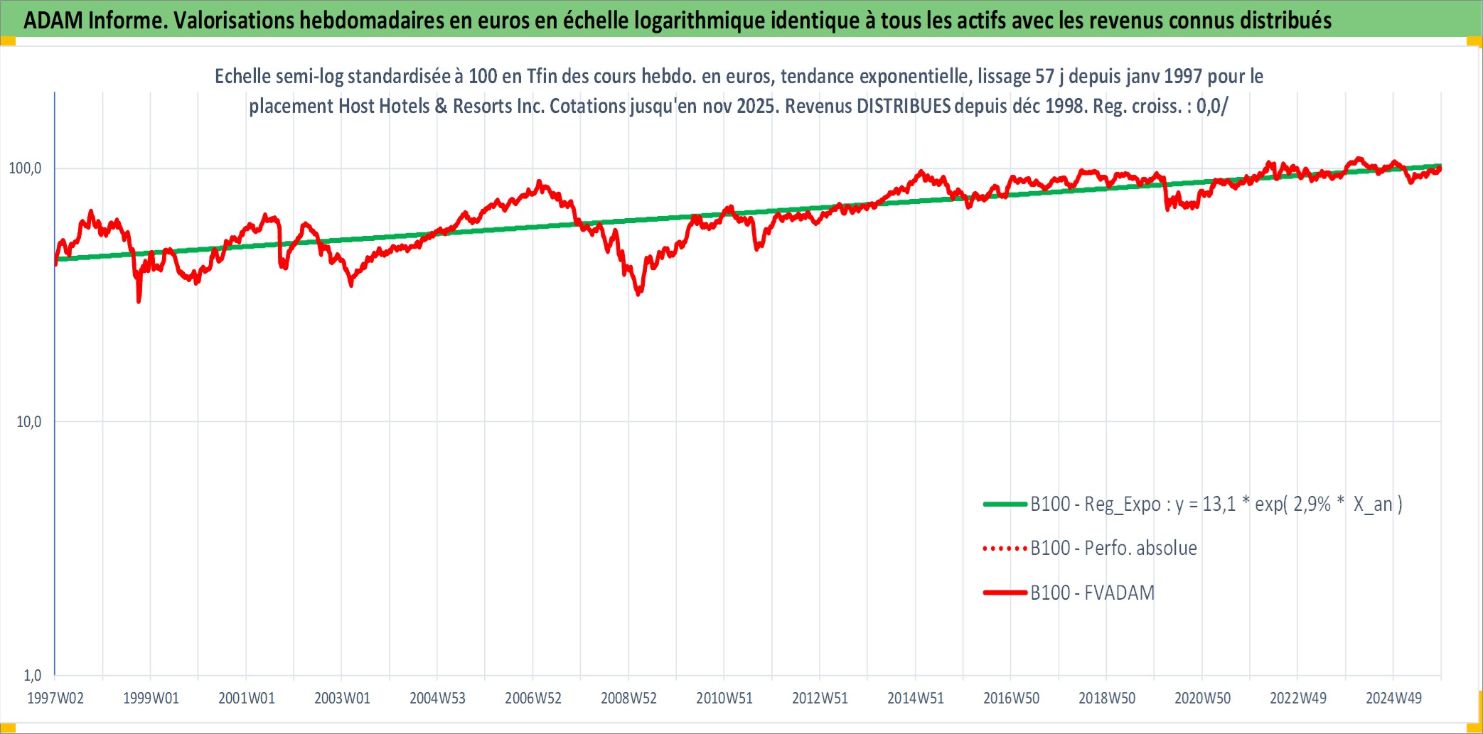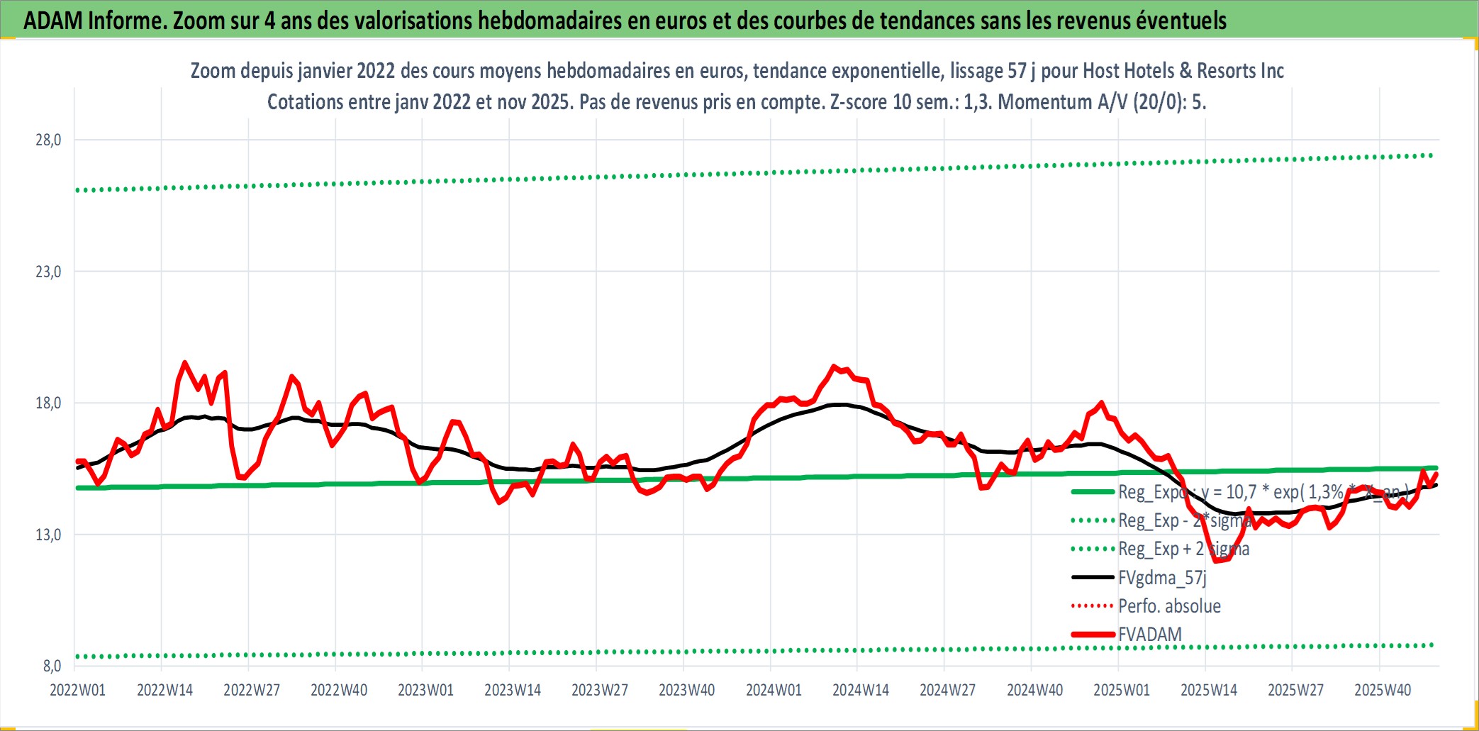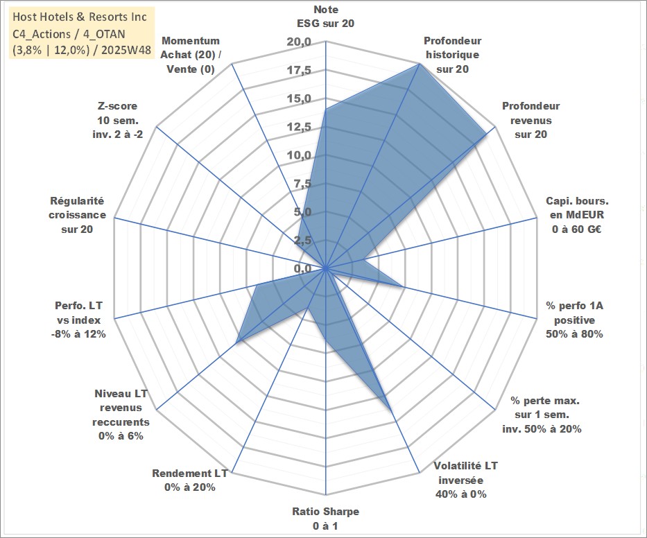 Site dédié aux investisseursPage dédiée sur site financeAnalyse des valorisations hebdomadaires de l'action Host Hotels & Resorts Inc. Cet actif est cote en USD. Les valorisations sont en contrevaleur EURO et couvrent les semaines 1997W01 a 2025W48. Les revenus de cet actif financier sont pris en compte depuis la semaine 1998W52. La note globale ESG de cet actif est estimee a 14.0 (apres rebasage entre 0 et 20).