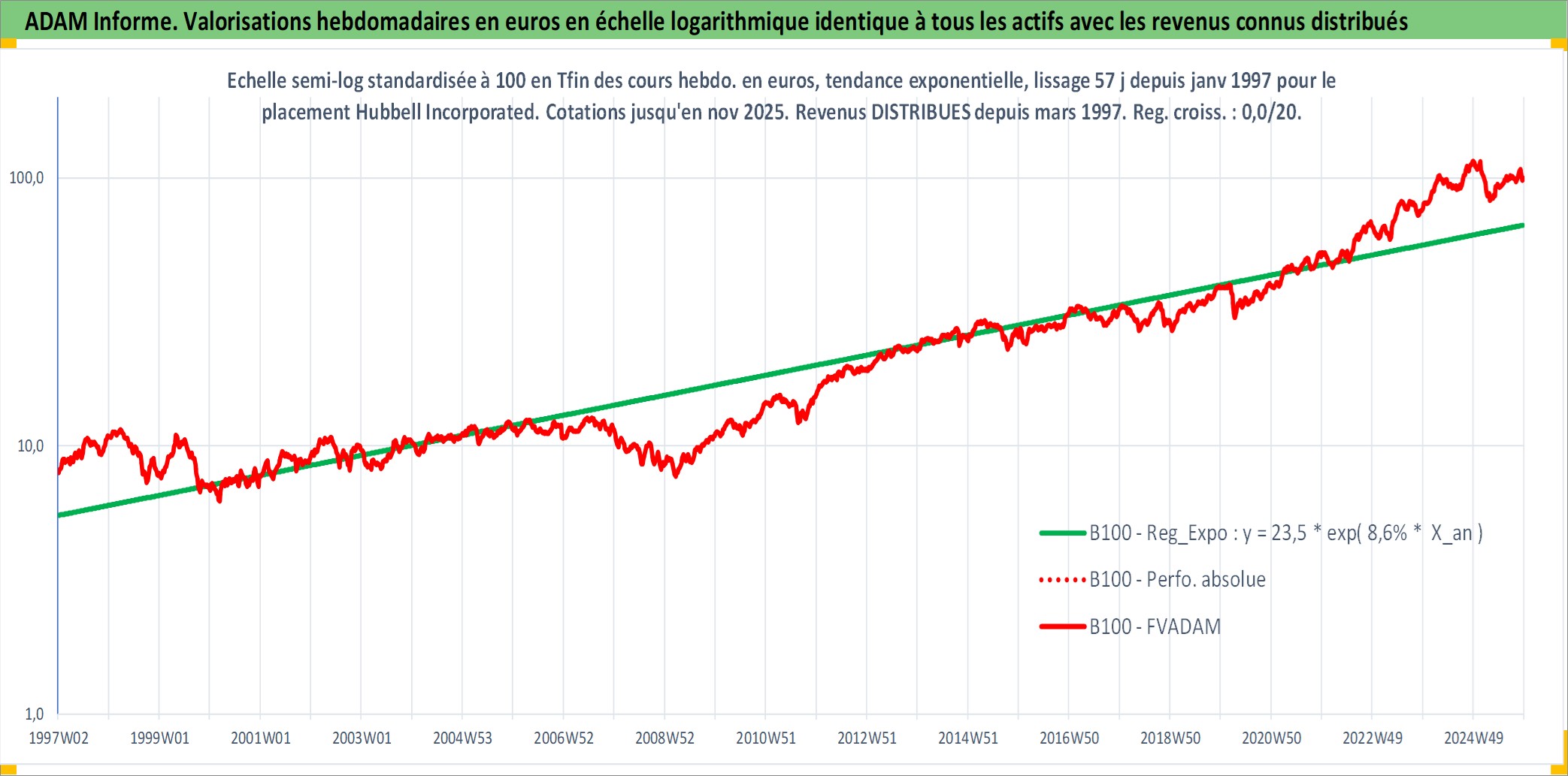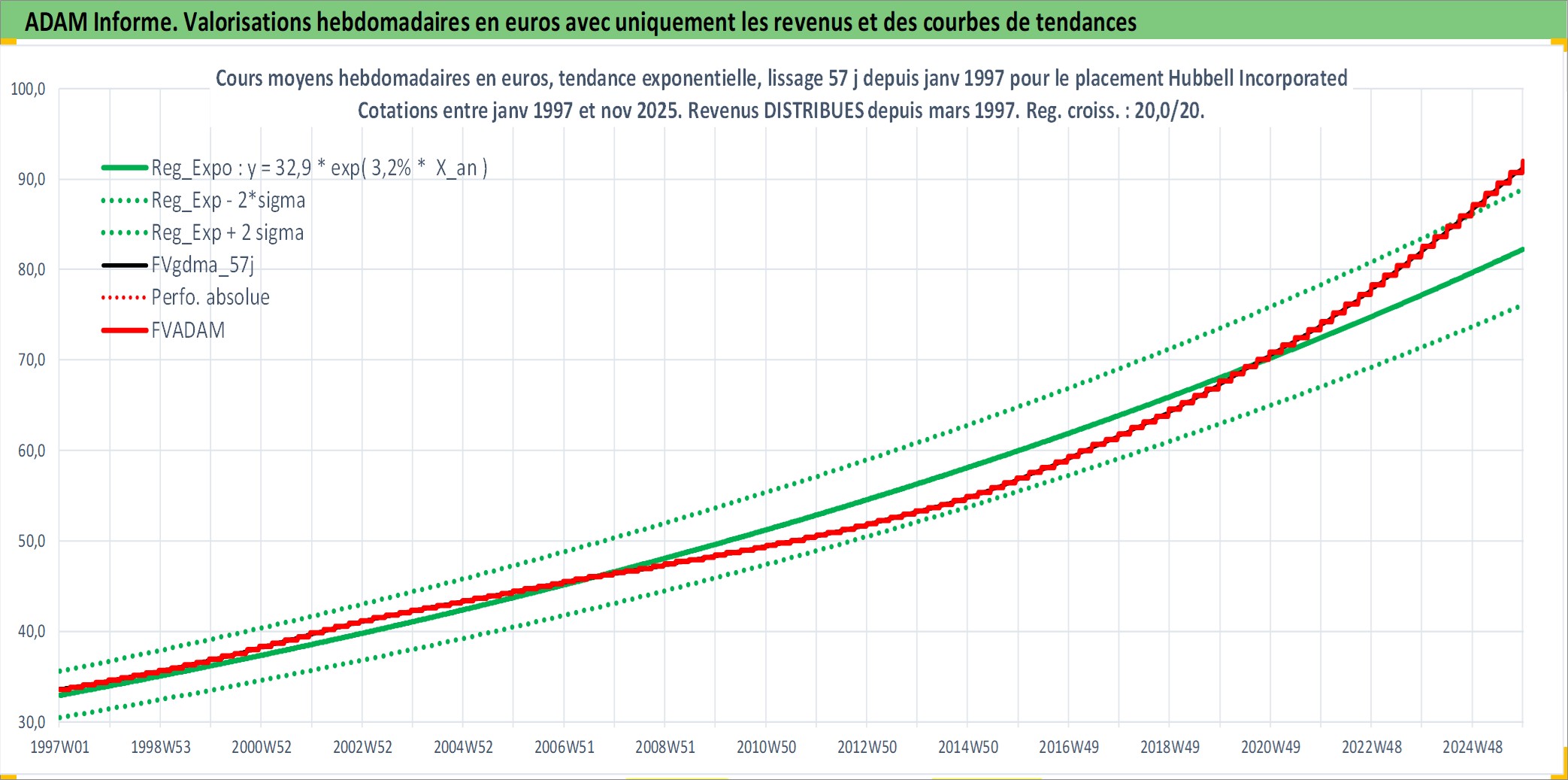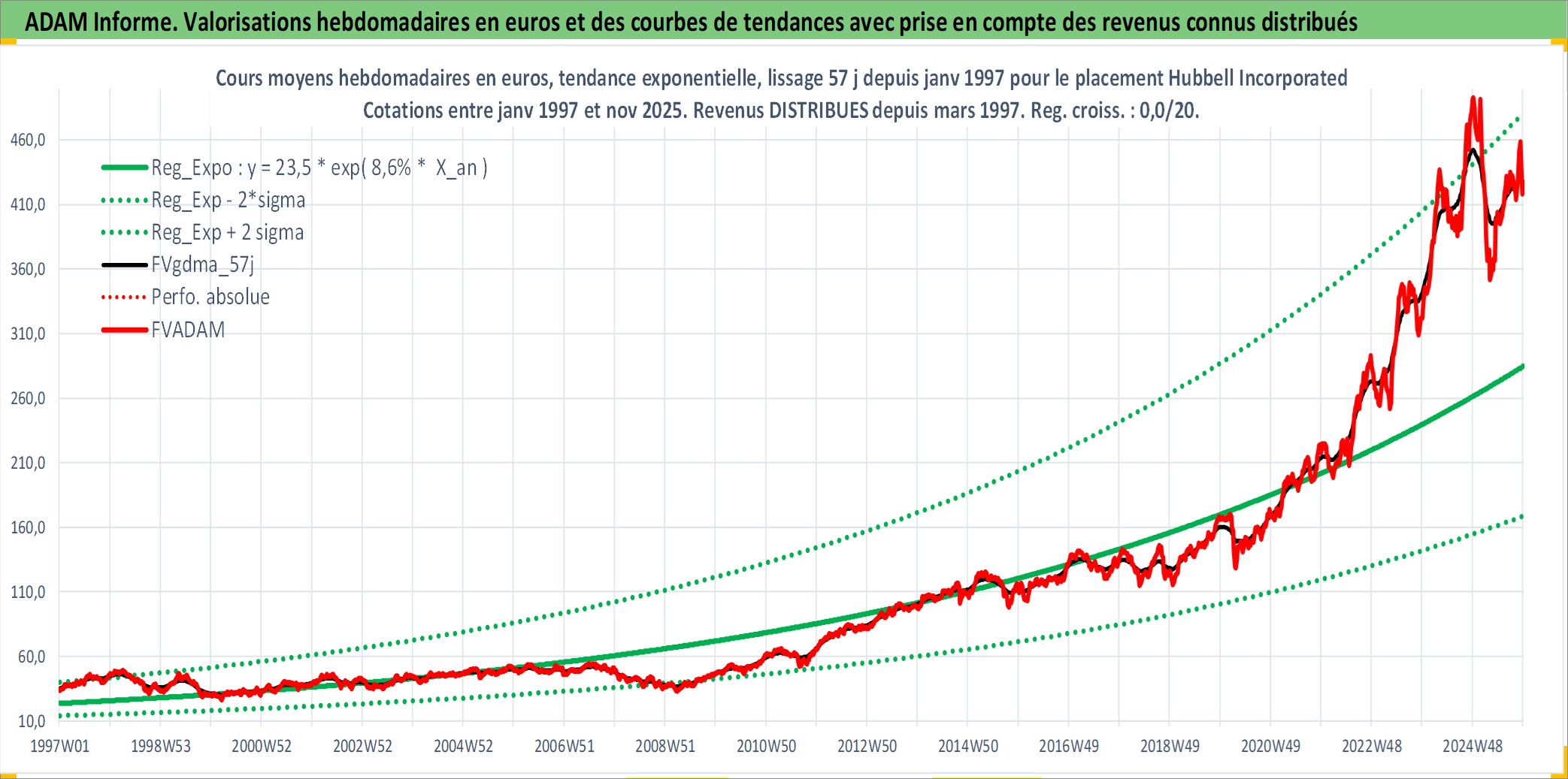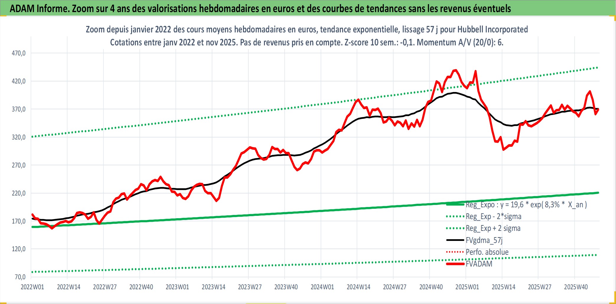 Site dédié aux investisseursPage dédiée sur site financeAnalyse des valorisations hebdomadaires de l'action Hubbell Incorporated. Cet actif est cote en USD. Les valorisations sont en contrevaleur EURO et couvrent les semaines 1997W01 a 2025W48. Les revenus de cet actif financier sont pris en compte depuis la semaine 1997W12. La note globale ESG de cet actif est estimee a 7.0 (apres rebasage entre 0 et 20).