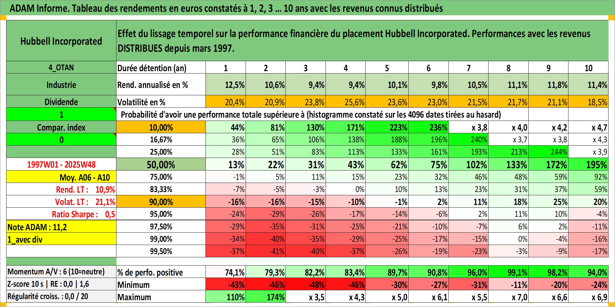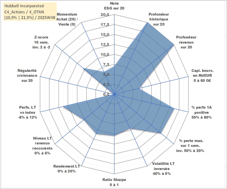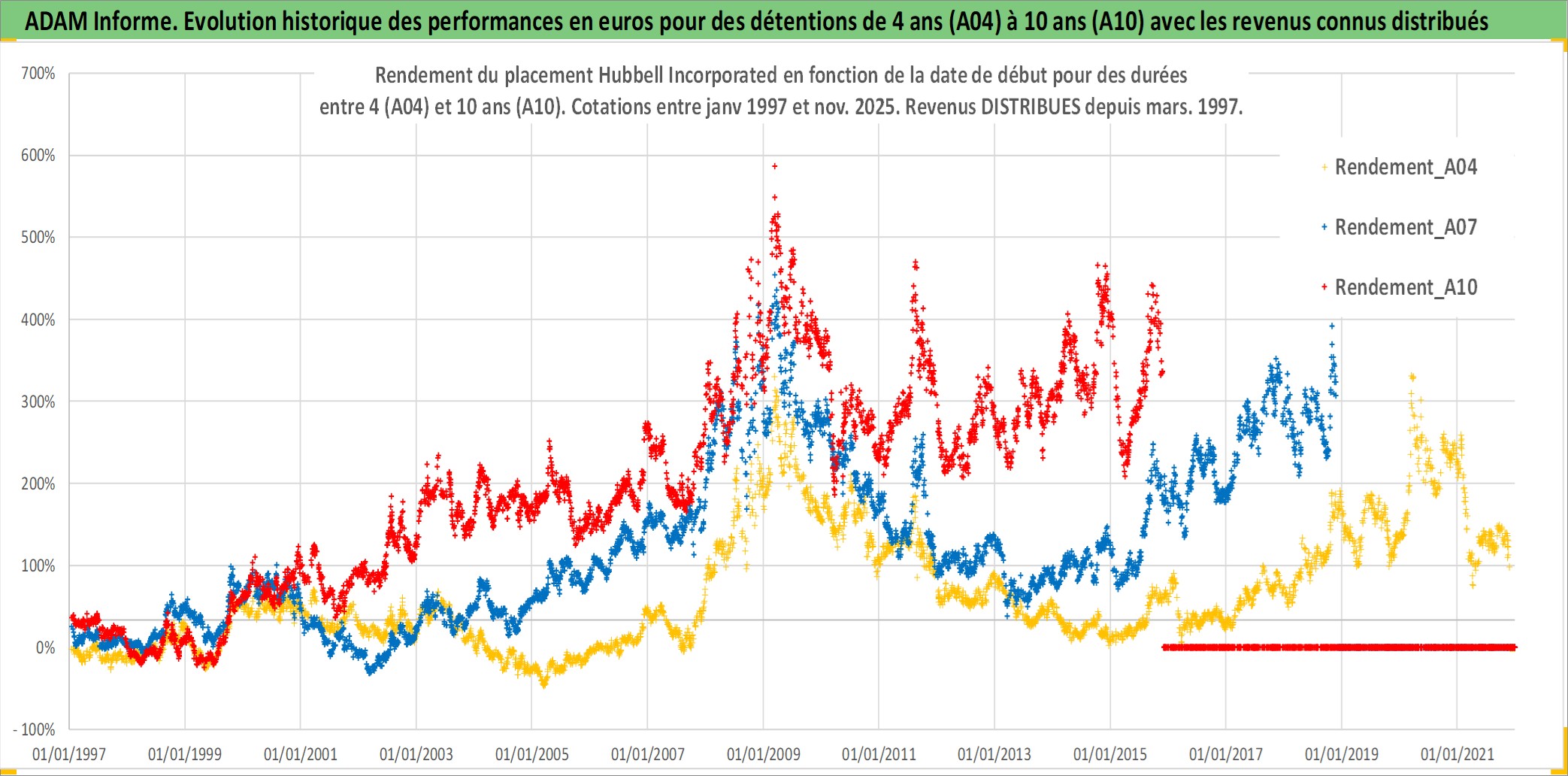 Site dédié aux investisseursPage dédiée sur site financeAnalyse des valorisations hebdomadaires de l'action Hubbell Incorporated. Cet actif est cote en USD. Les valorisations sont en contrevaleur EURO et couvrent les semaines 1997W01 a 2025W48. Les revenus de cet actif financier sont pris en compte depuis la semaine 1997W12. La note globale ESG de cet actif est estimee a 7.0 (apres rebasage entre 0 et 20).