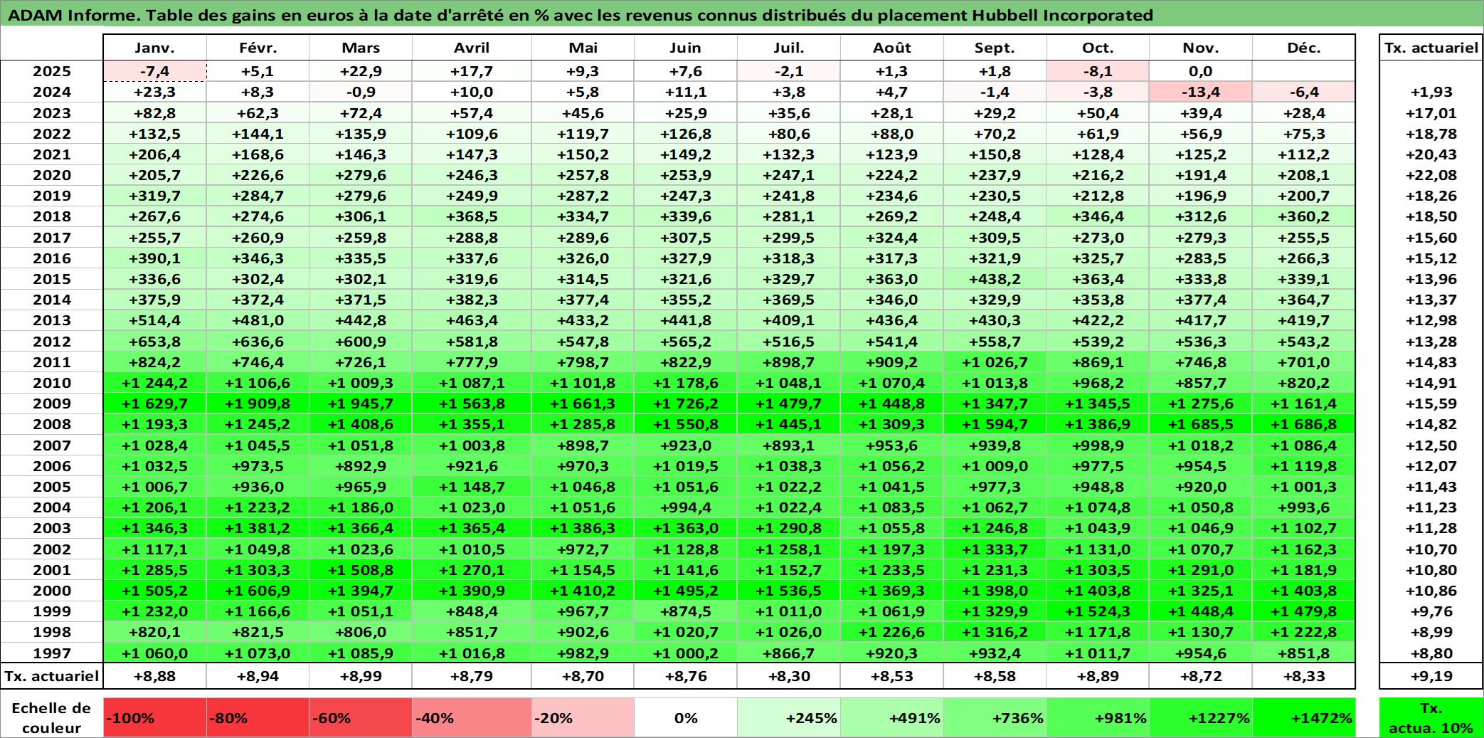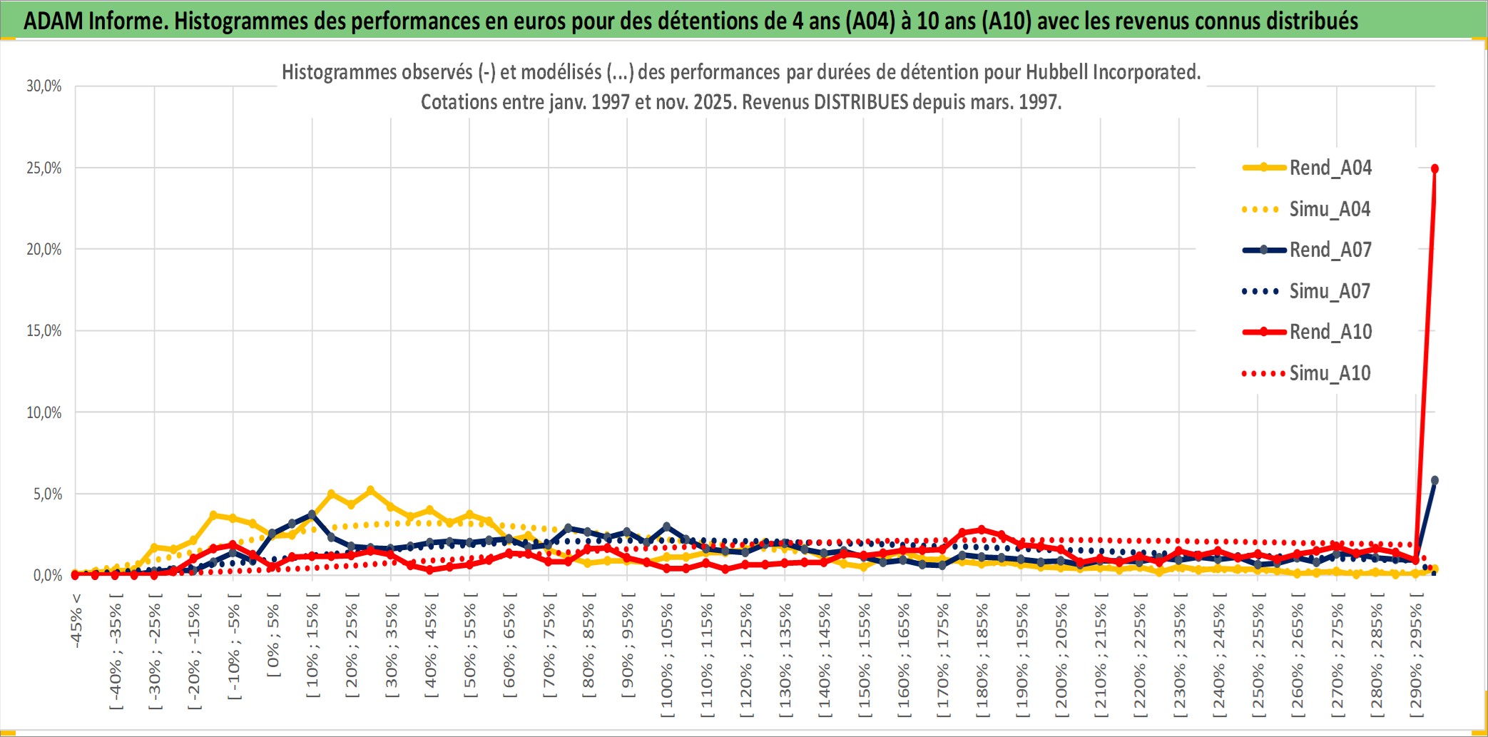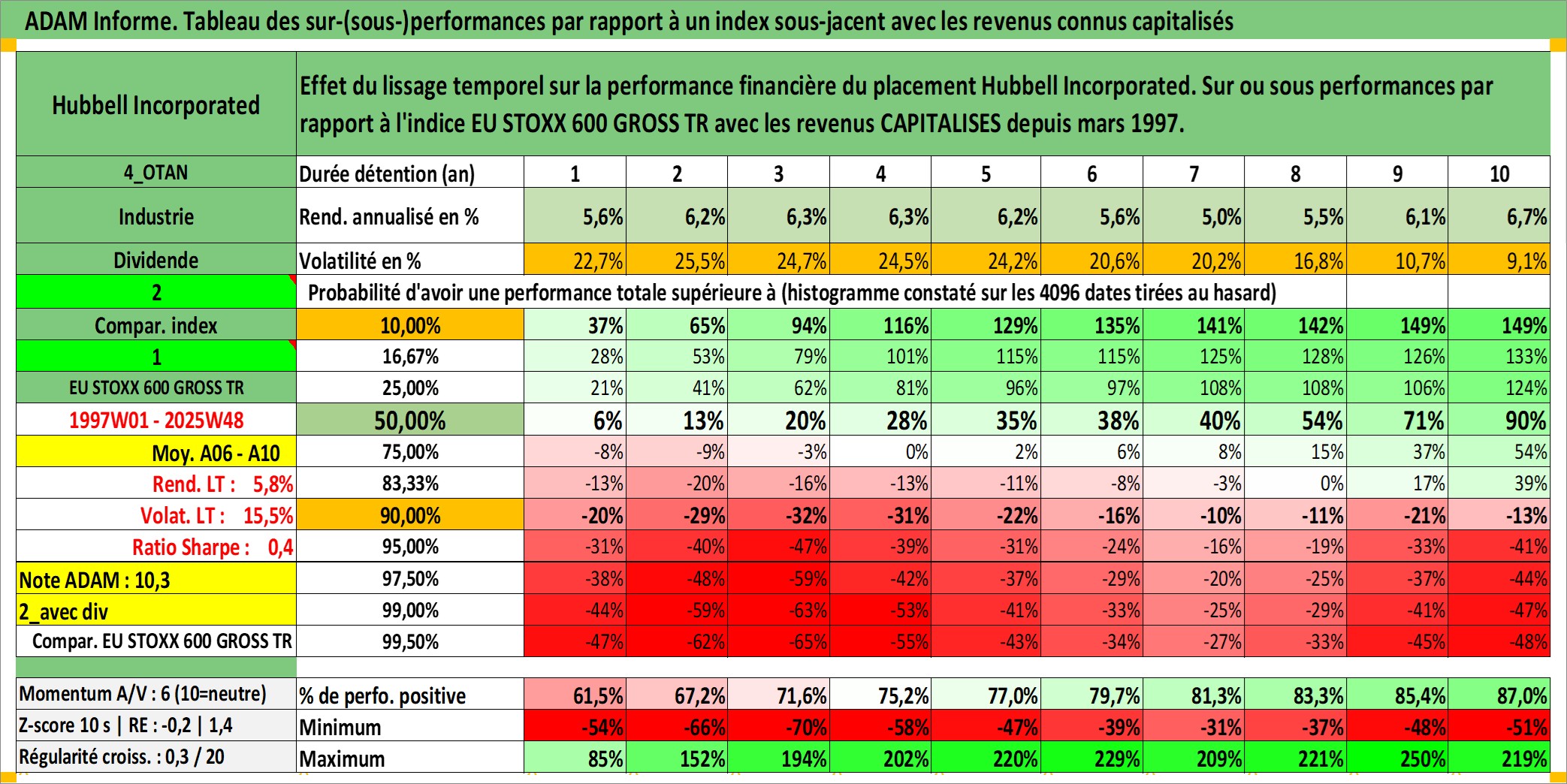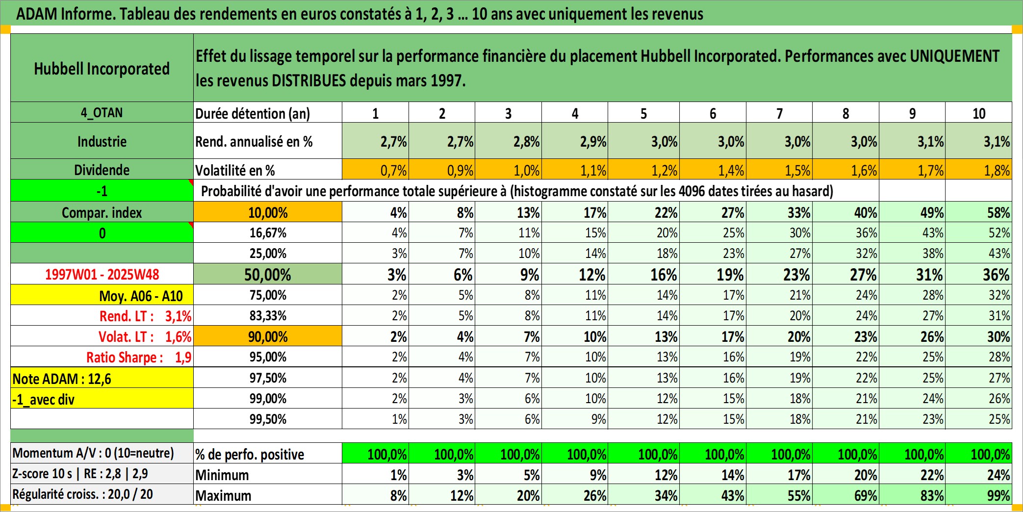 Site dédié aux investisseursPage dédiée sur site financeAnalyse des valorisations hebdomadaires de l'action Hubbell Incorporated. Cet actif est cote en USD. Les valorisations sont en contrevaleur EURO et couvrent les semaines 1997W01 a 2025W48. Les revenus de cet actif financier sont pris en compte depuis la semaine 1997W12. La note globale ESG de cet actif est estimee a 7.0 (apres rebasage entre 0 et 20).