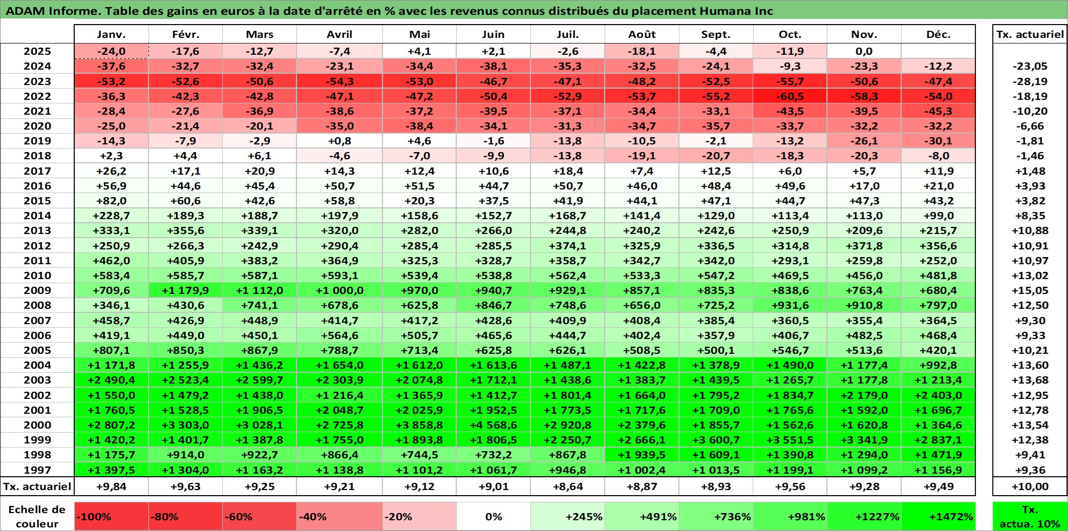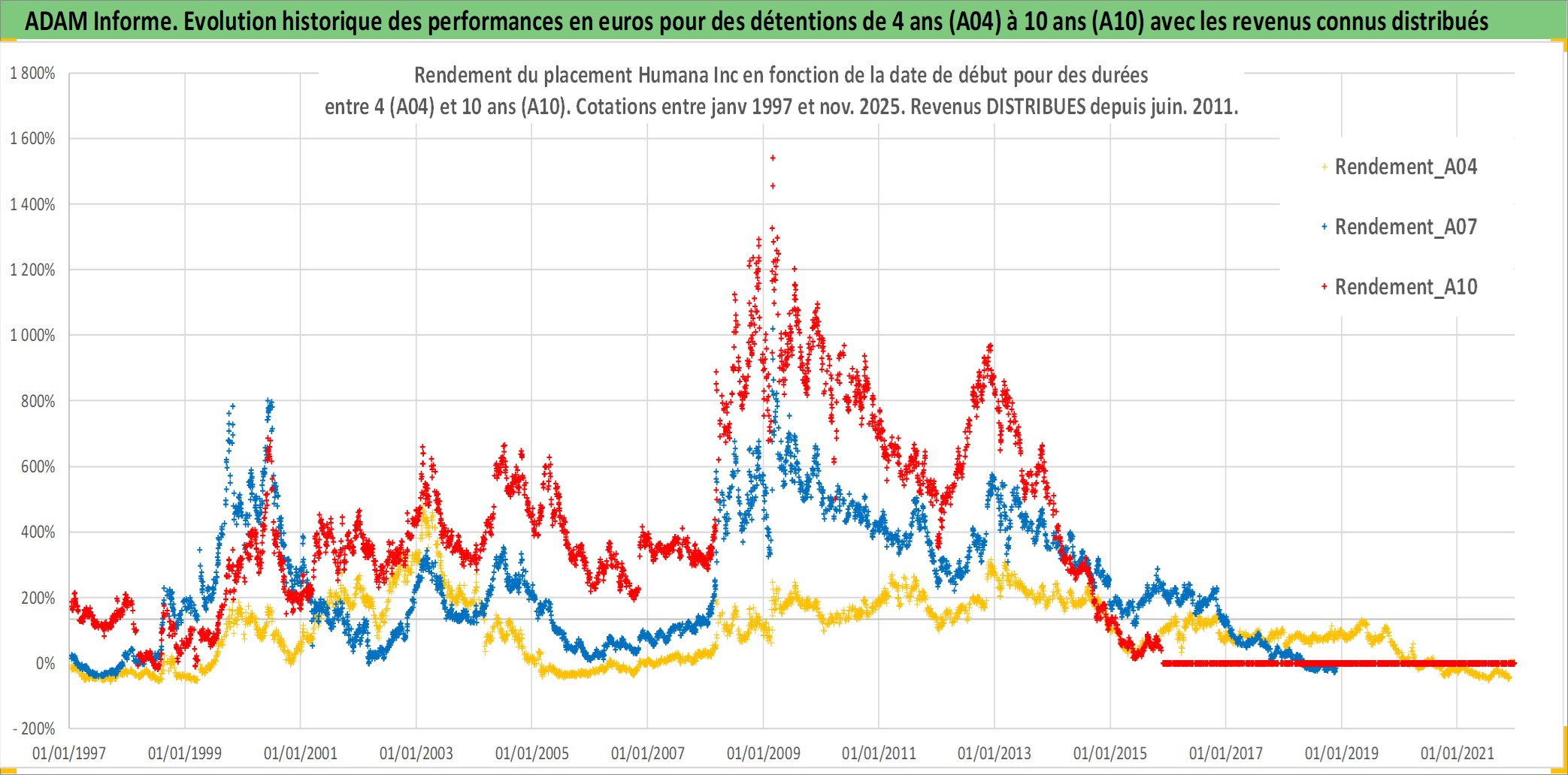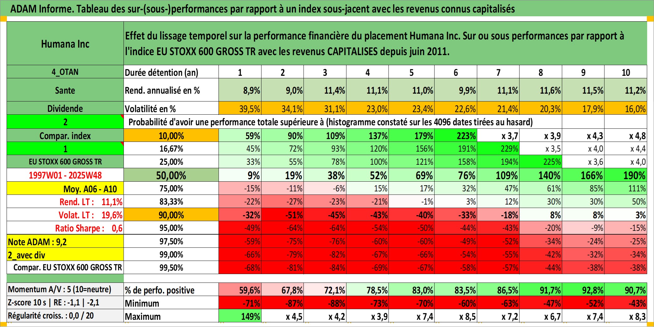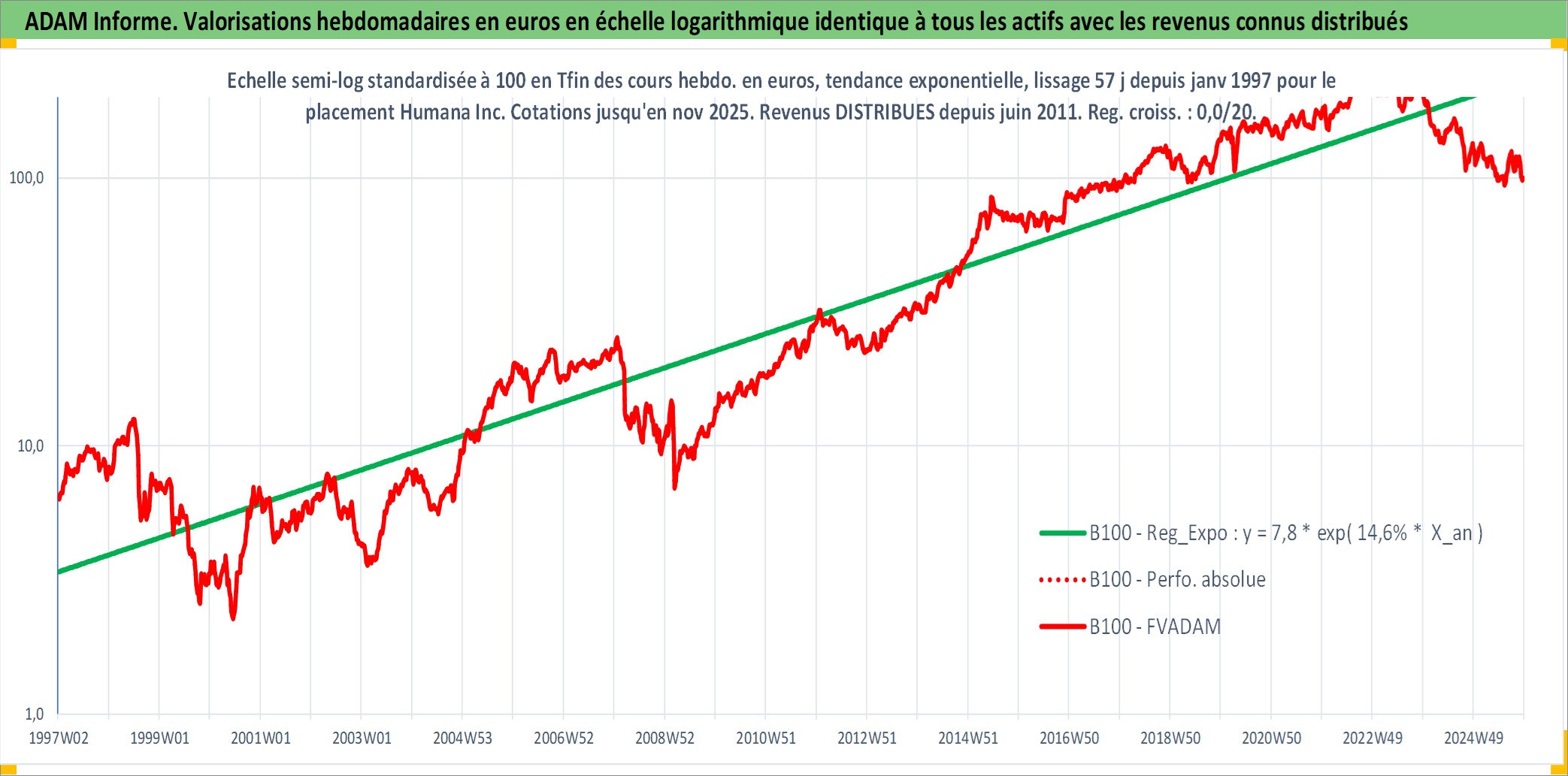 Site dédié aux investisseursPage dédiée sur site financeAnalyse des valorisations hebdomadaires de l'action Humana Inc. Cet actif est cote en USD. Les valorisations sont en contrevaleur EURO et couvrent les semaines 1997W01 a 2025W48. Les revenus de cet actif financier sont pris en compte depuis la semaine 2011W26. La note globale ESG de cet actif est estimee a 9.0 (apres rebasage entre 0 et 20).