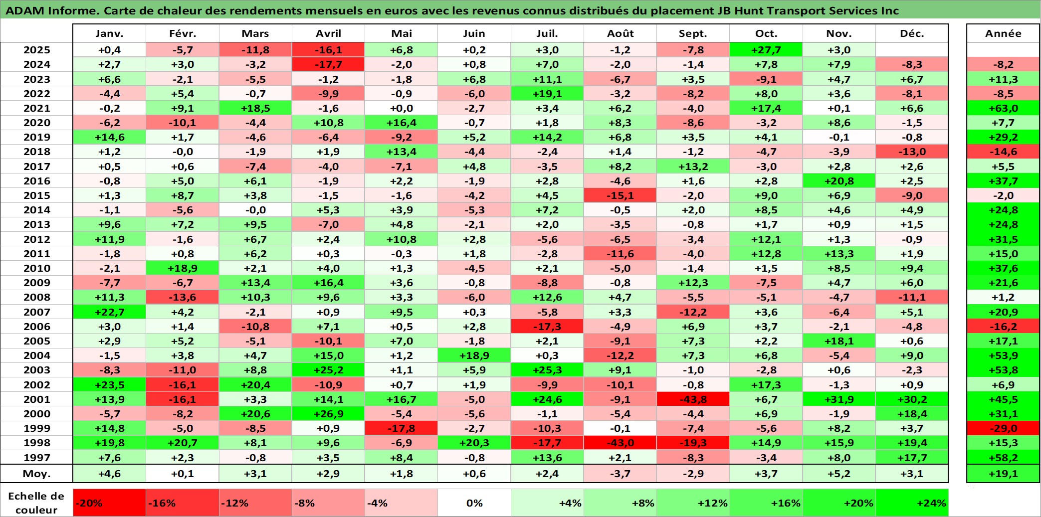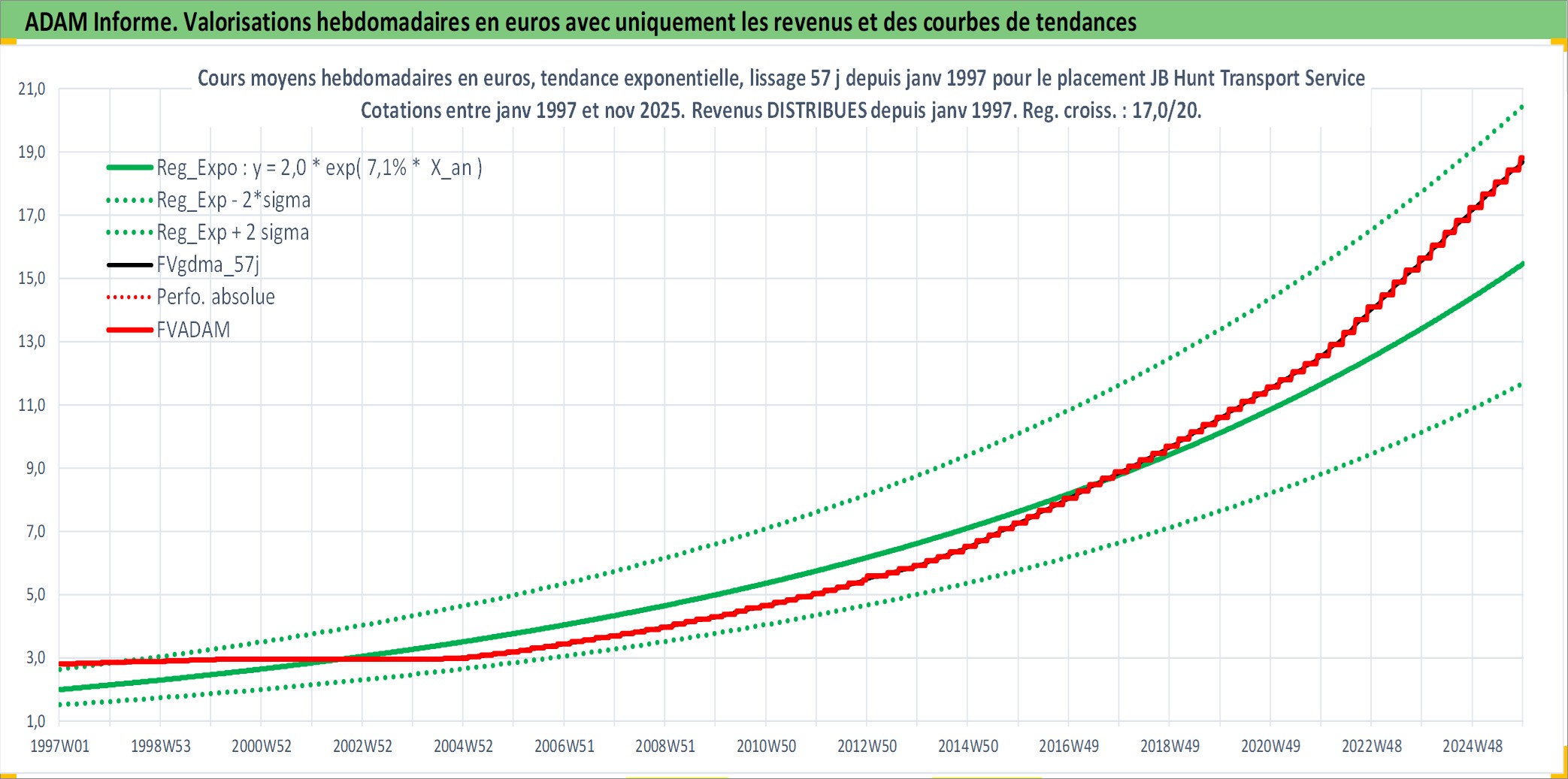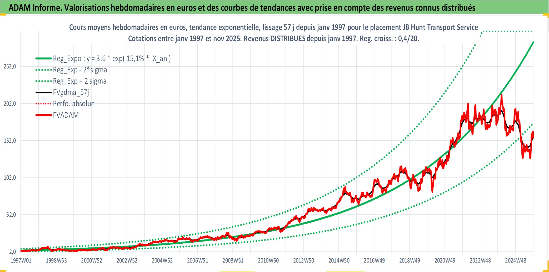 Site dédié aux investisseursPage dédiée sur site financeAnalyse des valorisations hebdomadaires de l'action JB Hunt Transport Services Inc. Cet actif est cote en USD. Les valorisations sont en contrevaleur EURO et couvrent les semaines 1997W01 a 2025W48. Les revenus de cet actif financier sont pris en compte depuis la semaine 1997W05. La note globale ESG de cet actif est estimee a 14.0 (apres rebasage entre 0 et 20).