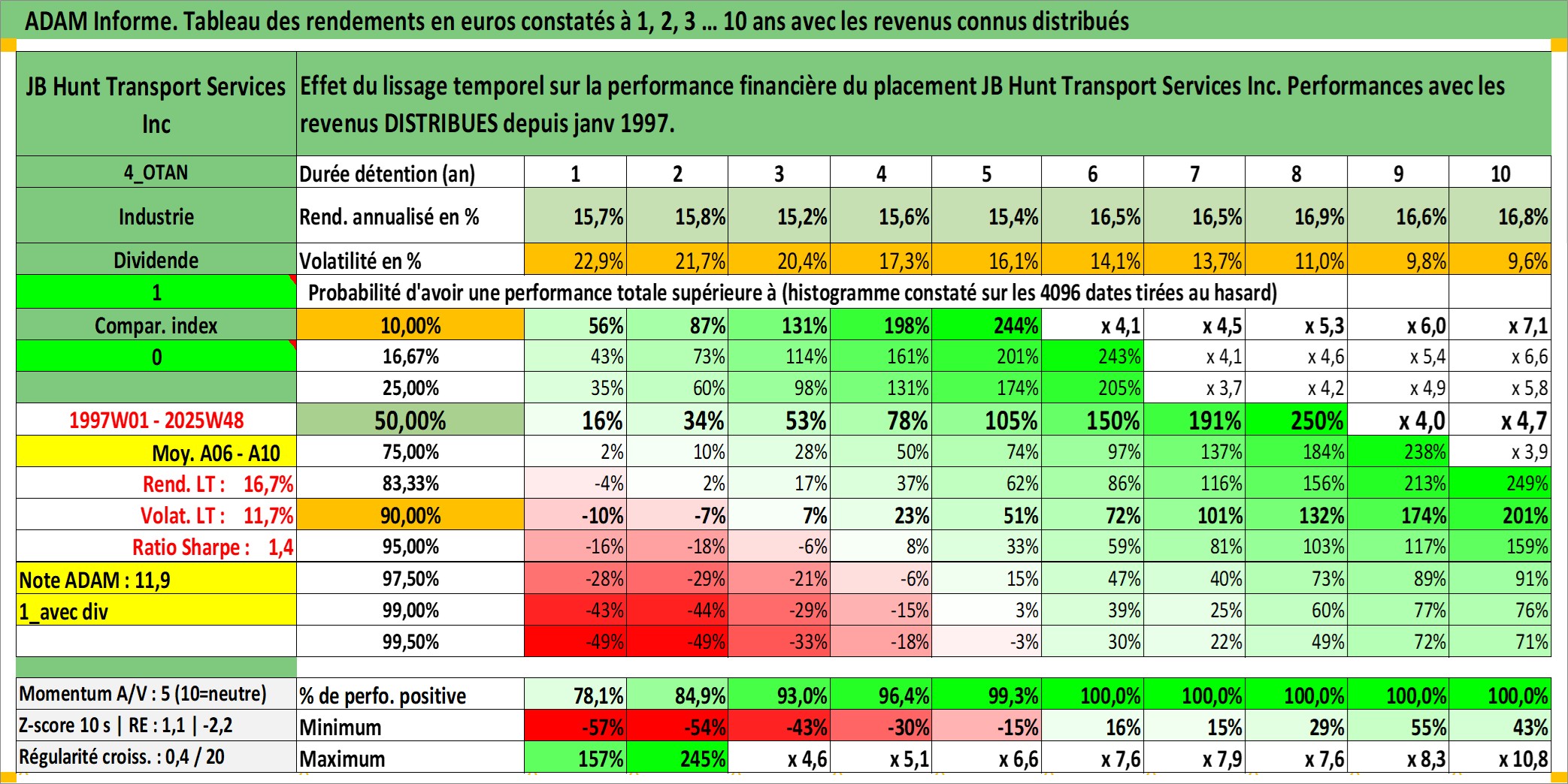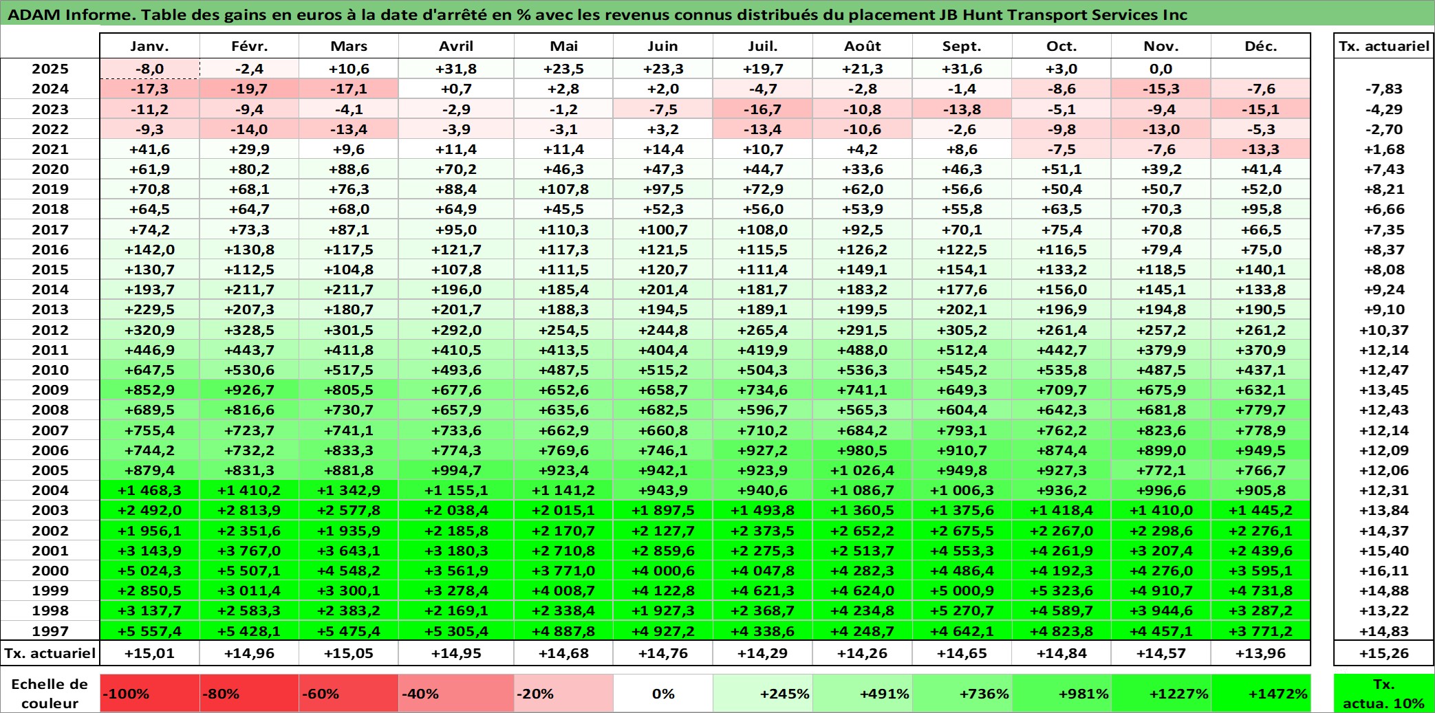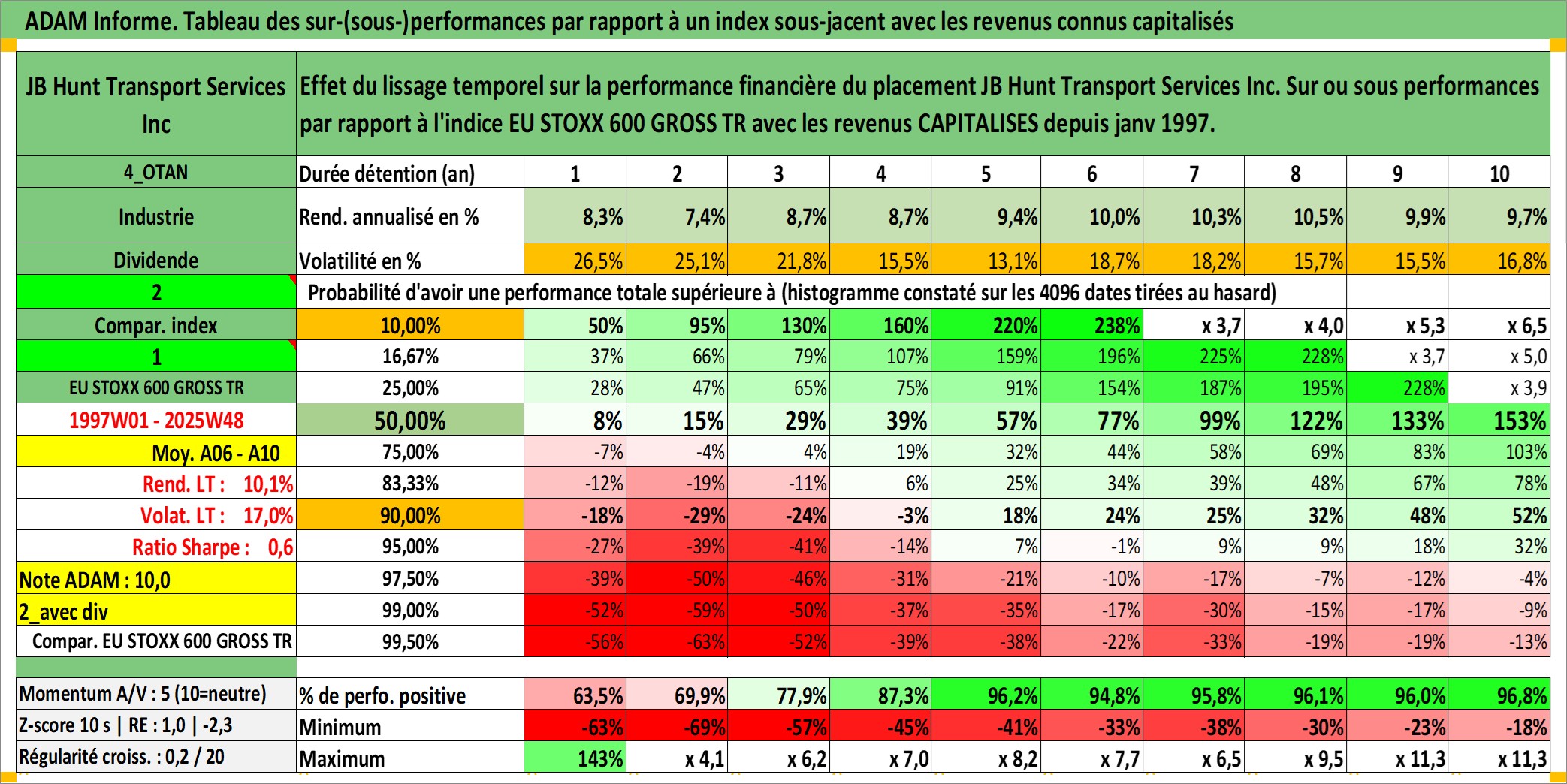 Site dédié aux investisseursPage dédiée sur site financeAnalyse des valorisations hebdomadaires de l'action JB Hunt Transport Services Inc. Cet actif est cote en USD. Les valorisations sont en contrevaleur EURO et couvrent les semaines 1997W01 a 2025W48. Les revenus de cet actif financier sont pris en compte depuis la semaine 1997W05. La note globale ESG de cet actif est estimee a 14.0 (apres rebasage entre 0 et 20).