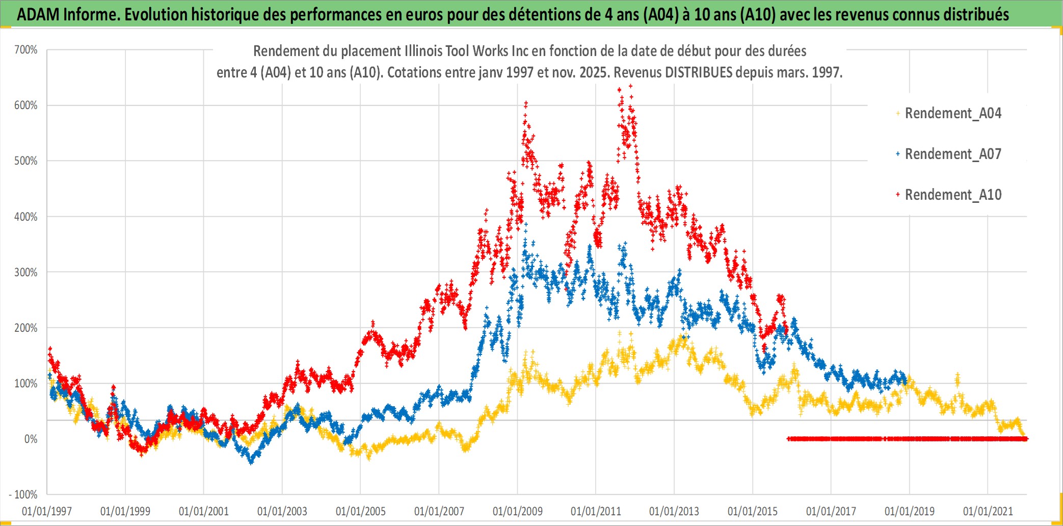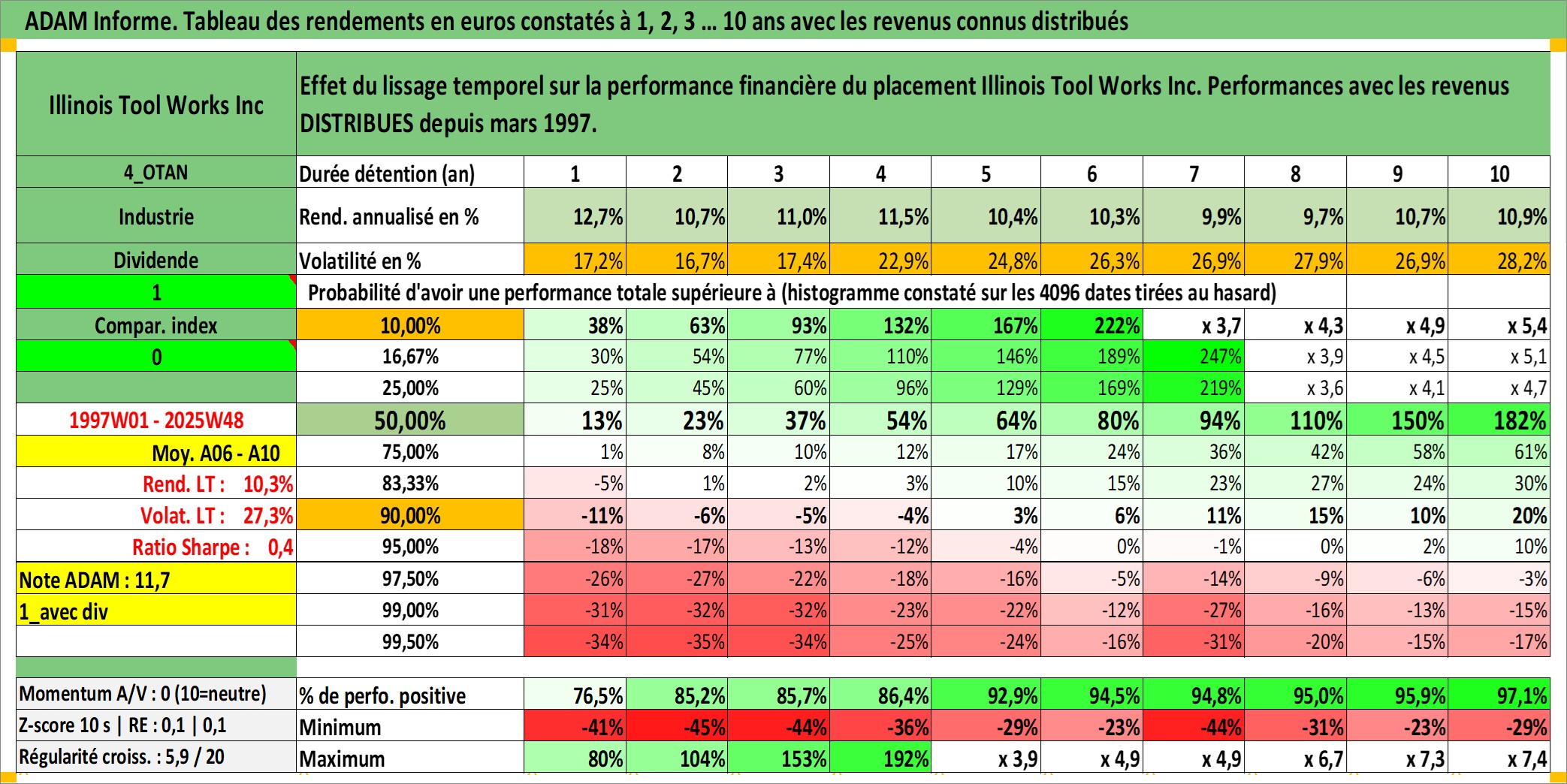 Site dédié aux investisseursPage dédiée sur site financeAnalyse des valorisations hebdomadaires de l'action Illinois Tool Works Inc. Cet actif est cote en USD. Les valorisations sont en contrevaleur EURO et couvrent les semaines 1997W01 a 2025W48. Les revenus de cet actif financier sont pris en compte depuis la semaine 1997W13. La note globale ESG de cet actif est estimee a 10.0 (apres rebasage entre 0 et 20).