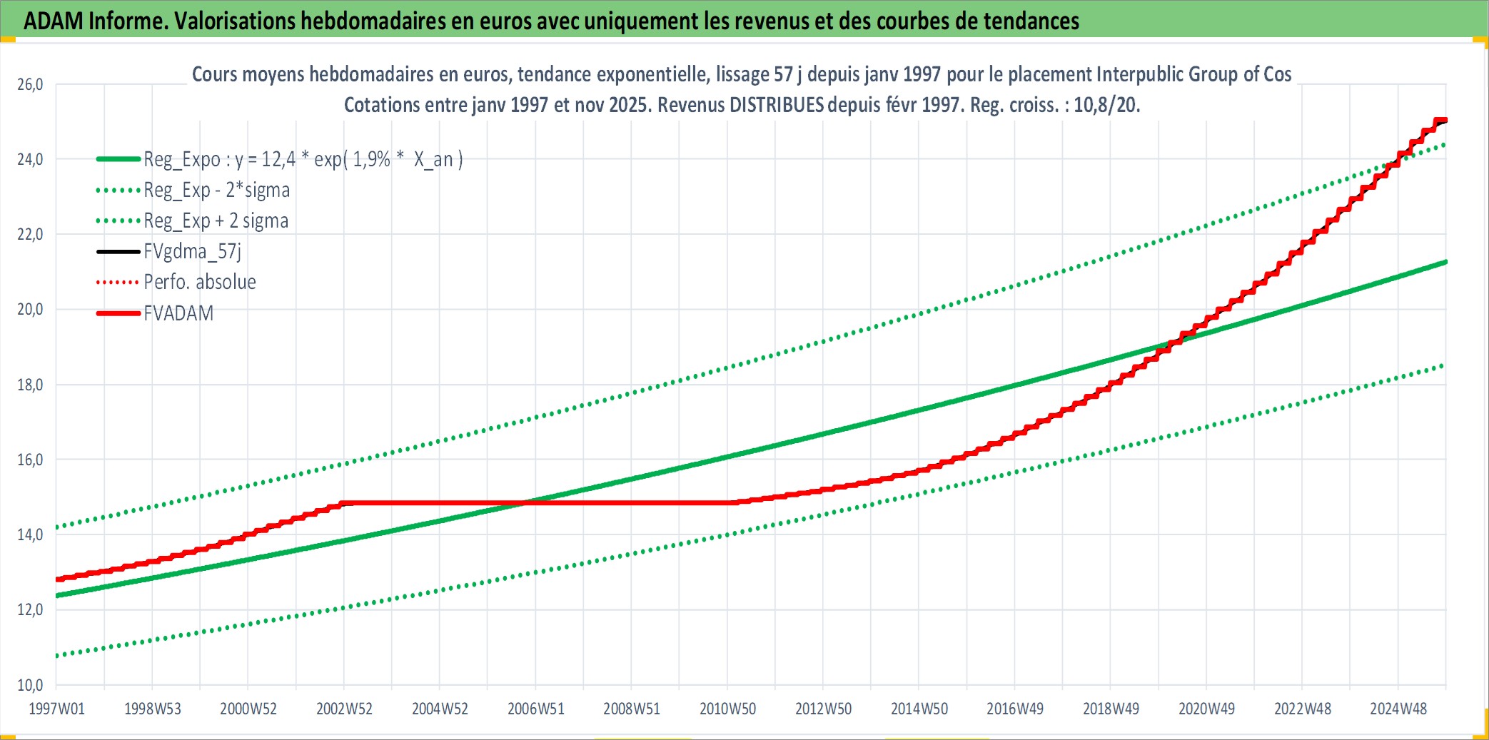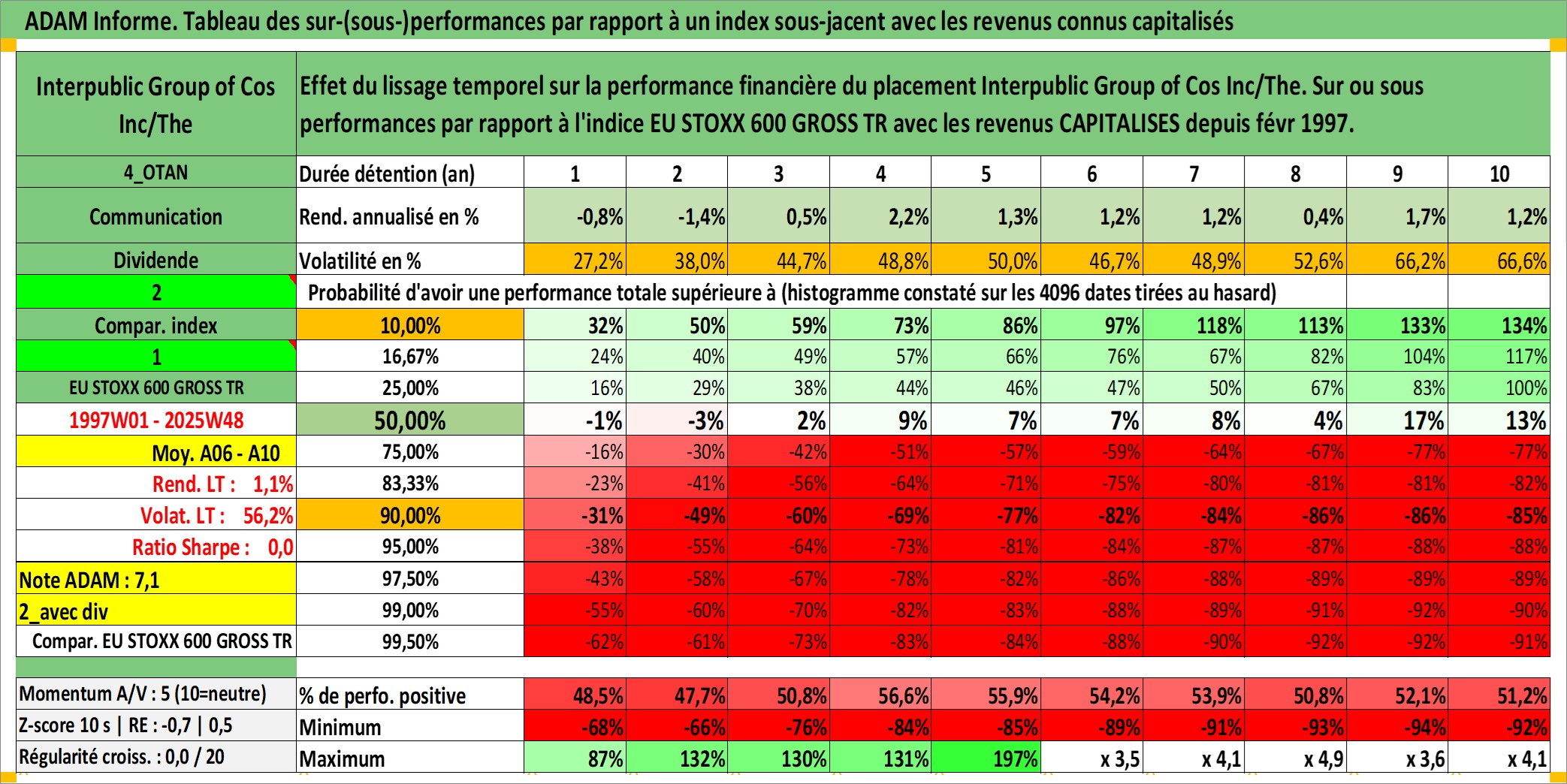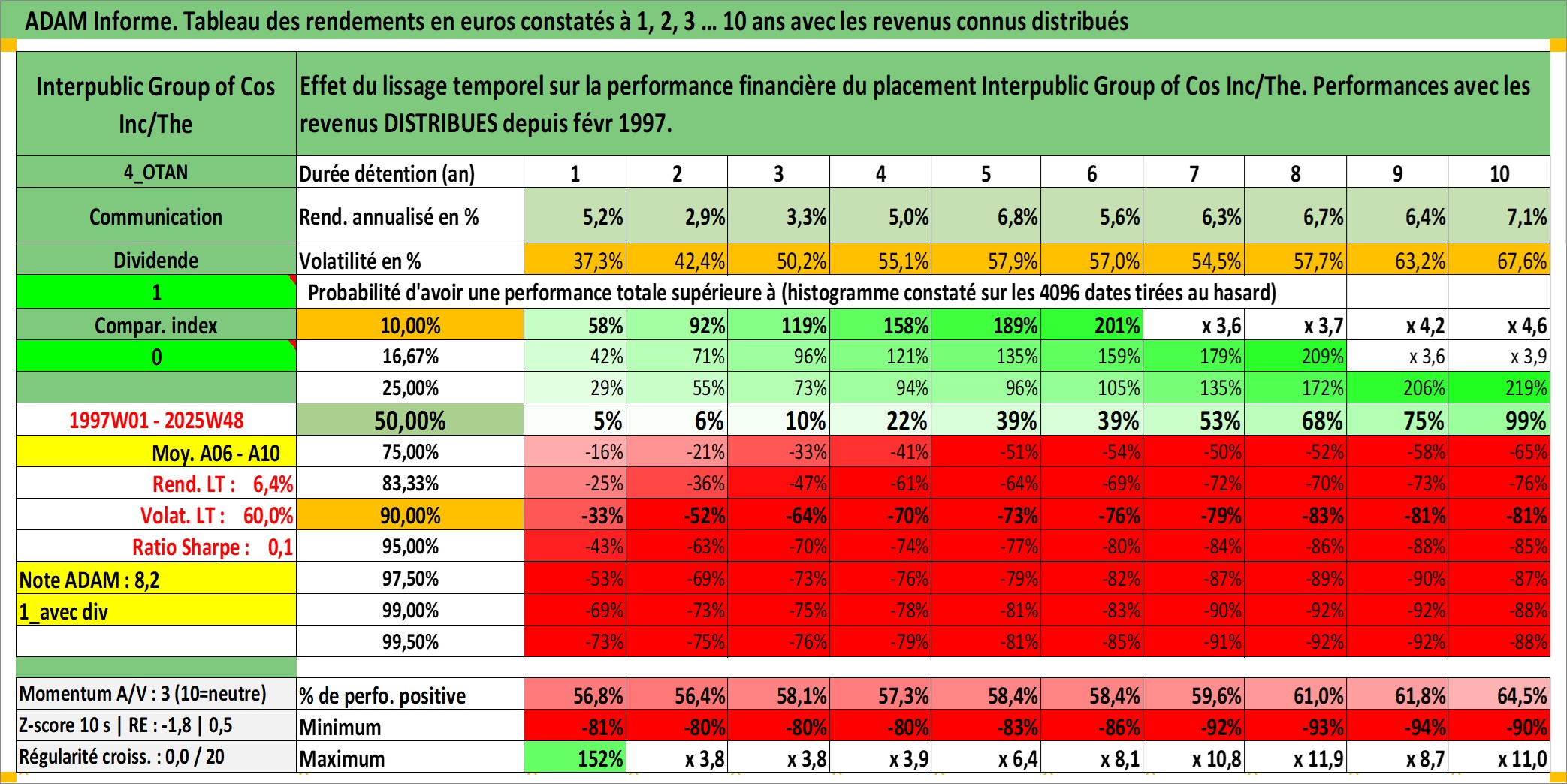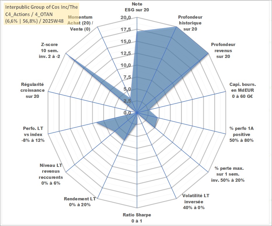 Site dédié aux investisseursPage dédiée sur site financeAnalyse des valorisations hebdomadaires de l'action Interpublic Group of Cos Inc/The. Cet actif est cote en USD. Les valorisations sont en contrevaleur EURO et couvrent les semaines 1997W01 a 2025W48. Les revenus de cet actif financier sont pris en compte depuis la semaine 1997W09. La note globale ESG de cet actif est estimee a 17.0 (apres rebasage entre 0 et 20).