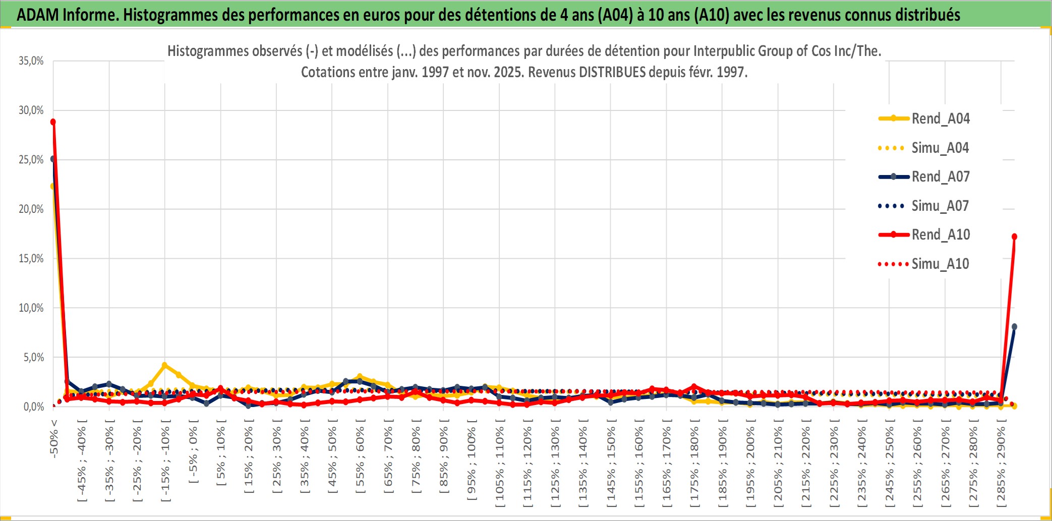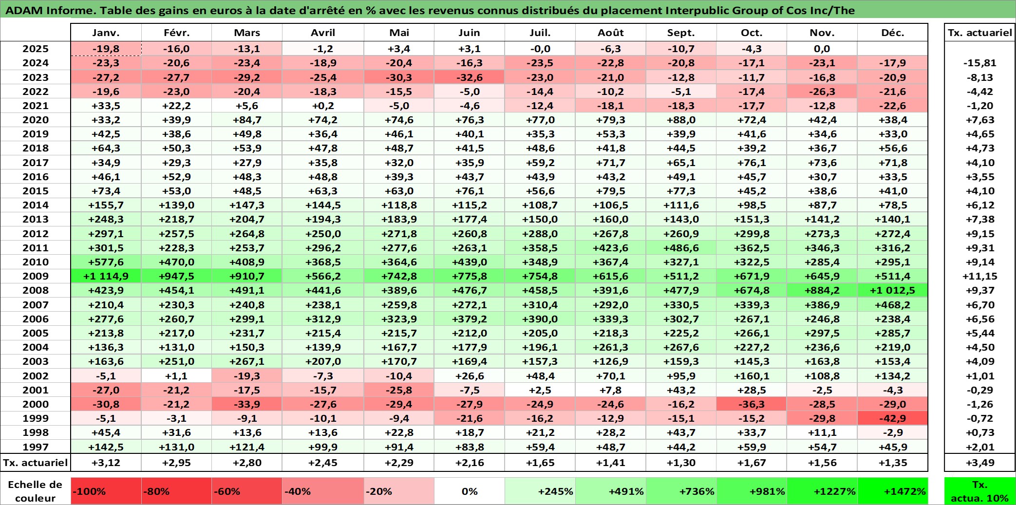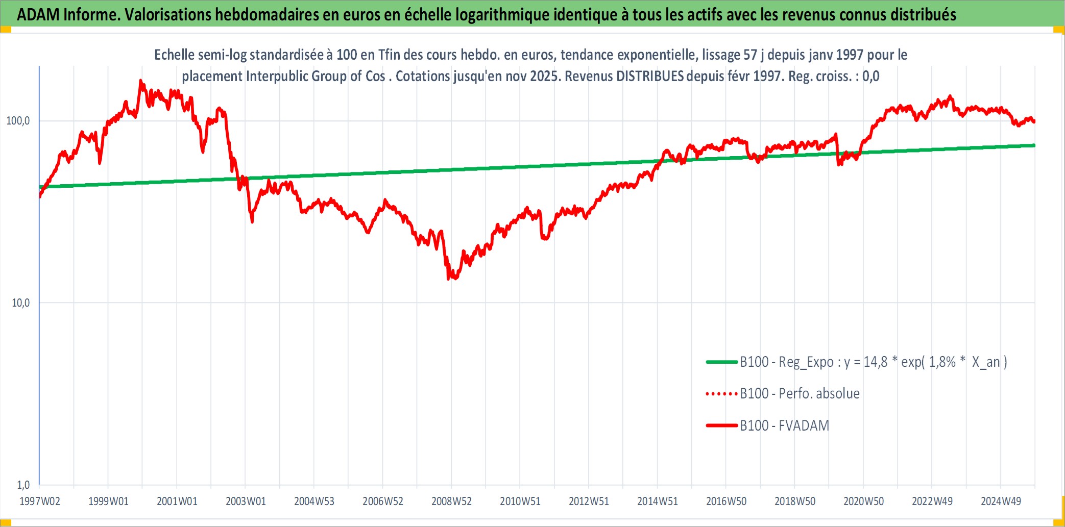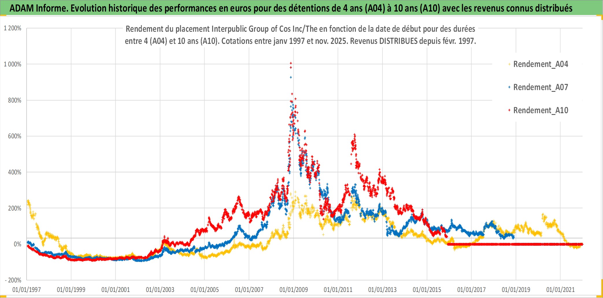 Site dédié aux investisseursPage dédiée sur site financeAnalyse des valorisations hebdomadaires de l'action Interpublic Group of Cos Inc/The. Cet actif est cote en USD. Les valorisations sont en contrevaleur EURO et couvrent les semaines 1997W01 a 2025W48. Les revenus de cet actif financier sont pris en compte depuis la semaine 1997W09. La note globale ESG de cet actif est estimee a 17.0 (apres rebasage entre 0 et 20).
