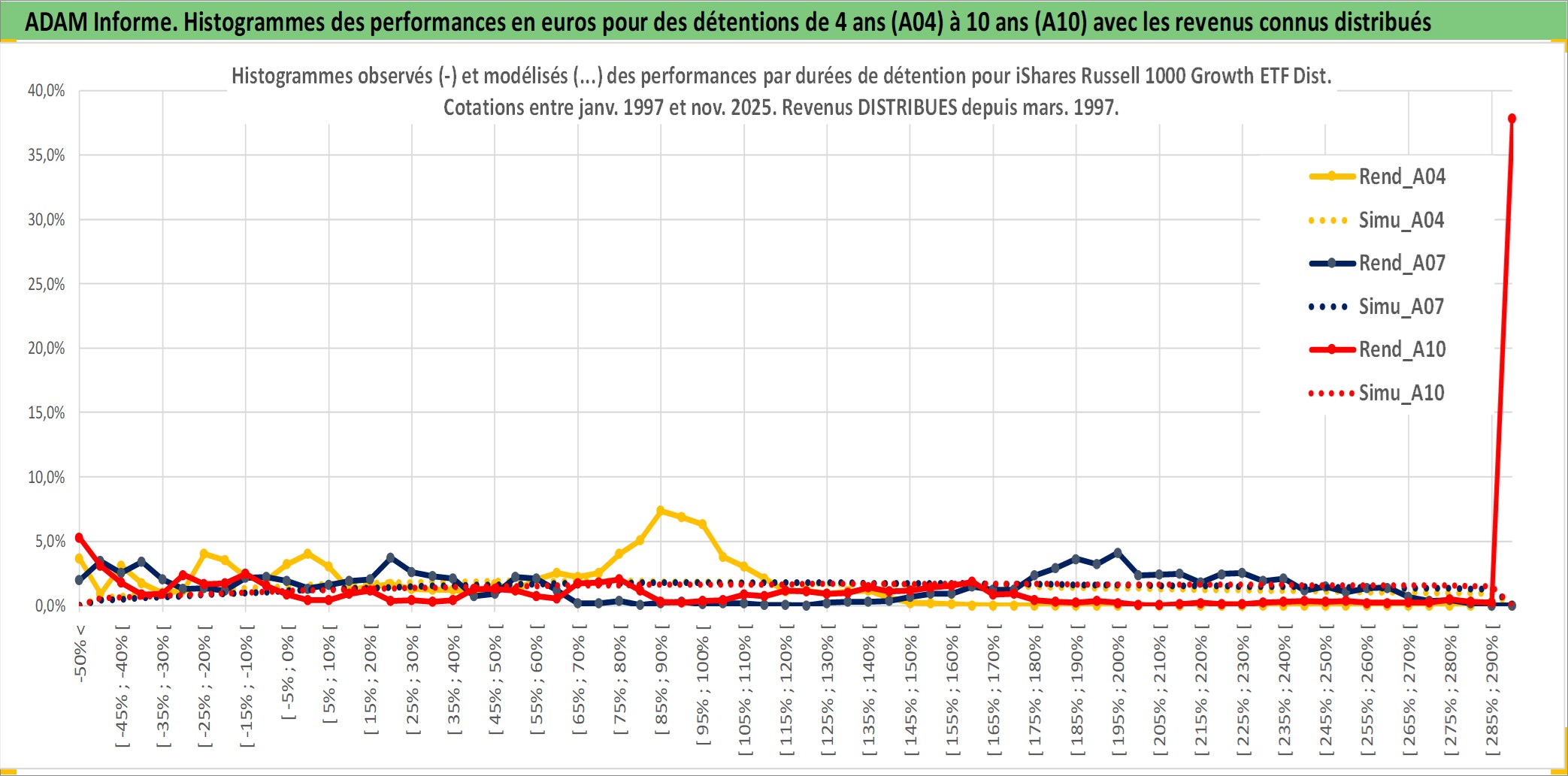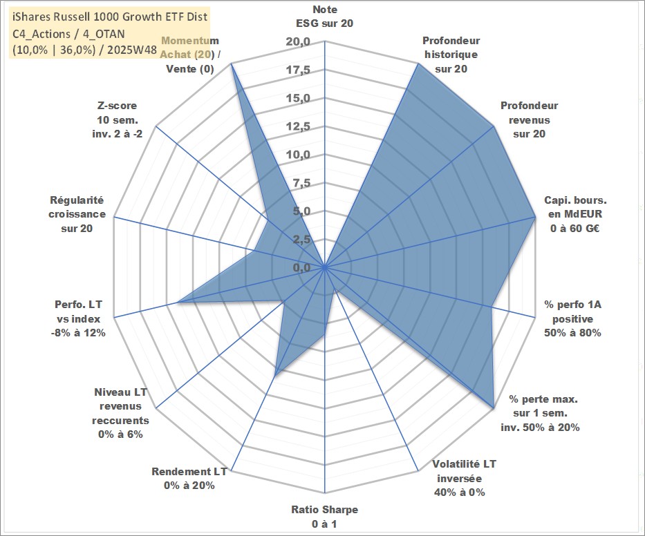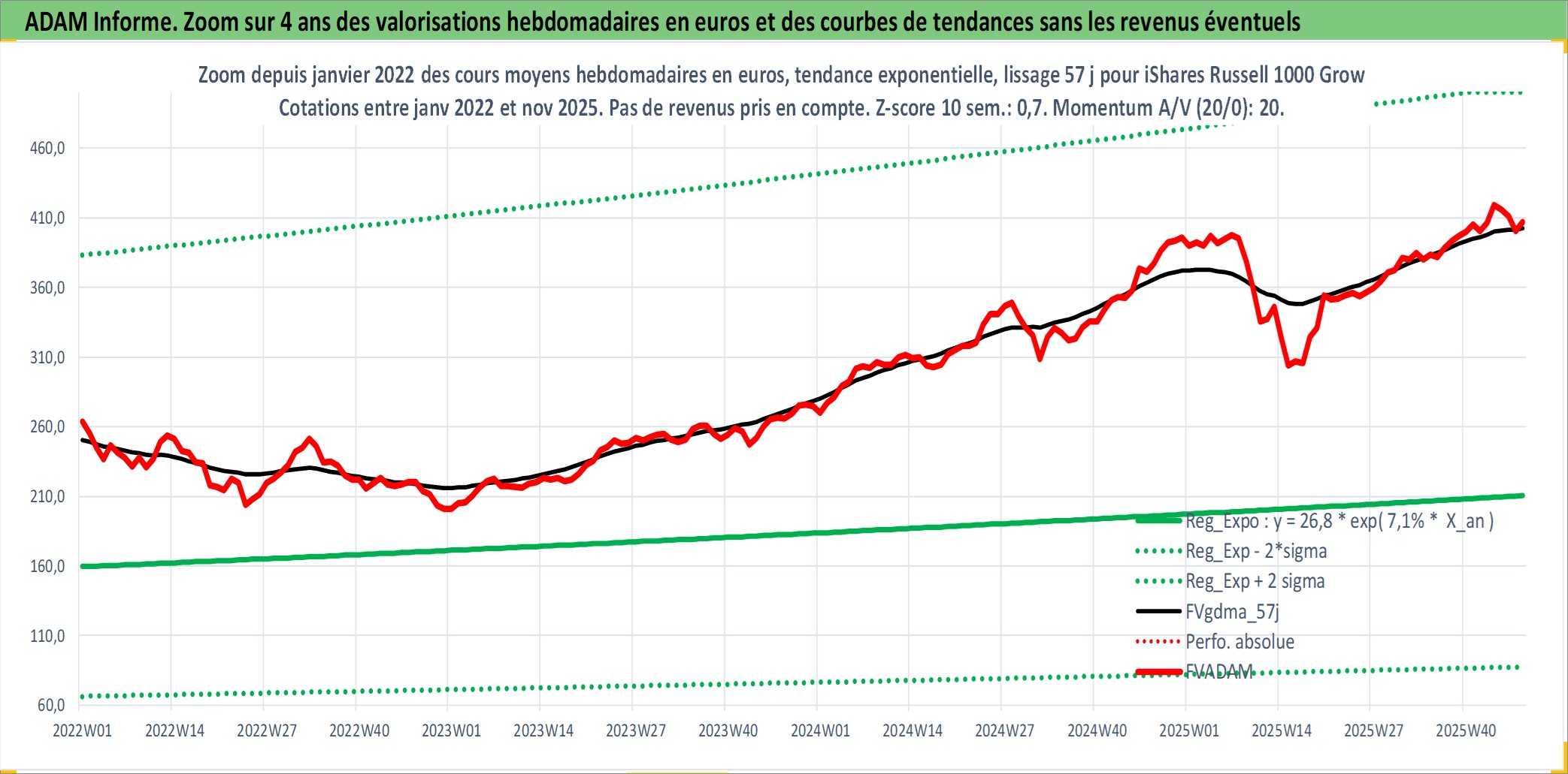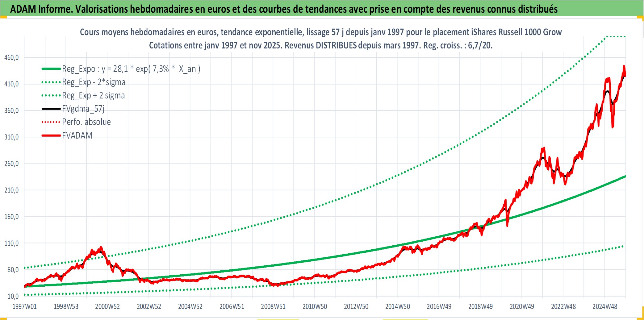 Site dédié aux investisseursPage dédiée sur site financeAnalyse des valorisations hebdomadaires du fonds iShares Russell 1000 Growth ETF Dist. Cet actif est cote en USD. Les valorisations sont en contrevaleur EURO et couvrent les semaines 1997W01 a 2025W48. Les revenus de cet actif financier sont pris en compte depuis la semaine 1997W13. La note ESG de cet actif n'est pas connue.