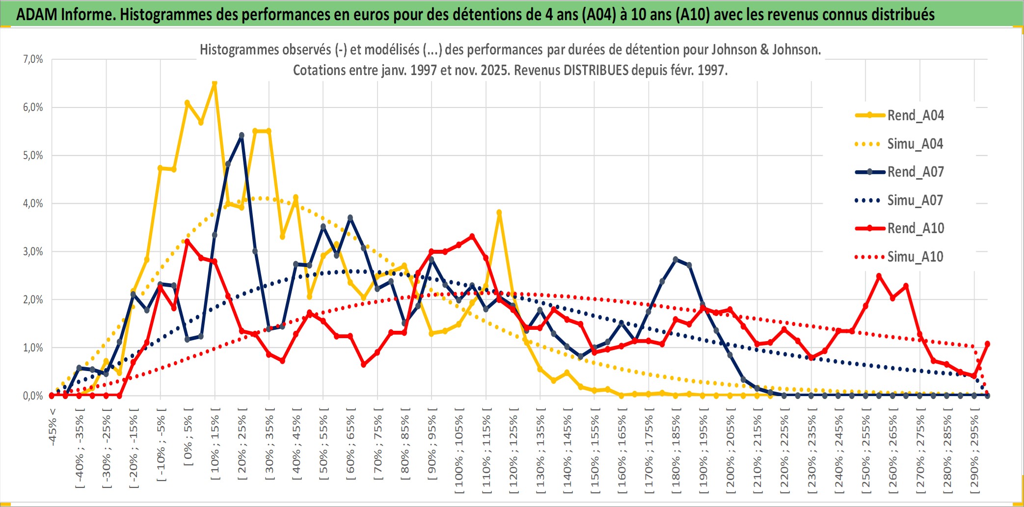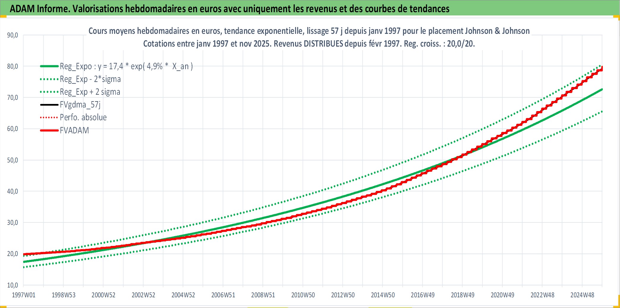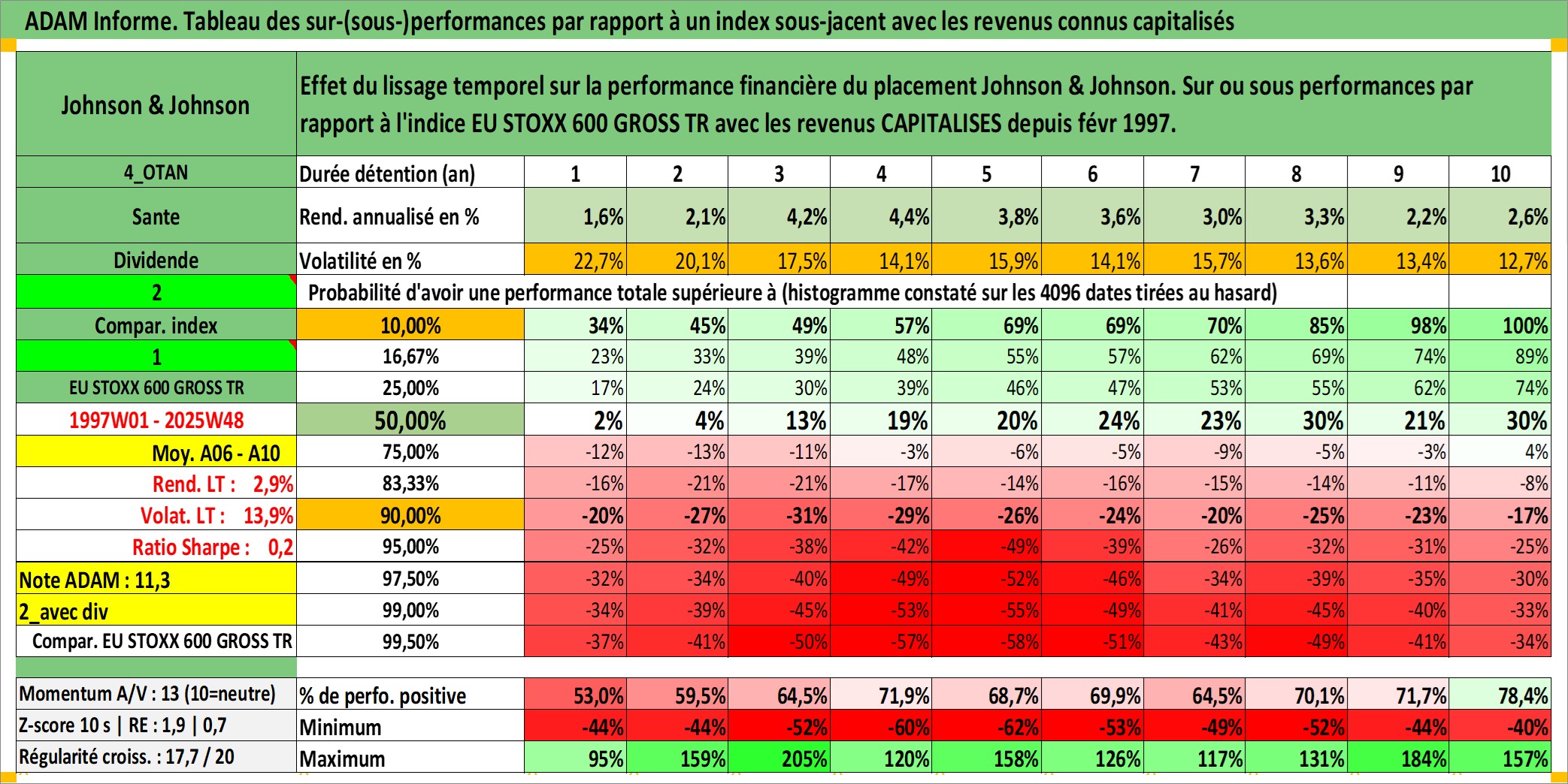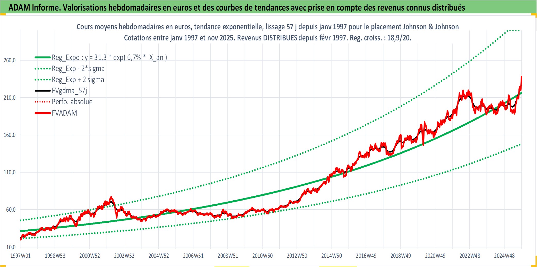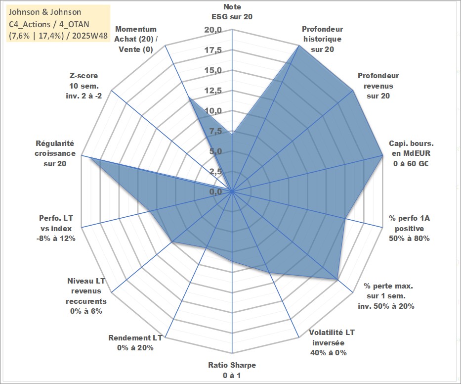 Site dédié aux investisseursPage dédiée sur site financeAnalyse des valorisations hebdomadaires de l'action Johnson & Johnson. Cet actif est cote en USD. Les valorisations sont en contrevaleur EURO et couvrent les semaines 1997W01 a 2025W48. Les revenus de cet actif financier sont pris en compte depuis la semaine 1997W07. La note globale ESG de cet actif est estimee a 7.0 (apres rebasage entre 0 et 20).