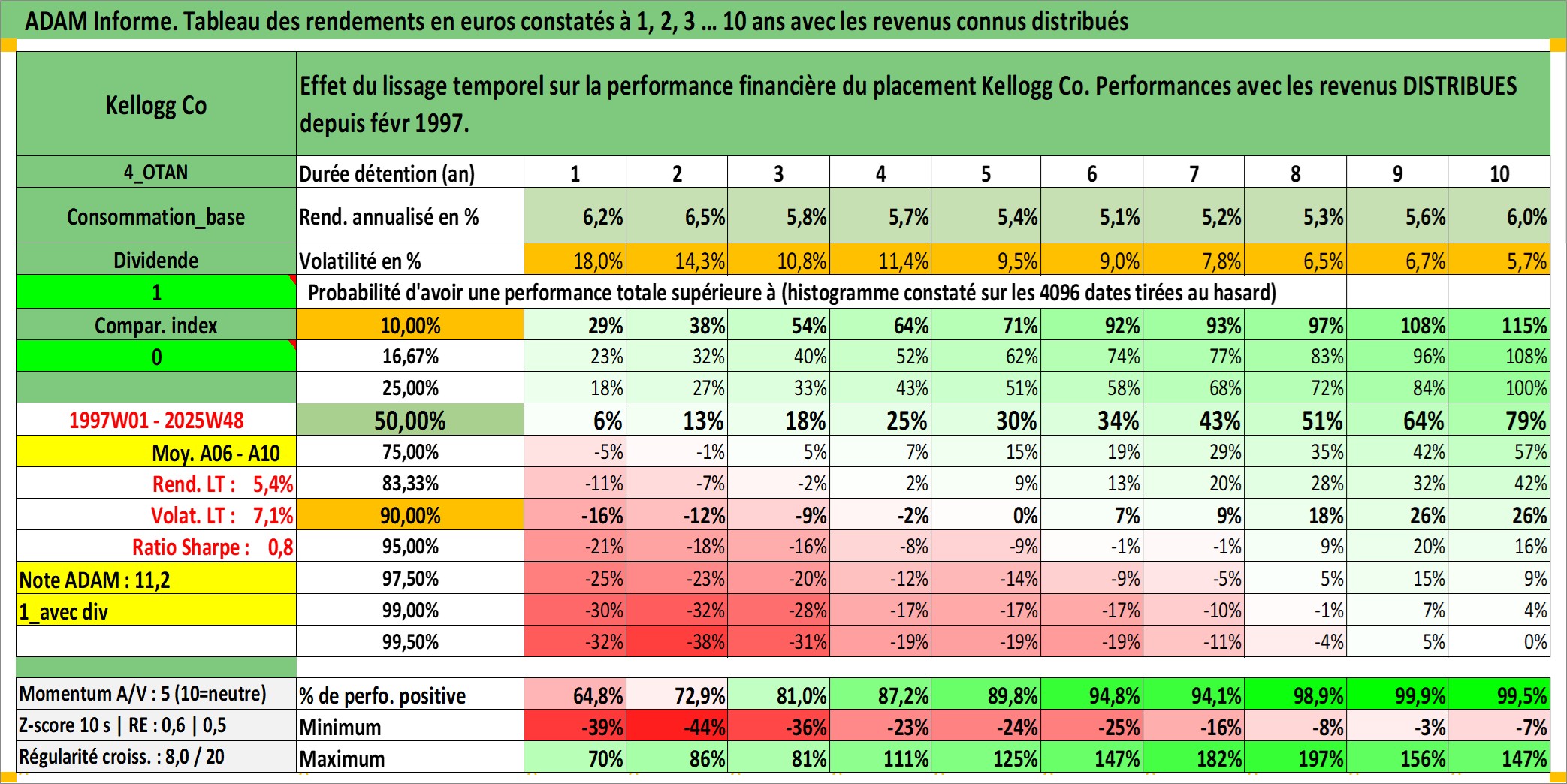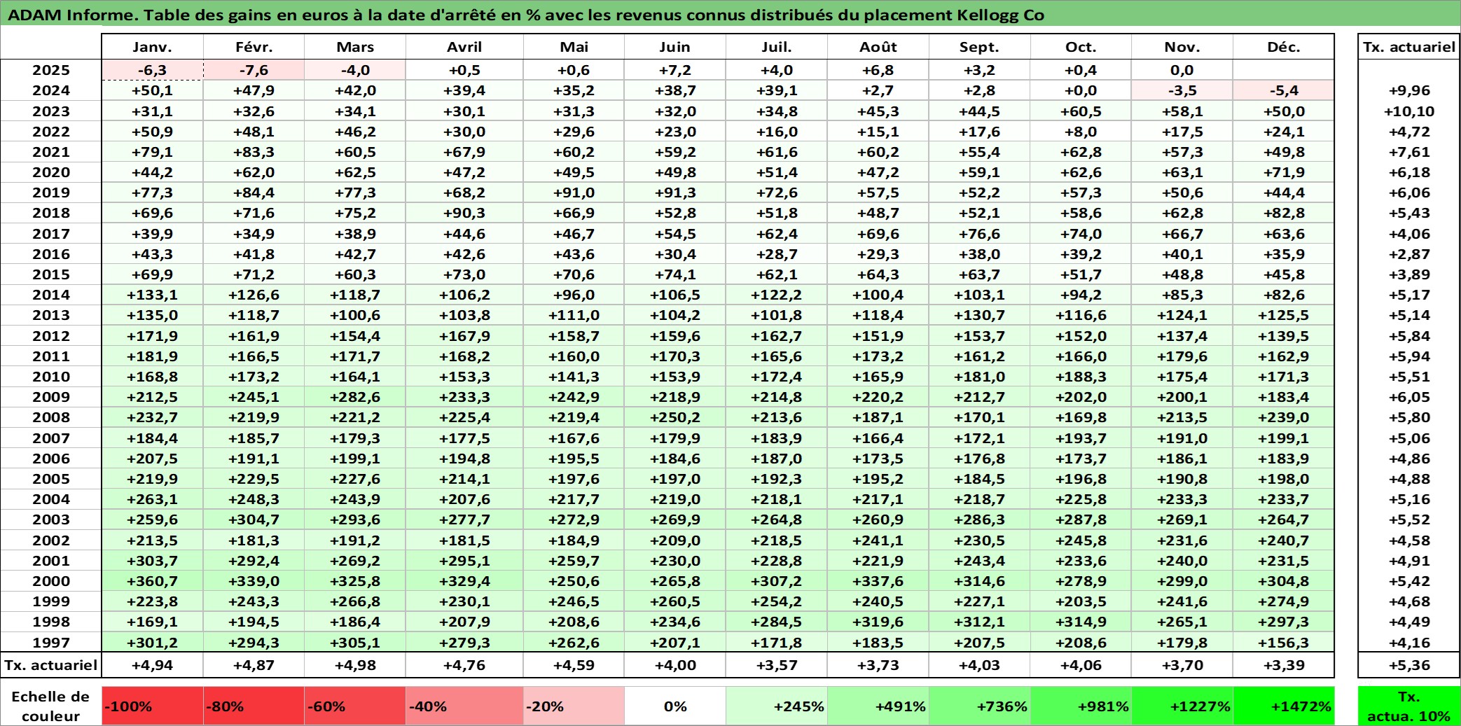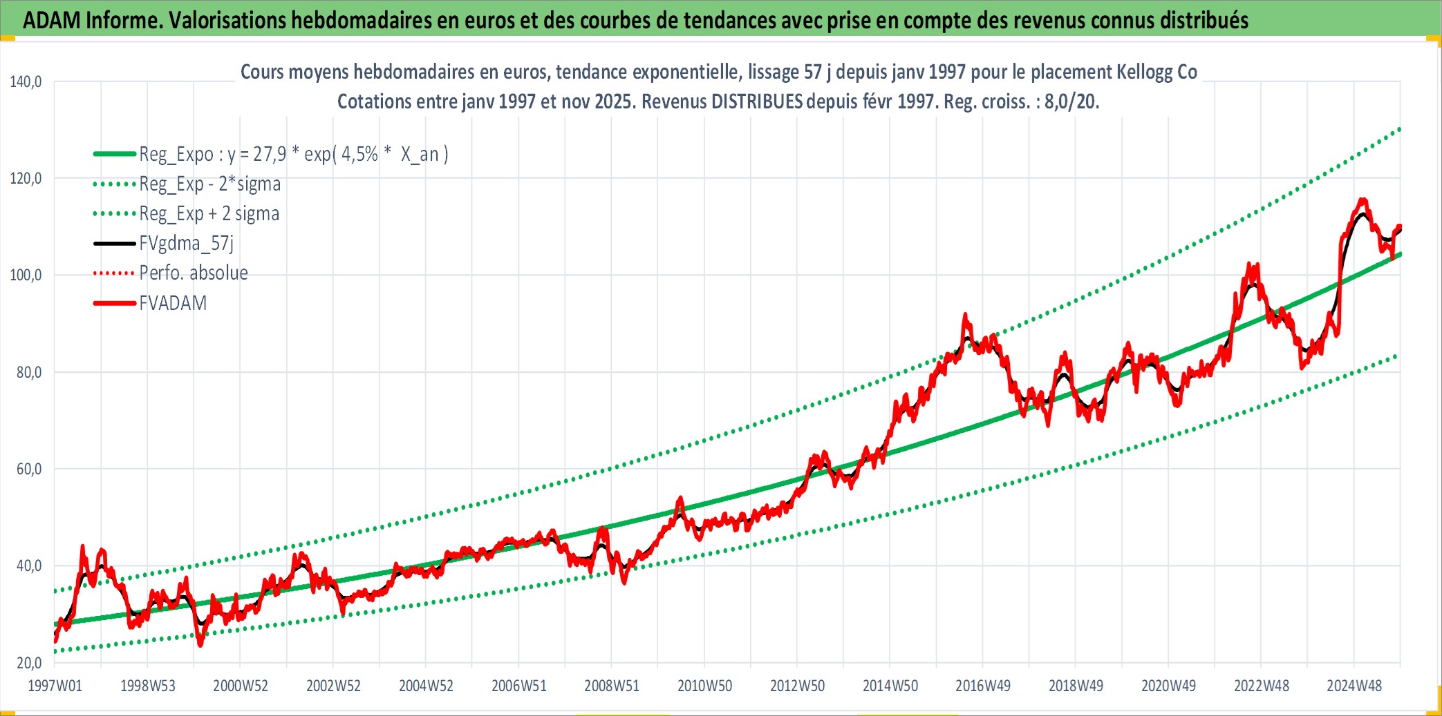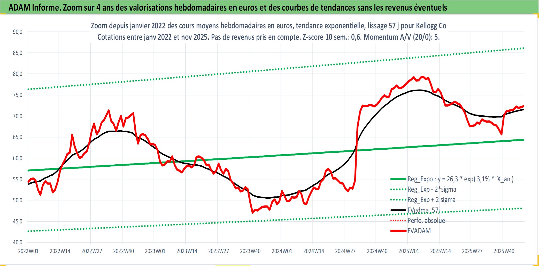 Site dédié aux investisseursPage dédiée sur site financeAnalyse des valorisations hebdomadaires de l'action Kellogg Co. Cet actif est cote en USD. Les valorisations sont en contrevaleur EURO et couvrent les semaines 1997W01 a 2025W48. Les revenus de cet actif financier sont pris en compte depuis la semaine 1997W09. La note globale ESG de cet actif est estimee a 7.0 (apres rebasage entre 0 et 20).