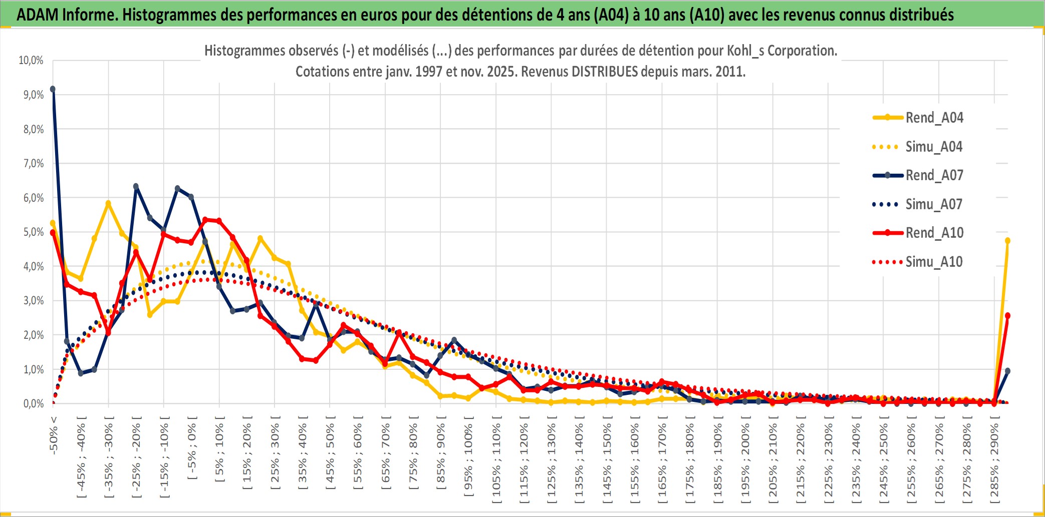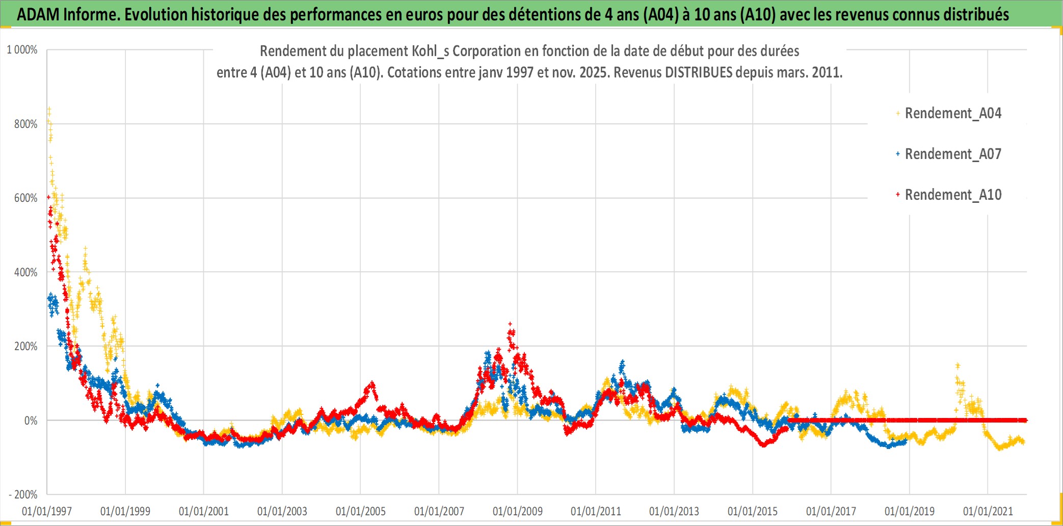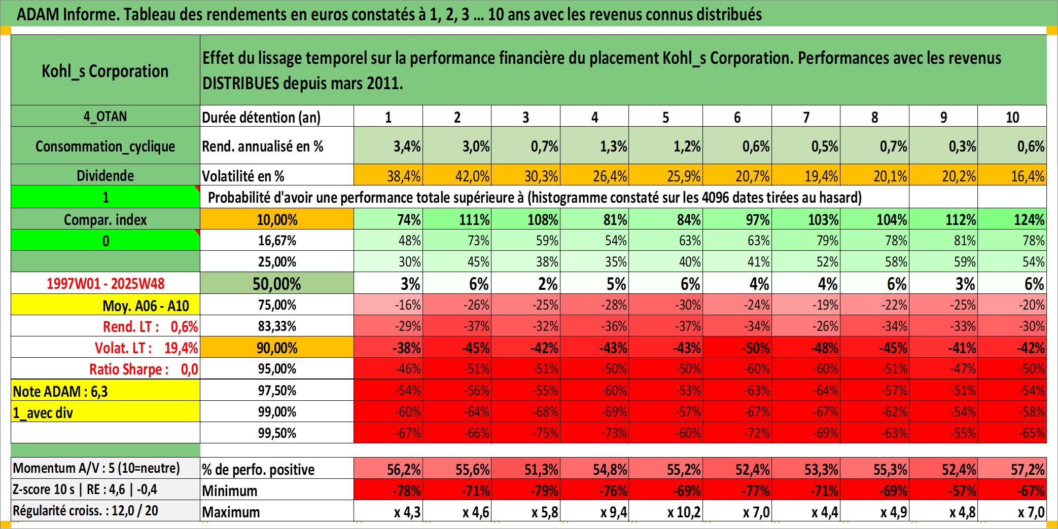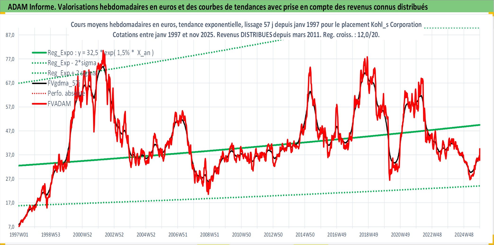 Site dédié aux investisseursPage dédiée sur site financeAnalyse des valorisations hebdomadaires de l'action Kohl_s Corporation. Cet actif est cote en USD. Les valorisations sont en contrevaleur EURO et couvrent les semaines 1997W01 a 2025W48. Les revenus de cet actif financier sont pris en compte depuis la semaine 2011W10. La note globale ESG de cet actif est estimee a 15.0 (apres rebasage entre 0 et 20).