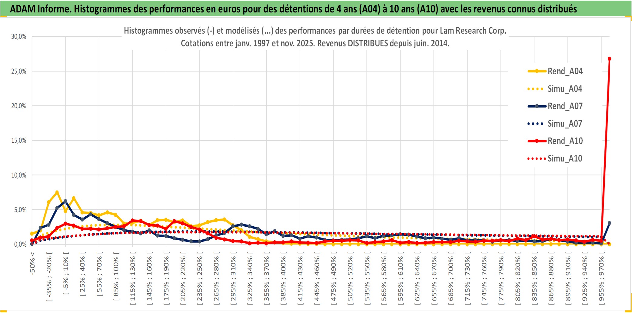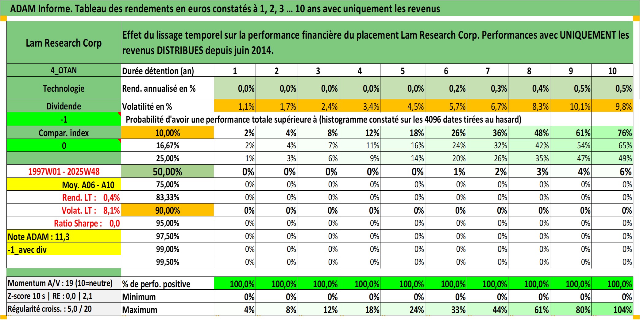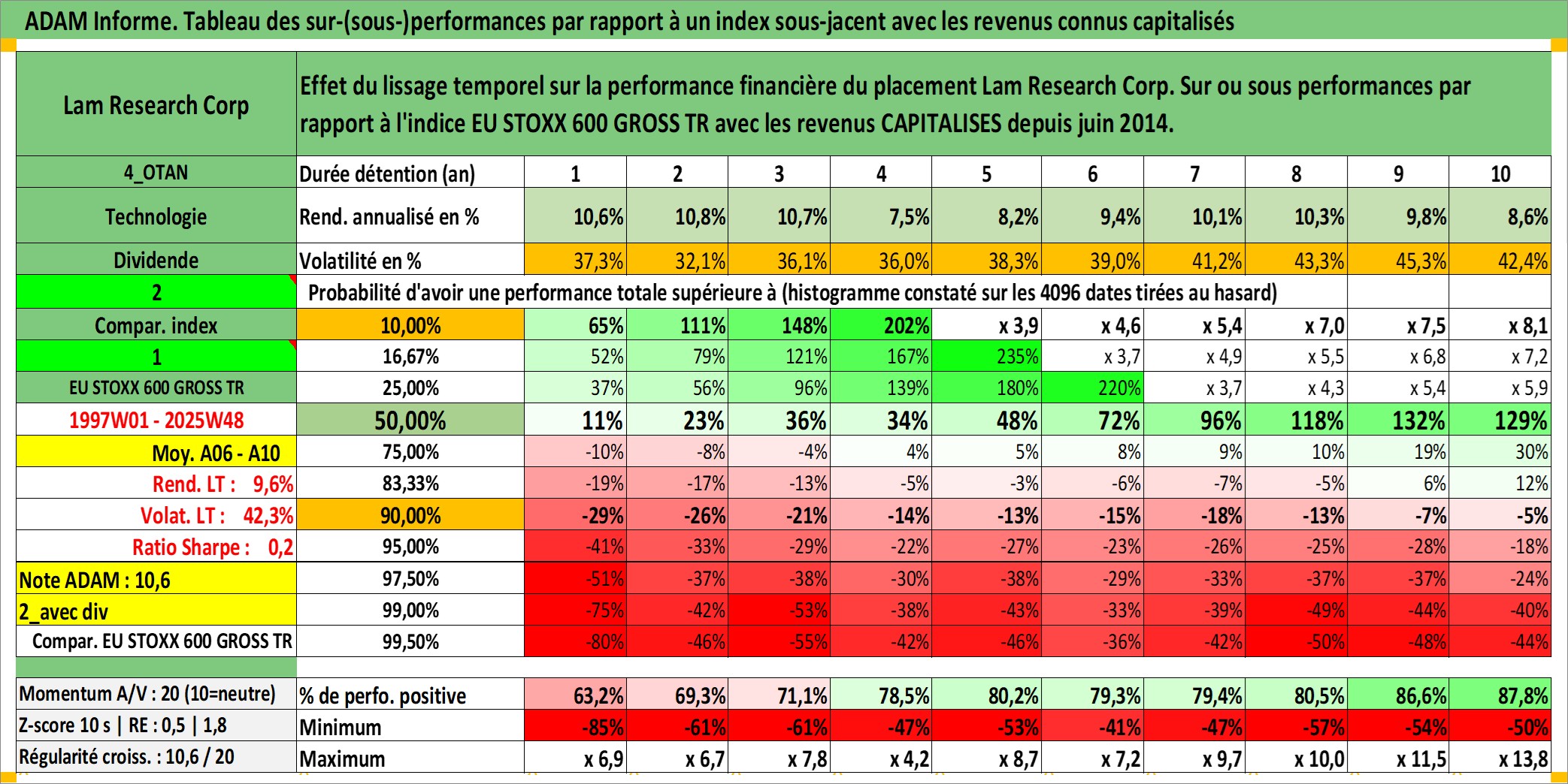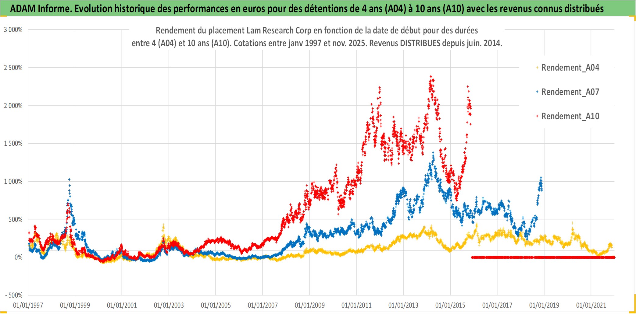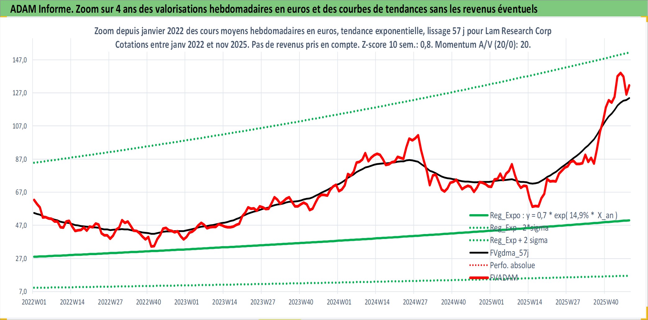 Site dédié aux investisseursPage dédiée sur site financeAnalyse des valorisations hebdomadaires de l'action Lam Research Corp. Cet actif est cote en USD. Les valorisations sont en contrevaleur EURO et couvrent les semaines 1997W01 a 2025W48. Les revenus de cet actif financier sont pris en compte depuis la semaine 2014W24. La note globale ESG de cet actif est estimee a 15.0 (apres rebasage entre 0 et 20).