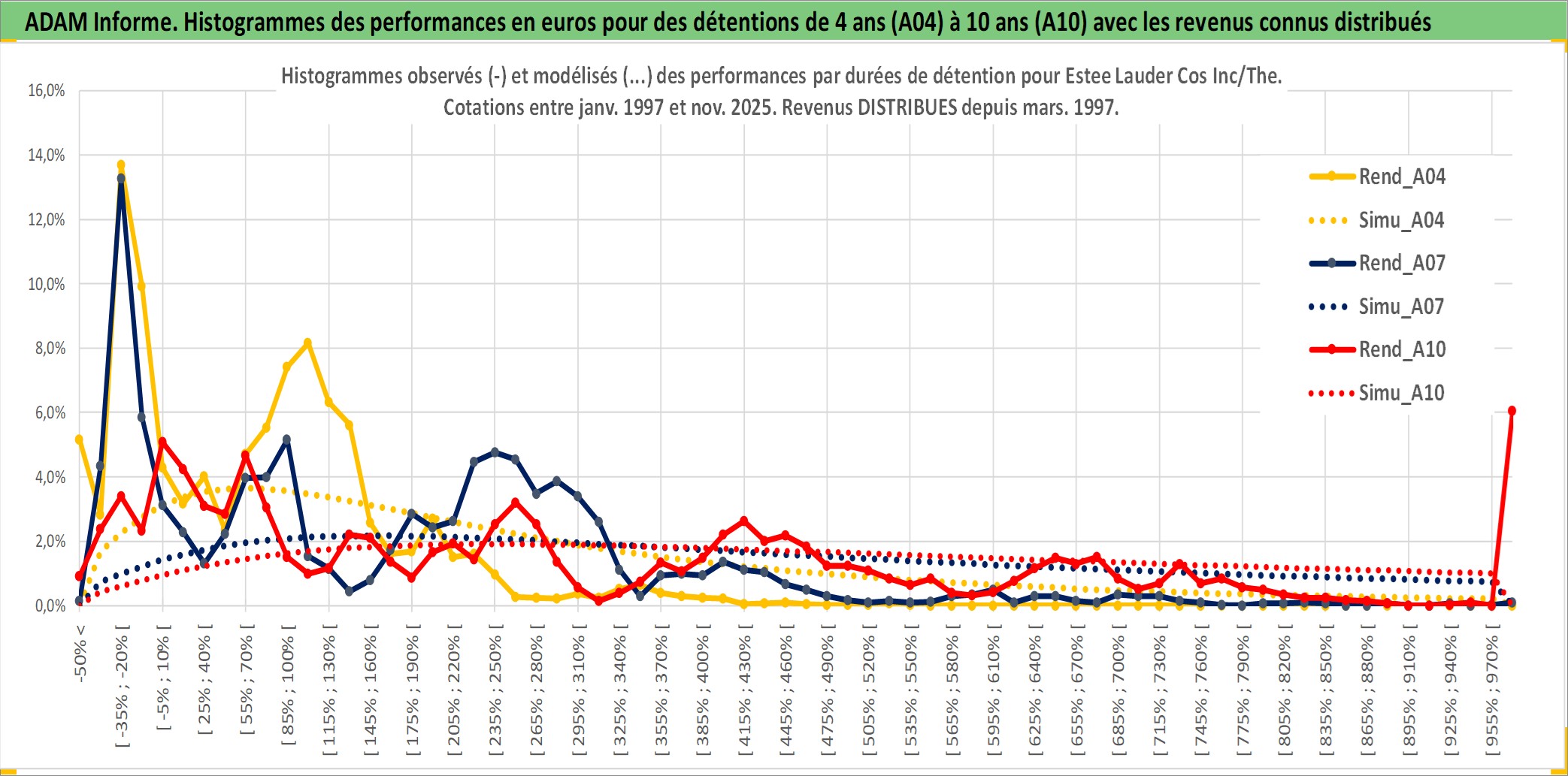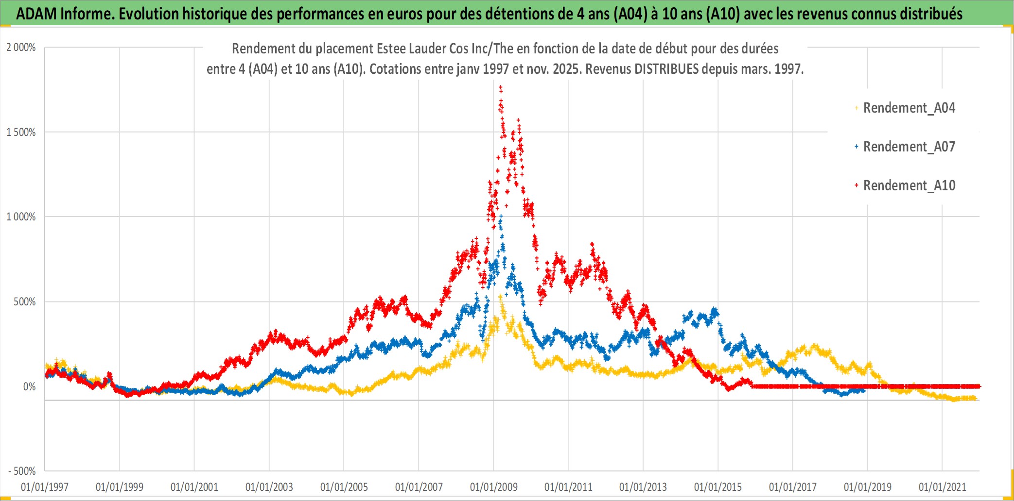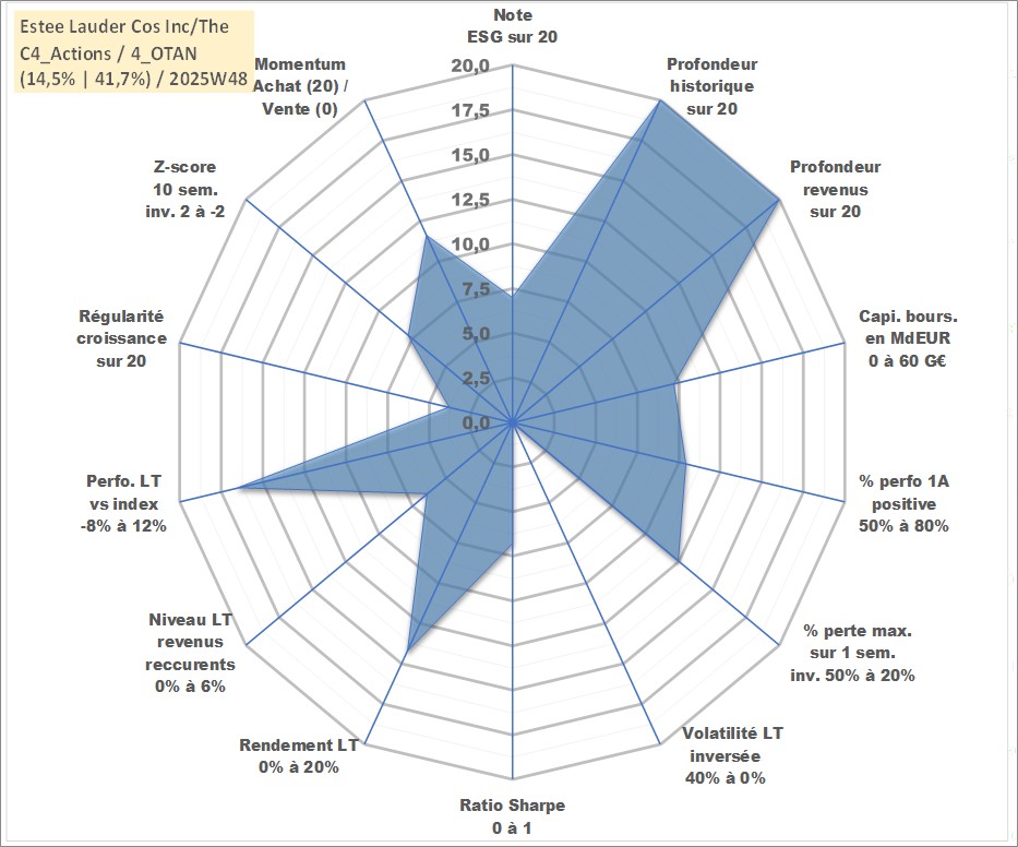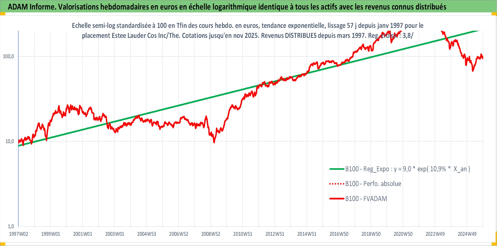 Site dédié aux investisseursPage dédiée sur site financeAnalyse des valorisations hebdomadaires de l'action Estee Lauder Cos Inc/The. Cet actif est cote en USD. Les valorisations sont en contrevaleur EURO et couvrent les semaines 1997W01 a 2025W48. Les revenus de cet actif financier sont pris en compte depuis la semaine 1997W11. La note globale ESG de cet actif est estimee a 7.0 (apres rebasage entre 0 et 20).