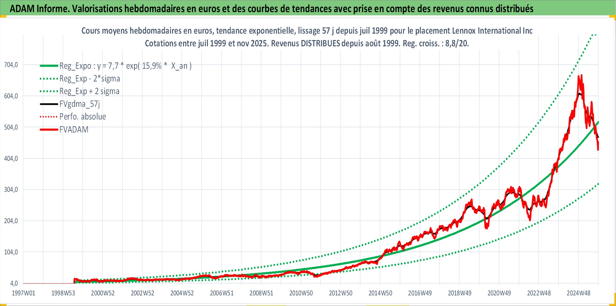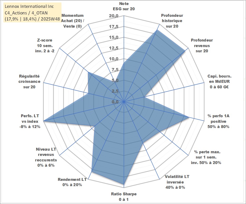 Site dédié aux investisseursPage dédiée sur site financeAnalyse des valorisations hebdomadaires de l'action Lennox International Inc. Cet actif est cote en USD. Les valorisations sont en contrevaleur EURO et couvrent les semaines 1999W30 a 2025W48. Les revenus de cet actif financier sont pris en compte depuis la semaine 1999W34. La note globale ESG de cet actif est estimee a 9.0 (apres rebasage entre 0 et 20).