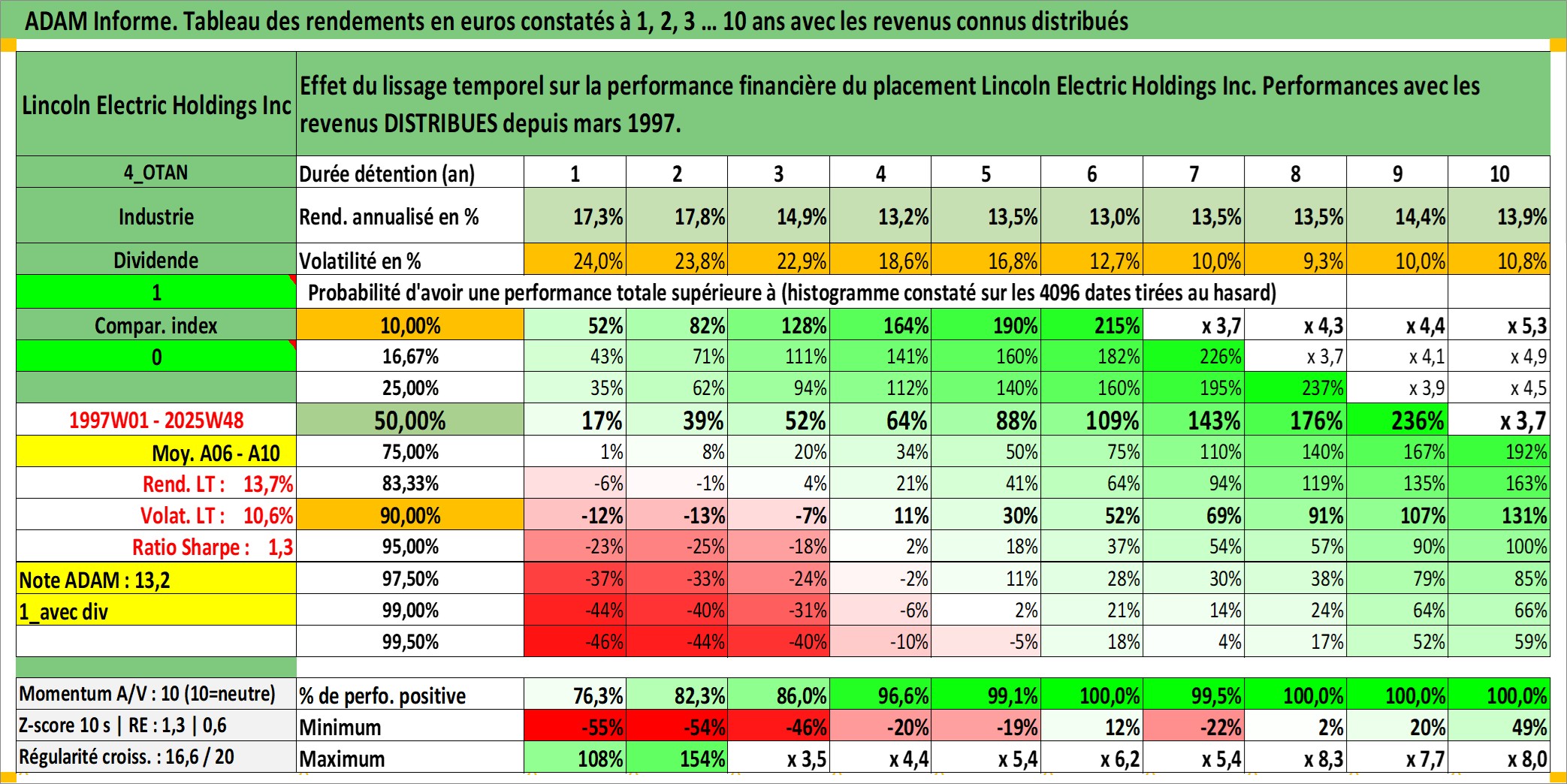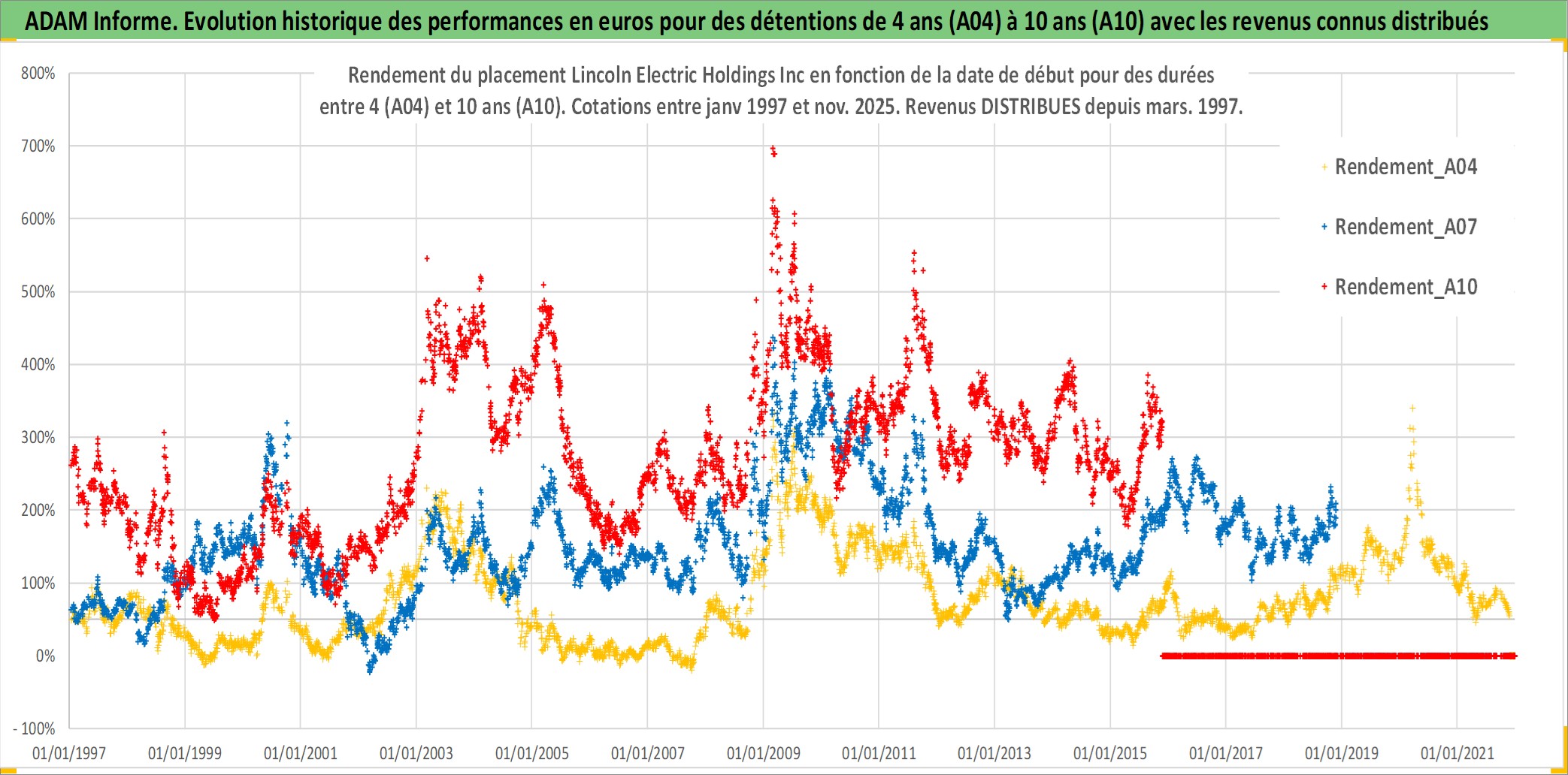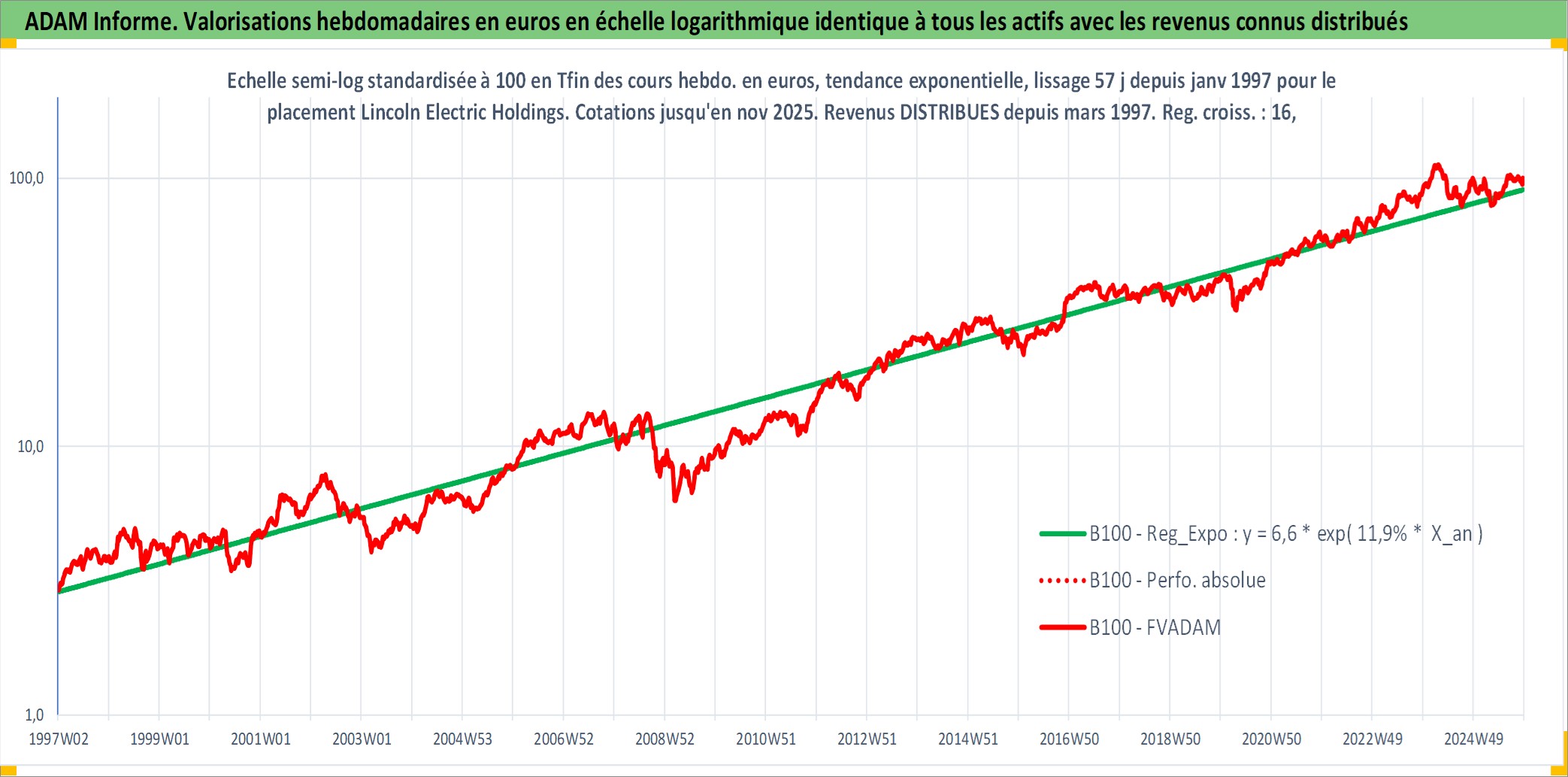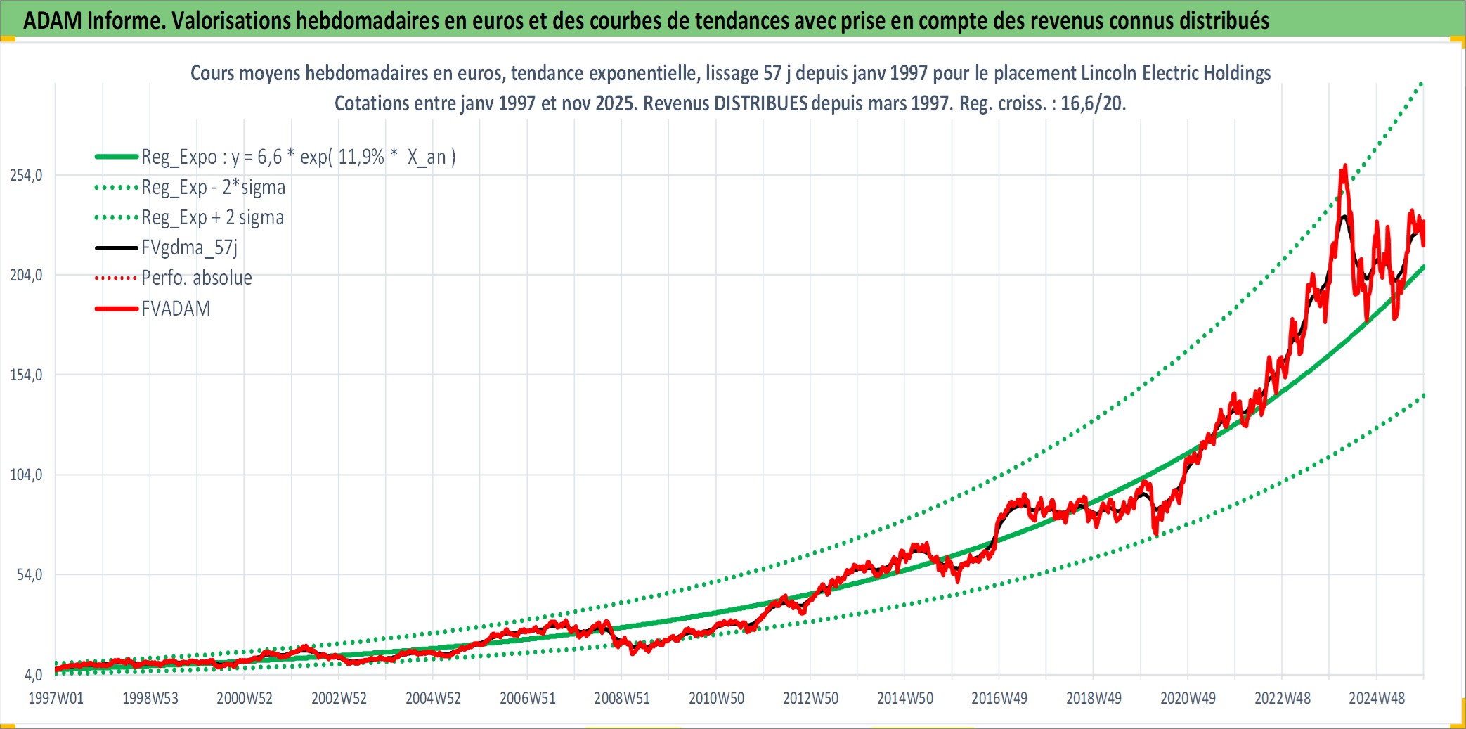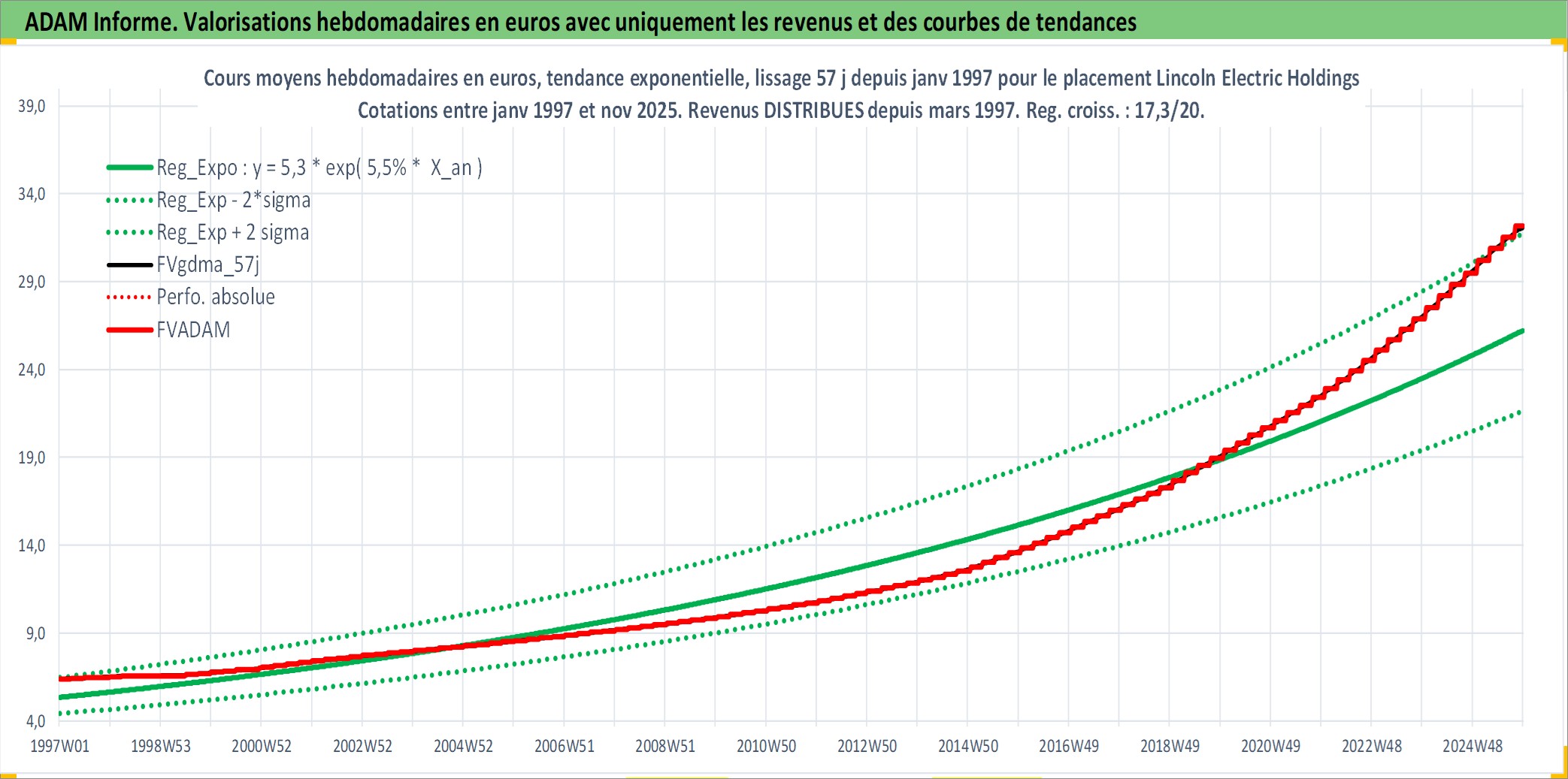 Site dédié aux investisseursPage dédiée sur site financeAnalyse des valorisations hebdomadaires de l'action Lincoln Electric Holdings Inc. Cet actif est cote en USD. Les valorisations sont en contrevaleur EURO et couvrent les semaines 1997W01 a 2025W48. Les revenus de cet actif financier sont pris en compte depuis la semaine 1997W13. La note globale ESG de cet actif est estimee a 9.0 (apres rebasage entre 0 et 20).