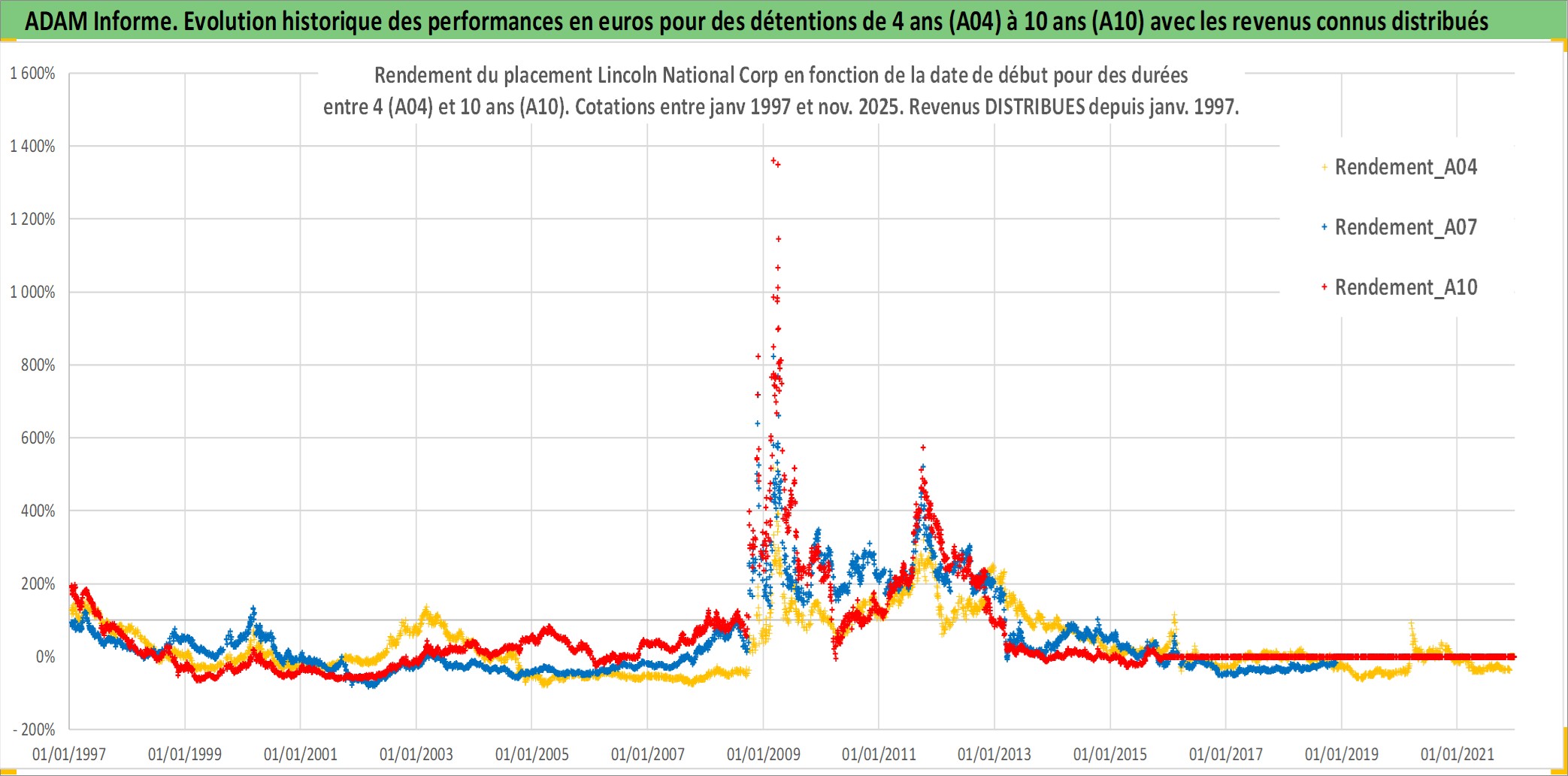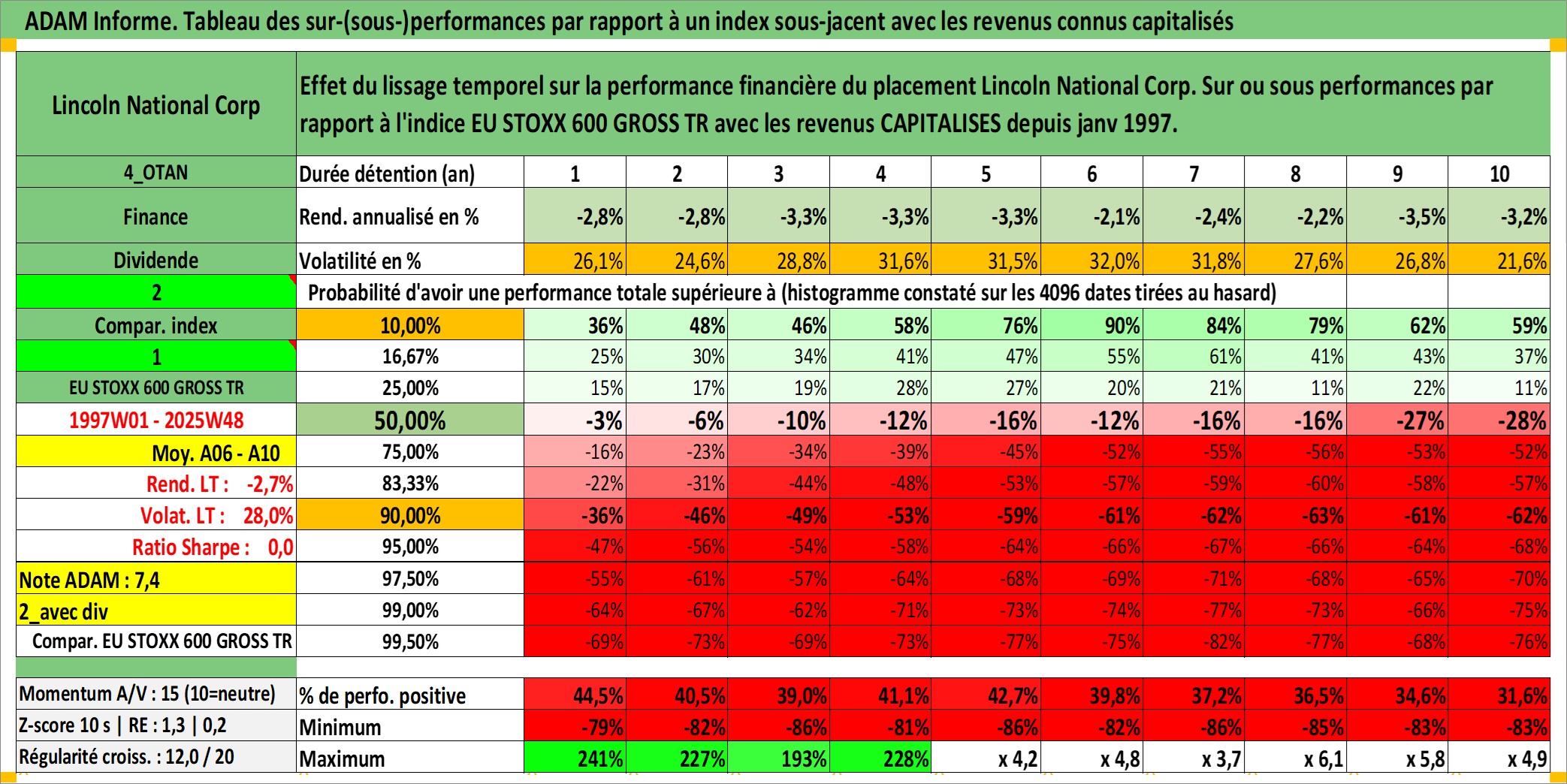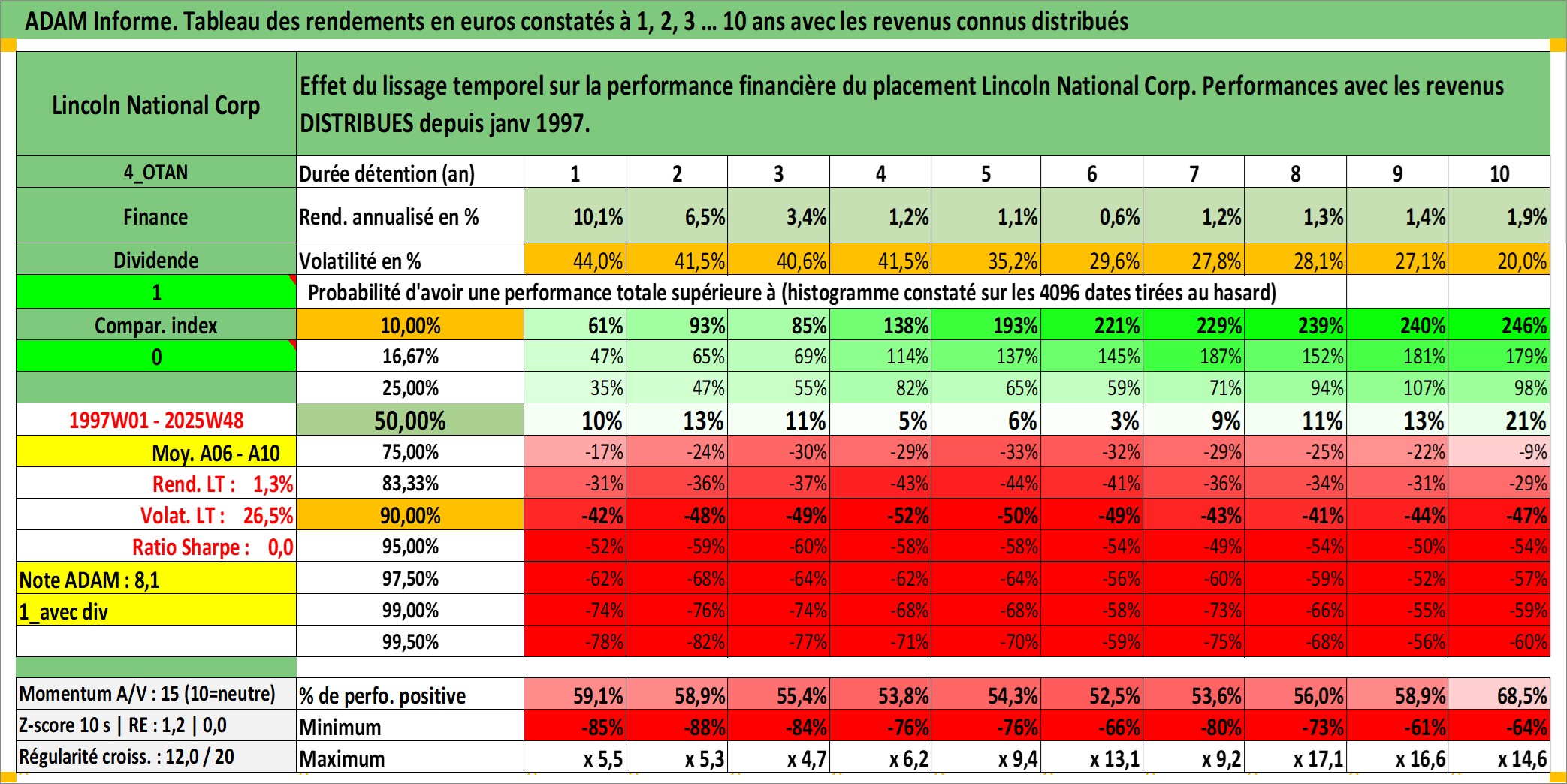 Site dédié aux investisseursPage dédiée sur site financeAnalyse des valorisations hebdomadaires de l'action Lincoln National Corp. Cet actif est cote en USD. Les valorisations sont en contrevaleur EURO et couvrent les semaines 1997W01 a 2025W48. Les revenus de cet actif financier sont pris en compte depuis la semaine 1997W02. La note globale ESG de cet actif est estimee a 11.0 (apres rebasage entre 0 et 20).