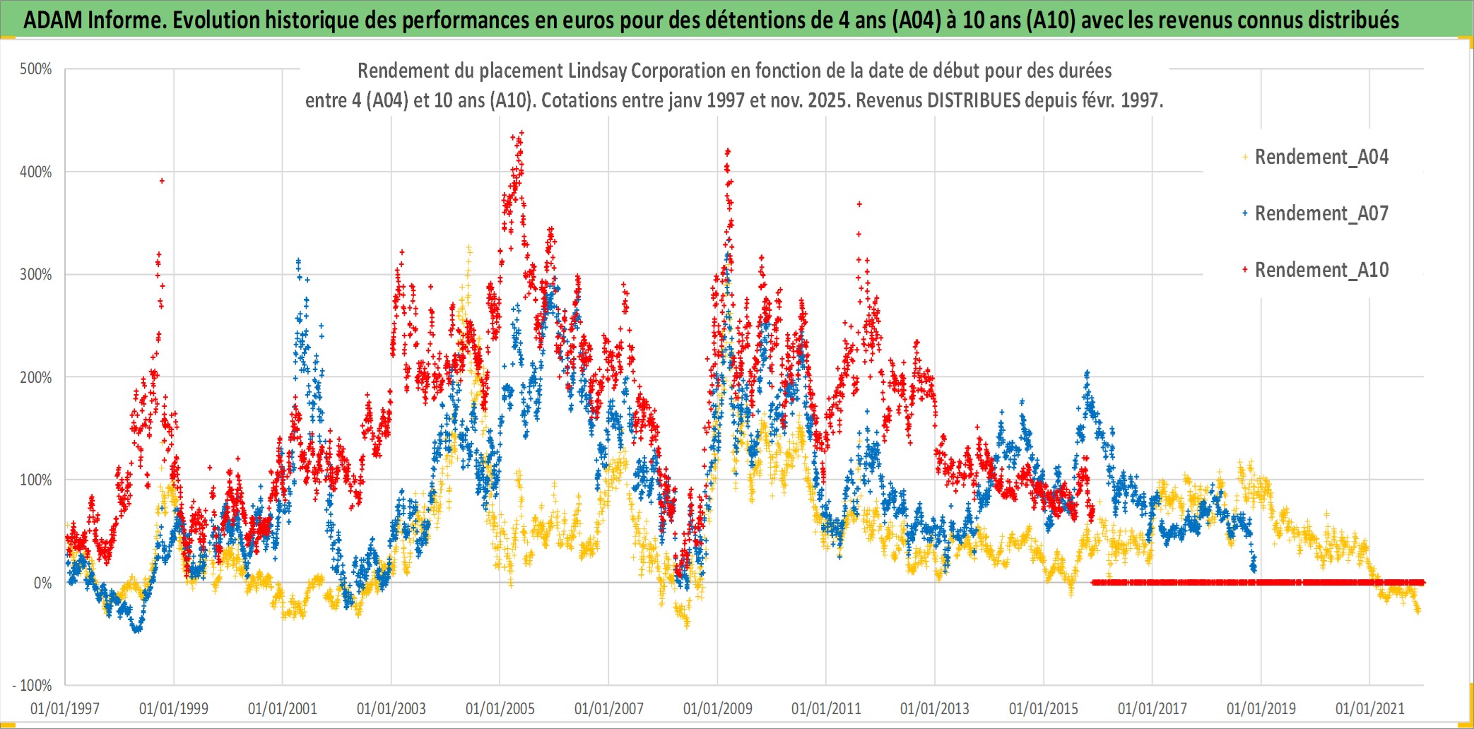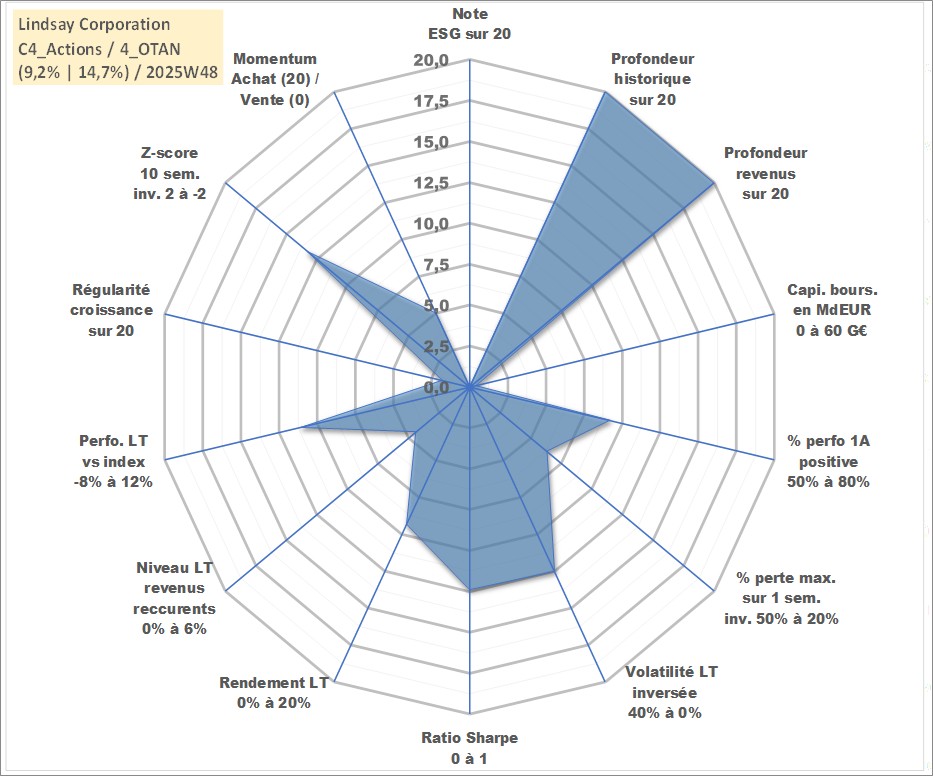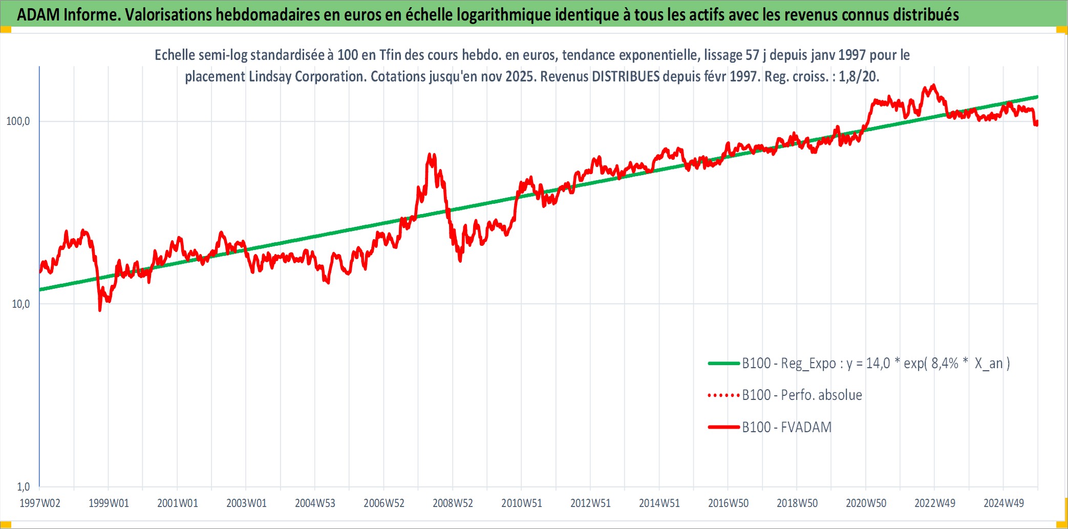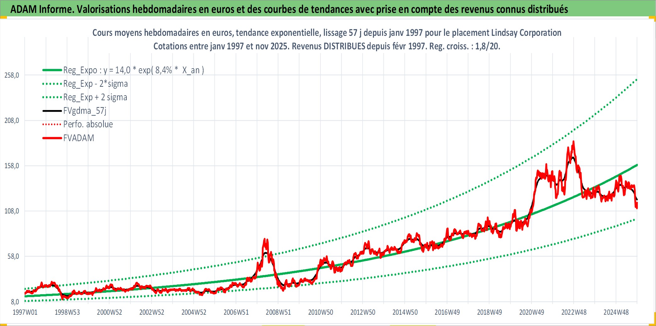 Site dédié aux investisseursPage dédiée sur site financeAnalyse des valorisations hebdomadaires de l'action Lindsay Corporation. Cet actif est cote en USD. Les valorisations sont en contrevaleur EURO et couvrent les semaines 1997W01 a 2025W48. Les revenus de cet actif financier sont pris en compte depuis la semaine 1997W07. La note ESG de cet actif n'est pas connue.