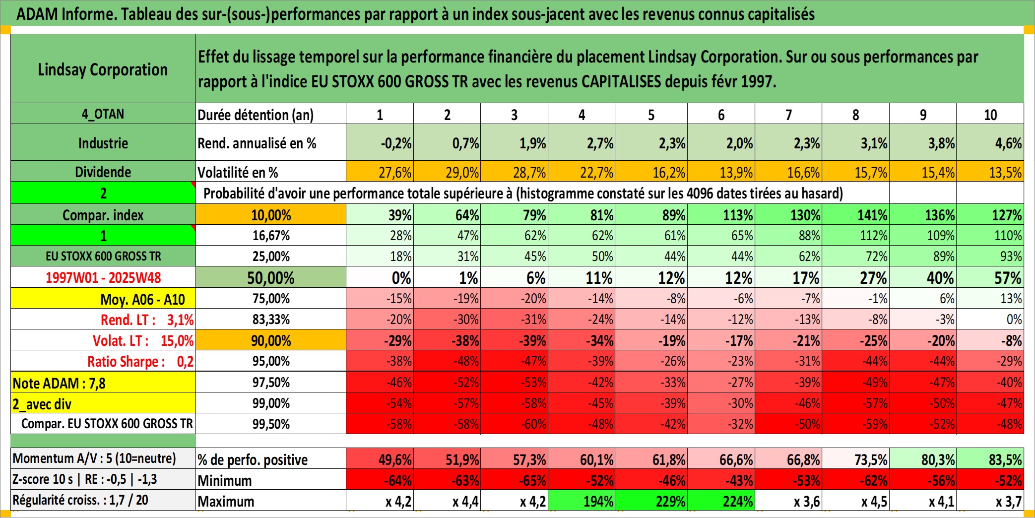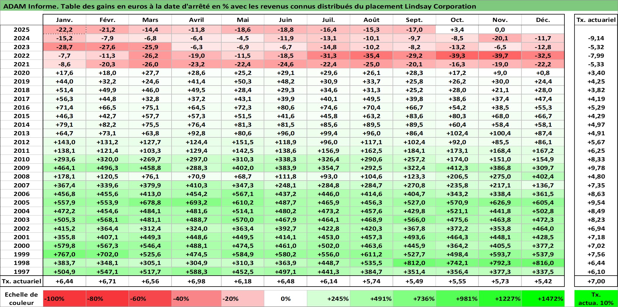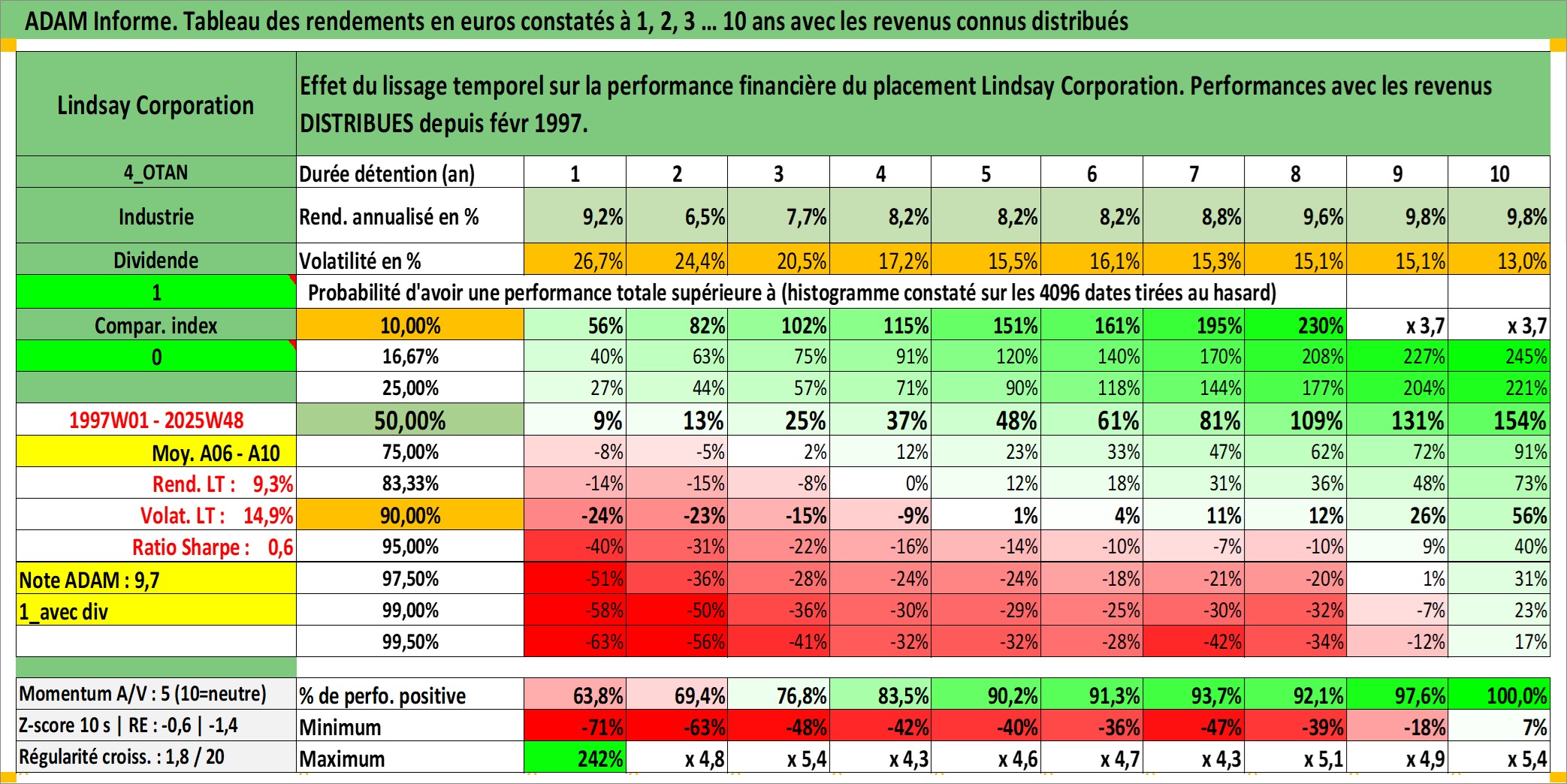 Site dédié aux investisseursPage dédiée sur site financeAnalyse des valorisations hebdomadaires de l'action Lindsay Corporation. Cet actif est cote en USD. Les valorisations sont en contrevaleur EURO et couvrent les semaines 1997W01 a 2025W48. Les revenus de cet actif financier sont pris en compte depuis la semaine 1997W07. La note ESG de cet actif n'est pas connue.