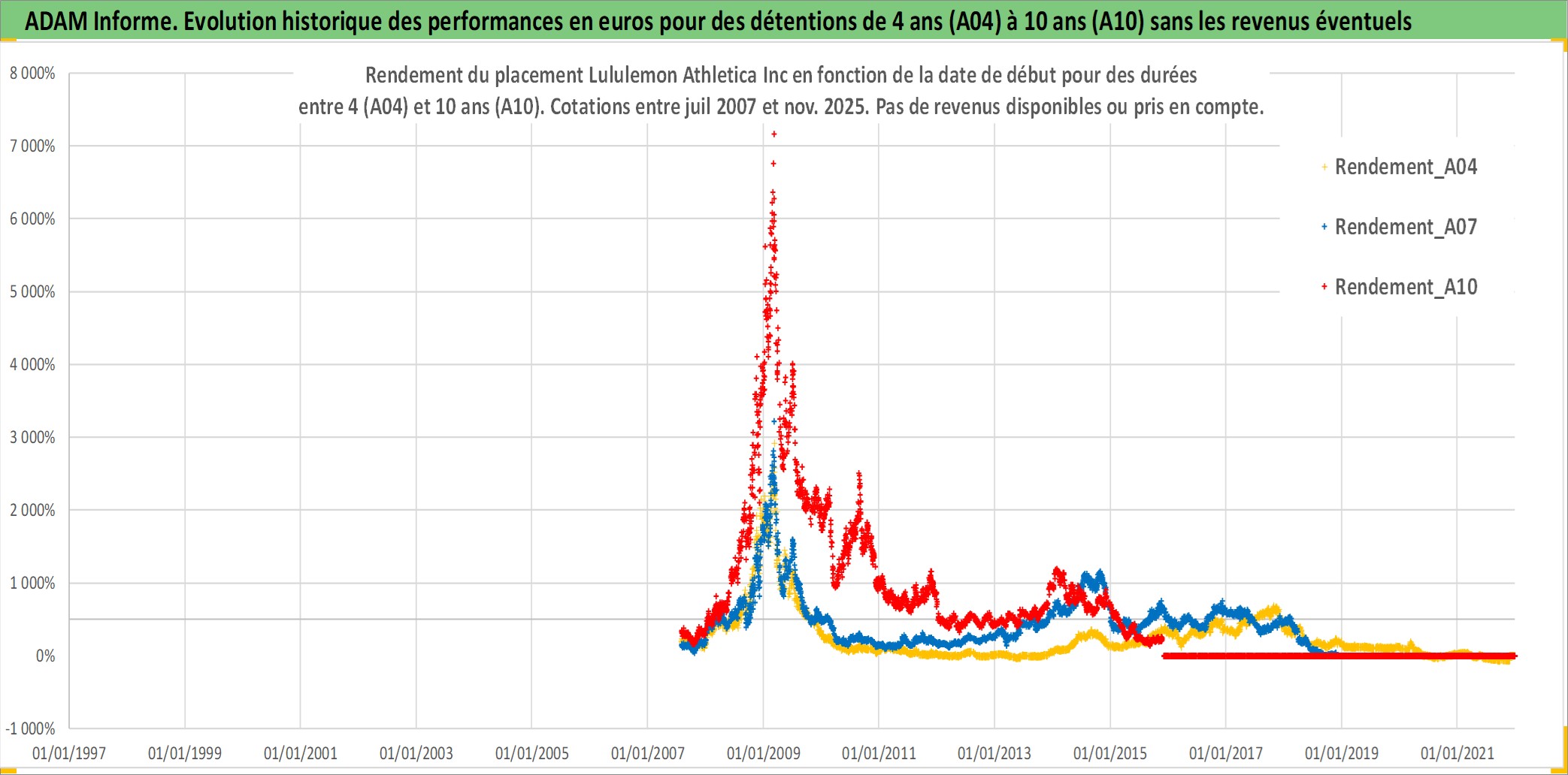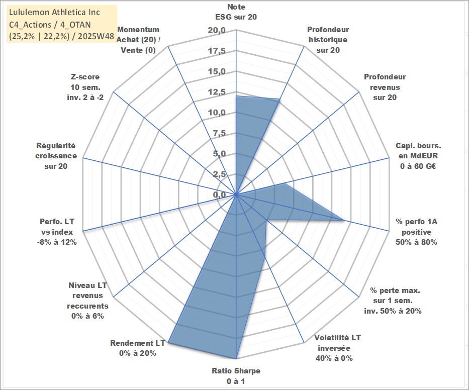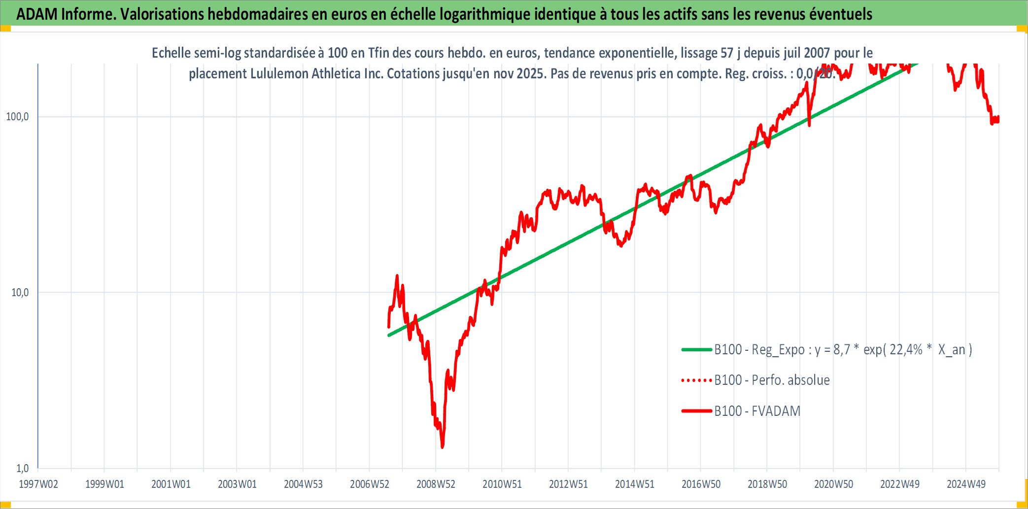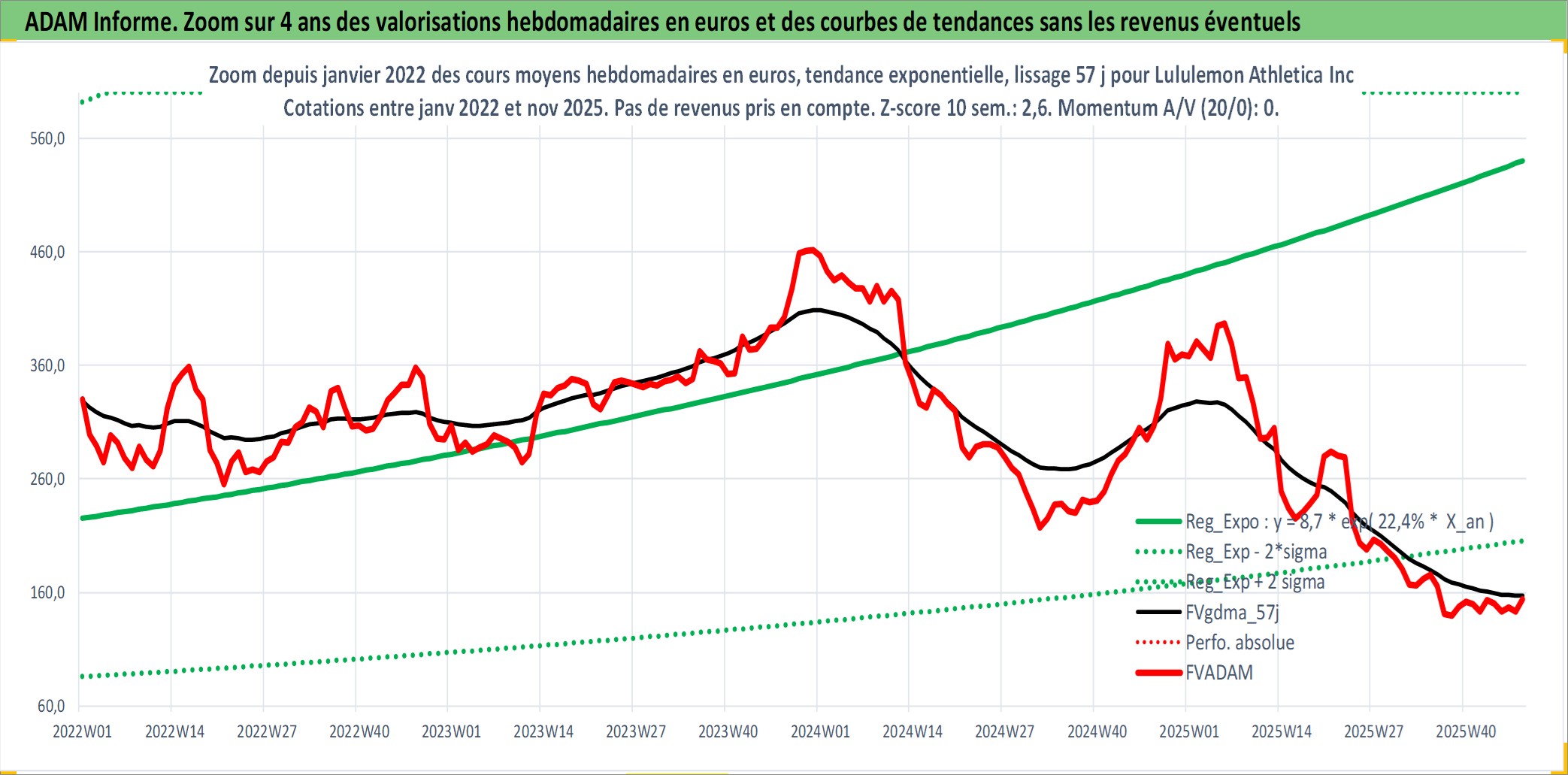 Site dédié aux investisseursPage dédiée sur site financeAnalyse des valorisations hebdomadaires de l'action Lululemon Athletica Inc. Cet actif est cote en USD. Les valorisations sont en contrevaleur EURO et couvrent les semaines 2007W30 a 2025W48. Les revenus de cet actif financier ne sont pas connus car non existants ou non disponibles sur le site Yahoo Finance. La note globale ESG de cet actif est estimee a 12.0 (apres rebasage entre 0 et 20).