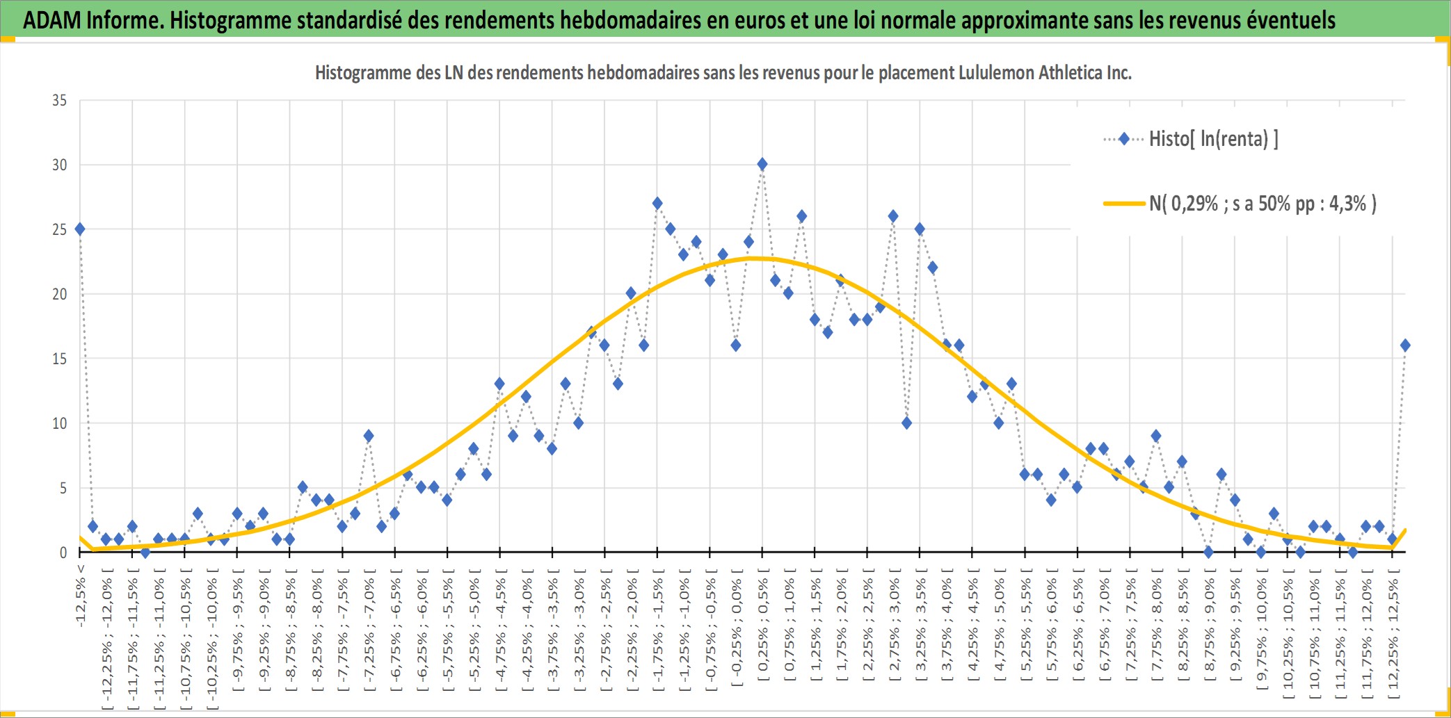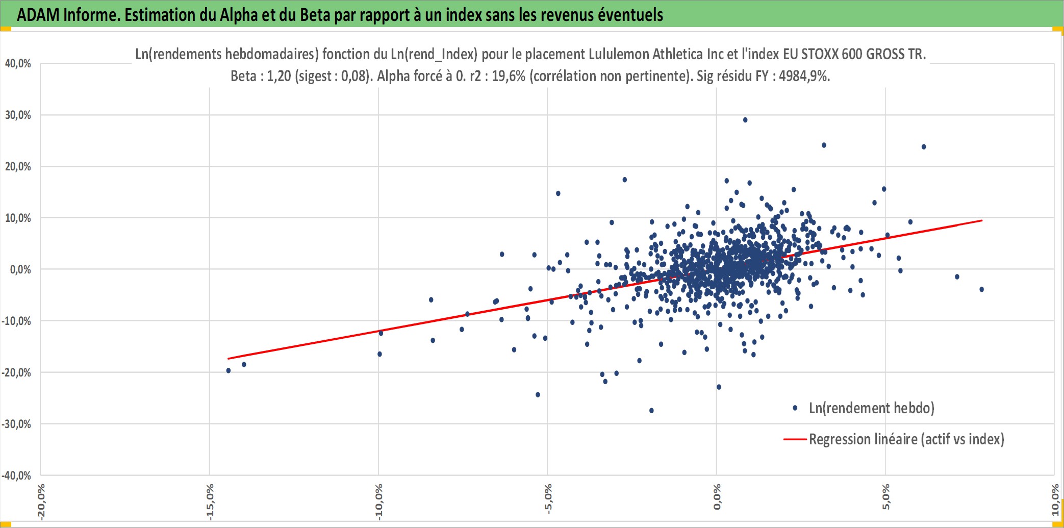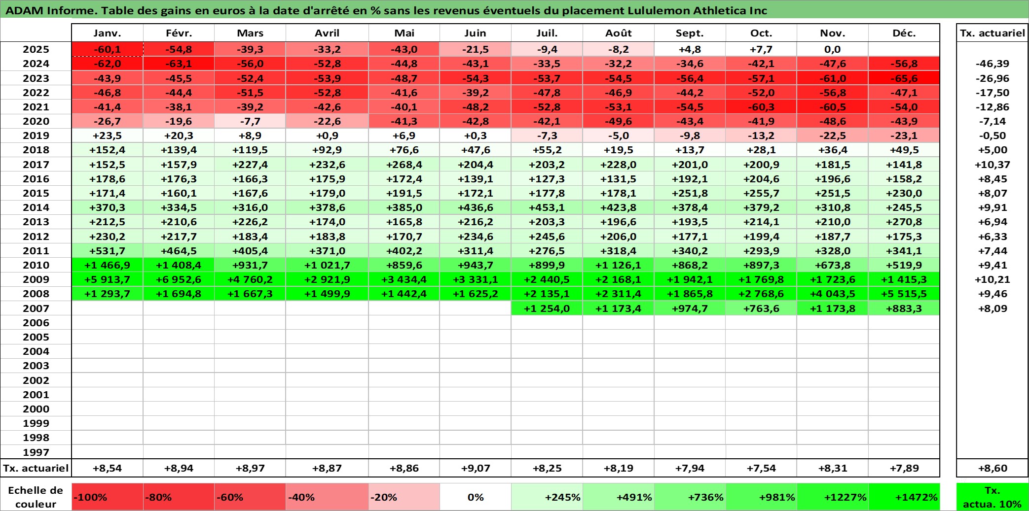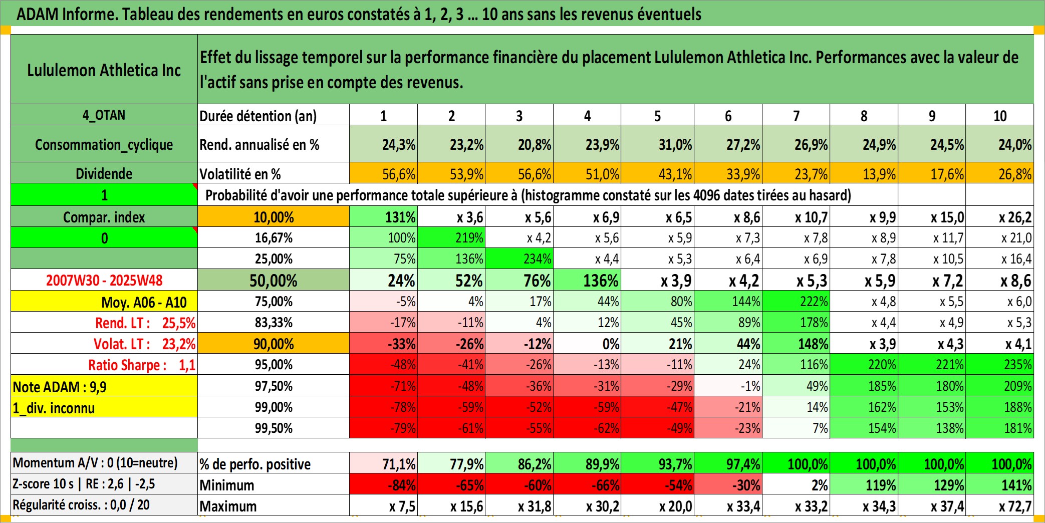 Site dédié aux investisseursPage dédiée sur site financeAnalyse des valorisations hebdomadaires de l'action Lululemon Athletica Inc. Cet actif est cote en USD. Les valorisations sont en contrevaleur EURO et couvrent les semaines 2007W30 a 2025W48. Les revenus de cet actif financier ne sont pas connus car non existants ou non disponibles sur le site Yahoo Finance. La note globale ESG de cet actif est estimee a 12.0 (apres rebasage entre 0 et 20).