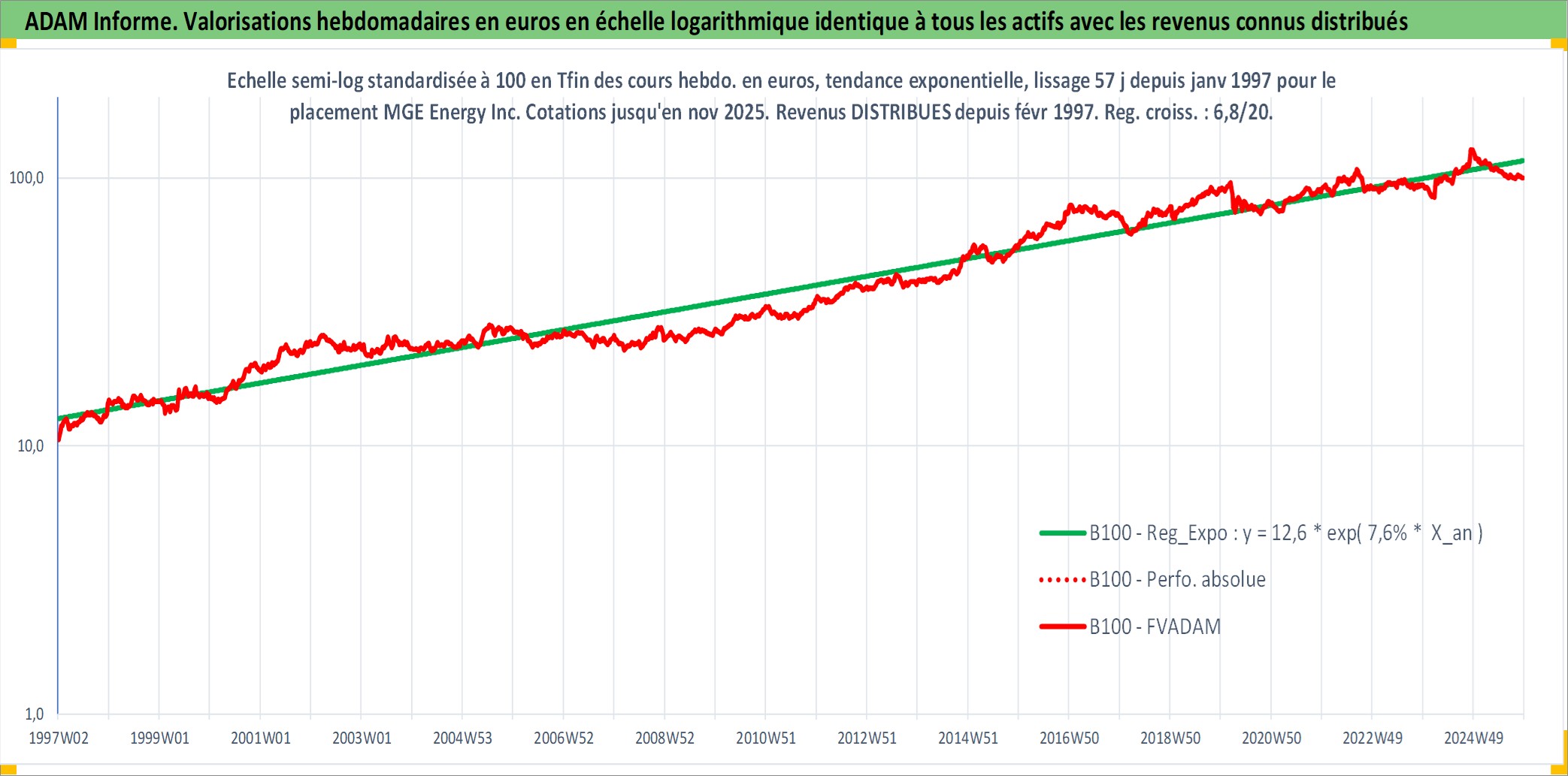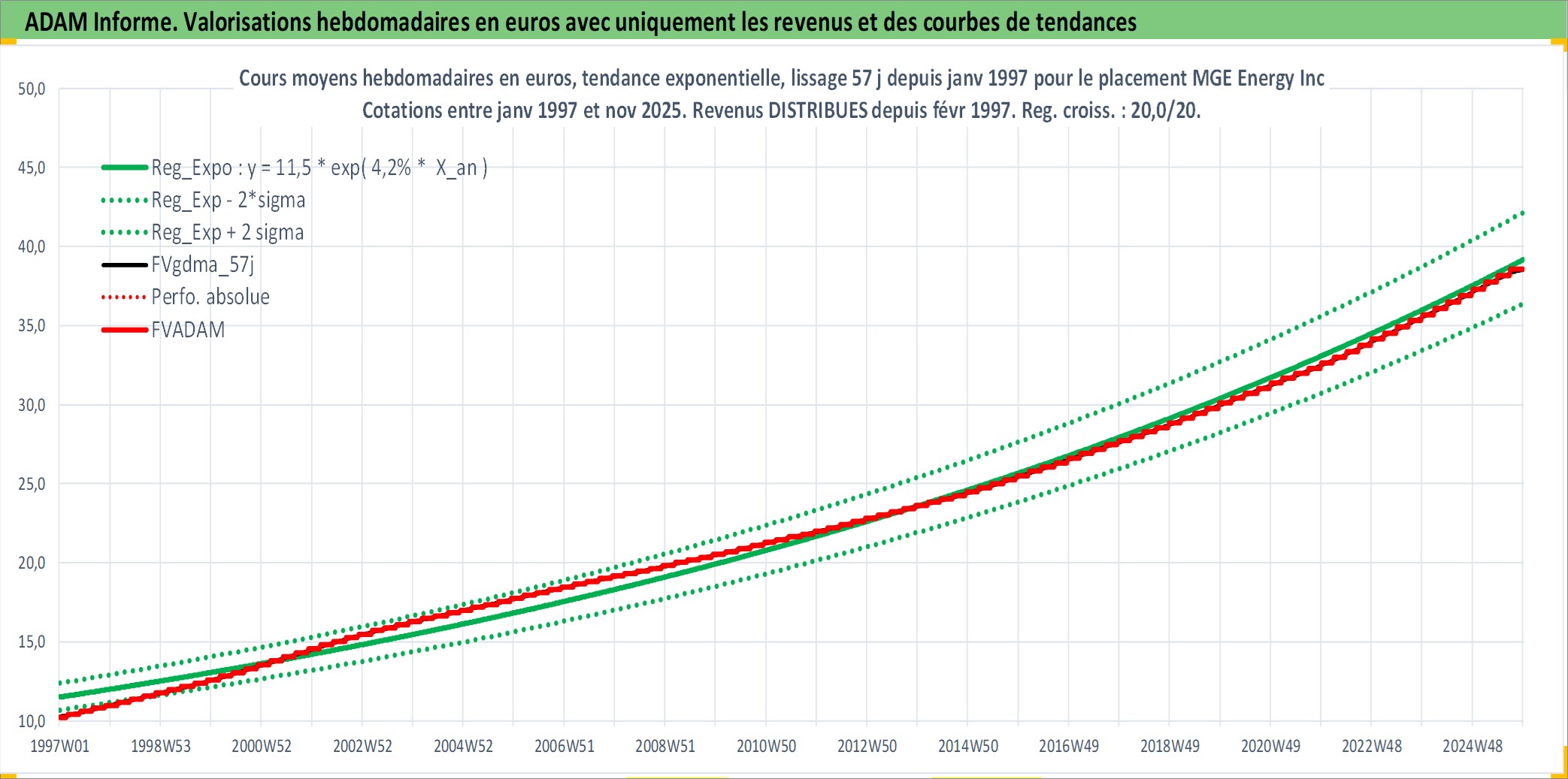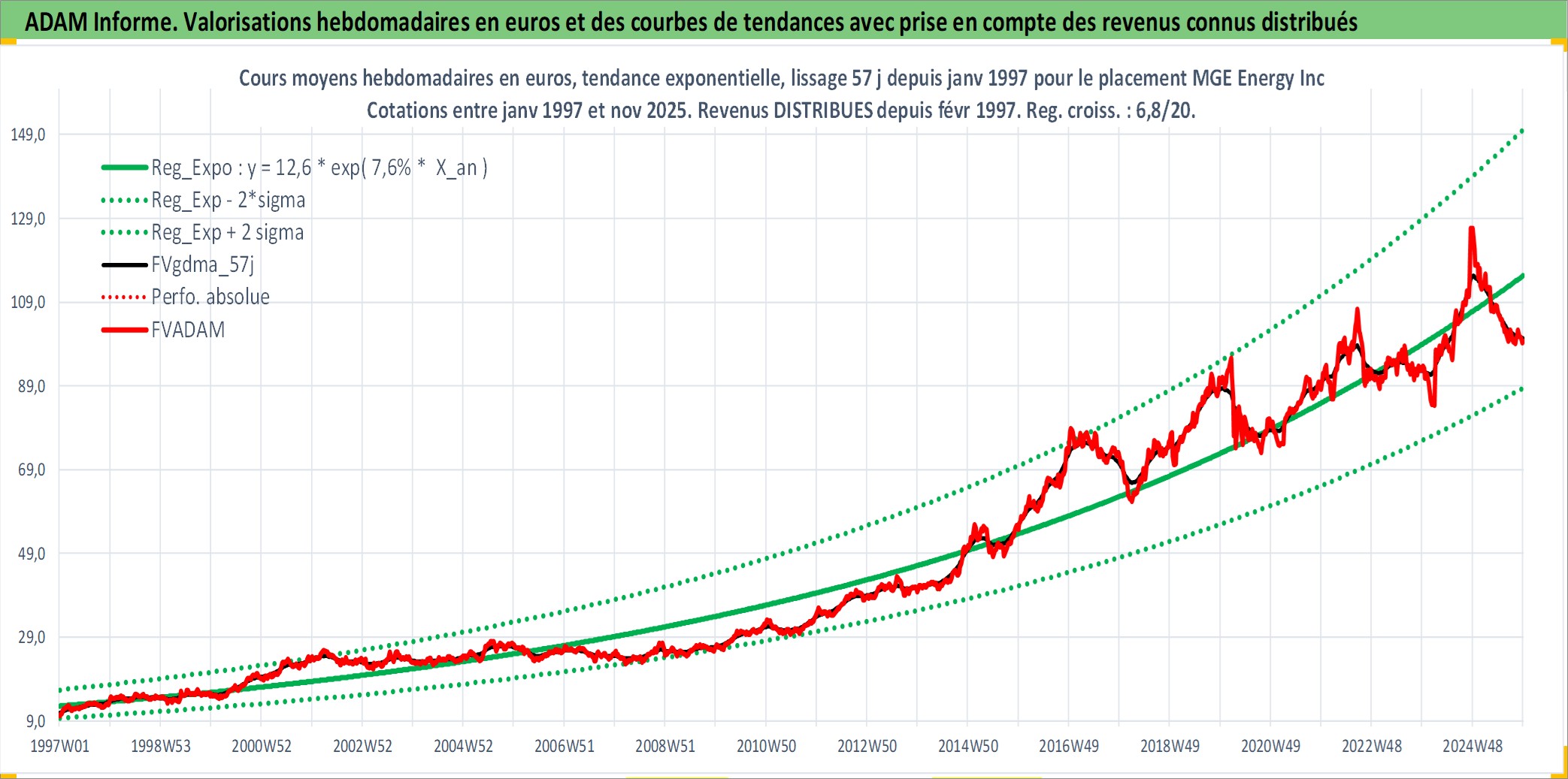 Site dédié aux investisseursPage dédiée sur site financeAnalyse des valorisations hebdomadaires de l'action MGE Energy Inc. Cet actif est cote en USD. Les valorisations sont en contrevaleur EURO et couvrent les semaines 1997W01 a 2025W48. Les revenus de cet actif financier sont pris en compte depuis la semaine 1997W09. La note ESG de cet actif n'est pas connue.