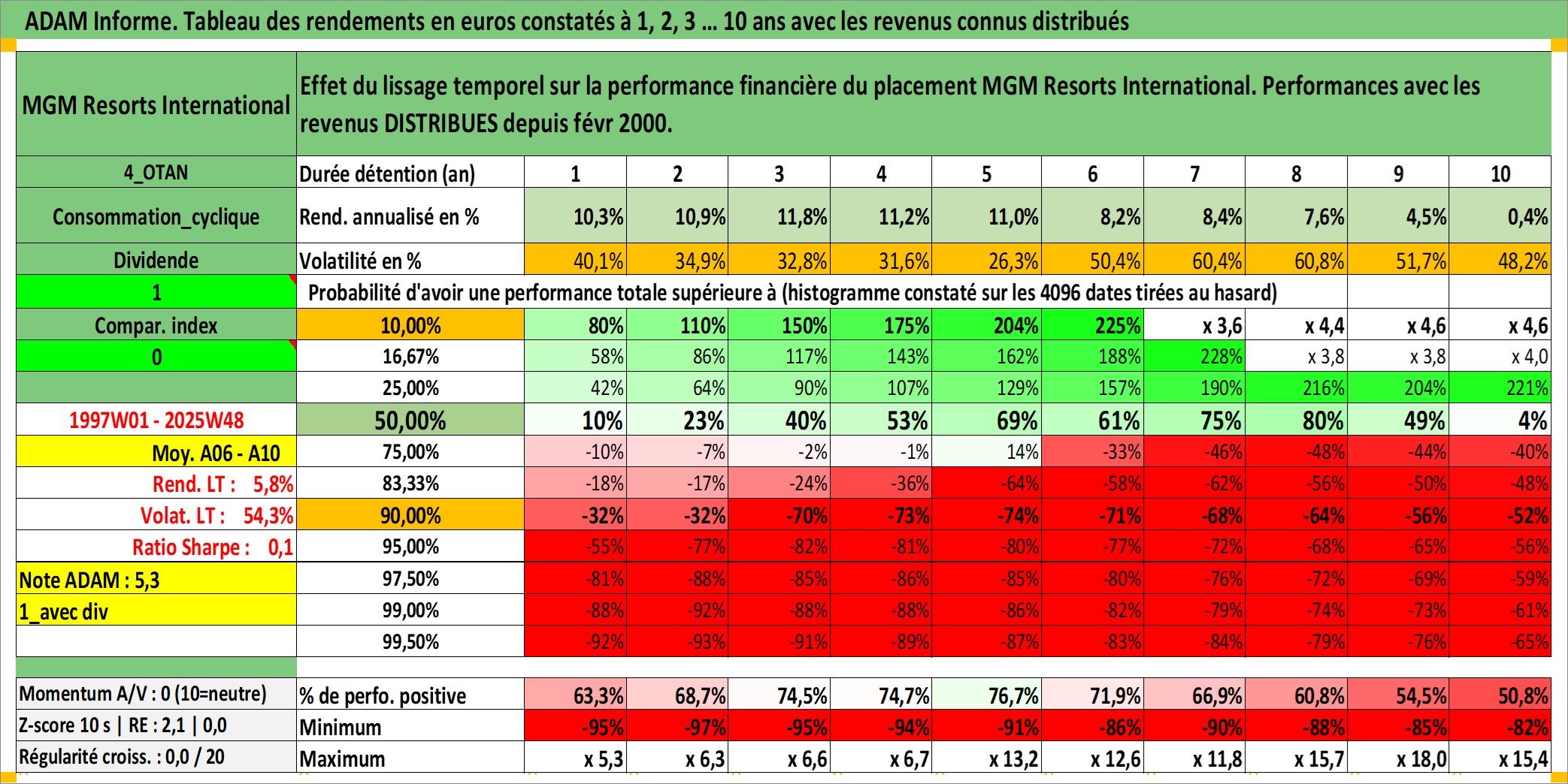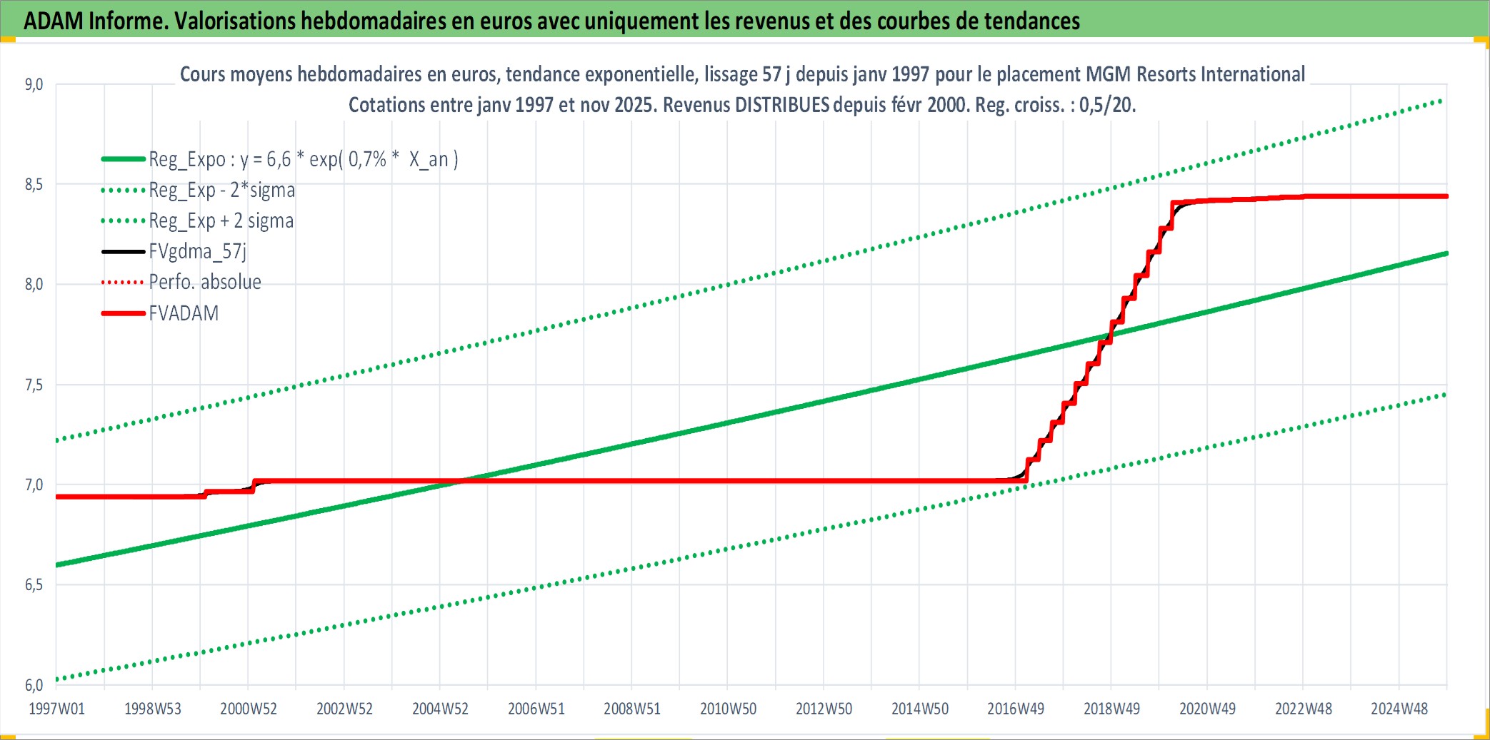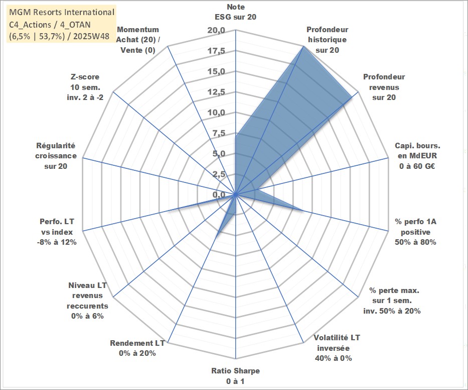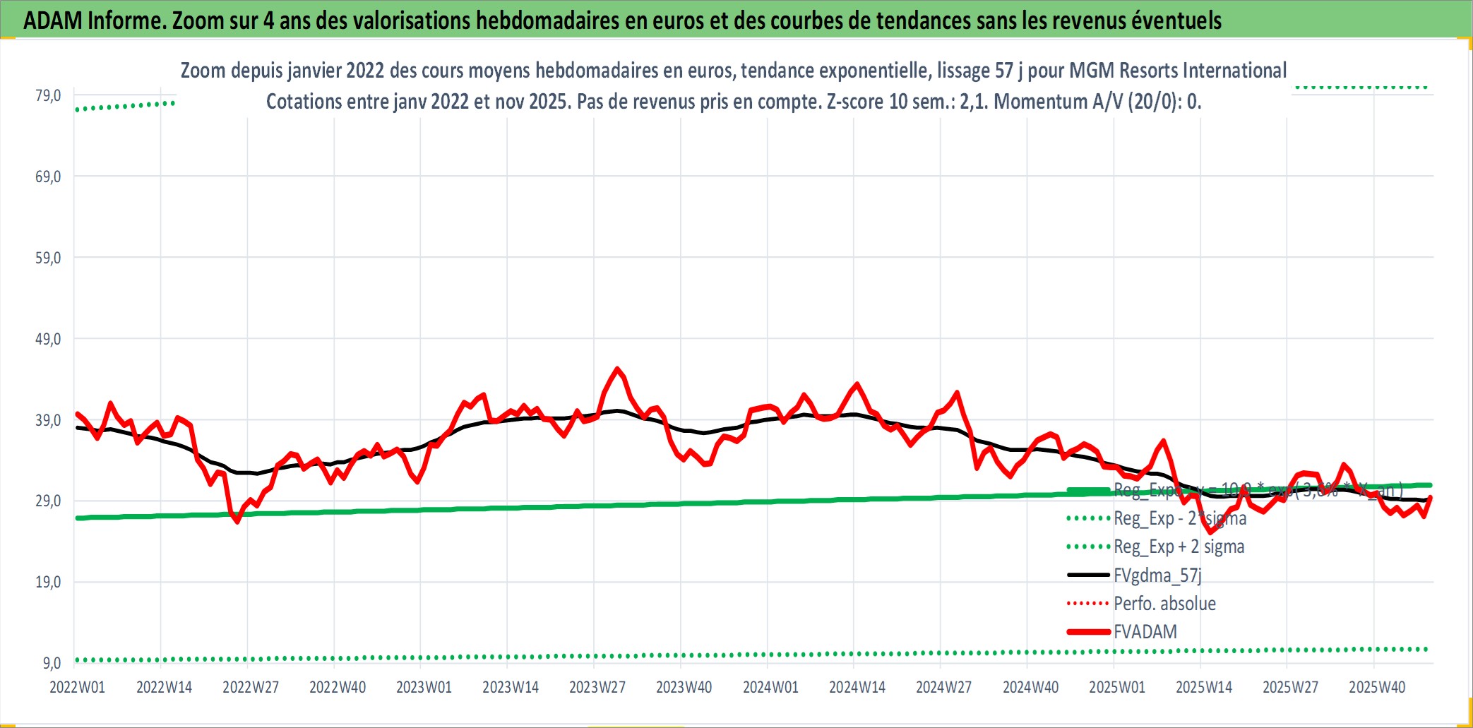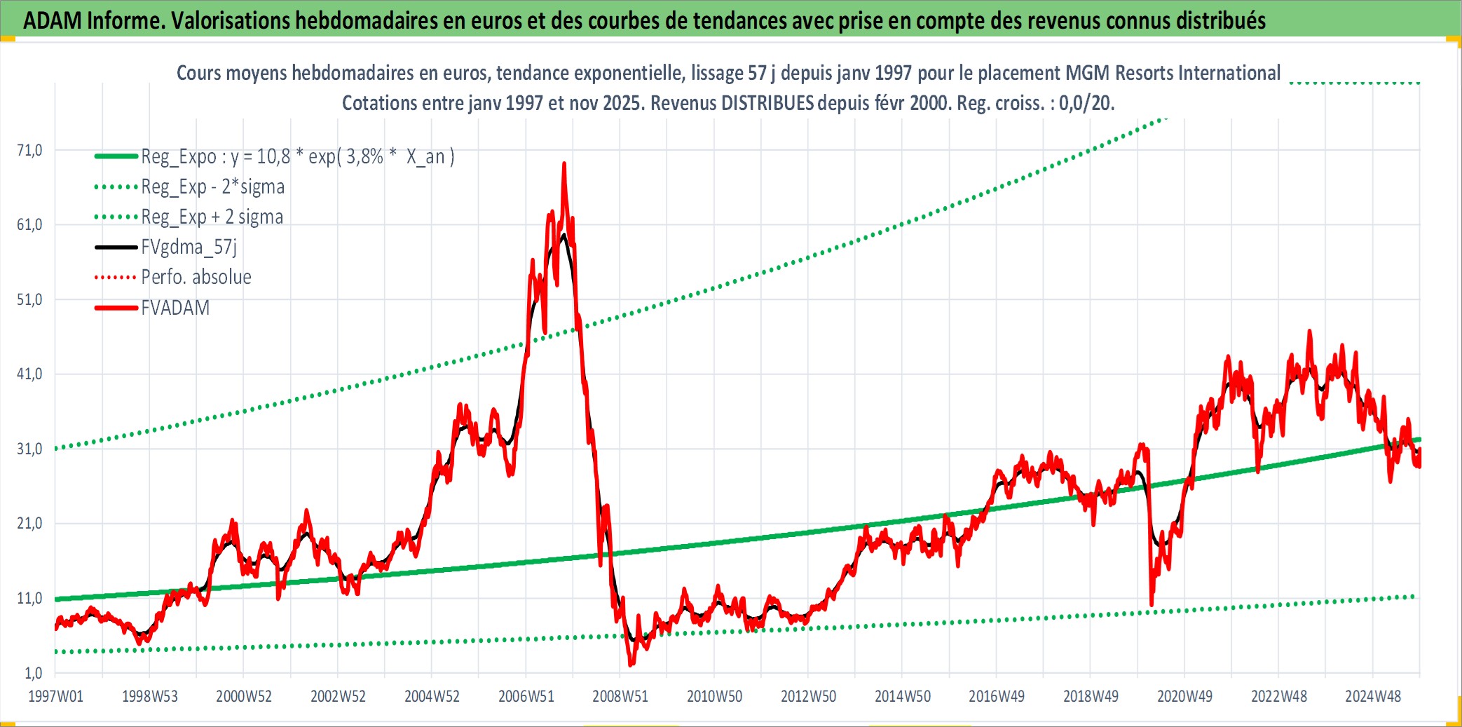 Site dédié aux investisseursPage dédiée sur site financeAnalyse des valorisations hebdomadaires de l'action MGM Resorts International. Cet actif est cote en USD. Les valorisations sont en contrevaleur EURO et couvrent les semaines 1997W01 a 2025W48. Les revenus de cet actif financier sont pris en compte depuis la semaine 2000W06. La note globale ESG de cet actif est estimee a 7.0 (apres rebasage entre 0 et 20).