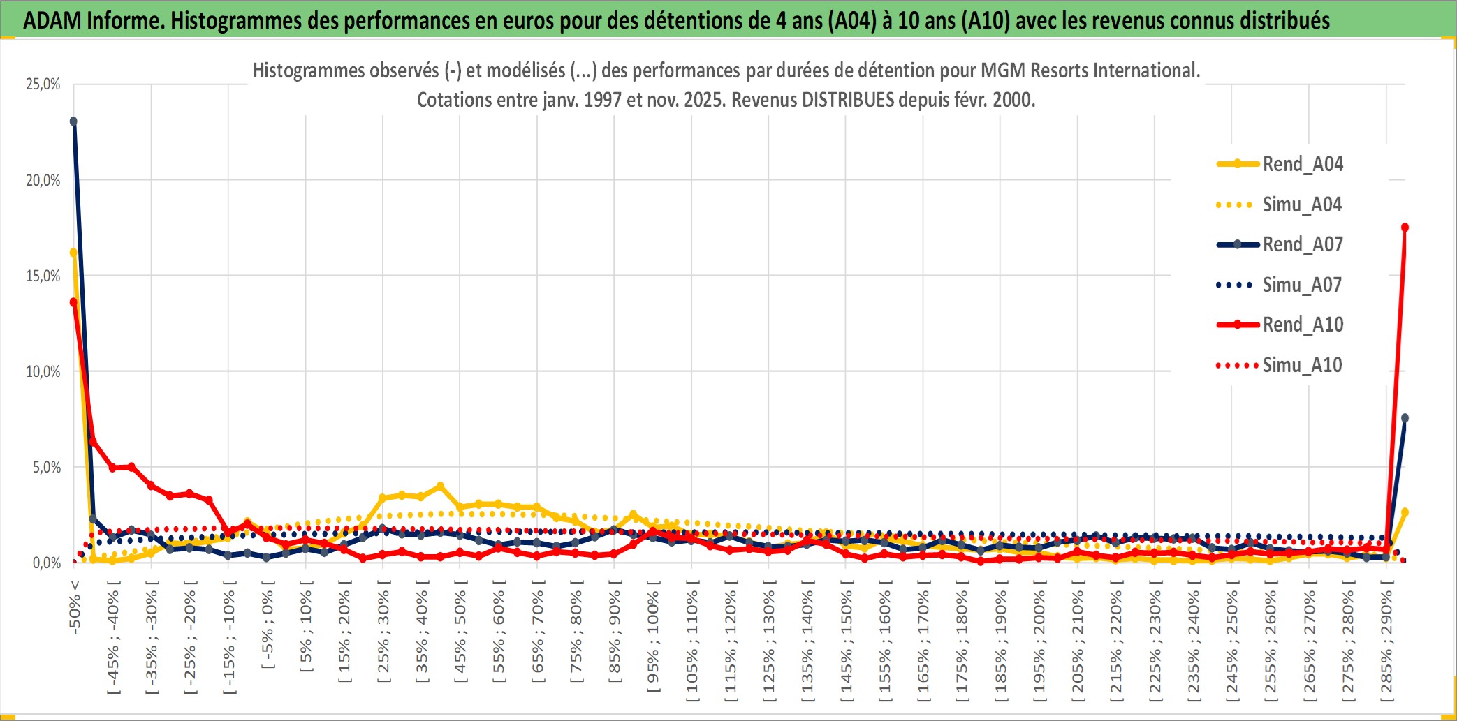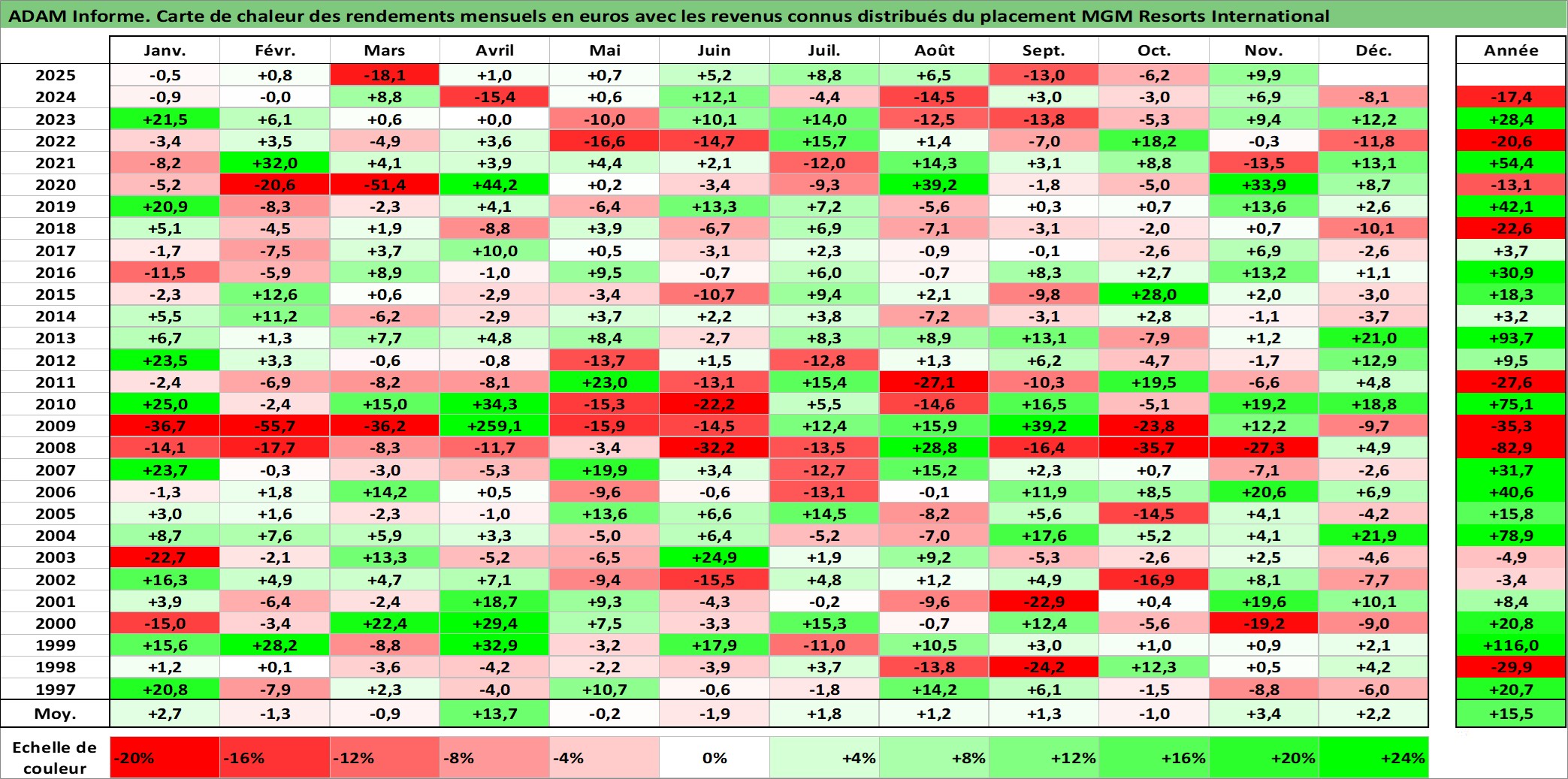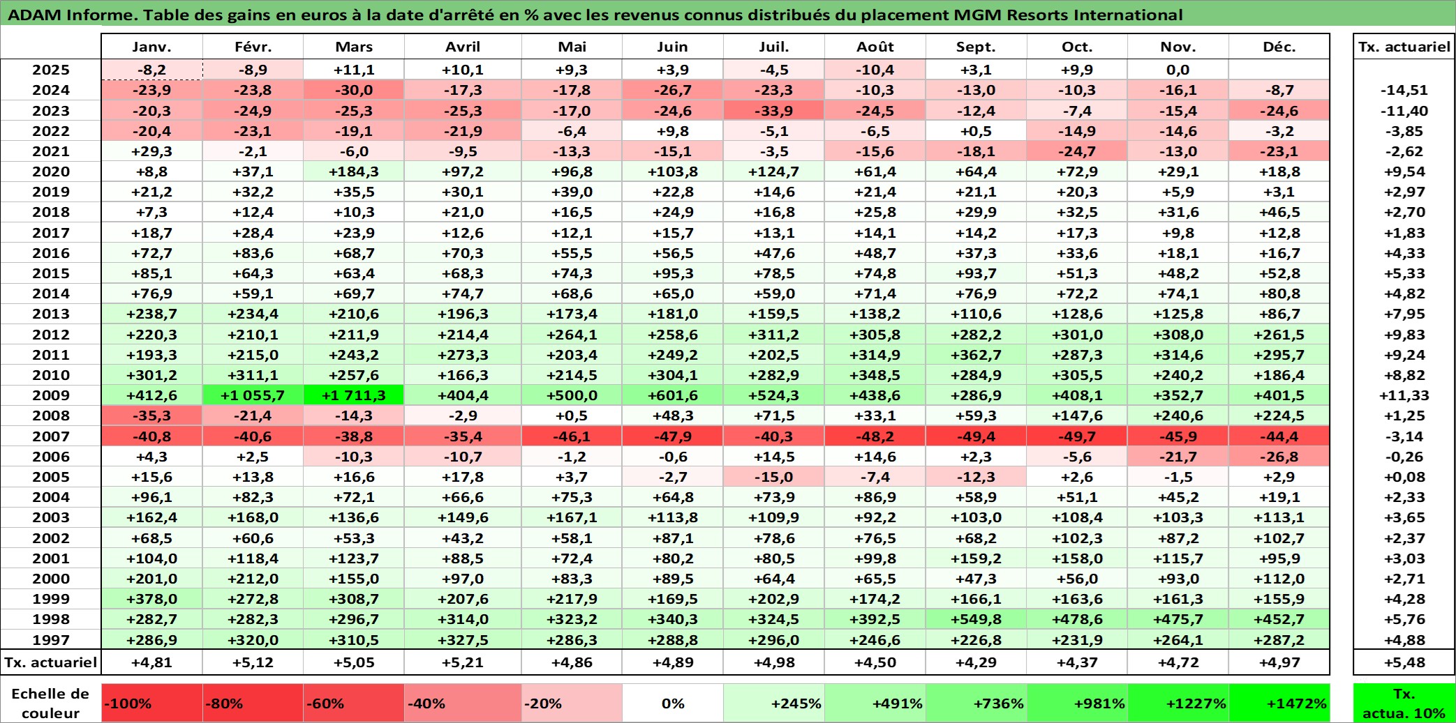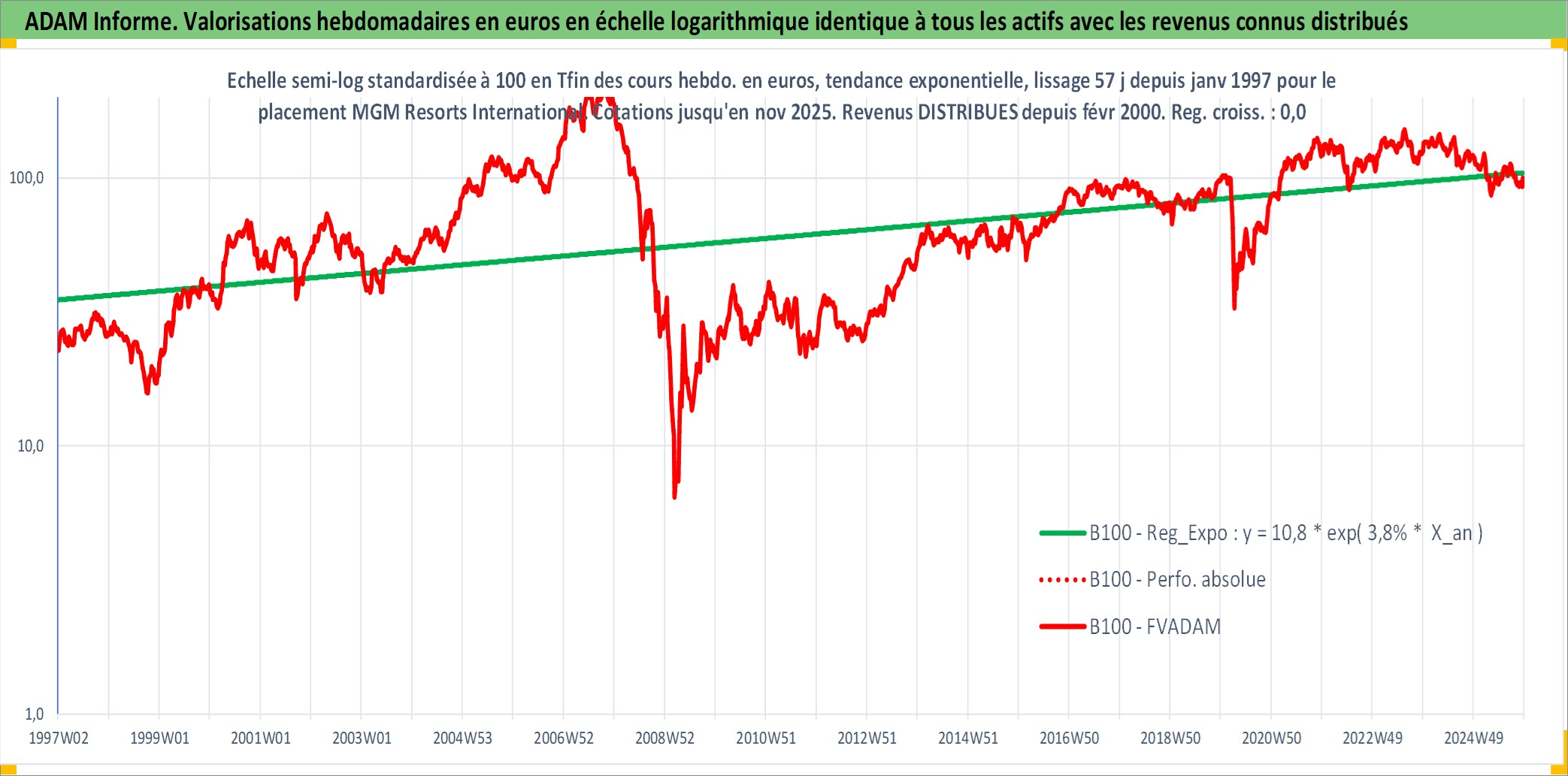 Site dédié aux investisseursPage dédiée sur site financeAnalyse des valorisations hebdomadaires de l'action MGM Resorts International. Cet actif est cote en USD. Les valorisations sont en contrevaleur EURO et couvrent les semaines 1997W01 a 2025W48. Les revenus de cet actif financier sont pris en compte depuis la semaine 2000W06. La note globale ESG de cet actif est estimee a 7.0 (apres rebasage entre 0 et 20).