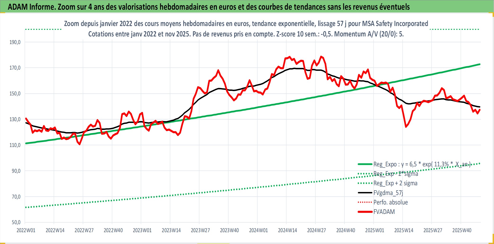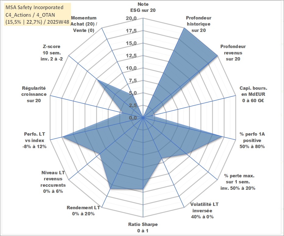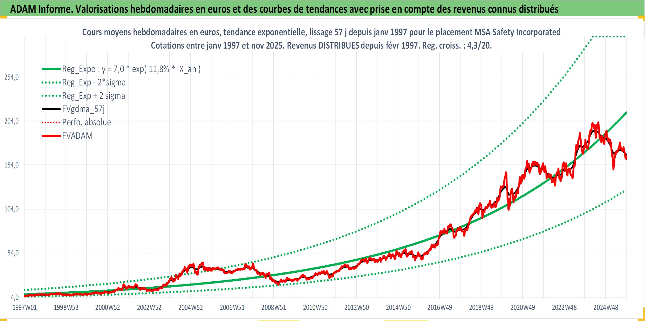 Site dédié aux investisseursPage dédiée sur site financeAnalyse des valorisations hebdomadaires de l'action MSA Safety Incorporated. Cet actif est cote en USD. Les valorisations sont en contrevaleur EURO et couvrent les semaines 1997W01 a 2025W48. Les revenus de cet actif financier sont pris en compte depuis la semaine 1997W08. La note ESG de cet actif n'est pas connue.
