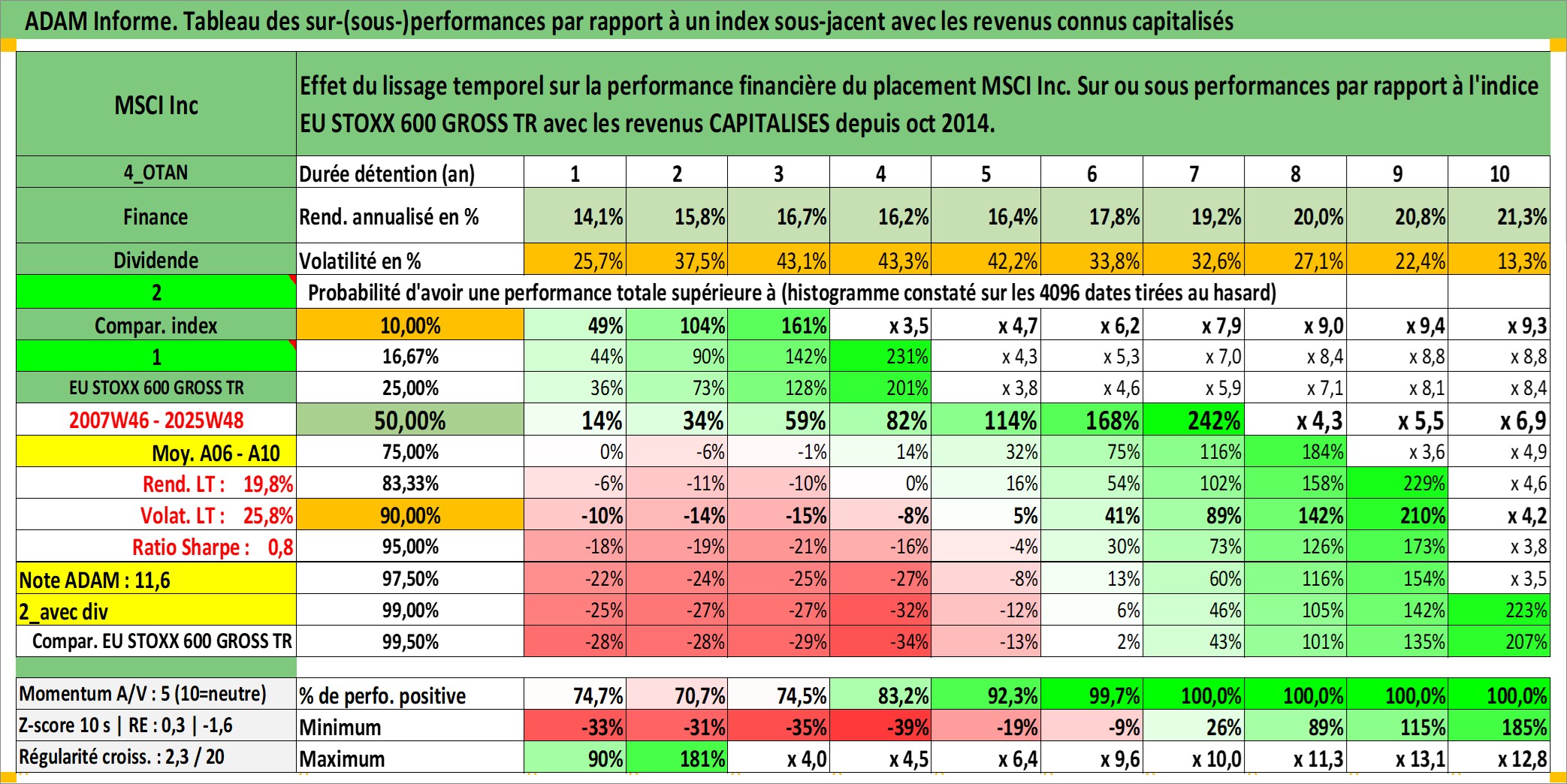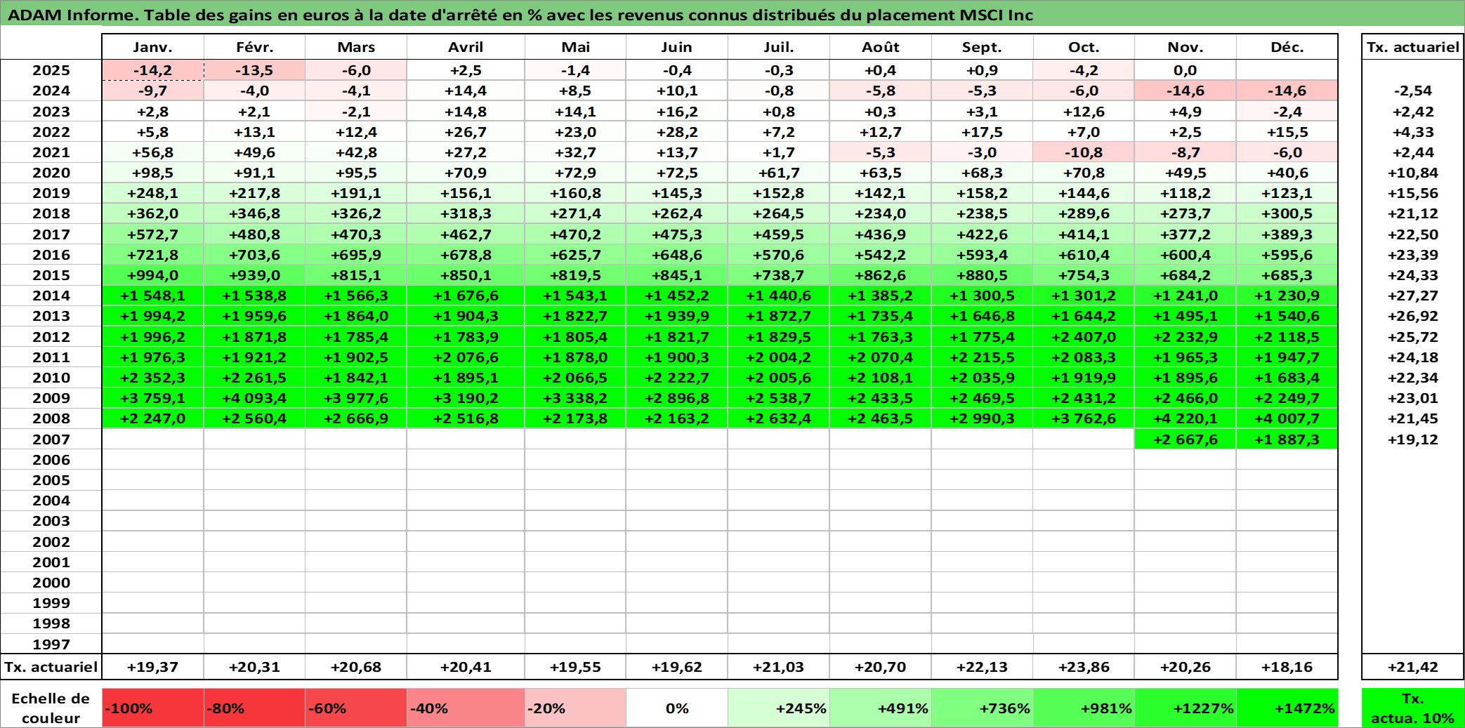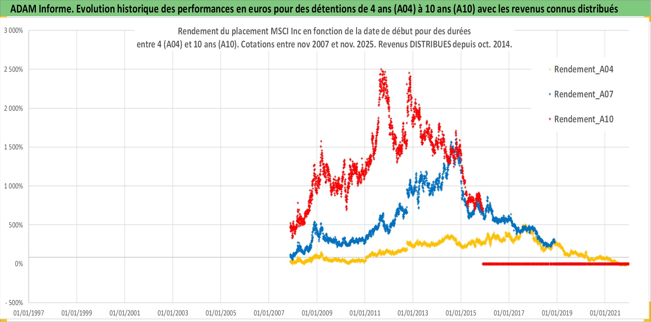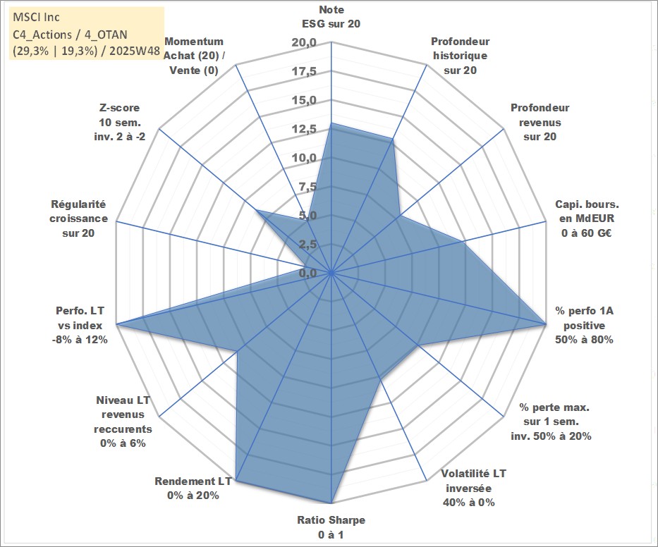 Site dédié aux investisseursPage dédiée sur site financeAnalyse des valorisations hebdomadaires de l'action MSCI Inc. Cet actif est cote en USD. Les valorisations sont en contrevaleur EURO et couvrent les semaines 2007W46 a 2025W48. Les revenus de cet actif financier sont pris en compte depuis la semaine 2014W41. La note globale ESG de cet actif est estimee a 13.0 (apres rebasage entre 0 et 20).