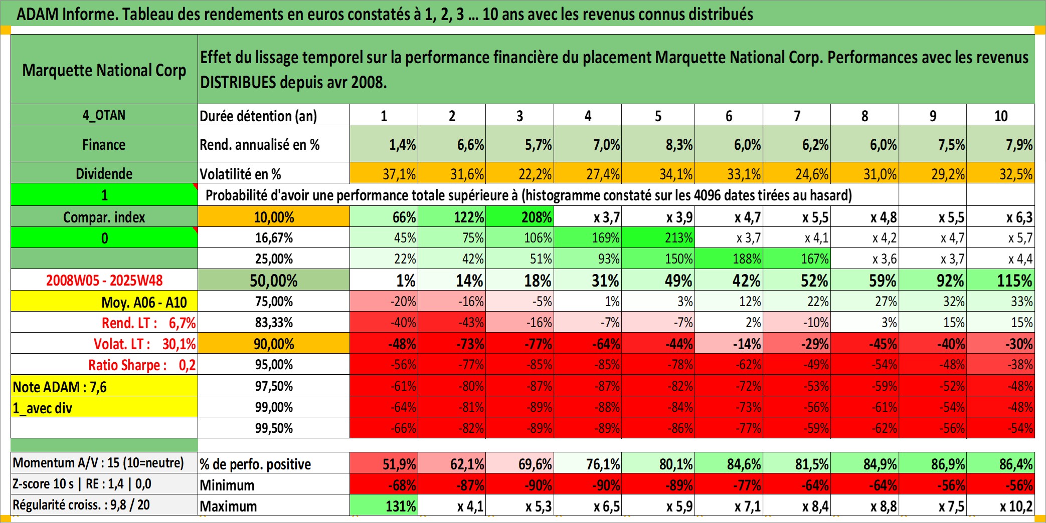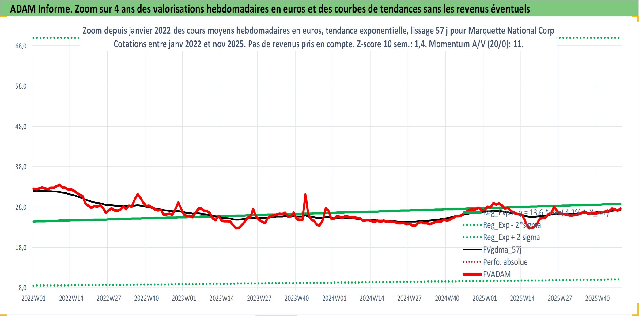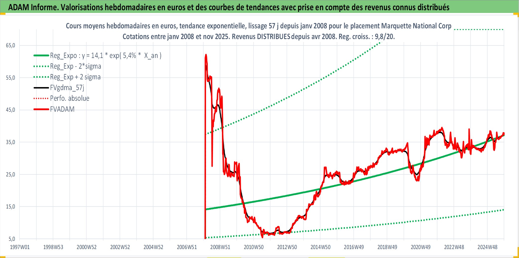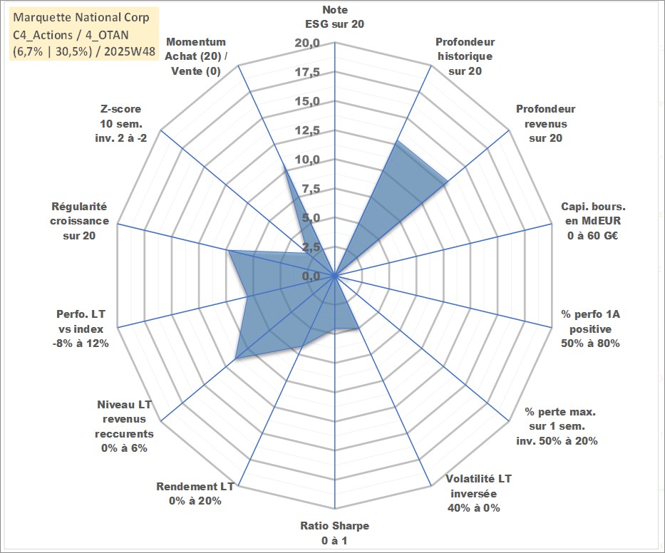 Site dédié aux investisseursPage dédiée sur site financeAnalyse des valorisations hebdomadaires de l'action Marquette National Corp. Cet actif est cote en USD. Les valorisations sont en contrevaleur EURO et couvrent les semaines 2008W05 a 2025W48. Les revenus de cet actif financier sont pris en compte depuis la semaine 2008W16. La note ESG de cet actif n'est pas connue.