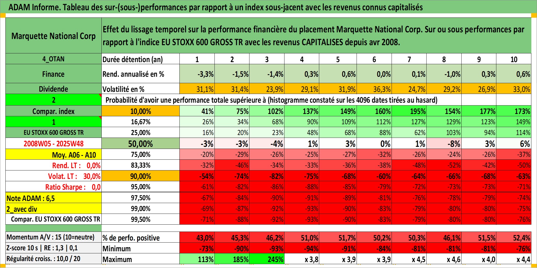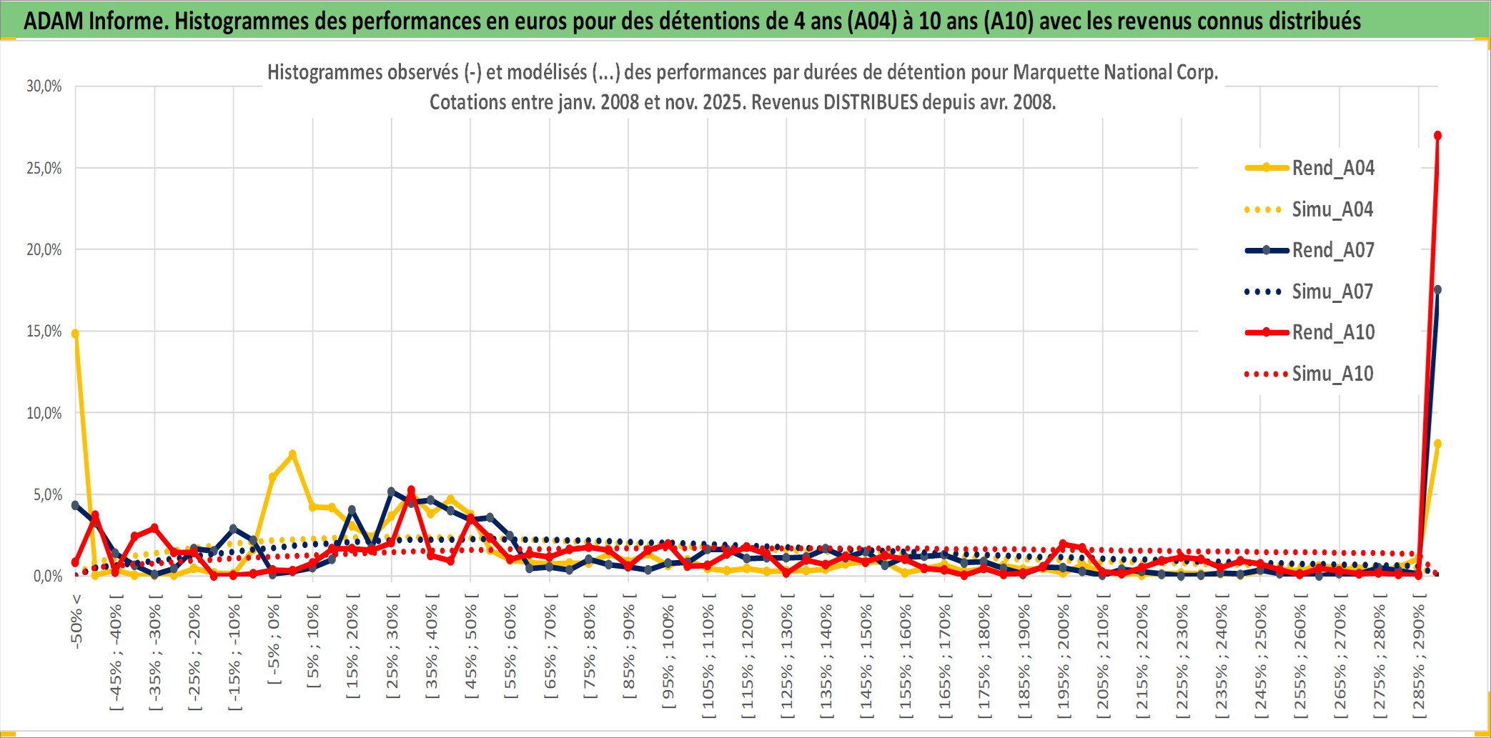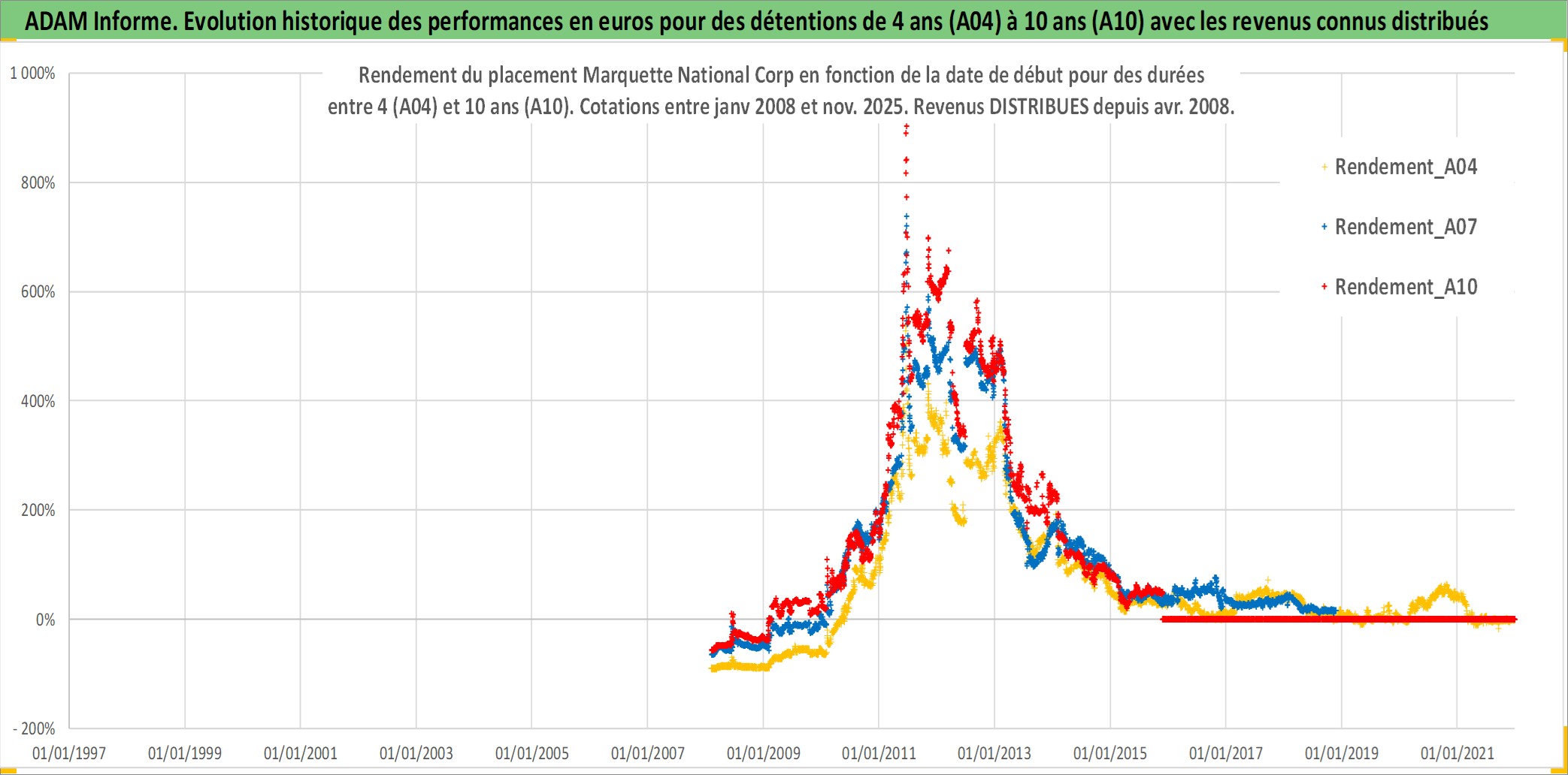 Site dédié aux investisseursPage dédiée sur site financeAnalyse des valorisations hebdomadaires de l'action Marquette National Corp. Cet actif est cote en USD. Les valorisations sont en contrevaleur EURO et couvrent les semaines 2008W05 a 2025W48. Les revenus de cet actif financier sont pris en compte depuis la semaine 2008W16. La note ESG de cet actif n'est pas connue.