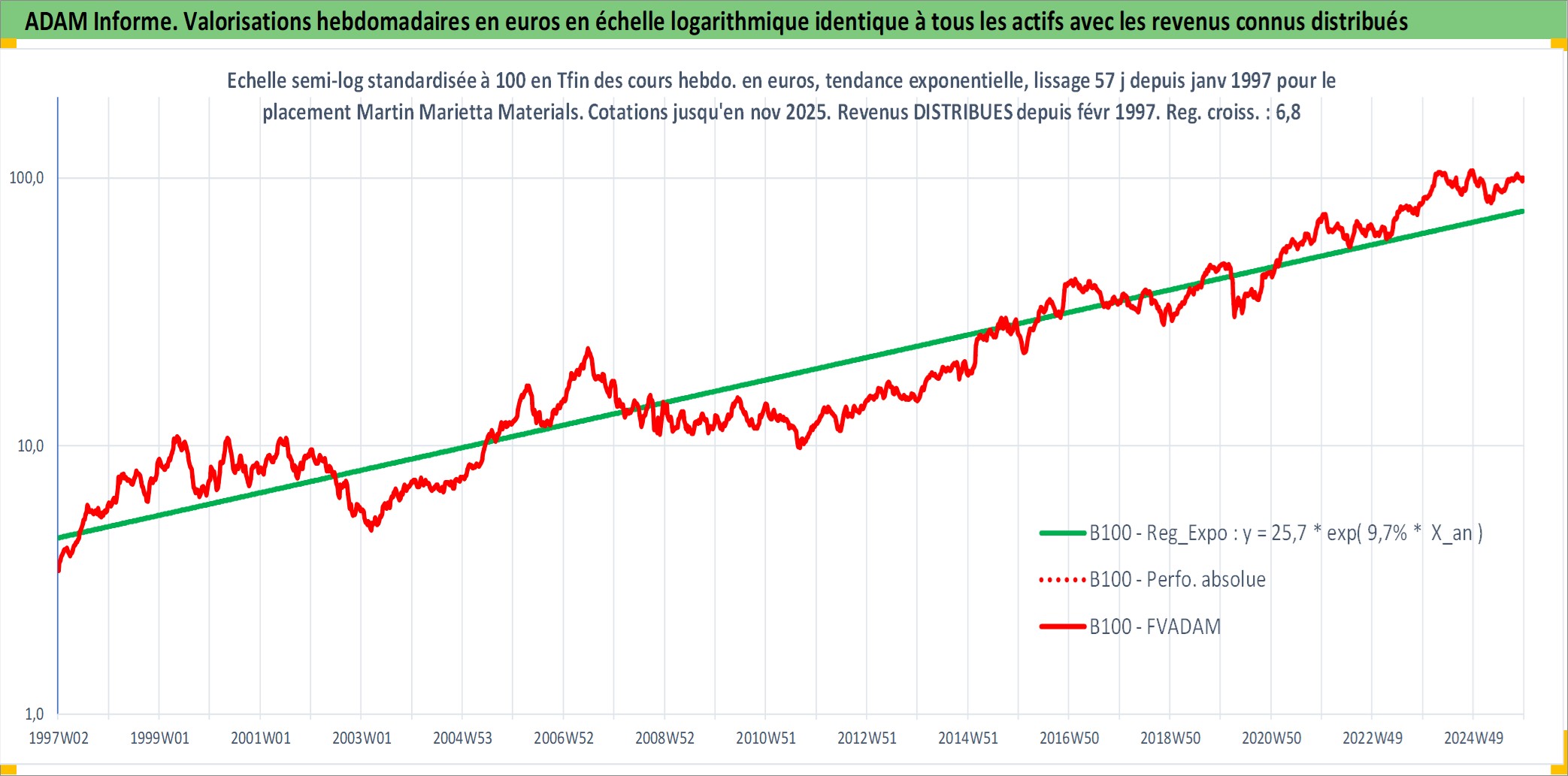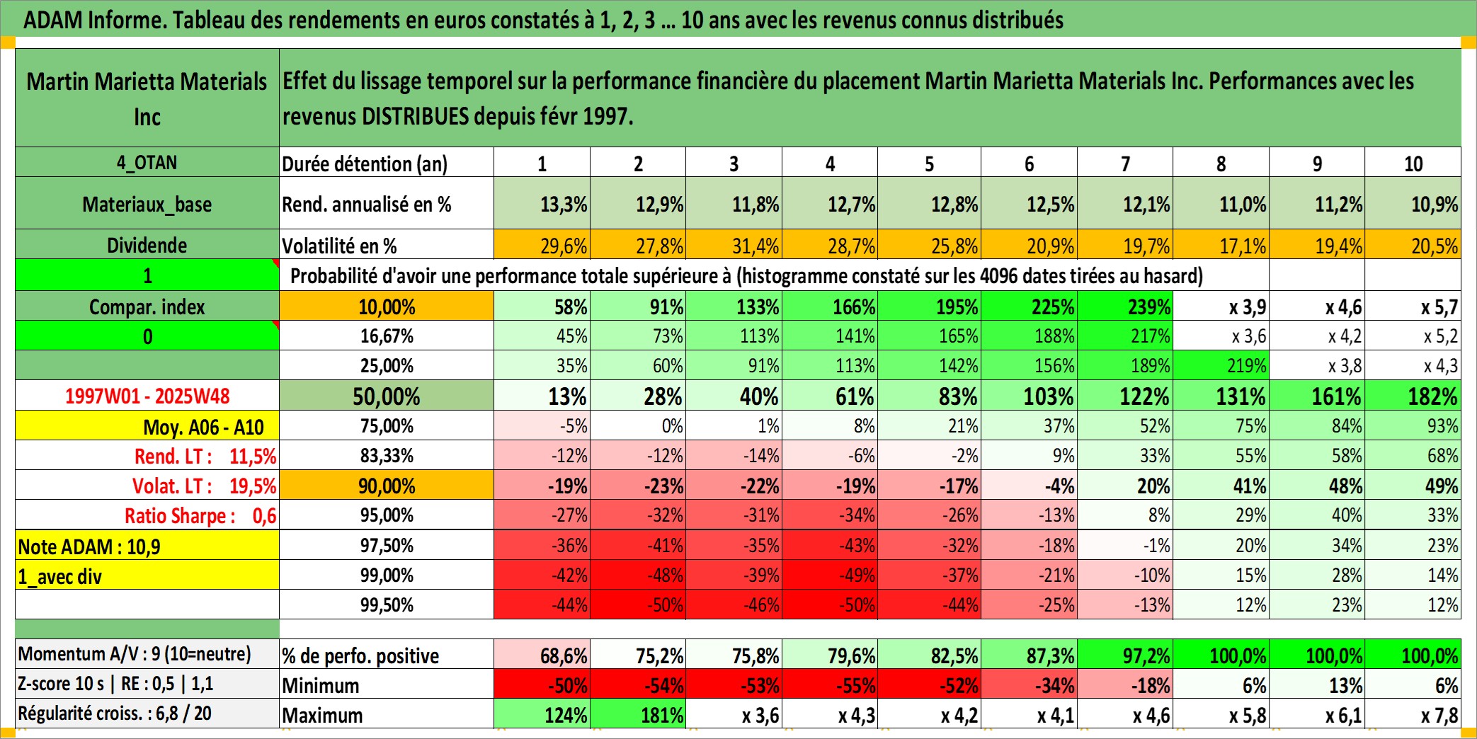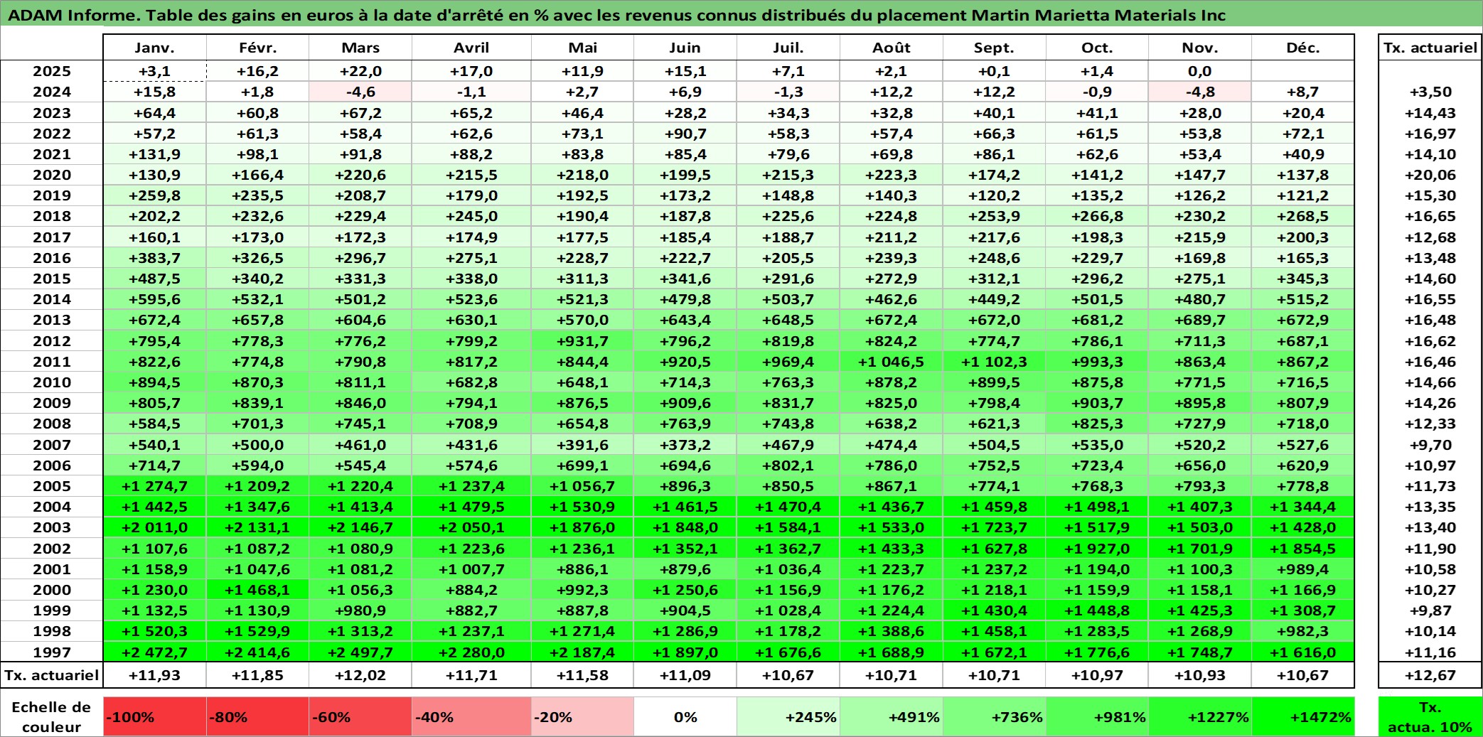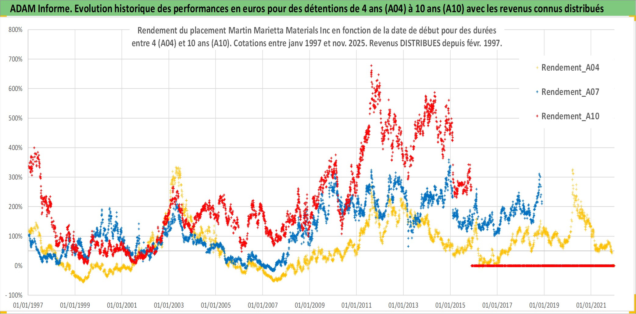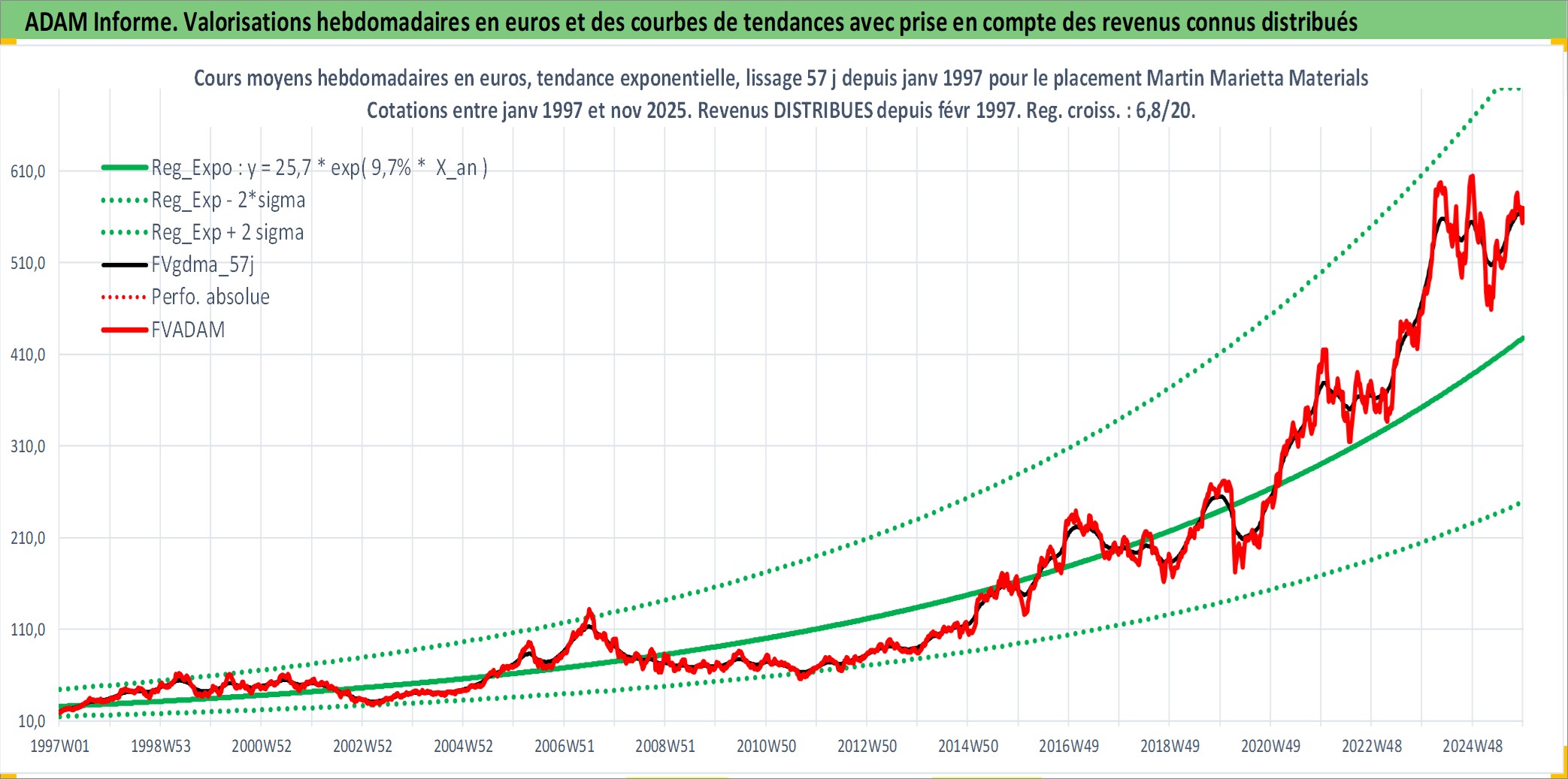 Site dédié aux investisseursPage dédiée sur site financeAnalyse des valorisations hebdomadaires de l'action Martin Marietta Materials Inc. Cet actif est cote en USD. Les valorisations sont en contrevaleur EURO et couvrent les semaines 1997W01 a 2025W48. Les revenus de cet actif financier sont pris en compte depuis la semaine 1997W09. La note globale ESG de cet actif est estimee a 4.0 (apres rebasage entre 0 et 20).