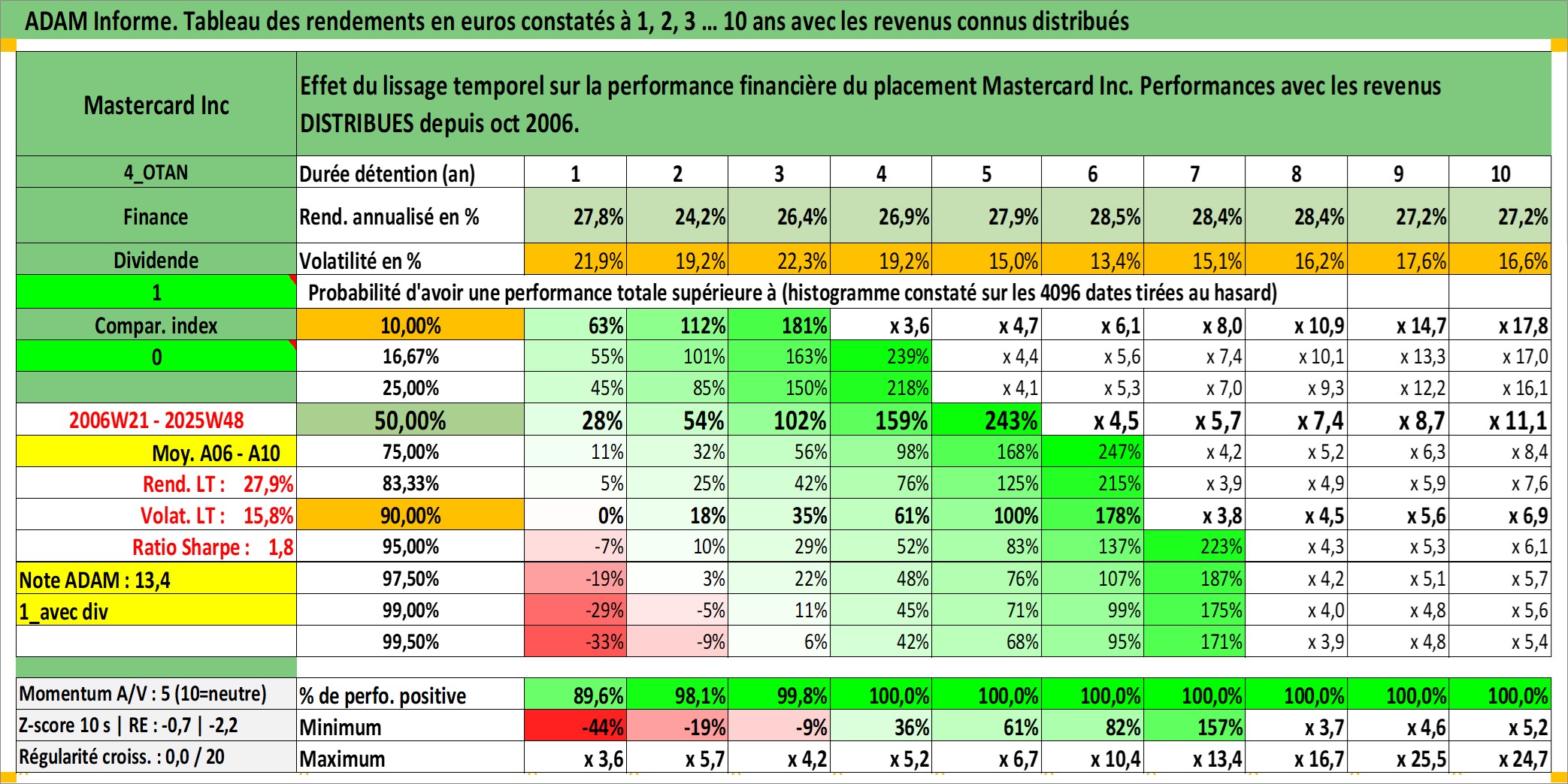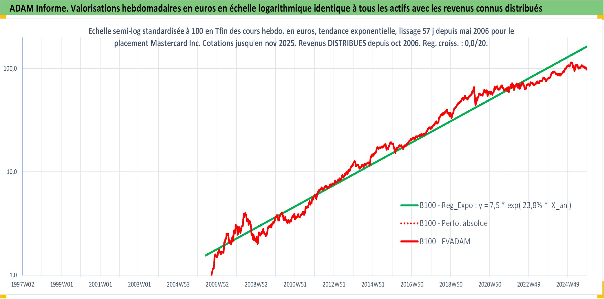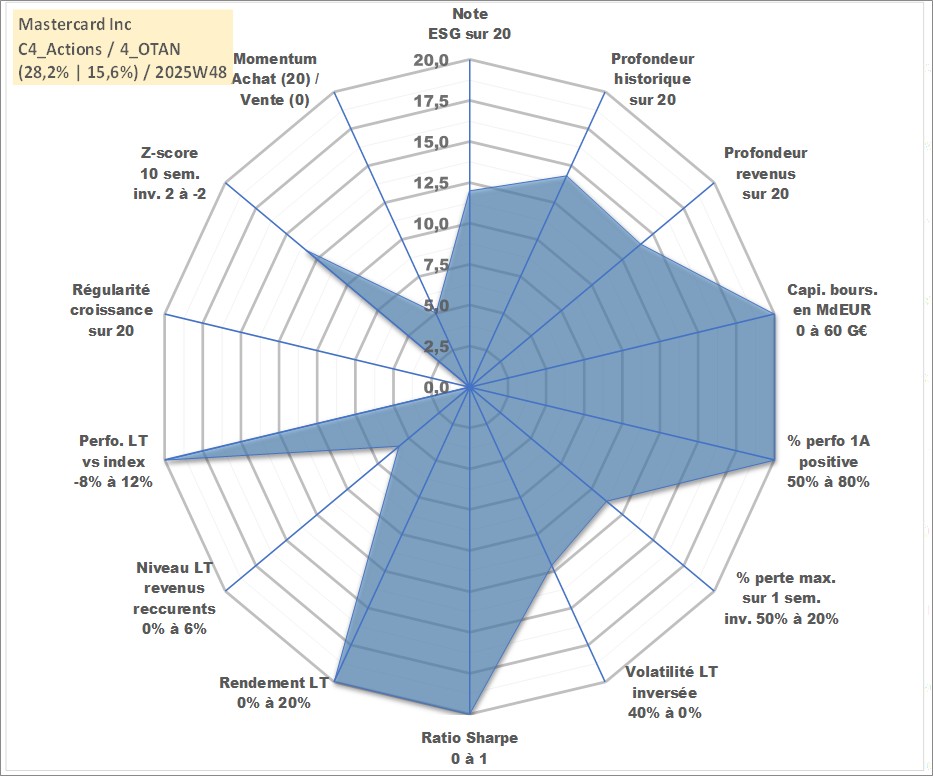 Site dédié aux investisseursPage dédiée sur site financeAnalyse des valorisations hebdomadaires de l'action Mastercard Inc. Cet actif est cote en USD. Les valorisations sont en contrevaleur EURO et couvrent les semaines 2006W21 a 2025W48. Les revenus de cet actif financier sont pris en compte depuis la semaine 2006W40. La note globale ESG de cet actif est estimee a 12.0 (apres rebasage entre 0 et 20).