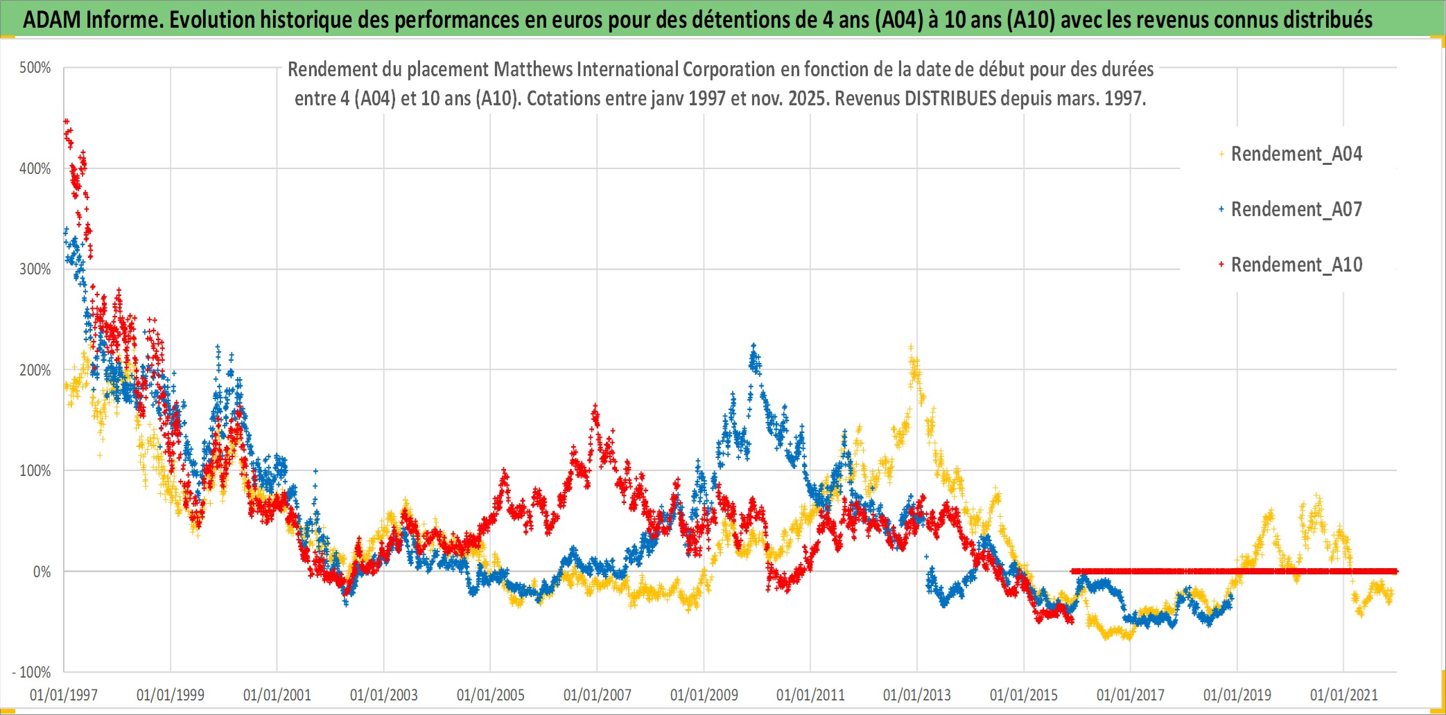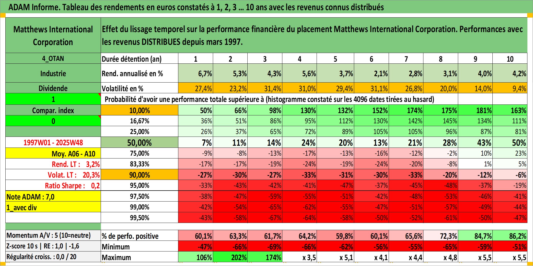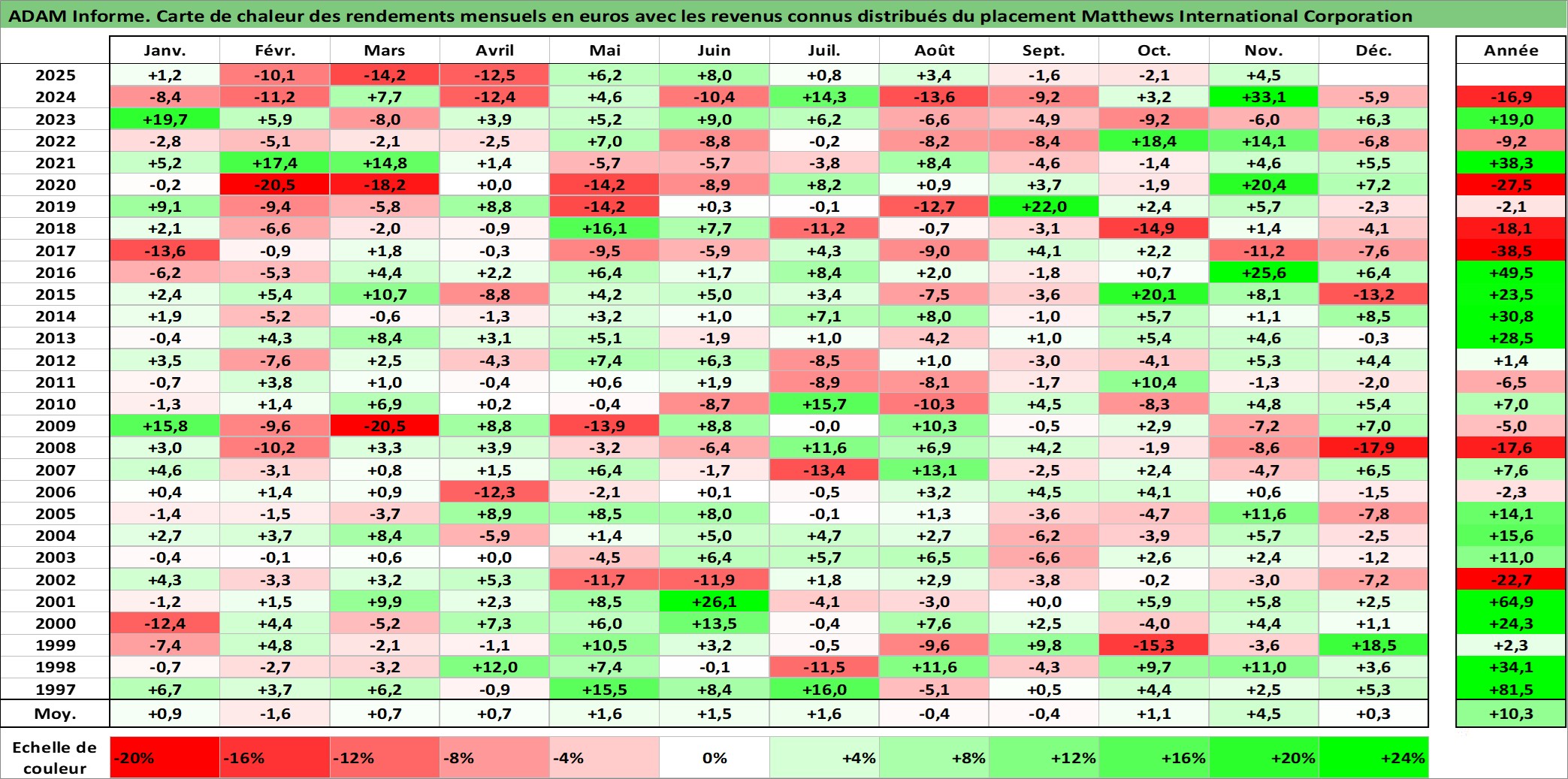 Site dédié aux investisseursPage dédiée sur site financeAnalyse des valorisations hebdomadaires de l'action Matthews International Corporation. Cet actif est cote en USD. Les valorisations sont en contrevaleur EURO et couvrent les semaines 1997W01 a 2025W48. Les revenus de cet actif financier sont pris en compte depuis la semaine 1997W13. La note ESG de cet actif n'est pas connue.