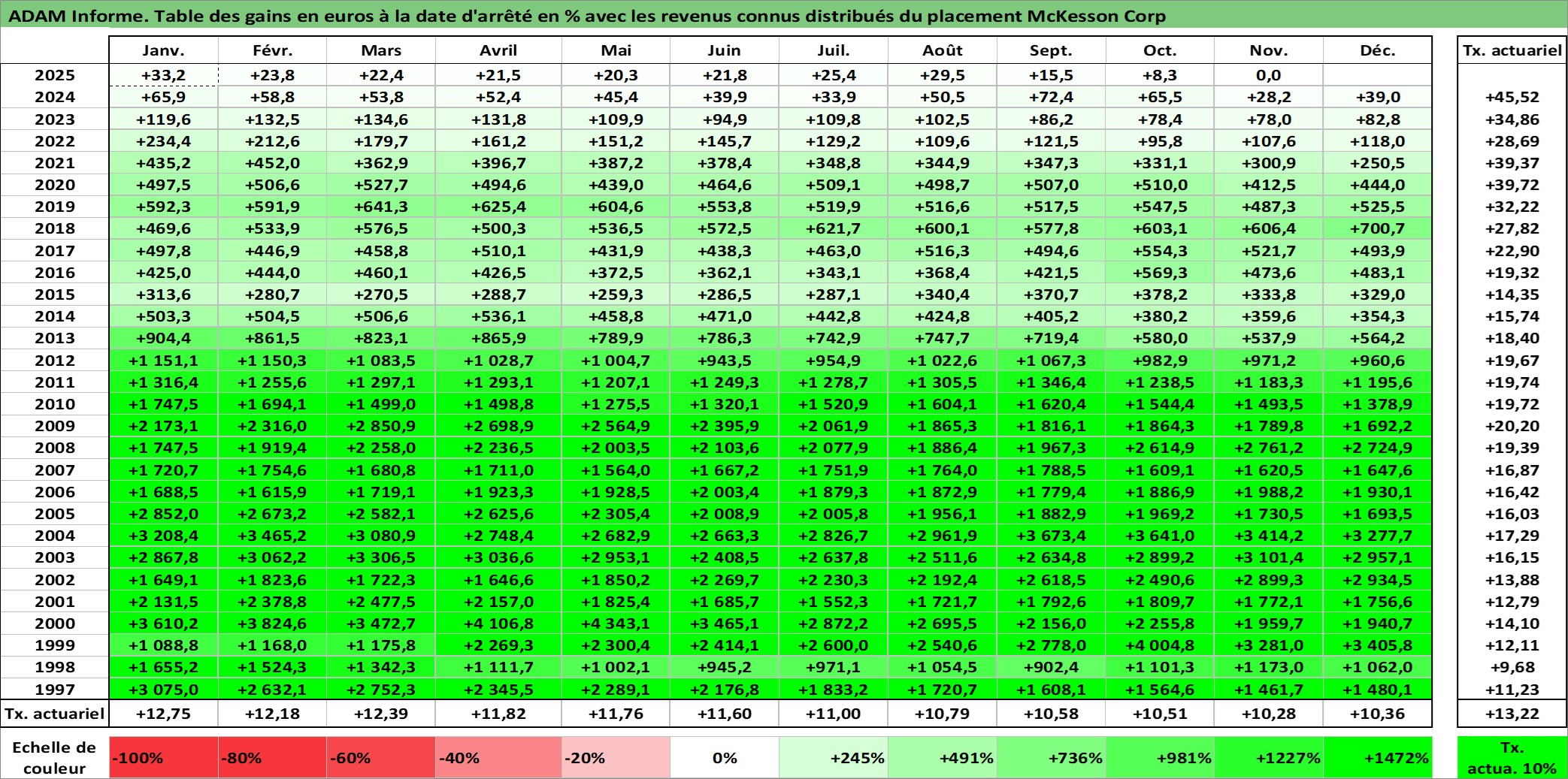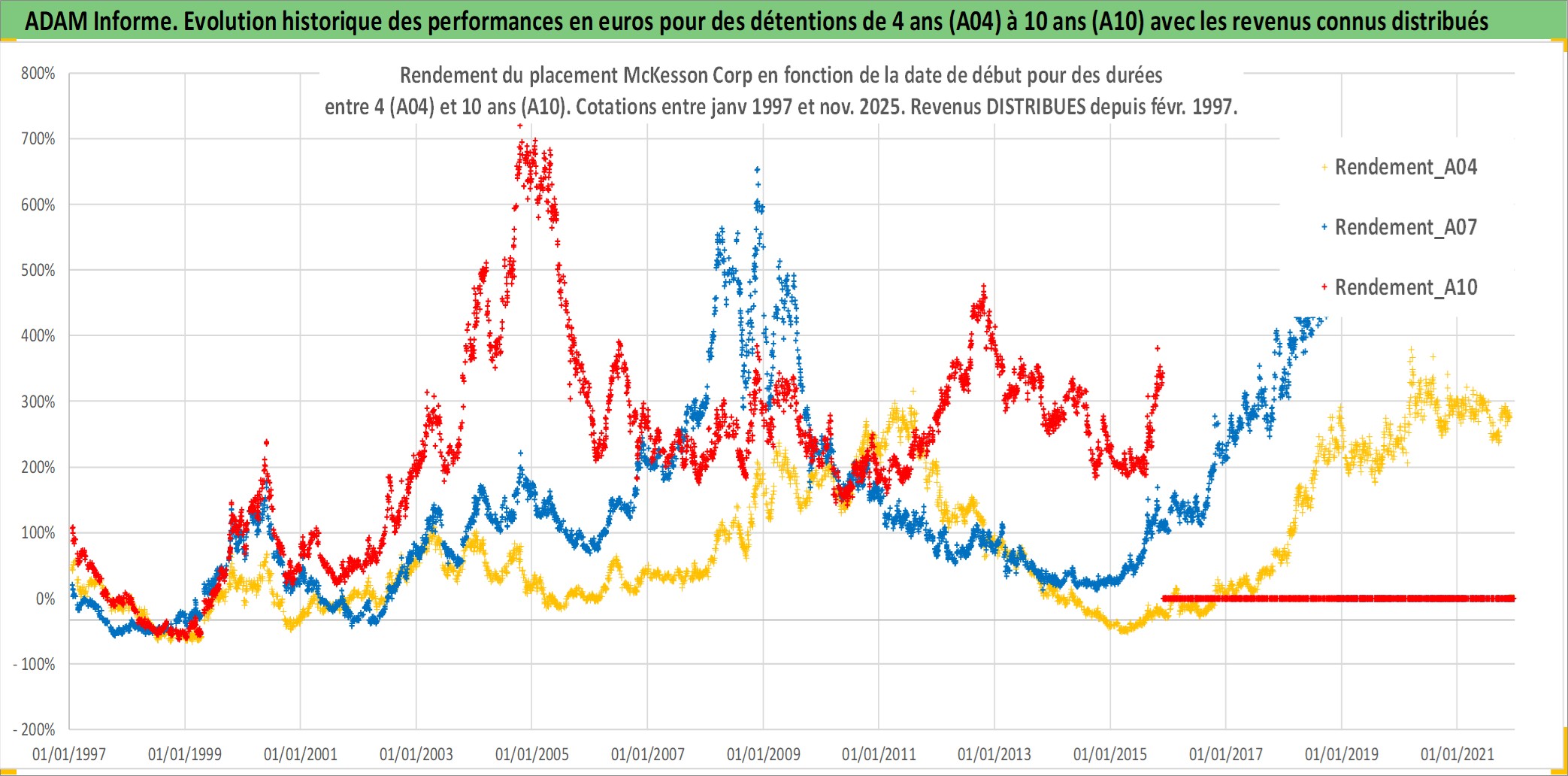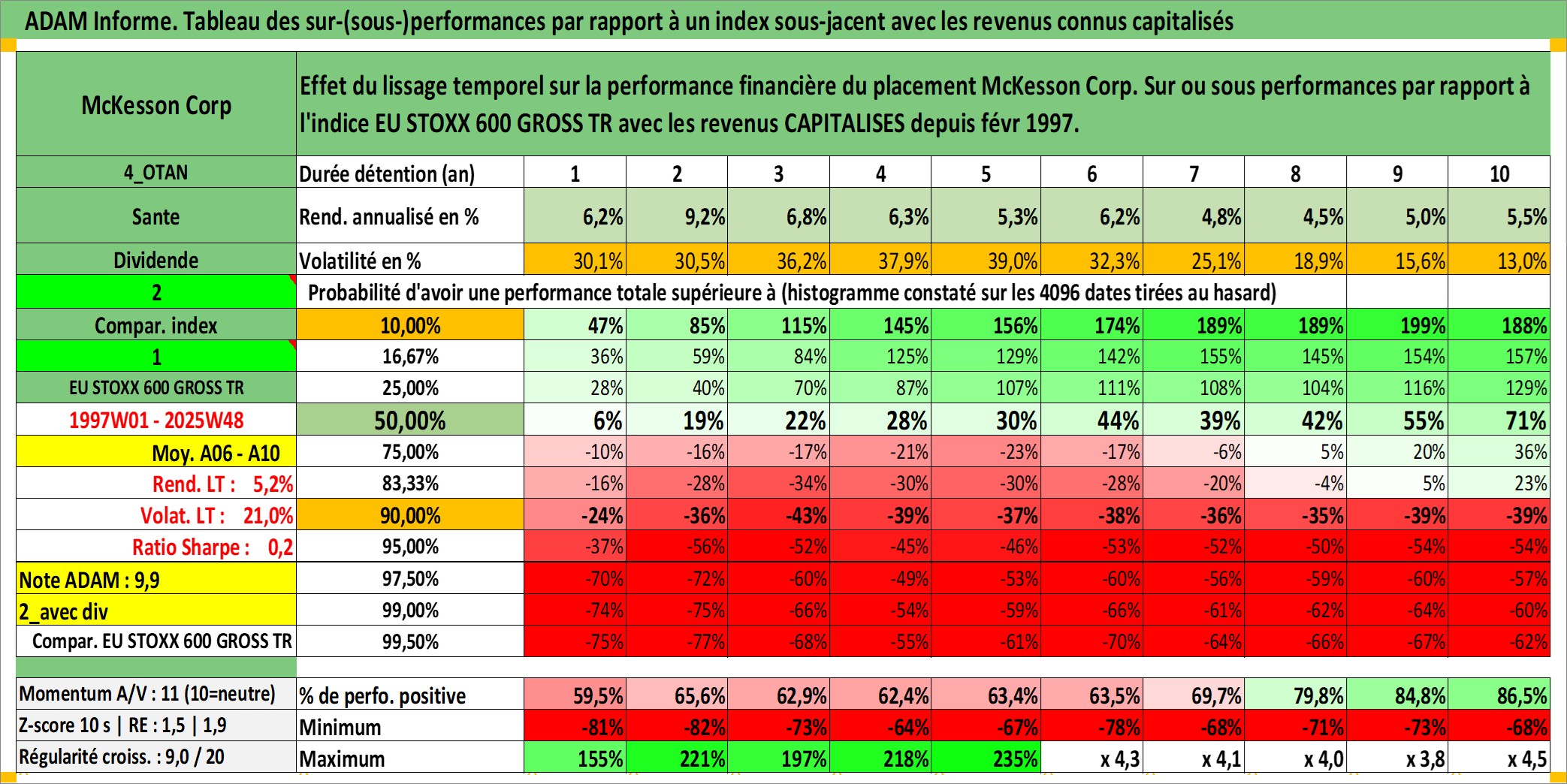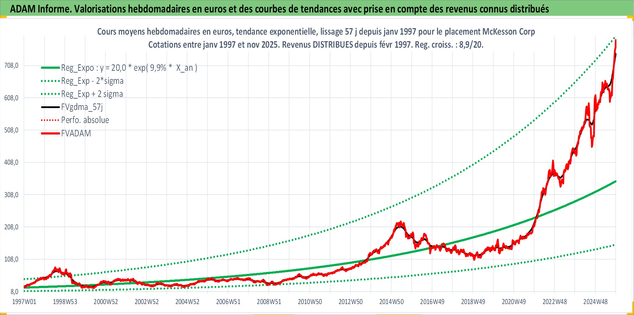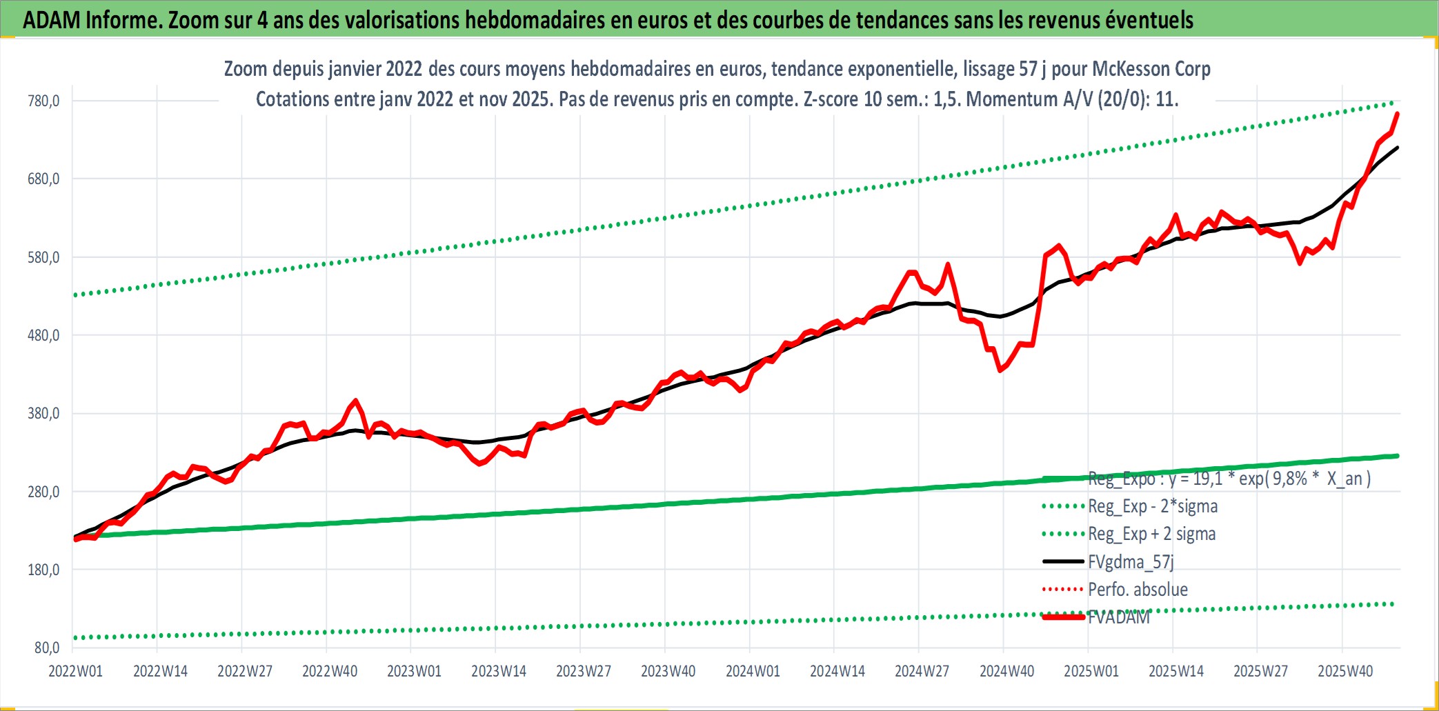 Site dédié aux investisseursPage dédiée sur site financeAnalyse des valorisations hebdomadaires de l'action McKesson Corp. Cet actif est cote en USD. Les valorisations sont en contrevaleur EURO et couvrent les semaines 1997W01 a 2025W48. Les revenus de cet actif financier sont pris en compte depuis la semaine 1997W09. La note globale ESG de cet actif est estimee a 13.0 (apres rebasage entre 0 et 20).