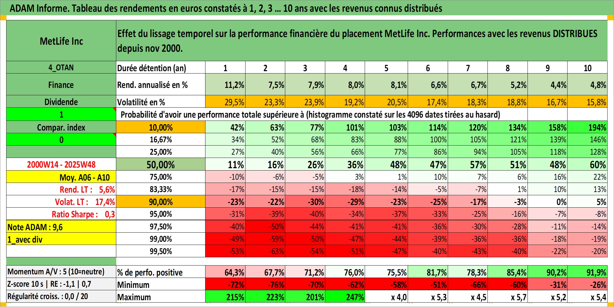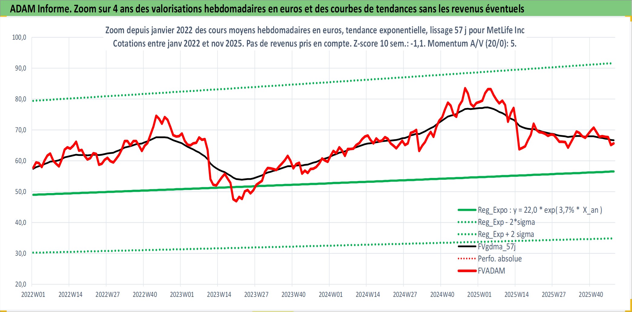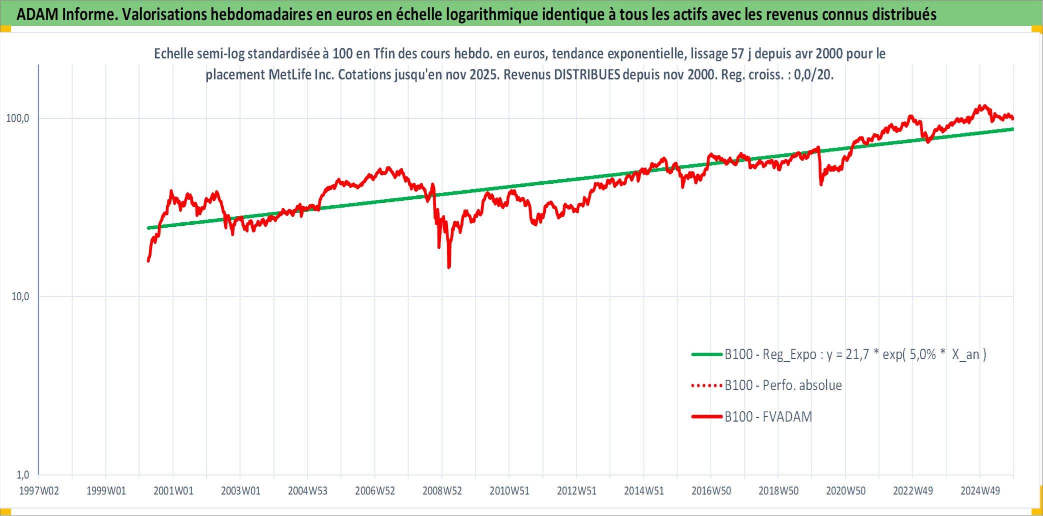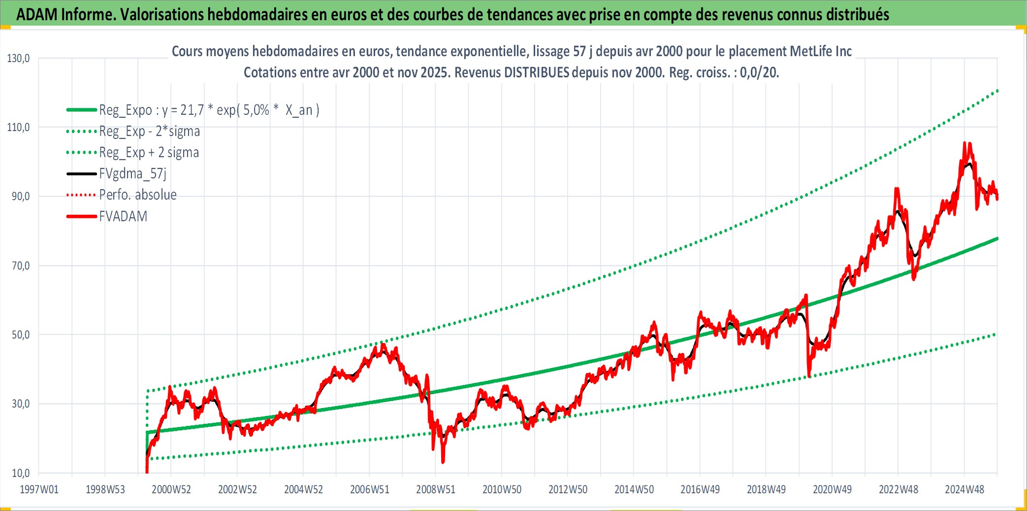 Site dédié aux investisseursPage dédiée sur site financeAnalyse des valorisations hebdomadaires de l'action MetLife Inc. Cet actif est cote en USD. Les valorisations sont en contrevaleur EURO et couvrent les semaines 2000W14 a 2025W48. Les revenus de cet actif financier sont pris en compte depuis la semaine 2000W44. La note globale ESG de cet actif est estimee a 13.0 (apres rebasage entre 0 et 20).