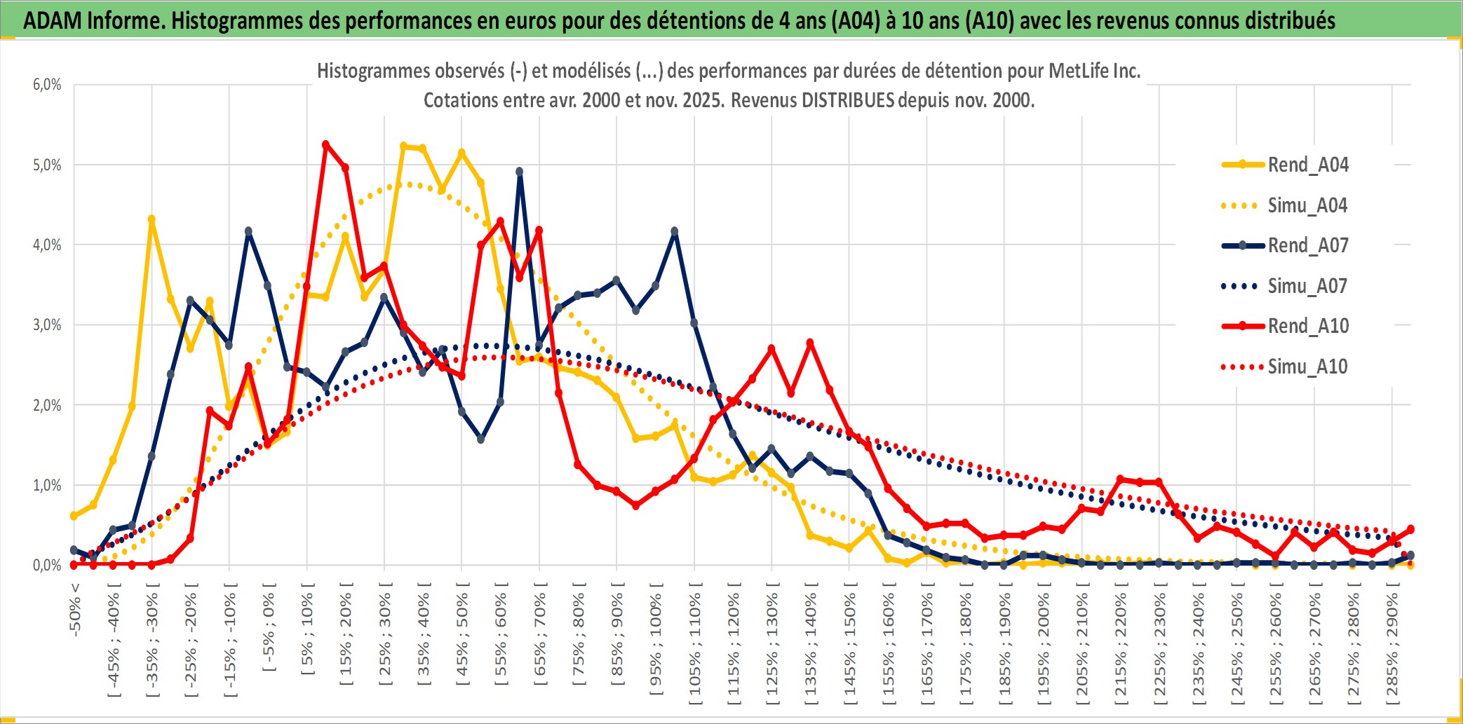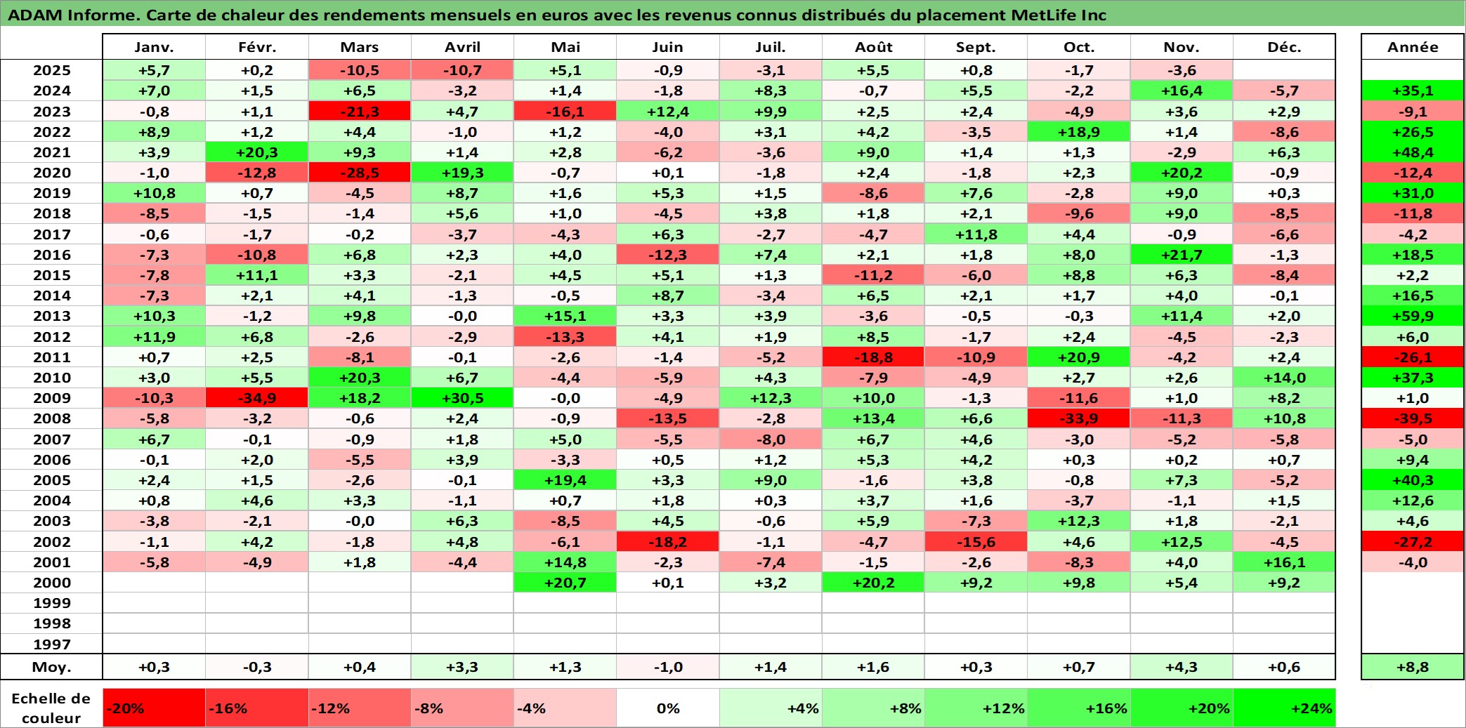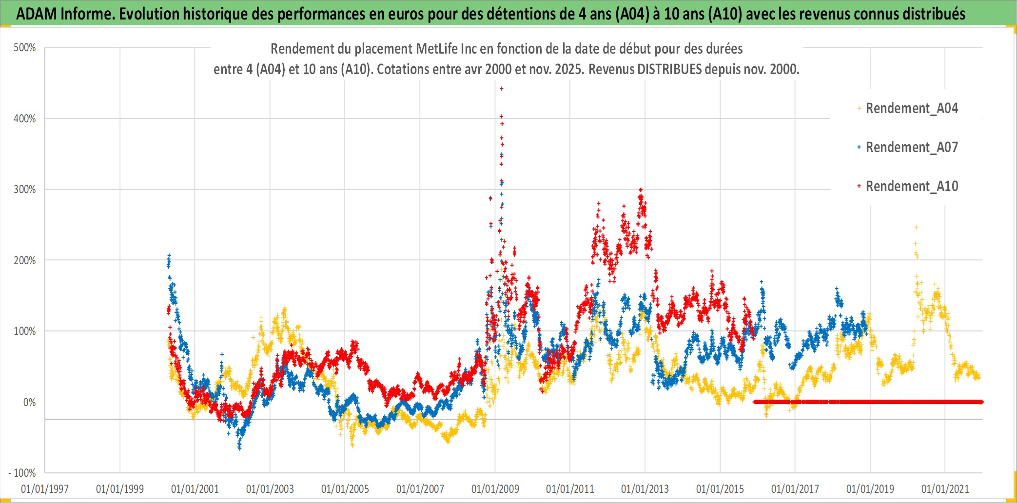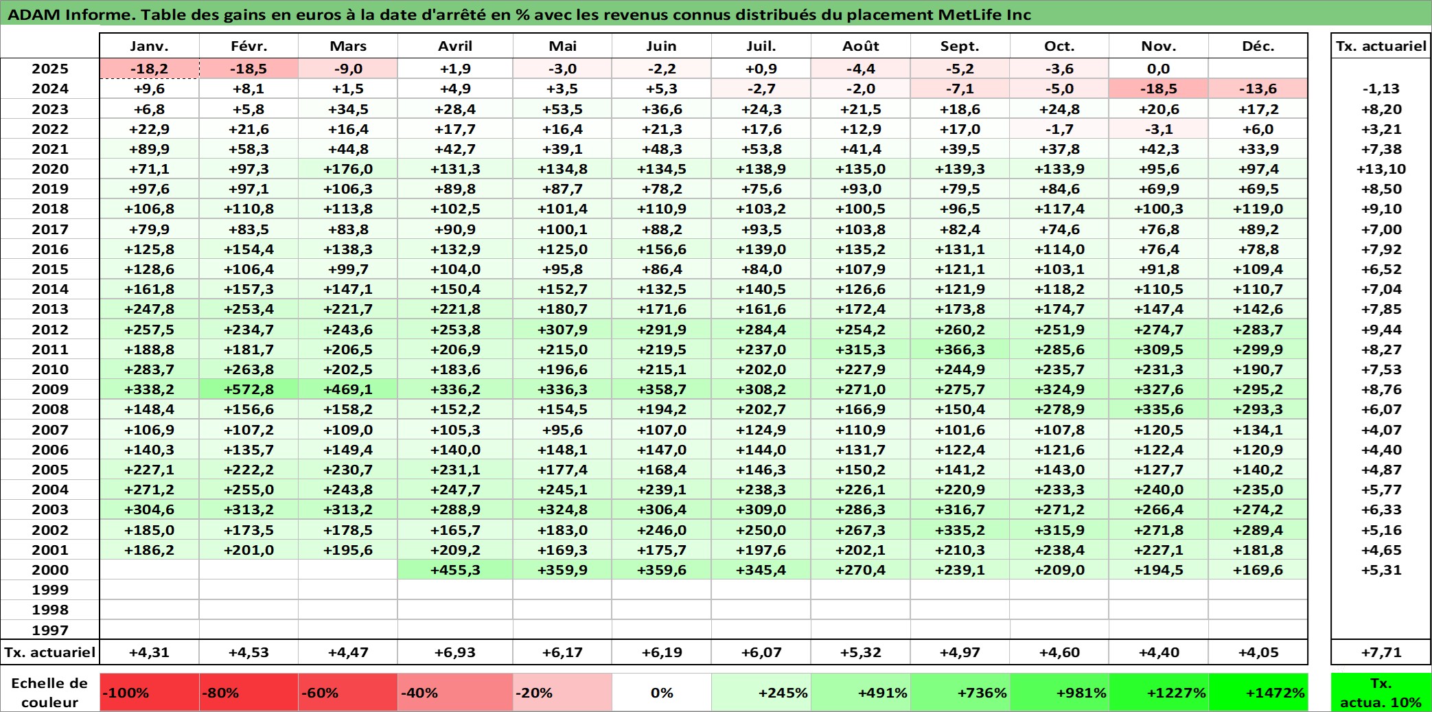 Site dédié aux investisseursPage dédiée sur site financeAnalyse des valorisations hebdomadaires de l'action MetLife Inc. Cet actif est cote en USD. Les valorisations sont en contrevaleur EURO et couvrent les semaines 2000W14 a 2025W48. Les revenus de cet actif financier sont pris en compte depuis la semaine 2000W44. La note globale ESG de cet actif est estimee a 13.0 (apres rebasage entre 0 et 20).