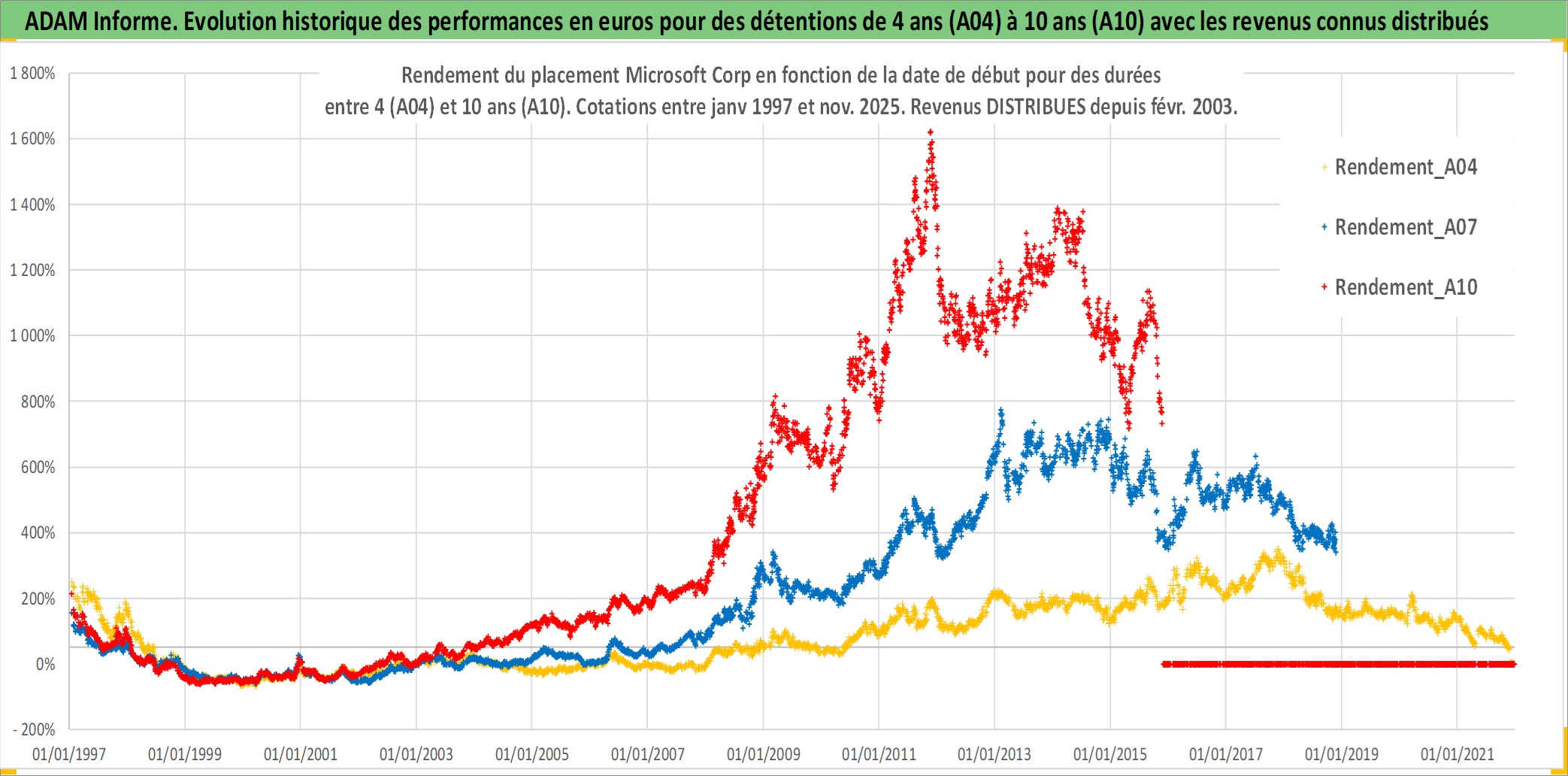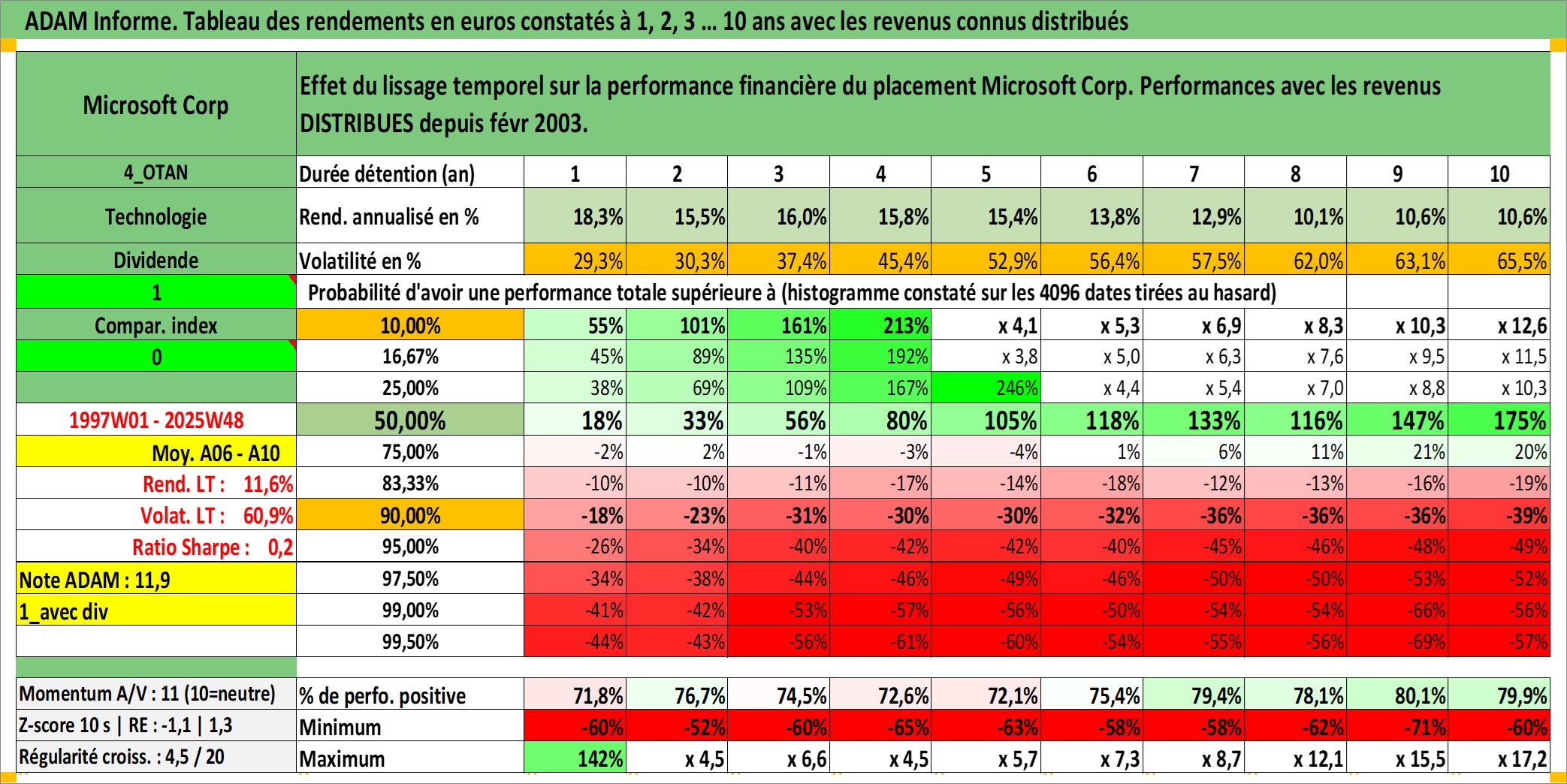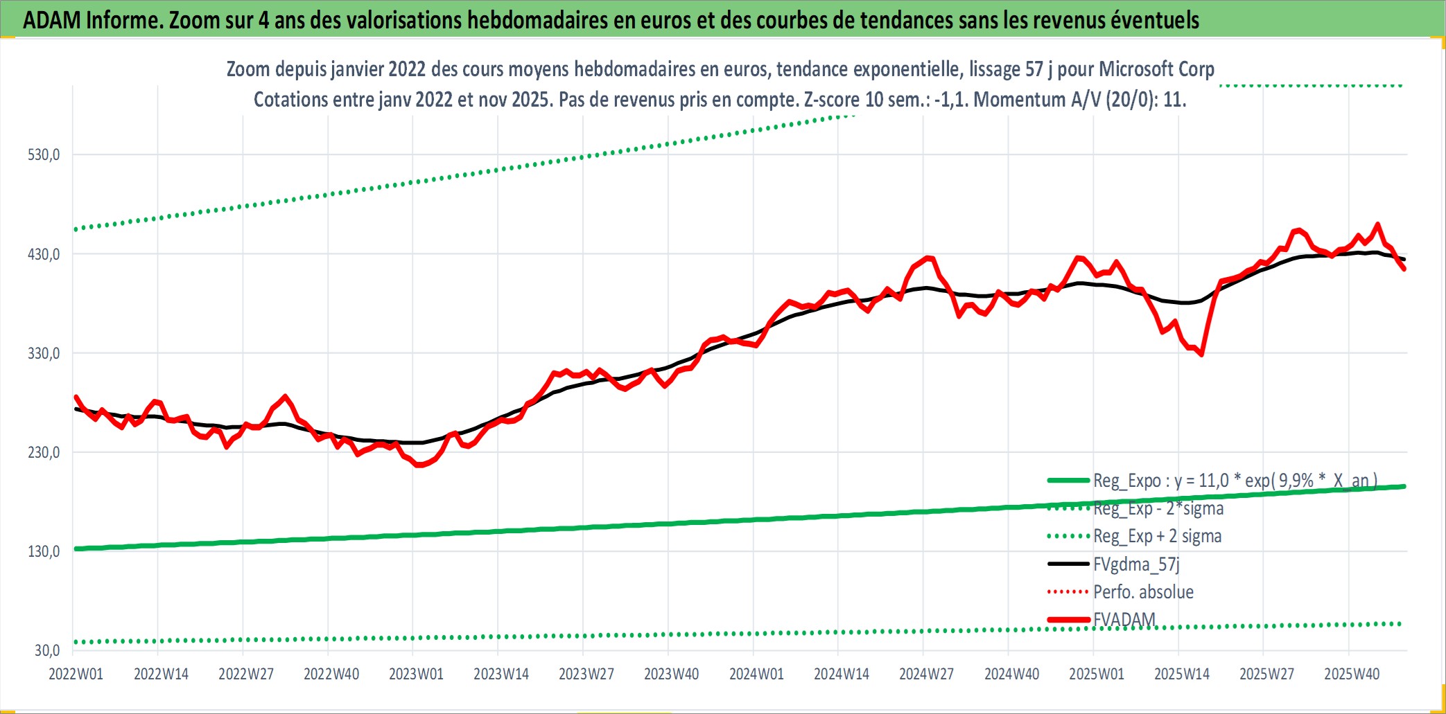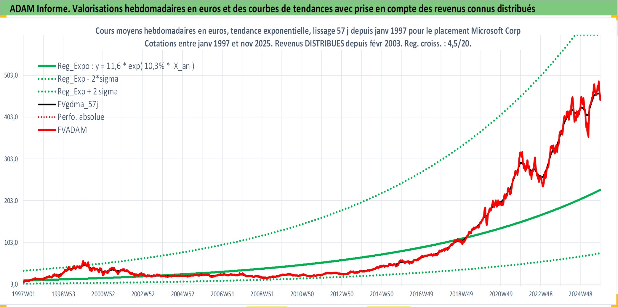 Site dédié aux investisseursPage dédiée sur site financeAnalyse des valorisations hebdomadaires de l'action Microsoft Corp. Cet actif est cote en USD. Les valorisations sont en contrevaleur EURO et couvrent les semaines 1997W01 a 2025W48. Les revenus de cet actif financier sont pris en compte depuis la semaine 2003W08. La note globale ESG de cet actif est estimee a 13.0 (apres rebasage entre 0 et 20).