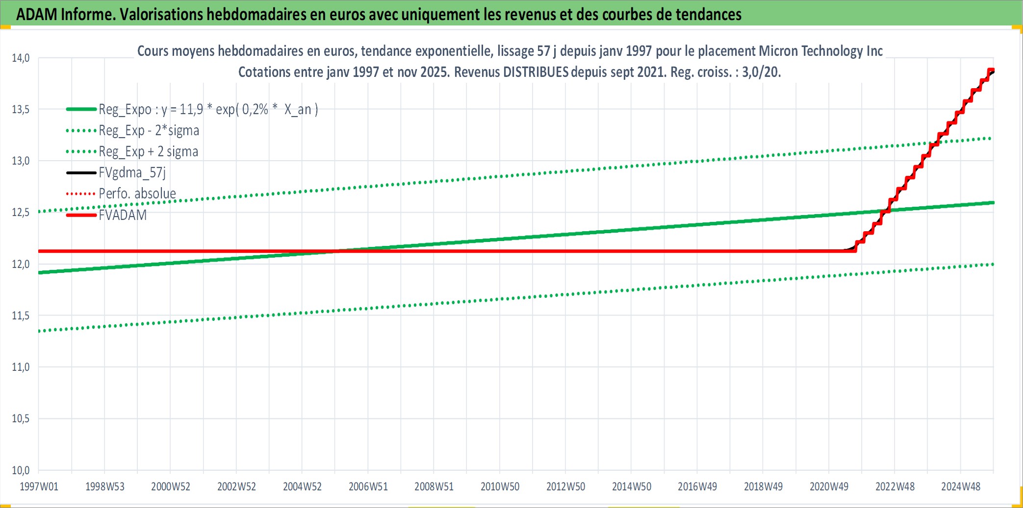 Site dédié aux investisseursPage dédiée sur site financeAnalyse des valorisations hebdomadaires de l'action Micron Technology Inc. Cet actif est cote en USD. Les valorisations sont en contrevaleur EURO et couvrent les semaines 1997W01 a 2025W48. Les revenus de cet actif financier sont pris en compte depuis la semaine 2021W39. La note globale ESG de cet actif est estimee a 12.0 (apres rebasage entre 0 et 20).