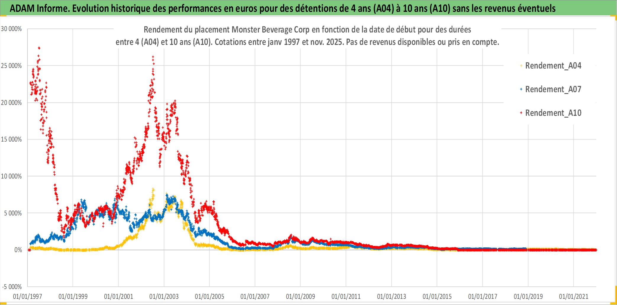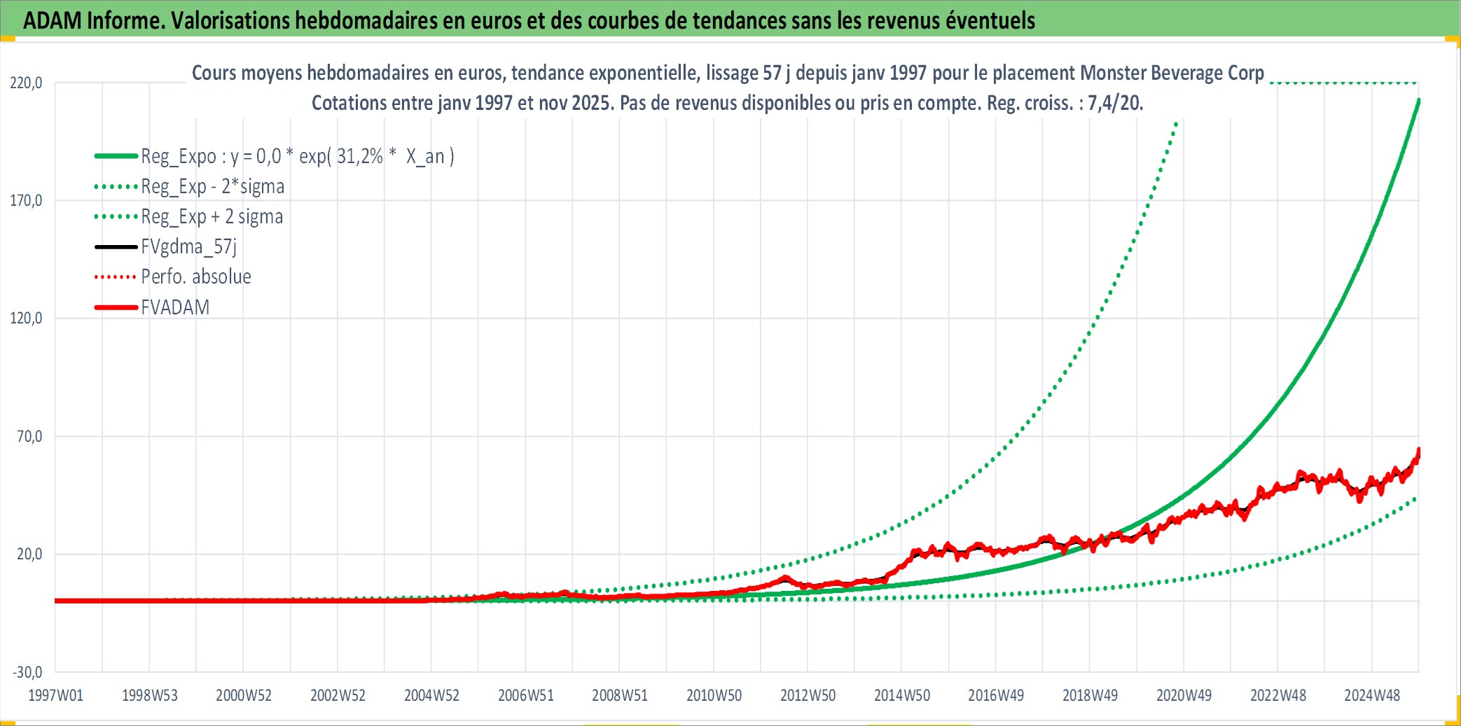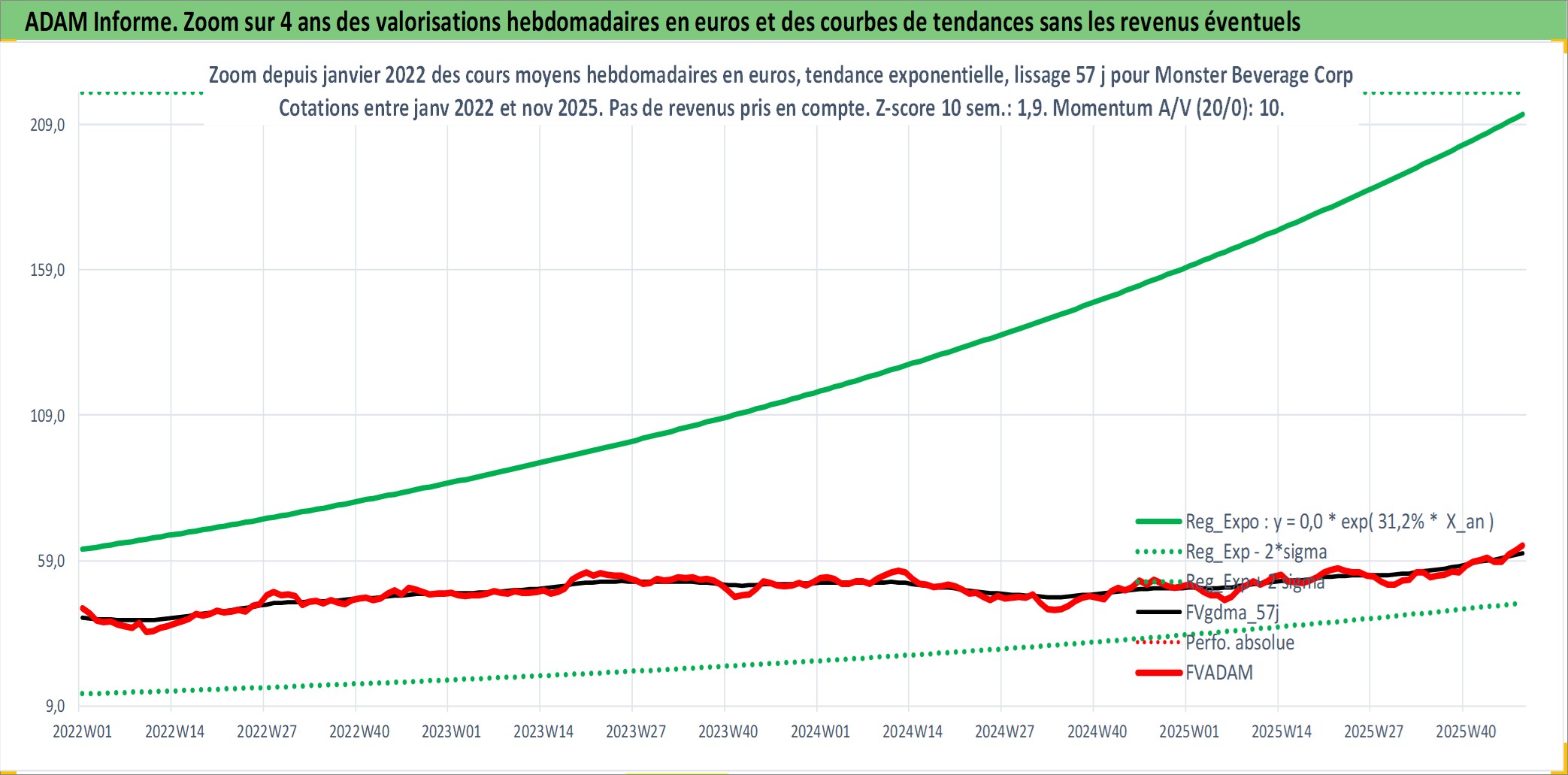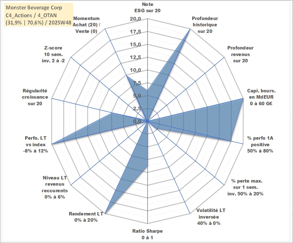 Site dédié aux investisseursPage dédiée sur site financeAnalyse des valorisations hebdomadaires de l'action Monster Beverage Corp. Cet actif est cote en USD. Les valorisations sont en contrevaleur EURO et couvrent les semaines 1997W01 a 2025W48. Les revenus de cet actif financier ne sont pas connus car non existants ou non disponibles sur le site Yahoo Finance. La note globale ESG de cet actif est estimee a 6.0 (apres rebasage entre 0 et 20).
