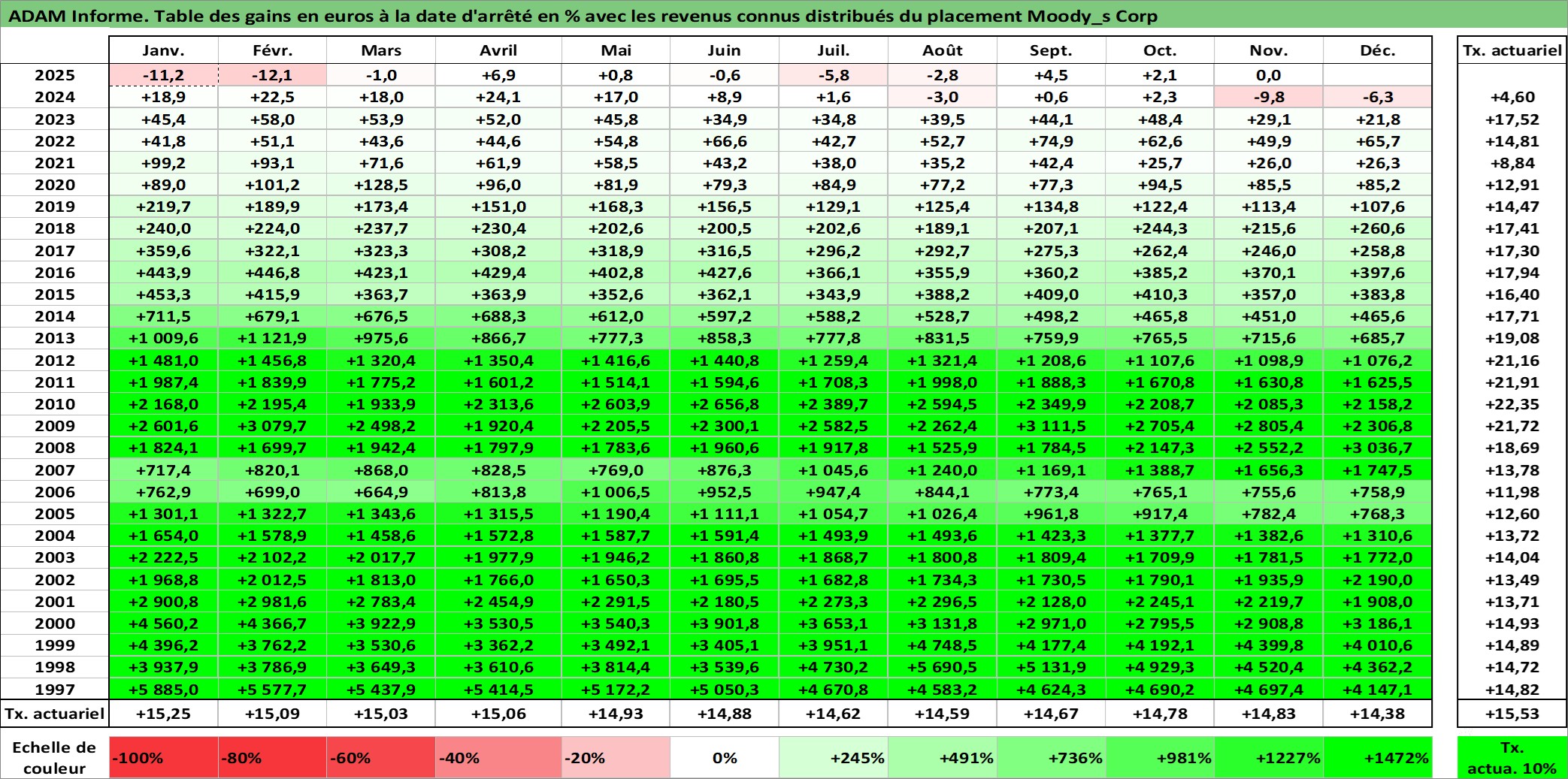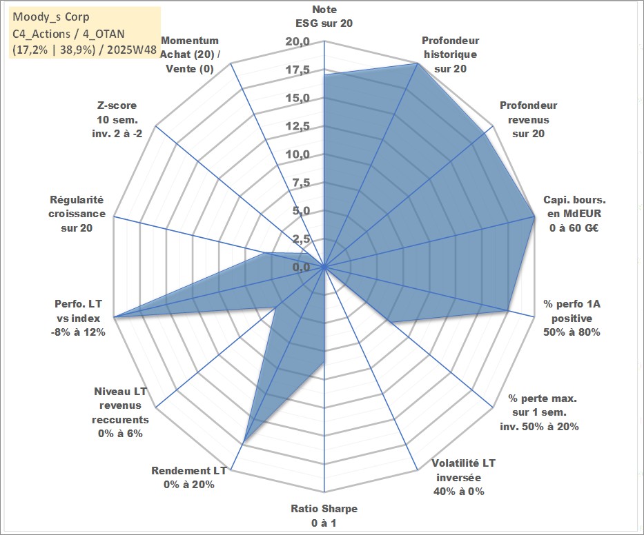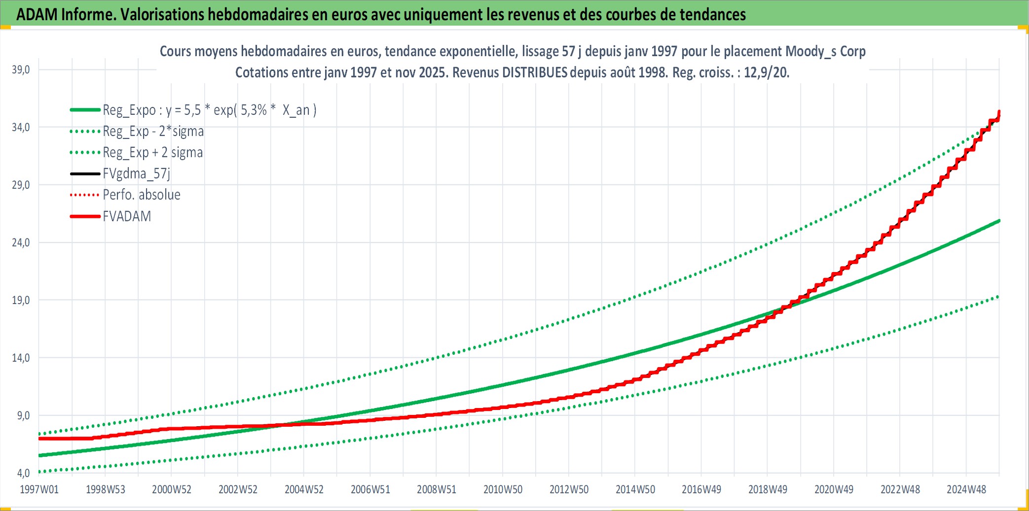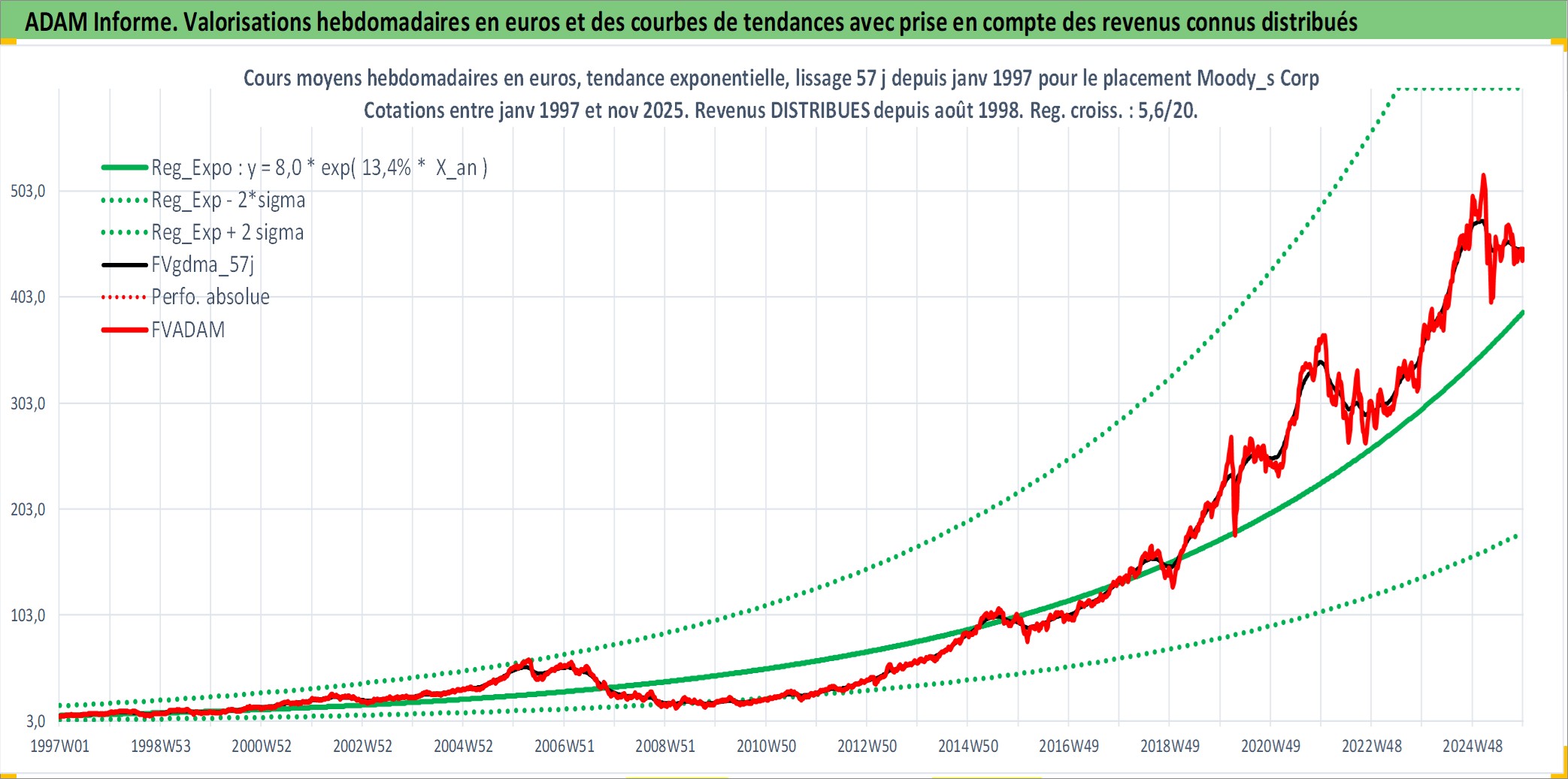 Site dédié aux investisseursPage dédiée sur site financeAnalyse des valorisations hebdomadaires de l'action Moody_s Corp. Cet actif est cote en USD. Les valorisations sont en contrevaleur EURO et couvrent les semaines 1997W01 a 2025W48. Les revenus de cet actif financier sont pris en compte depuis la semaine 1998W34. La note globale ESG de cet actif est estimee a 17.0 (apres rebasage entre 0 et 20).