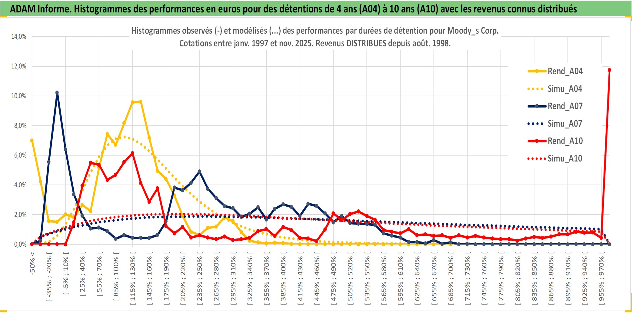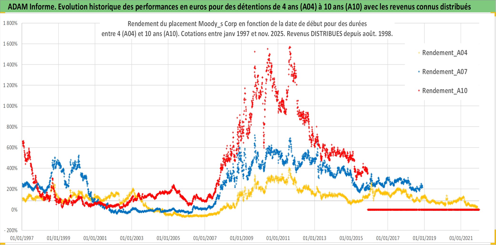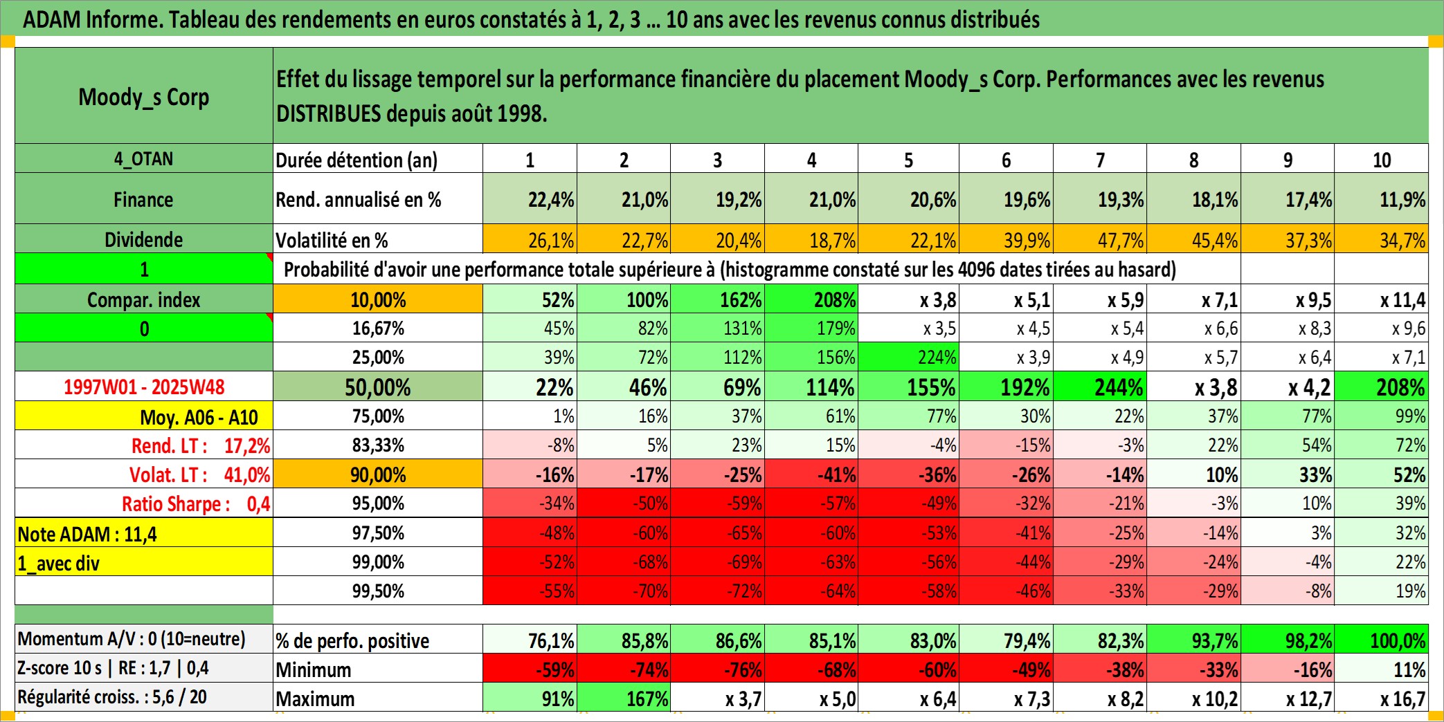 Site dédié aux investisseursPage dédiée sur site financeAnalyse des valorisations hebdomadaires de l'action Moody_s Corp. Cet actif est cote en USD. Les valorisations sont en contrevaleur EURO et couvrent les semaines 1997W01 a 2025W48. Les revenus de cet actif financier sont pris en compte depuis la semaine 1998W34. La note globale ESG de cet actif est estimee a 17.0 (apres rebasage entre 0 et 20).