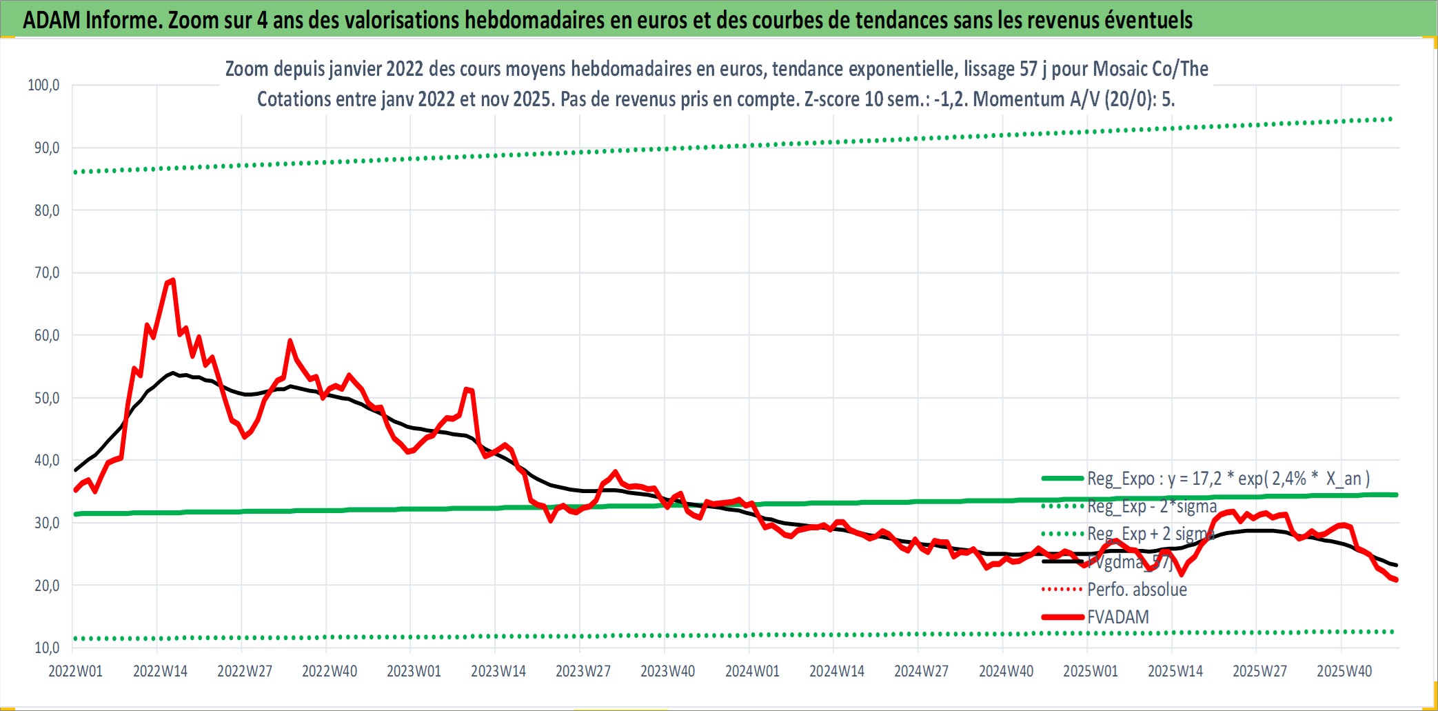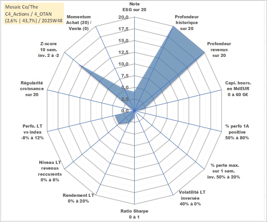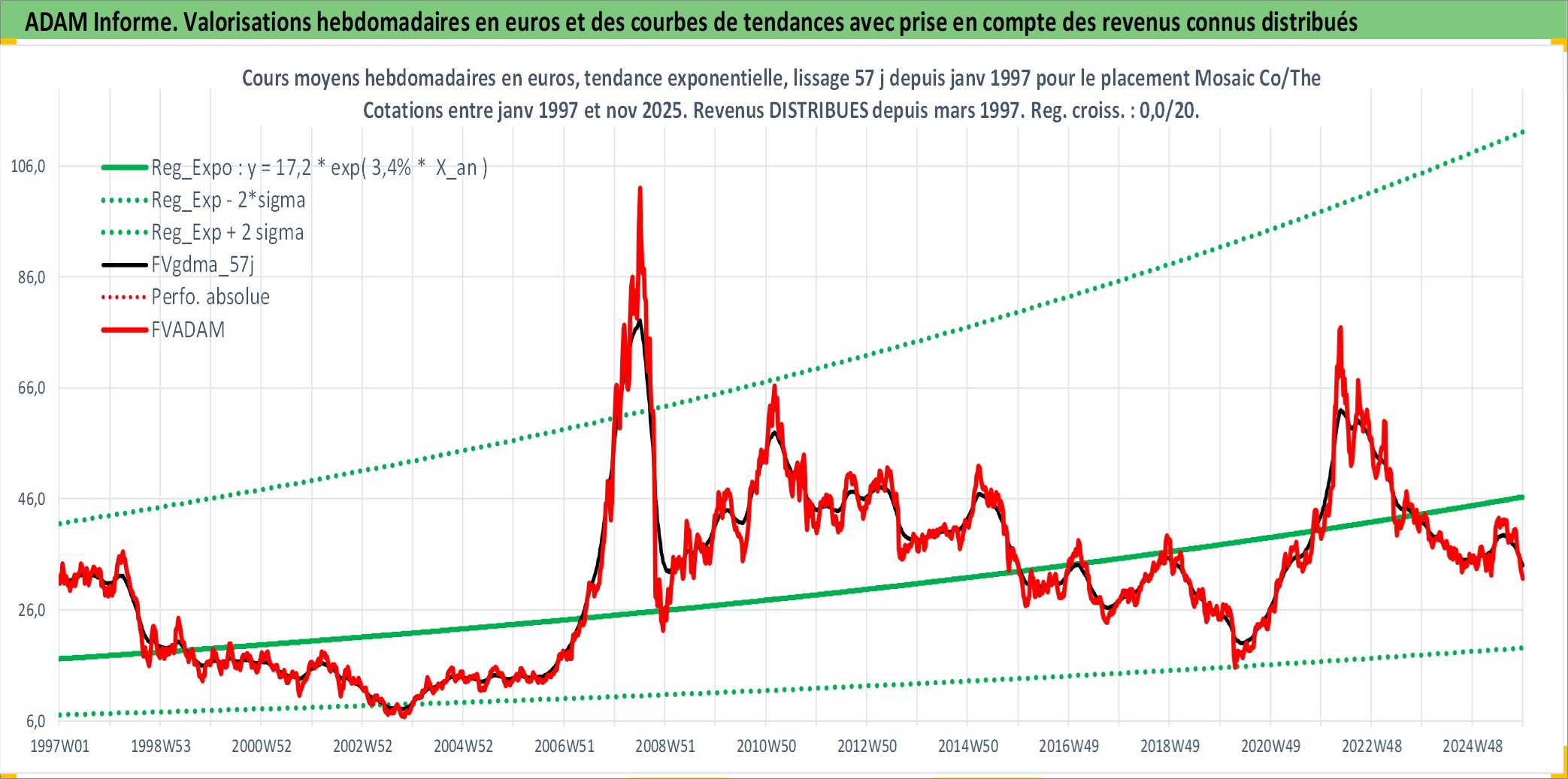 Site dédié aux investisseursPage dédiée sur site financeAnalyse des valorisations hebdomadaires de l'action Mosaic Co/The. Cet actif est cote en USD. Les valorisations sont en contrevaleur EURO et couvrent les semaines 1997W01 a 2025W48. Les revenus de cet actif financier sont pris en compte depuis la semaine 1997W11. La note globale ESG de cet actif est estimee a 4.0 (apres rebasage entre 0 et 20).