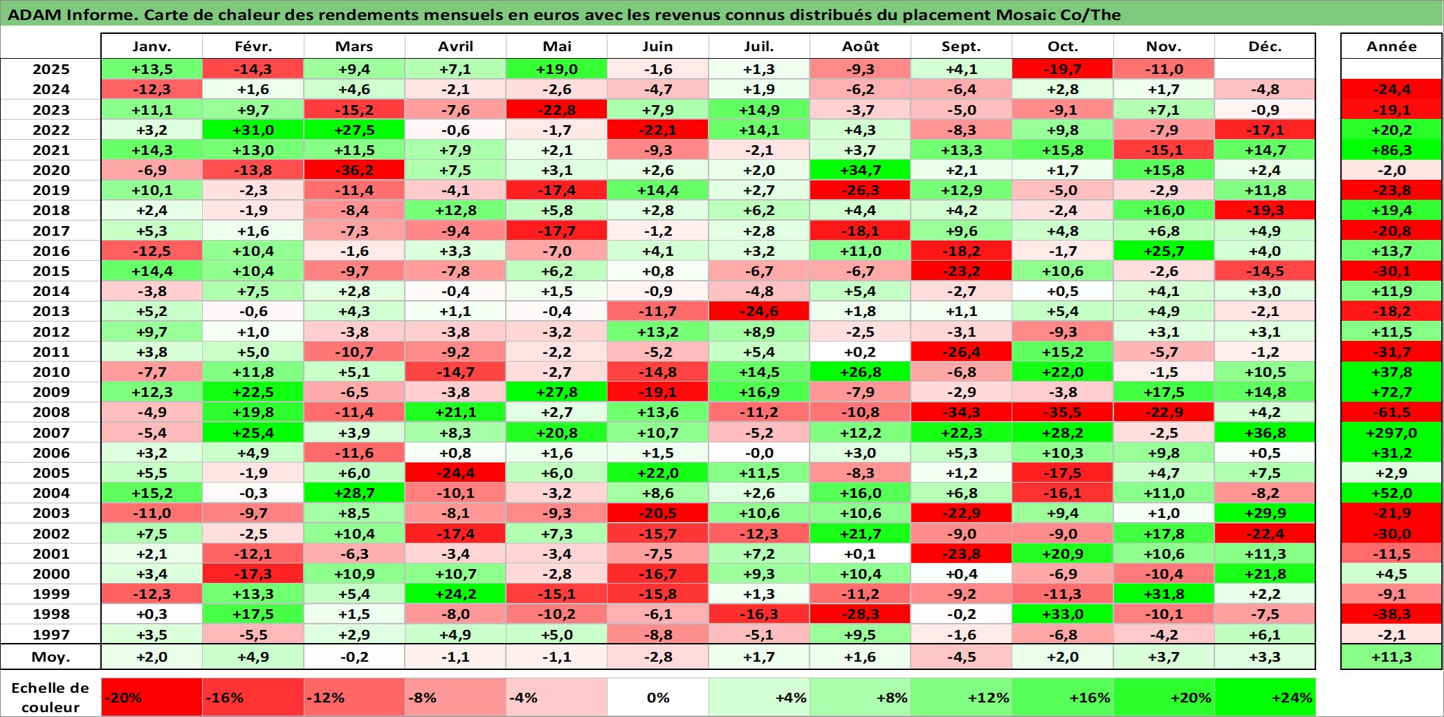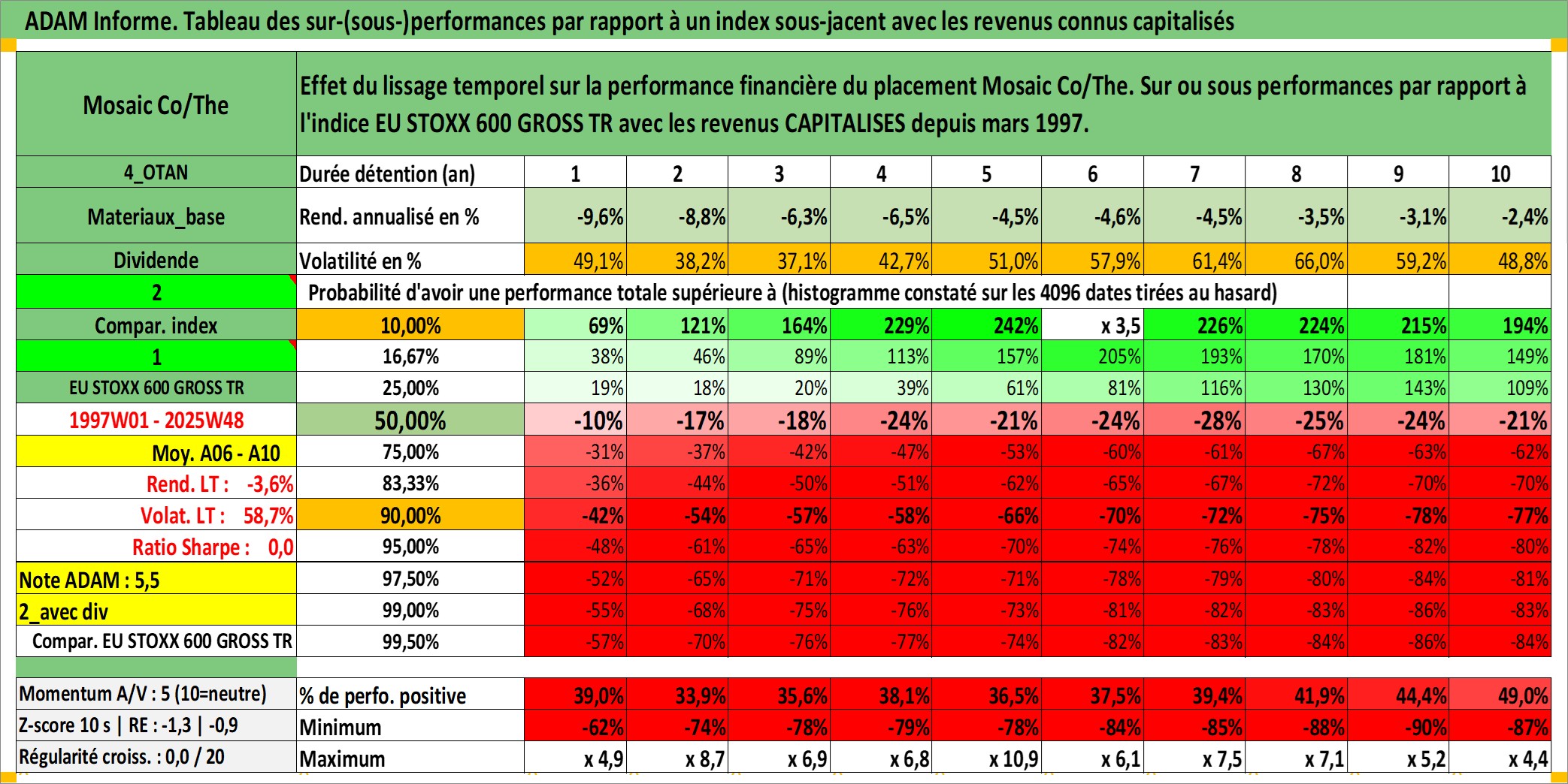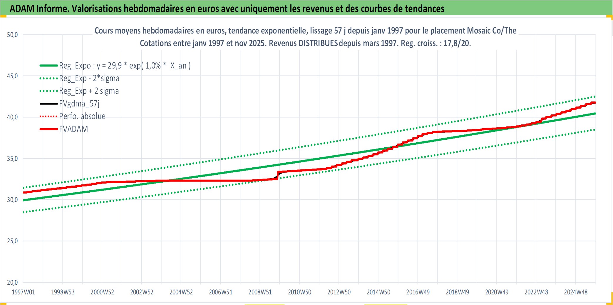 Site dédié aux investisseursPage dédiée sur site financeAnalyse des valorisations hebdomadaires de l'action Mosaic Co/The. Cet actif est cote en USD. Les valorisations sont en contrevaleur EURO et couvrent les semaines 1997W01 a 2025W48. Les revenus de cet actif financier sont pris en compte depuis la semaine 1997W11. La note globale ESG de cet actif est estimee a 4.0 (apres rebasage entre 0 et 20).