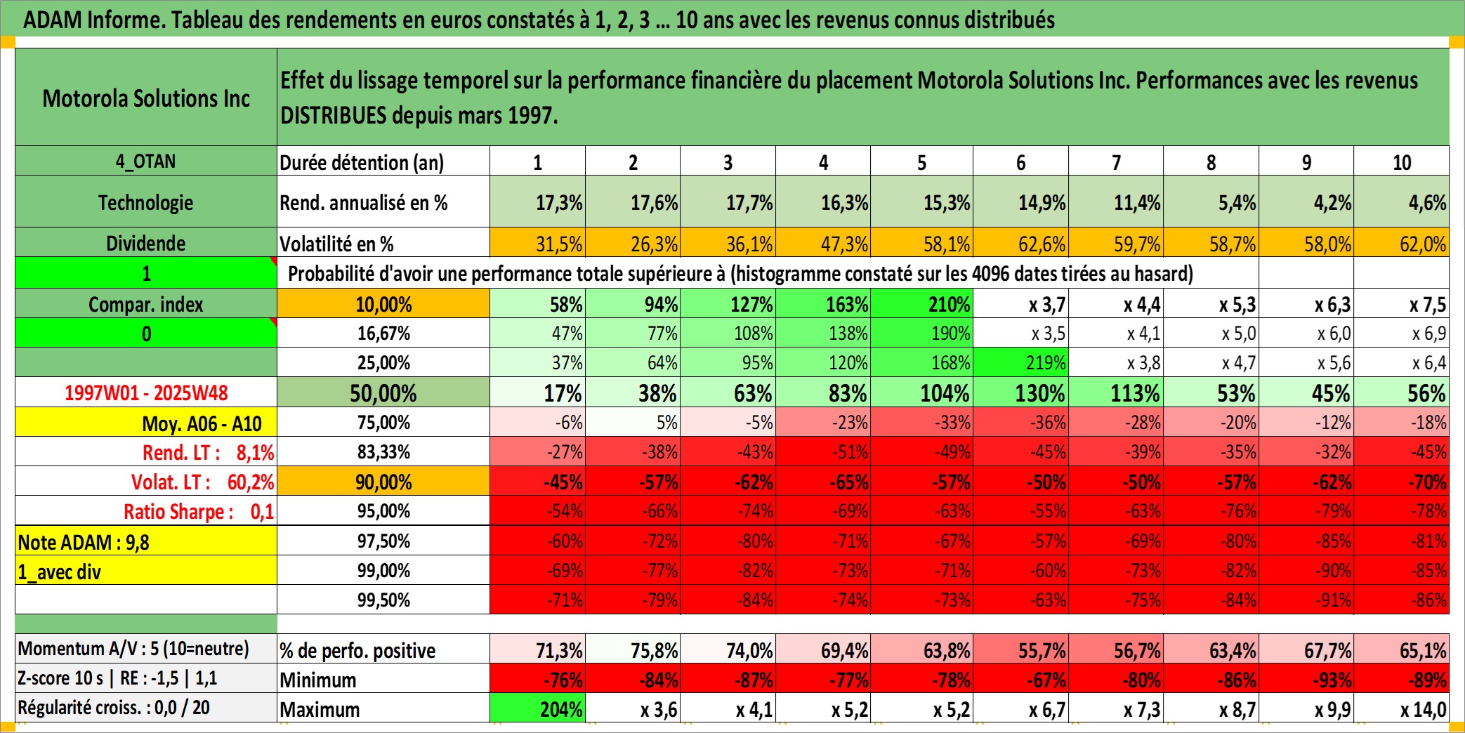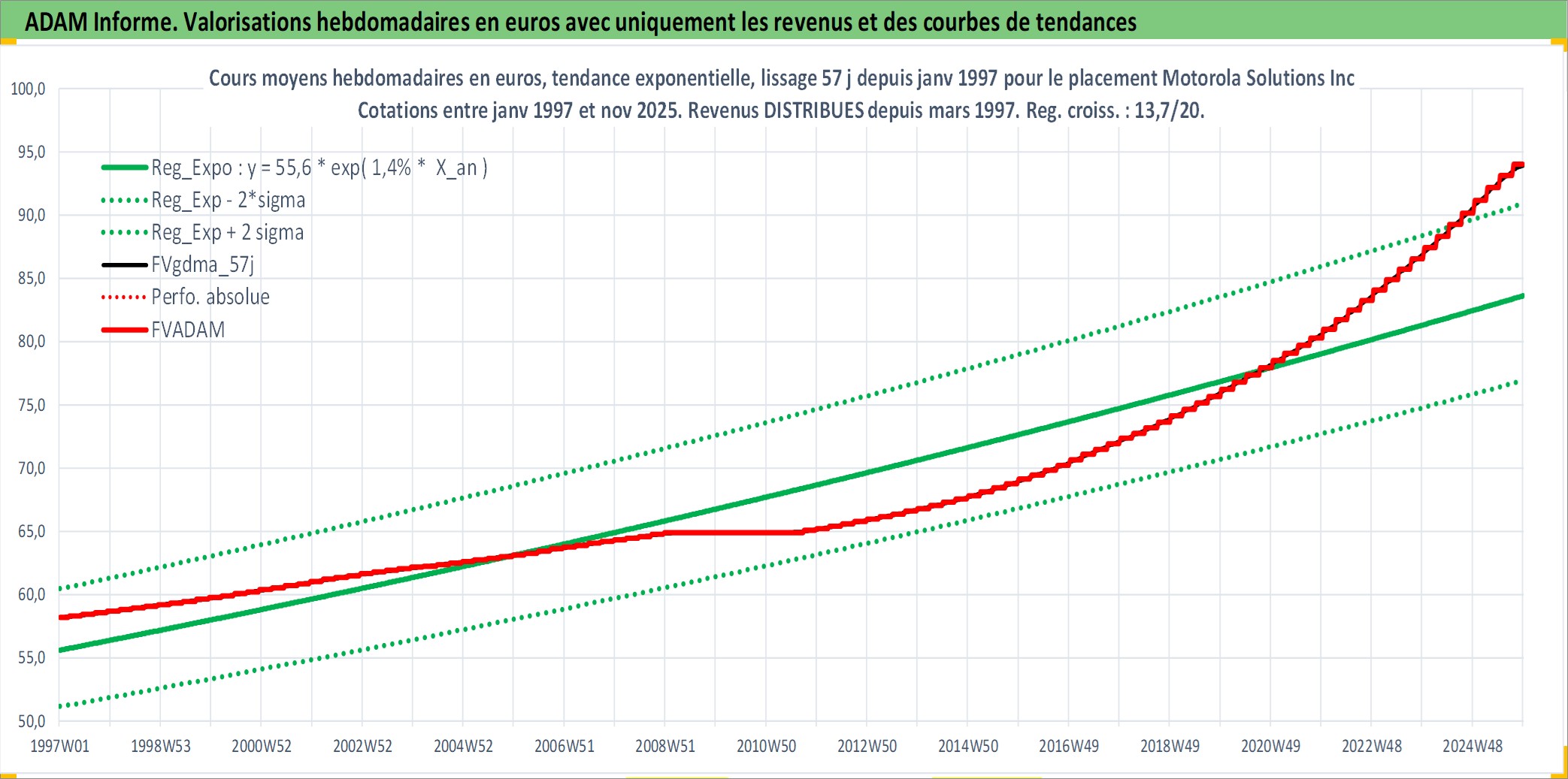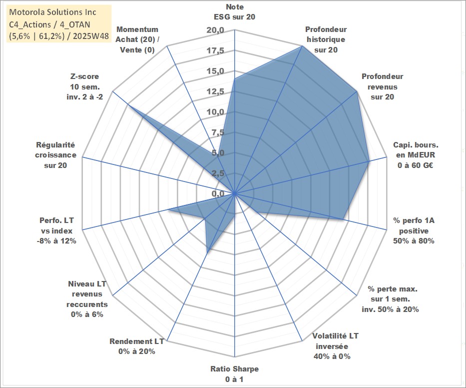 Site dédié aux investisseursPage dédiée sur site financeAnalyse des valorisations hebdomadaires de l'action Motorola Solutions Inc. Cet actif est cote en USD. Les valorisations sont en contrevaleur EURO et couvrent les semaines 1997W01 a 2025W48. Les revenus de cet actif financier sont pris en compte depuis la semaine 1997W11. La note globale ESG de cet actif est estimee a 14.0 (apres rebasage entre 0 et 20).