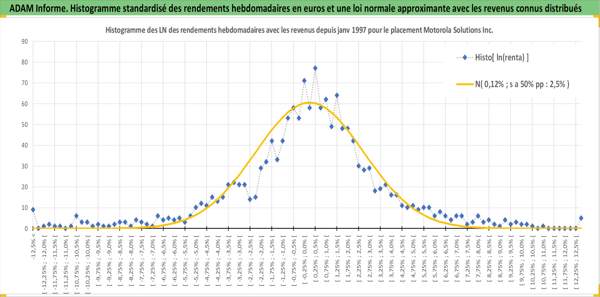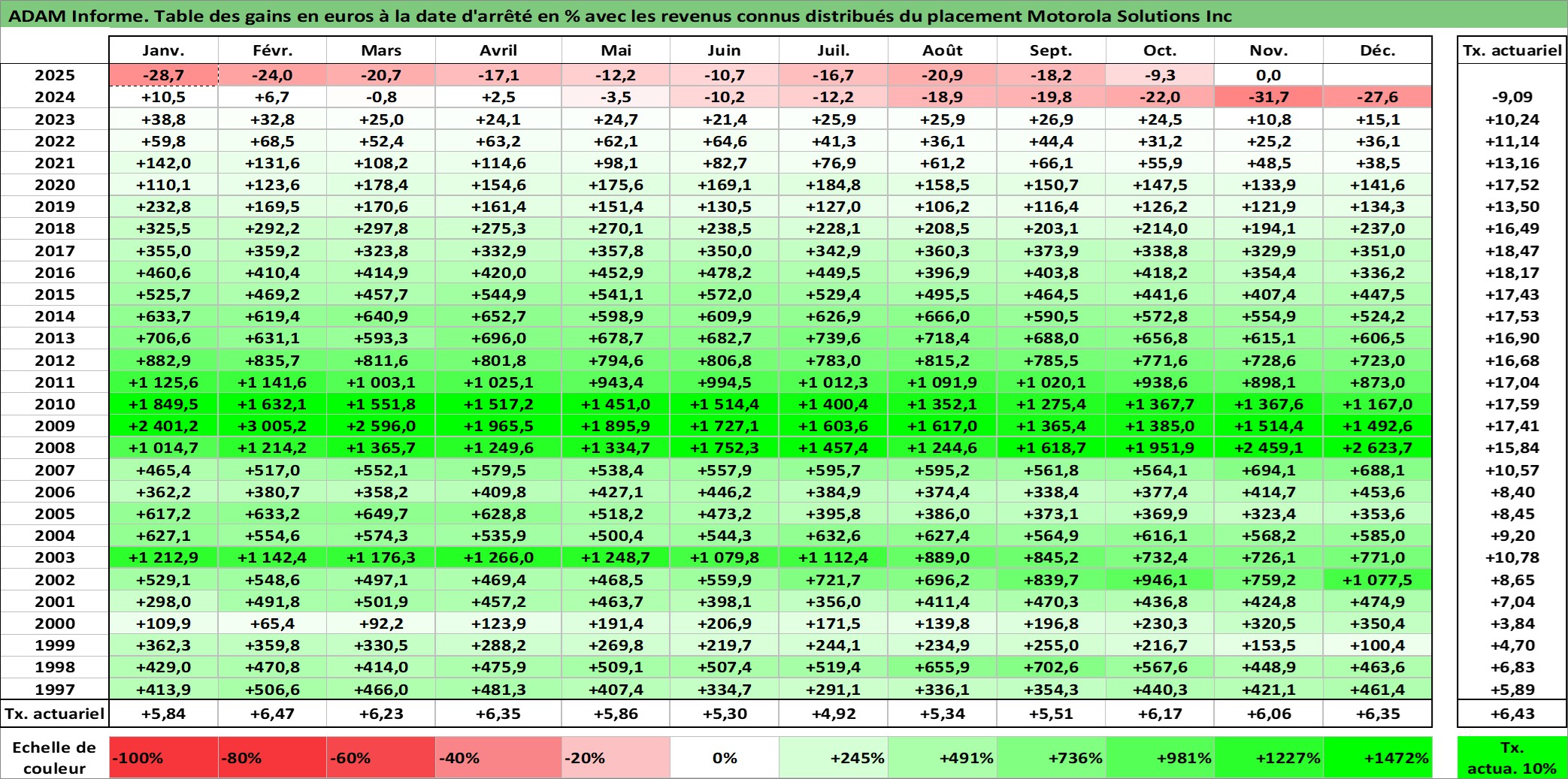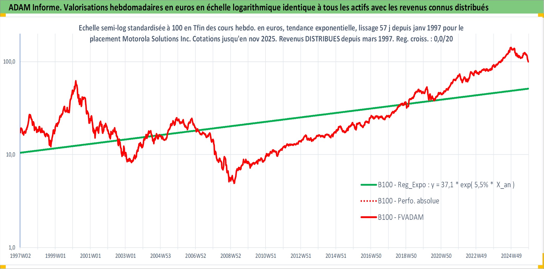 Site dédié aux investisseursPage dédiée sur site financeAnalyse des valorisations hebdomadaires de l'action Motorola Solutions Inc. Cet actif est cote en USD. Les valorisations sont en contrevaleur EURO et couvrent les semaines 1997W01 a 2025W48. Les revenus de cet actif financier sont pris en compte depuis la semaine 1997W11. La note globale ESG de cet actif est estimee a 14.0 (apres rebasage entre 0 et 20).