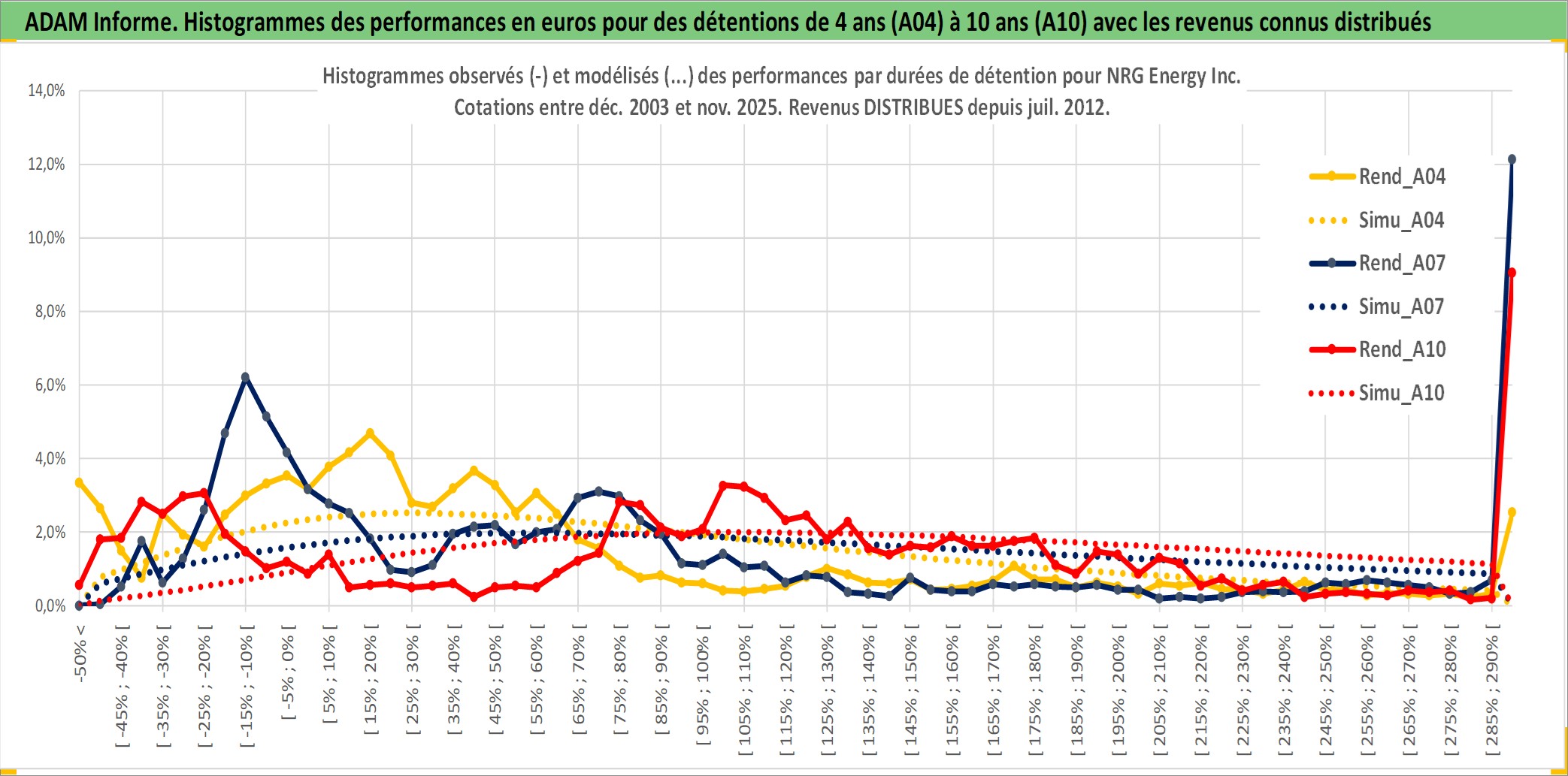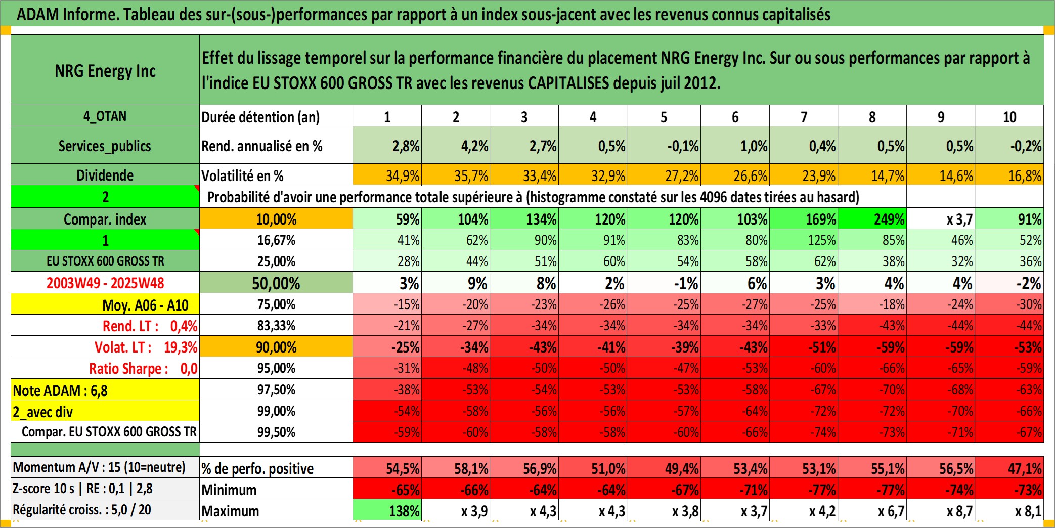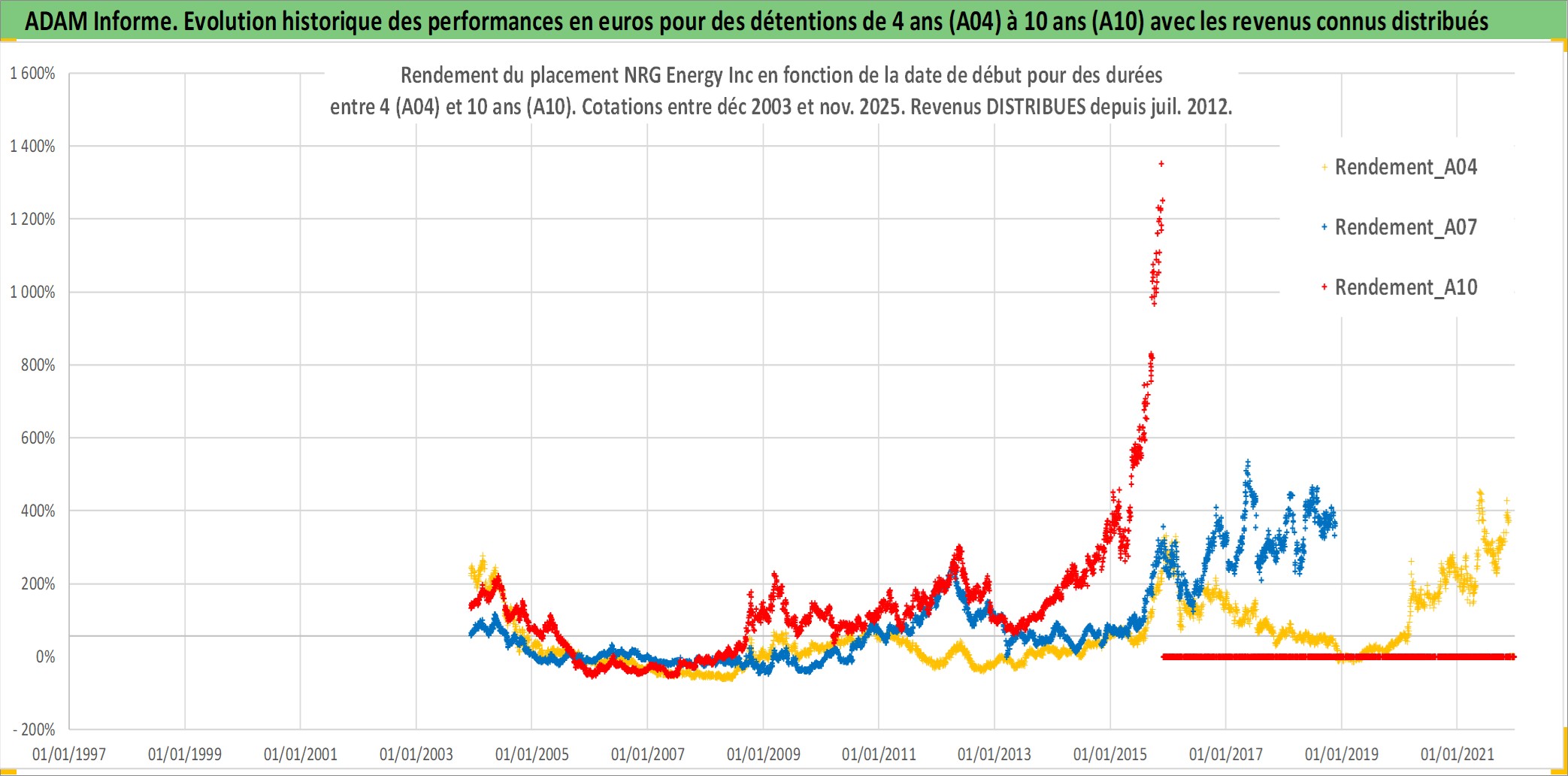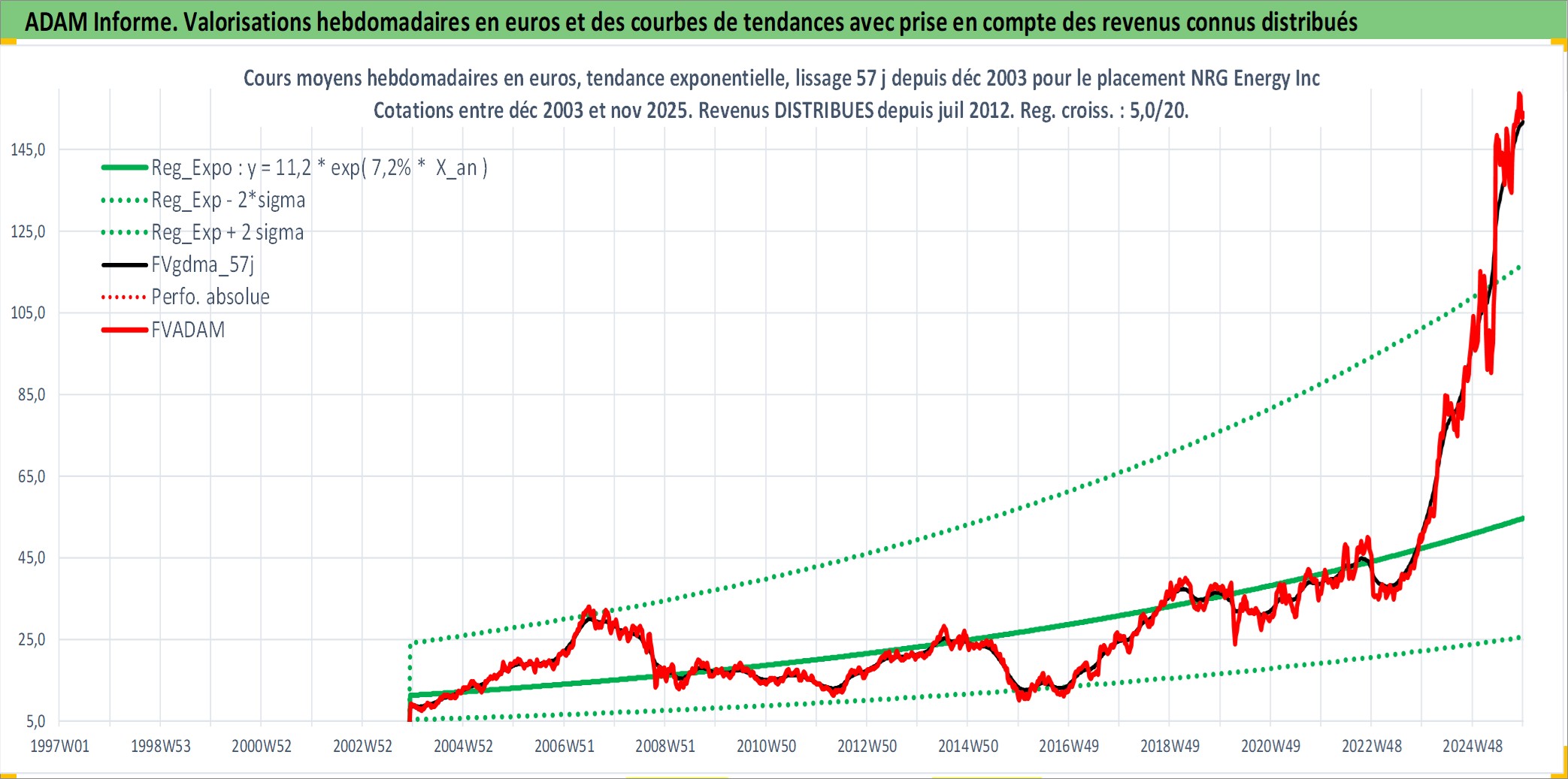 Site dédié aux investisseursPage dédiée sur site financeAnalyse des valorisations hebdomadaires de l'action NRG Energy Inc. Cet actif est cote en USD. Les valorisations sont en contrevaleur EURO et couvrent les semaines 2003W49 a 2025W48. Les revenus de cet actif financier sont pris en compte depuis la semaine 2012W31. La note globale ESG de cet actif est estimee a 4.0 (apres rebasage entre 0 et 20).